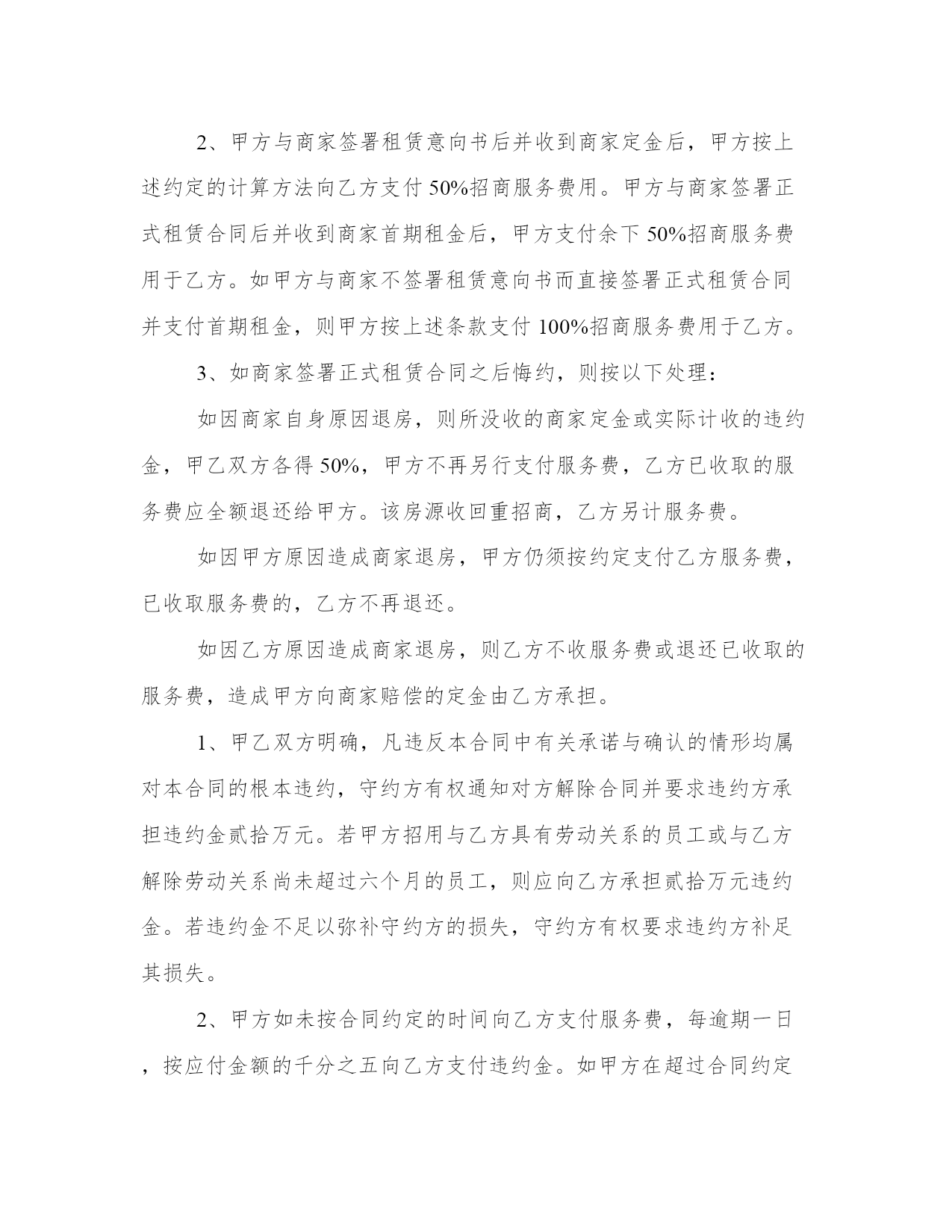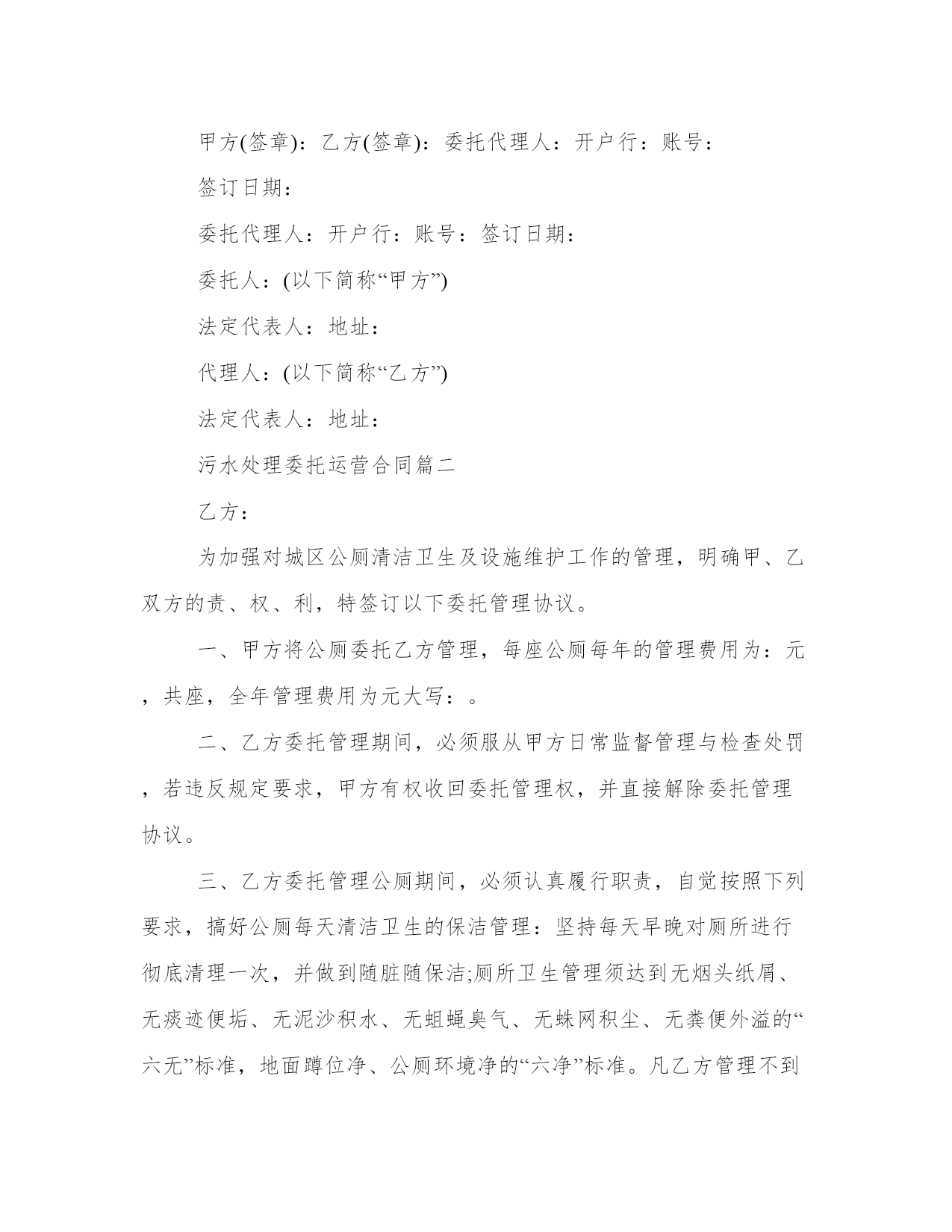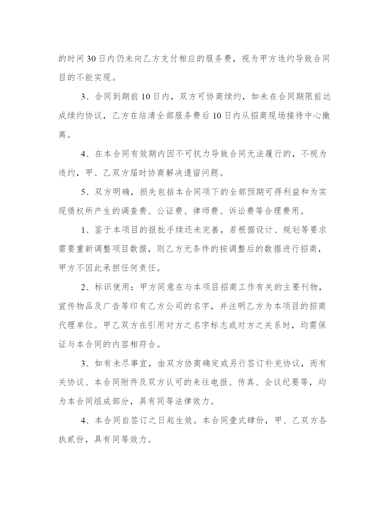 优秀污水处理委托运营合同大全(15篇)通过签订合同,双方确认了交易的内容和条款。合同应确保交易的程式化和规范化。以下是小编为您提供的合同范文,供您参考和学习。污水处理委托运营合同篇一委托方:(以下简称“甲方”)法定代表人:地址:电话:传真:电子信箱:受托方:(以下简称“乙方”)法定代表人:地址:电话:传真:电子信箱:委托事项甲方委托乙方招商代理的“本项目”位于,其商业部分总建筑面积约为平方米。委托时间乙方的代理期为:本合同生效后起至项目招商与销售完毕后止。第三条承诺与确认1、甲方承诺本公司是依据中华人民共和国公司法设立并有效存续的具有完全民事主体资格的独立法人。2、甲方确认并承诺,签订本合同前,已对乙方的专业资质、专业能力和工作经历有了充分的了解,并将充分尊重乙方为本合同目的而提供的智力成果,未经乙方书面同意,不得将乙方提交的智力成果用于本项目之外的其他项目或目的,或供他方使用或借鉴。3、甲方确认对本项目拥有完全的所有权、开发权、处分权,且已取得对本项目招商无诸如查封、抵押等障碍的相应证明文件并保持这些文件的有效性。4、乙方承诺本公司是依据中华人民共和国公司法设立并有效存续的具有完全民事主体资格的独立法人。1、甲方须根据本合同的约定向乙方支付相关的服务费。2、提供招商工作所需的项目相关资料,包括但不限于详细的平面图、面积表、全套建筑设计方案、前期市场调查方案、相关土地、开发资料、开发进度等、公司营业执照、开发资质证书等资料。3、及时通报招商进度,如项目的租赁条件有任何改变,应及时书面通知乙方。4、甲方有权对本项目的招商工作进行统一管理;有权自行招商或者委托其他单位进行本项目商业招商。1、合同签订后,乙方须组成项目组,根据招商进度,确定本项目负责人、项目招商经理。2、乙方应制作招商服务工作服务大纲,确定潜在商家目标客户、推广策略,制定招商进程计划。3、在甲方授权范围内开展招商工作,根据招商的需要,经与甲方协商并经甲方确认后,开展必要的促销和宣传活动,费用由甲方承担。4、乙方在招商过程中,应根据甲方提供的本项目的特性和状况向客户作如实介绍,不得做任何不实的宣传。不得以甲方的名义从事本合同规定的代理项目以外的任何其他活动。5、不得超越甲方书面授权向商家做出任何承诺,否则由此造成的损失由乙方承担赔偿责任。6、在招商过程中如有重大的事务,乙方需先通报甲方,在得到甲方的书面认可后方可执行。7、乙方应按甲方的书面通知(书面通知应提前两天通知)参与甲方与招商有关的例会。8、乙方在履行本合同服务过程中所获知甲方的商业秘密负有保密义务,未经甲方书面许可,乙方不得将其泄露给第三方,否则应承担违约责任并赔偿损失。9、乙方应自行组织工作人员完成委托事项,并按国家法律法规的规定,完善相应用工手续并承担相关费用,乙方员工为履行本合同造成自身以及任意第三人的人身伤亡、财务损失的,应自行承担相应的法律责任。1、在本项目对外招商租赁面积完成20%之前,乙方按完成招商铺位的月租金2.0倍计算服务费;在本物业租赁面积完成20%-60%之间,按完成招商铺位的月租金1.8倍计算服务费;在本物业租赁面积完成60%后,按完成招商铺位的月租金1.6倍计算服务费。(注:“月租金”指租赁合同首年平均月租金,不含免租优惠期,不含物业管理费。)2、甲方与商家签署租赁意向书后并收到商家定金后,甲方按上述约定的计算方法向乙方支付50%招商服务费用。甲方与商家签署正式租赁合同后并收到商家首期租金后,甲方支付余下50%招商服务费用于乙方。如甲方与商家不签署租赁意向书而直接签署正式租赁合同并支付首期租金,则甲方按上述条款支付100%招商服务费用于乙方。3、如商家签署正式租赁合同之后悔约,则按以下处理:如因商家自身原因退房,则所没收的商家定金或实际计收的违约金,甲乙双方各得50%,甲方不再另行支付服务费,乙方已收取的服务费应全额退还给甲方。该房源收回重招商,乙方另计服务费。如因甲方原因造成商家退房,甲方仍须按约定支付乙方服务费,已收取服务费的,乙方不再退还。如因乙方原因造成商家退房,则乙方不收服务费或退还已收取的服务费,造成甲方向商家赔偿的定金由乙方承担。1、甲乙双方明确,凡违反本合同中有关承诺与确认的情形均属对本合同的根本违约,守约方有权通知对方解除合同并要求违约方承担违约金贰拾万元。若甲方招用与乙方具有劳动关系的员工或与乙方解除劳动关系尚未超过六个月的员工,则应向乙方承担贰拾万元违约金。若违约金不足以弥补守约方的损失,守约方有权要求违约方补足其损失。2、甲方如未按合同约定的时间向乙方支付服务费,每逾期一日,按应付金额的千分之五向乙方支付违约金。如甲方在超过合同约定的时间30日内仍未向乙方支付相应的服务费,视为甲方违约导致合同