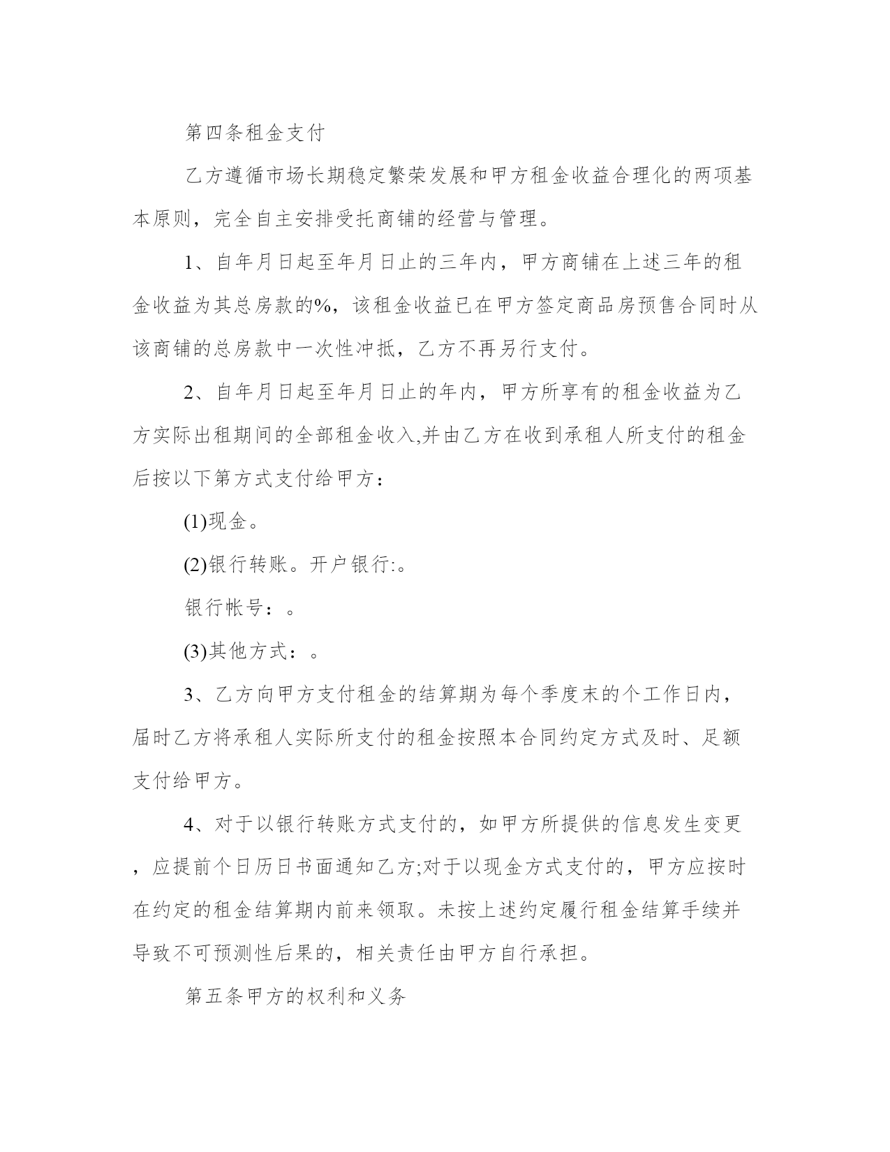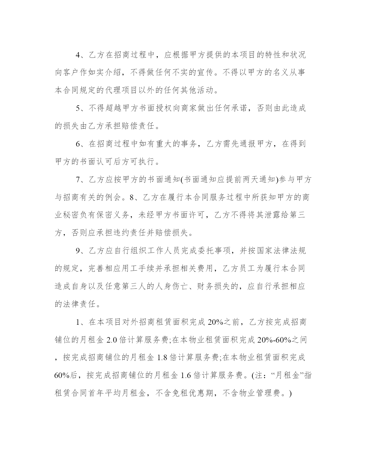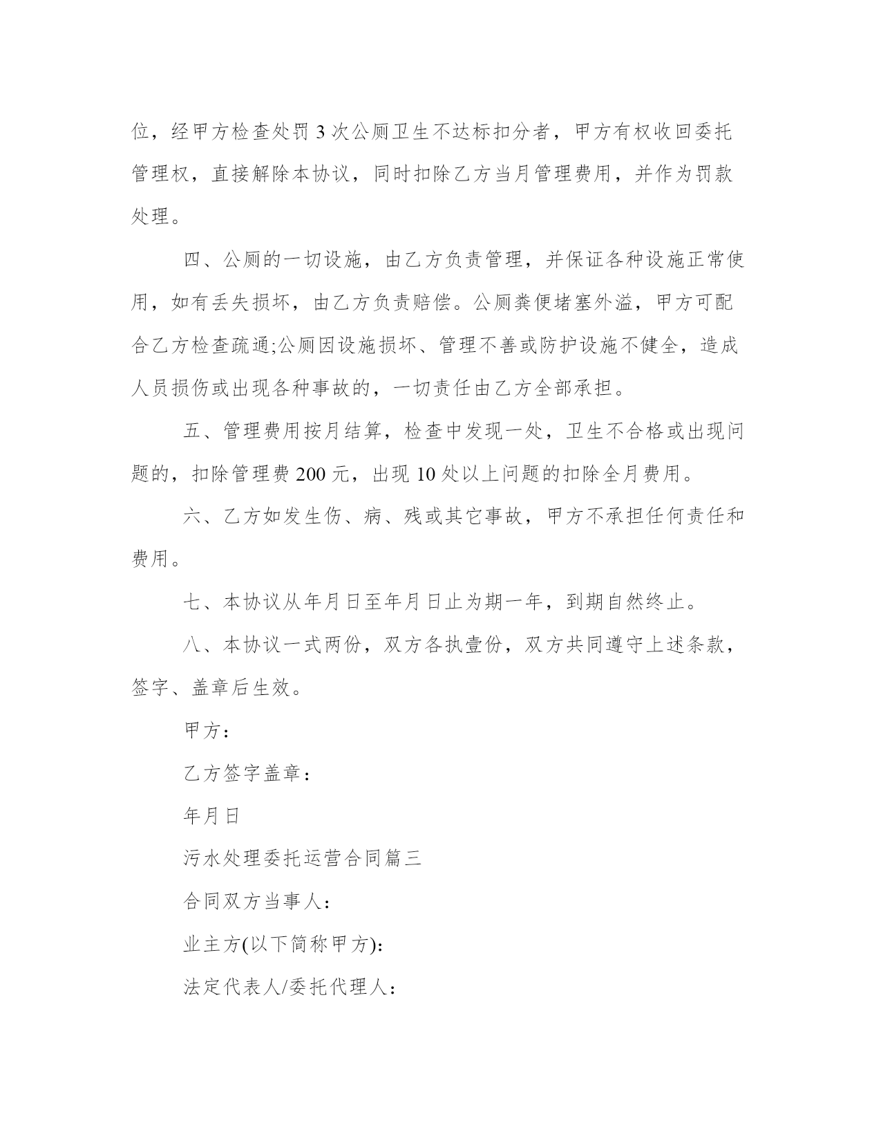 优秀污水处理委托运营合同大全(15篇)通过签订合同,双方确认了交易的内容和条款。合同应确保交易的程式化和规范化。以下是小编为您提供的合同范文,供您参考和学习。污水处理委托运营合同篇一委托方:(以下简称“甲方”)法定代表人:地址:电话:传真:电子信箱:受托方:(以下简称“乙方”)法定代表人:地址:电话:传真:电子信箱:委托事项甲方委托乙方招商代理的“本项目”位于,其商业部分总建筑面积约为平方米。委托时间乙方的代理期为:本合同生效后起至项目招商与销售完毕后止。第三条承诺与确认1、甲方承诺本公司是依据中华人民共和国公司法设立并有效存续的具有完全民事主体资格的独立法人。2、甲方确认并承诺,签订本合同前,已对乙方的专业资质、专业能力和工作经历有了充分的了解,并将充分尊重乙方为本合同目的而提供的智力成果,未经乙方书面同意,不得将乙方提交的智力成果用于本项目之外的其他项目或目的,或供他方使用或借鉴。3、甲方确认对本项目拥有完全的所有权、开发权、处分权,且已取得对本项目招商无诸如查封、抵押等障碍的相应证明文件并保持这些文件的有效性。4、乙方承诺本公司是依据中华人民共和国公司法设立并有效存续的具有完全民事主体资格的独立法人。1、甲方须根据本合同的约定向乙方支付相关的服务费。2、提供招商工作所需的项目相关资料,包括但不限于详细的平面图、面积表、全套建筑设计方案、前期市场调查方案、相关土地、开发资料、开发进度等、公司营业执照、开发资质证书等资料。3、及时通报招商进度,如项目的租赁条件有任何改变,应及时书面通知乙方。4、甲方有权对本项目的招商工作进行统一管理;有权自行招商或者委托其他单位进行本项目商业招商。1、合同签订后,乙方须组成项目组,根据招商进度,确定本项目负责人、项目招商经理。2、乙方应制作招商服务工作服务大纲,确定潜在商家目标客户、推广策略,制定招商进程计划。3、在甲方授权范围内开展招商工作,根据招商的需要,经与甲方协商并经甲方确认后,开展必要的促销和宣传活动,费用由甲方承担。4、乙方在招商过程中,应根据甲方提供的本项目的特性和状况向客户作如实介绍,不得做任何不实的宣传。不得以甲方的名义从事本合同规定的代理项目以外的任何其他活动。5、不得超越甲方书面授权向商家做出任何承诺,否则由此造成的损失由乙方承担赔偿责任。6、在招商过程中如有重大的事务,乙方需先通报甲方,在得到甲方的书面认可后方可执行。7、乙方应按甲方的书面通知(书面通知应提前两天通知)参与甲方与招商有关的例会。8、乙方在履行本合同服务过程中所获知甲方的商业秘密负有保密义务,未经甲方书面许可,乙方不得将其泄露给第三方,否则应承担违约责任并赔偿损失。9、乙方应自行组织工作人员完成委托事项,并按国家法律法规的规定,完善相应用工手续并承担相关费用,乙方员工为履行本合同造成自身以及任意第三人的人身伤亡、财务损失的,应自行承担相应的法律责任。1、在本项目对外招商租赁面积完成20%之前,乙方按完成招商铺位的月租金2.0倍计算服务费;在本物业租赁面积完成20%-60%之间,按完成招商铺位的月租金1.8倍计算服务费;在本物业租赁面积完成60%后,按完成招商铺位的月租金1.6倍计算服务费。(注:“月租金”指租赁合同首年平均月租金,不含免租优惠期,不含物业管理费。)2、甲方与商家签署租赁意向书后并收到商家定金后,甲方按上述约定的计算方法向乙方支付50%招商服务费用。甲方与商家签署正式租赁合同后并收到商家首期租金后,甲方支付余下50%招商服务费用于乙方。如甲方与商家不签署租赁意向书而直接签署正式租赁合同并支付首期租金,则甲方按上述条款支付100%招商服务费用于乙方。3、如商家签署正式租赁合同之后悔约,则按以下处理:如因商家自身原因退房,则所没收的商家定金或实际计收的违约金,甲乙双方各得50%,甲方不再另行支付服务费,乙方已收取的服务费应全额退还给甲方。该房源收回重招商,乙方另计服务费。如因甲方原因造成商家退房,甲方仍须按约定支付乙方服务费,已收取服务费的,乙方不再退还。如因乙方原因造成商家退房,则乙方不收服务费或退还已收取的服务费,造成甲方向商家赔偿的定金由乙方承担。1、甲乙双方明确,凡违反本合同中有关承诺与确认的情形均属对本合同的根本违约,守约方有权通知对方解除合同并要求违约方承担违约金贰拾万元。若甲方招用与乙方具有劳动关系的员工或与乙方解除劳动关系尚未超过六个月的员工,则应向乙方承担贰拾万元违约金。若违约金不足以弥补守约方的损失,守约方有权要求违约方补足其损失。2、甲方如未按合同约定的时间向乙方支付服务费,每逾期一日,按应付金额的千分之五向乙方支付违约金。如甲方在超过合同约定的时间30日内仍未向乙方支付相应的服务费,视为甲方违约导致合同