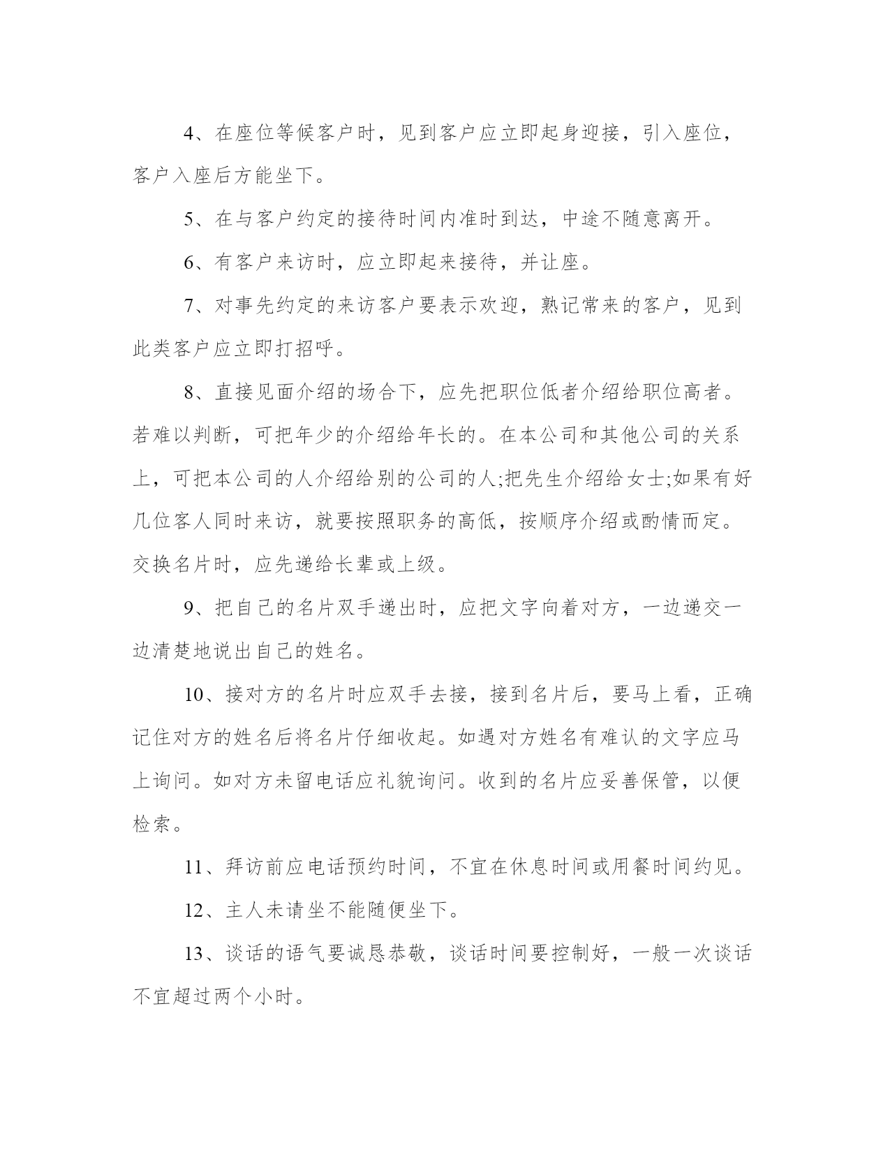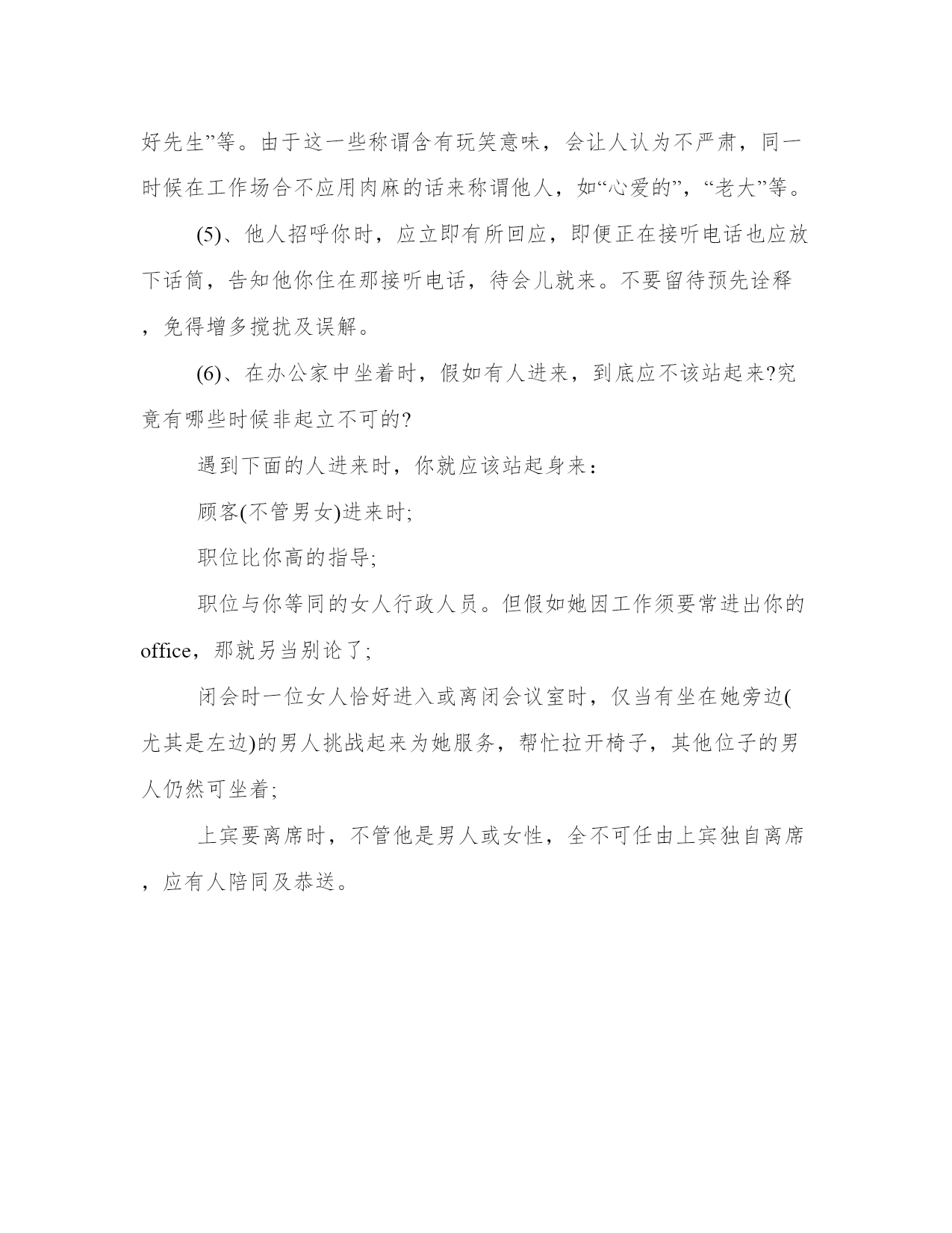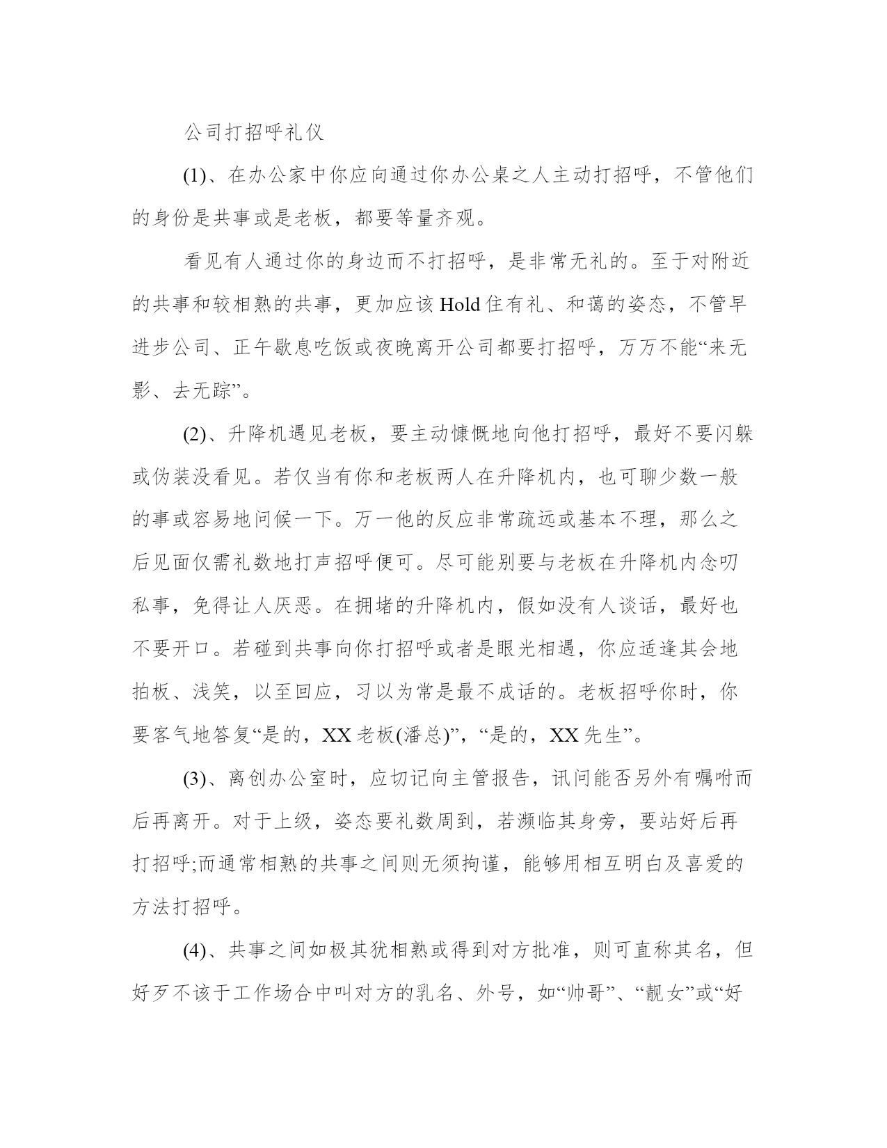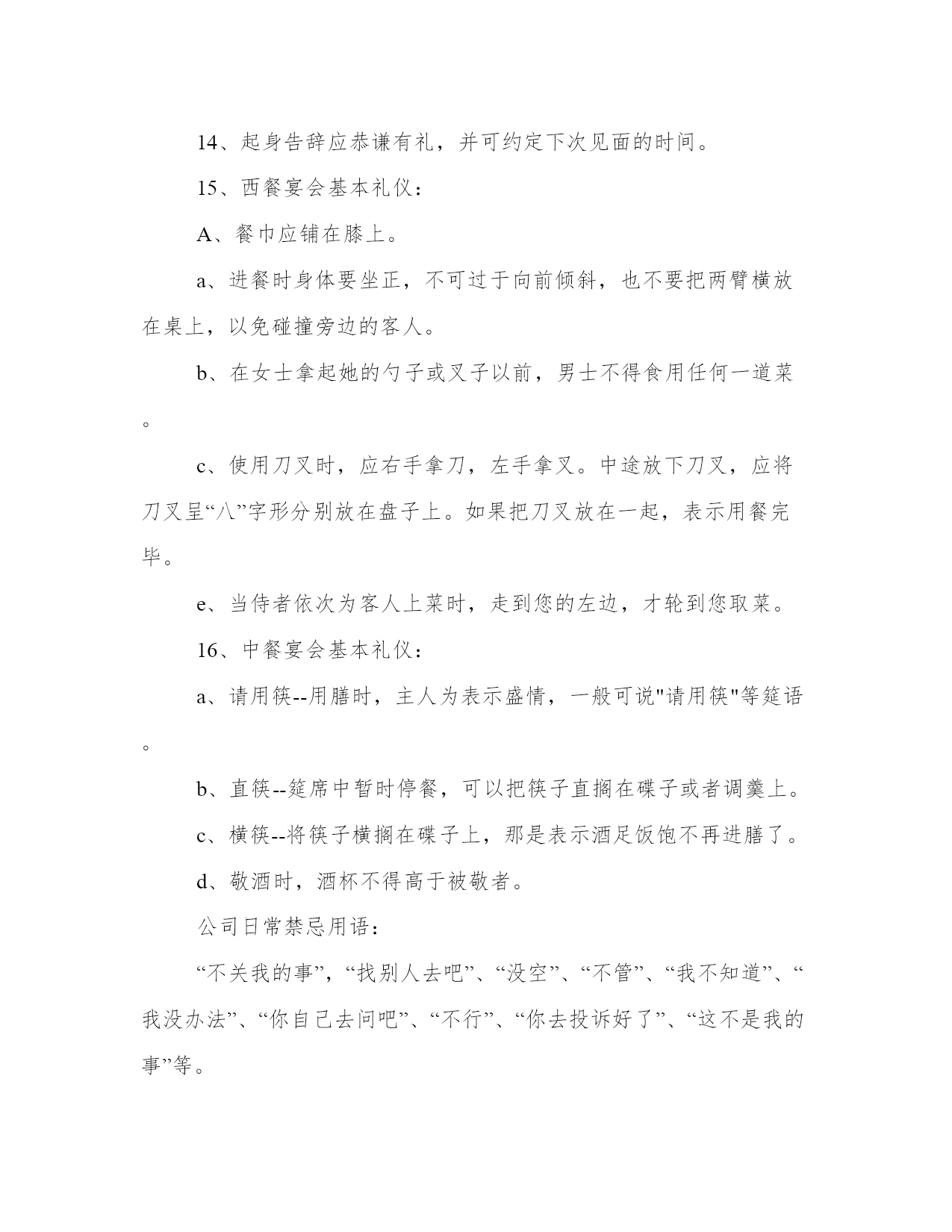 公司基本礼仪培训公司基本礼仪培训公司人员的仪容卫生(一)服装要整洁。穿着要合体,衣领、袖口要保持干净;不要将袖口和裤腿卷起来,衬衣下摆不要外露。不得披衣、敞怀,保安制服和便服不得混穿。(二)上岗执勤着装要规范。执勤时必须按规定着保安制服,佩戴好武装带、防卫器械以及帽徽、肩章、领花、胸花;要扣好领扣和领钩;如穿开领制服,必须内穿衬衣,打好领带。着制服时,不得戴耳环、项链、戒指等饰物,不得描眉、涂口红、擦胭脂、染指甲。(三)注意个人卫生。头发要勤梳理,男生不准留大包头、大鬓角和蓄长发、胡须,指甲要经常修剪。遵守社会公德,养成良好卫生习惯,不乱丢烟头、果皮、纸屑,不随地吐痰及倒剩菜、饭、脏水;不要在执勤时擦鼻涕,剔牙齿,脱鞋袜,吃东西;吸烟者注意不要在烟火禁区和公共场所吸烟.公司待客与作客的礼仪:1、接待客户时应主动、热情、大方,微笑服务。2、握手时女性应主动伸出手,长辈应先伸出手,高位者应先伸出手;握手时应稍稍用力,时间五秒钟左右为宜。3、进入高位者或年长者办公室应微微鞠躬敬礼,表示尊敬。4、在座位等候客户时,见到客户应立即起身迎接,引入座位,客户入座后方能坐下。5、在与客户约定的接待时间内准时到达,中途不随意离开。6、有客户来访时,应立即起来接待,并让座。7、对事先约定的来访客户要表示欢迎,熟记常来的客户,见到此类客户应立即打招呼。8、直接见面介绍的场合下,应先把职位低者介绍给职位高者。若难以判断,可把年少的介绍给年长的。在本公司和其他公司的关系上,可把本公司的人介绍给别的公司的人;把先生介绍给女士;如果有好几位客人同时来访,就要按照职务的高低,按顺序介绍或酌情而定。交换名片时,应先递给长辈或上级。9、把自己的名片双手递出时,应把文字向着对方,一边递交一边清楚地说出自己的姓名。10、接对方的名片时应双手去接,接到名片后,要马上看,正确记住对方的姓名后将名片仔细收起。如遇对方姓名有难认的文字应马上询问。如对方未留电话应礼貌询问。收到的名片应妥善保管,以便检索。11、拜访前应电话预约时间,不宜在休息时间或用餐时间约见。12、主人未请坐不能随便坐下。13、谈话的语气要诚恳恭敬,谈话时间要控制好,一般一次谈话不宜超过两个小时。14、起身告辞应恭谦有礼,并可约定下次见面的时间。15、西餐宴会基本礼仪:A、餐巾应铺在膝上。a、进餐时身体要坐正,不可过于向前倾斜,也不要把两臂横放在桌上,以免碰撞旁边的客人。b、在女士拿起她的勺子或叉子以前,男士不得食用任何一道菜。c、使用刀叉时,应右手拿刀,左手拿叉。中途放下刀叉,应将刀叉呈“八”字形分别放在盘子上。如果把刀叉放在一起,表示用餐完毕。e、当侍者依次为客人上菜时,走到您的左边,才轮到您取菜。16、中餐宴会基本礼仪:a、请用筷--用膳时,主人为表示盛情,一般可说"请用筷"等筵语。b、直筷--筵席中暂时停餐,可以把筷子直搁在碟子或者调羹上。c、横筷--将筷子横搁在碟子上,那是表示酒足饭饱不再进膳了。d、敬酒时,酒杯不得高于被敬者。公司日常禁忌用语:“不关我的事”,“找别人去吧”、“没空”、“不管”、“我不知道”、“我没办法”、“你自己去问吧”、“不行”、“你去投诉好了”、“这不是我的事”等。公司打招呼礼仪(1)、在办公家中你应向通过你办公桌之人主动打招呼,不管他们的身份是共事或是老板,都要等量齐观。看见有人通过你的身边而不打招呼,是非常无礼的。至于对附近的共事和较相熟的共事,更加应该Hold住有礼、和蔼的姿态,不管早进步公司、正午歇息吃饭或夜晚离开公司都要打招呼,万万不能“来无影、去无踪”。(2)、升降机遇见老板,要主动慷慨地向他打招呼,最好不要闪躲或伪装没看见。若仅当有你和老板两人在升降机内,也可聊少数一般的事或容易地问候一下。万一他的反应非常疏远或基本不理,那么之后见面仅需礼数地打声招呼便可。尽可能别要与老板在升降机内念叨私事,免得让人厌恶。在拥堵的升降机内,假如没有人谈话,最好也不要开口。若碰到共事向你打招呼或者是眼光相遇,你应适逢其会地拍板、浅笑,以至回应,习以为常是最不成话的。老板招呼你时,你要客气地答复“是的,XX老板(潘总)”,“是的,XX先生”。(3)、离创办公室时,应切记向主管报告,讯问能否另外有嘱咐而后再离开。对于上级,姿态要礼数周到,若濒临其身旁,要站好后再打招呼;而通常相熟的共事之间则无须拘谨,能够用相互明白及喜爱的方法打招呼。(4)、共事之间如极其犹相熟或得到对方批准,则可直称其名,但好歹不该于工作场合中叫对方的乳名、外号,如“帅哥”、“靓女”或“好好先生”等。由于这一些称谓含有玩笑意味,会让人认为不严肃,同一时候在工作场合不应用肉麻的话来称谓他人,如“心爱的”,“老大”等。(5)、他人招呼你