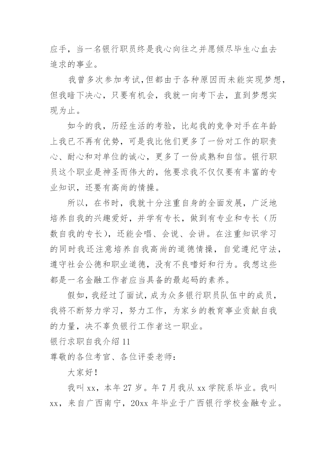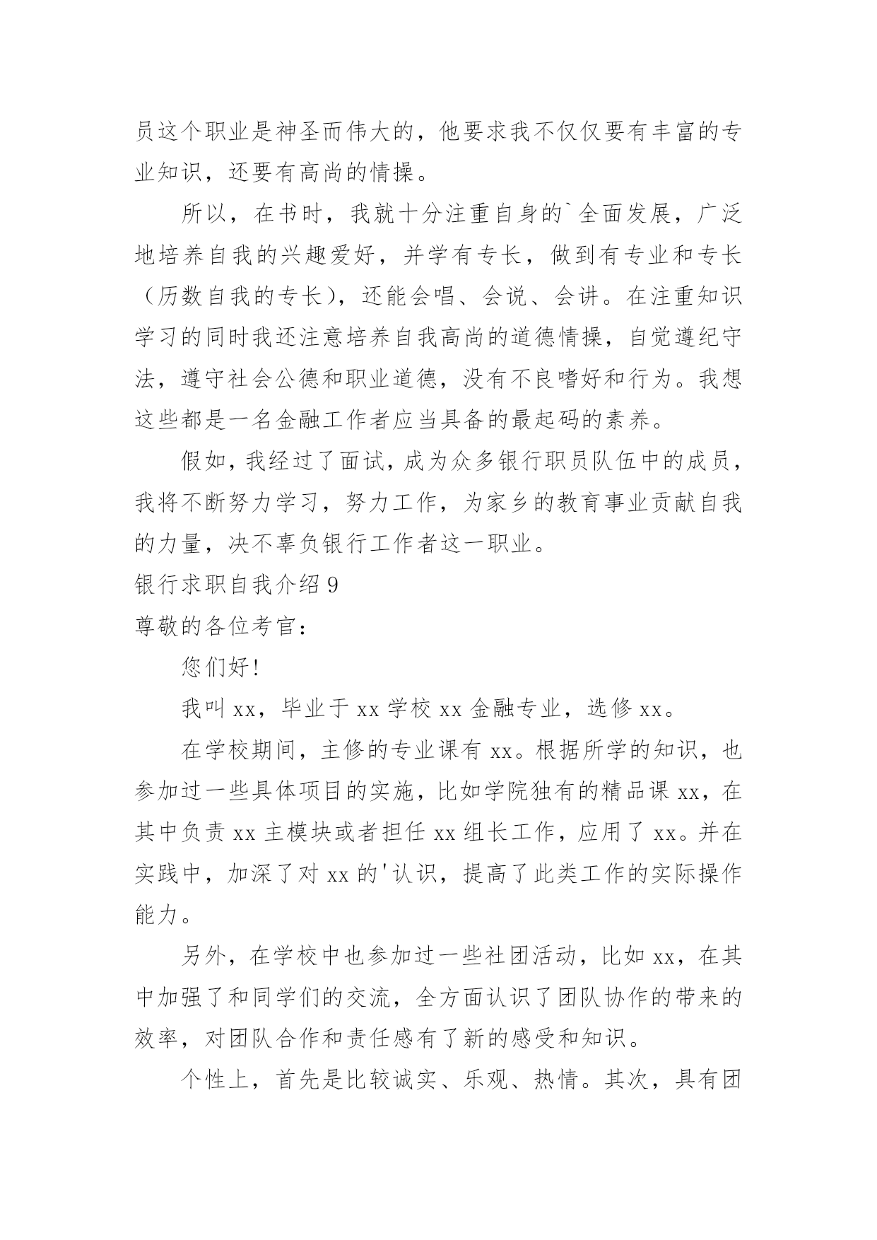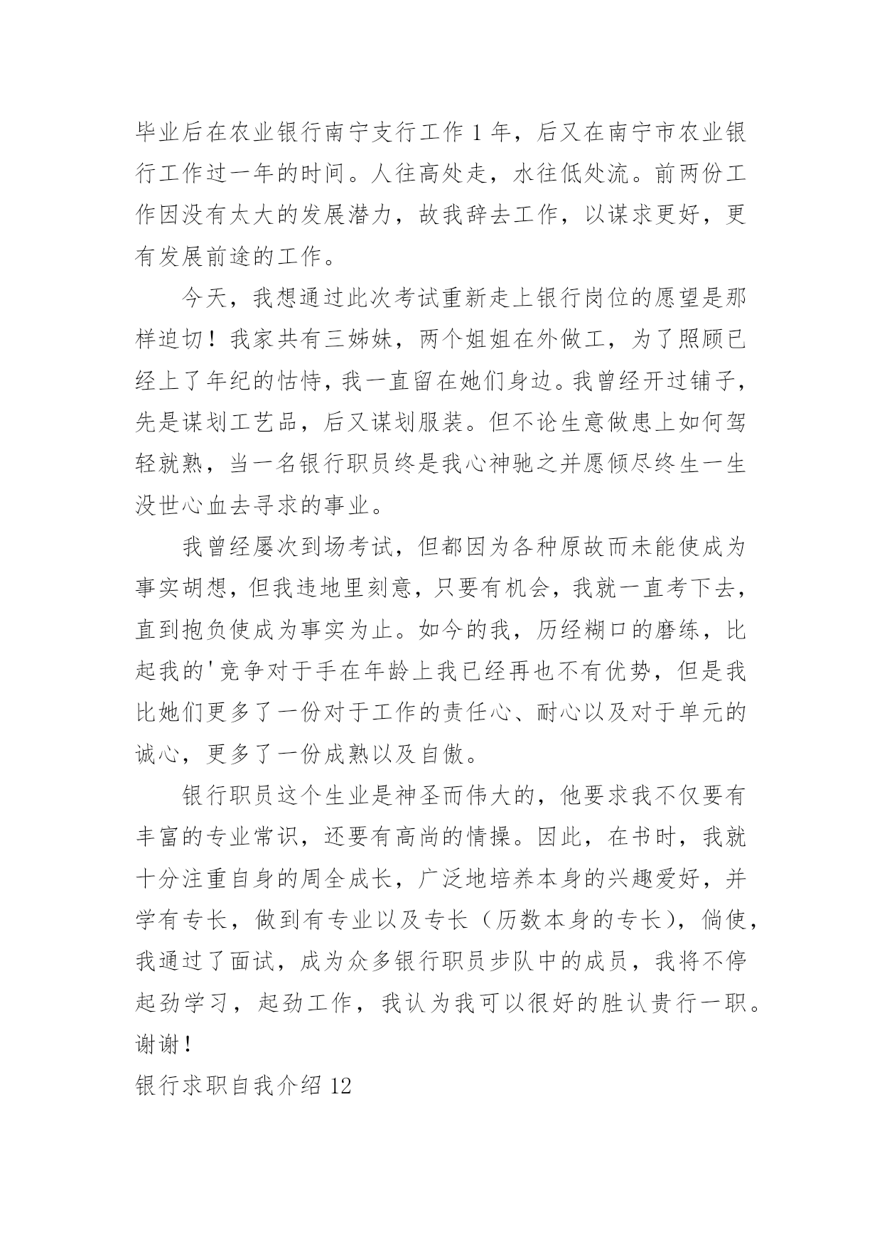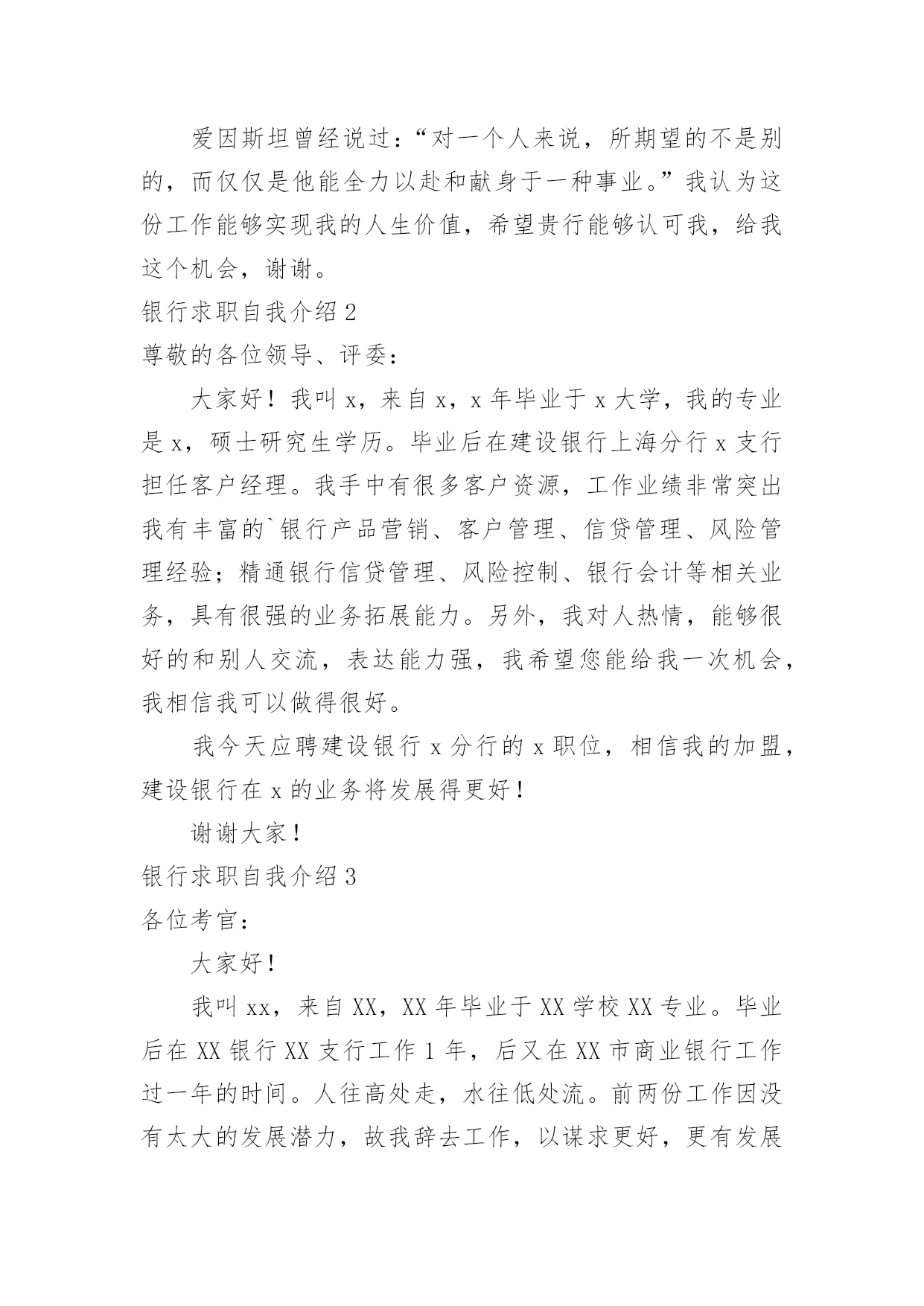 银行求职自我介绍银行求职自我介绍合集15篇初到一个新的环境,我们有必要对自己进行适当的介绍,通过自我介绍可以得到他人的欣赏。怎么写自我介绍才能避免踩雷呢?以下是小编为大家整理的银行求职自我介绍,仅供参考,欢迎大家阅读。银行求职自我介绍1尊敬的领导:您好!我是这次面试的第xx号考生,xx,蒙族。20xx年xx月,我毕业于xx大学xx学院xx专业,在大学的四年里,我学习了经济学,管理学、金融学和法律的基础知识。大学期间表现优秀,曾获得院级优秀假期社会实践论文。20xx年寒假,我曾在福利院和养老院进行假期社会实践,帮助残疾儿童补习功课,照顾孤寡老人的一些生活起居。在这个期间,我提高了与人沟通的能力,同时培养了良好的服务的意识。我性格开朗为人坦率,有责任感。同时我态度严谨、认真。银行的工作通常比较琐碎,我的优点是能够把琐碎的事情专心致志的做好。我的'基本人生观是乐观奋斗,这种人生观使我通常比较重视精神生活,比如:合作无间的工作伙伴和认可我的工作环境。爱因斯坦曾经说过:“对一个人来说,所期望的不是别的,而仅仅是他能全力以赴和献身于一种事业。”我认为这份工作能够实现我的人生价值,希望贵行能够认可我,给我这个机会,谢谢。银行求职自我介绍2尊敬的各位领导、评委:大家好!我叫x,来自x,x年毕业于x大学,我的专业是x,硕士研究生学历。毕业后在建设银行上海分行x支行担任客户经理。我手中有很多客户资源,工作业绩非常突出我有丰富的`银行产品营销、客户管理、信贷管理、风险管理经验;精通银行信贷管理、风险控制、银行会计等相关业务,具有很强的业务拓展能力。另外,我对人热情,能够很好的和别人交流,表达能力强,我希望您能给我一次机会,我相信我可以做得很好。我今天应聘建设银行x分行的x职位,相信我的加盟,建设银行在x的业务将发展得更好!谢谢大家!银行求职自我介绍3各位考官:大家好!我叫xx,来自XX,XX年毕业于XX学校XX专业。毕业后在XX银行XX支行工作1年,后又在XX市商业银行工作过一年的时间。人往高处走,水往低处流。前两份工作因没有太大的发展潜力,故我辞去工作,以谋求更好,更有发展前途的工作。之前2年的`工作使我有了丰富的银行临柜能力。我认为我可以很好的胜认贵行的大堂经理一职。谢谢!银行求职自我介绍4尊敬的领导:你好!我叫xx,来自xx,xxxx年毕业于xx大学xx学院,我的专业是xx.毕业后在xx单位工作1年,后又在xx单位工作过一年的时间。人往高处走,水往低处流,前两份工作因没有太大的发展潜力,故我辞去工作,以谋求更好、更有发展前途的工作。之前2年的工作使我有了丰富的银行临柜能力,我认为我可以很好的.胜认贵行的xx一职。希望各位领导领导能给我一个机会。谢谢!银行求职自我介绍5尊敬的各位领导、评委:大家好!我叫xx,来自xx,xx年毕业于xx大学,我的专业是xx,硕士研究生学历。毕业后在xx银行xx分行xx支行担任客户经理。我手中有很多客户资源,工作业绩非常突出。我有丰富的银行产品营销、客户管理、信贷管理、风险管理经验;精通银行信贷管理、风险控制、银行会计等相关业务,具有很强的业务拓展能力。我今天应聘平安银行xx分行的xx_职位,相信我的`加盟,平安银行在xx的业务将发展得更好!谢谢大家!此致敬礼!求职人:xxx20xx年x月x日银行求职自我介绍6各位面试官:你们好,我是来自XXXX商业银行X班的应届毕业生XX。首先感谢广发银行给我这样一个展示自我的机会。对于我的情况简历上都介绍得比较详细了在这理我想谈一谈我对这次贵行招聘的认识。在金融学院这4年银行面试自我介绍的学习生活让我满载而归,4年里我系统的学习了有关金融方面的专业知识,例如金融学,商业银行,中央银行理论与实务等。我认为随着国民经济的增长,银行已经不仅仅在承办存储款等业务,更多的是承担一种信用中介,银行已逐渐发展为老百姓生活中必不可取的金融机构。能够到银行就业更是我们金融专业毕业生的首选。而我们学校在毕业生就业这方面也为我们量身打造了一个系统的就业体系,如对点钞、票币百张、五笔打字等专业技能进行了一定的培训与考核。另外学校也安排我们参加各种社会实践,尤其是在工行的实习,让我熟悉了银行的工作环境,了解了银行大堂的基本工作流程和业务操作,大堂是银行不可或缺的岗位,它是银行的门面,是银行业务的.讲解员,也是银行与老百姓沟通的桥梁。在这个岗位上不仅仅是体现我对专业知识的掌握程度,更重要的是它能培养我的耐心,意识,应变能力,端正我的工作态度,所以我很看重这次贵行招聘的机会。如果我能成功,我一定会努力成为企业认可,客户满意的优秀员工。此致敬礼!求职人:xxx20xx年x月x日银行求职自我介绍7我平时我喜欢看书和上网流览信息,性格活泼开朗,能关心身边的人和事,和亲人朋友融洽相处,能做到理解和原谅,我对生活