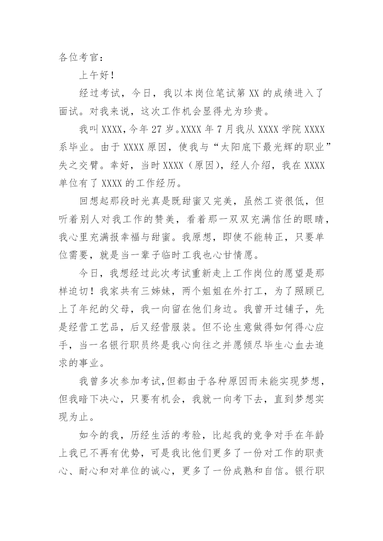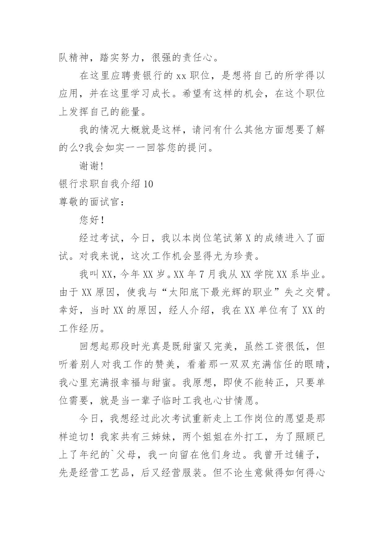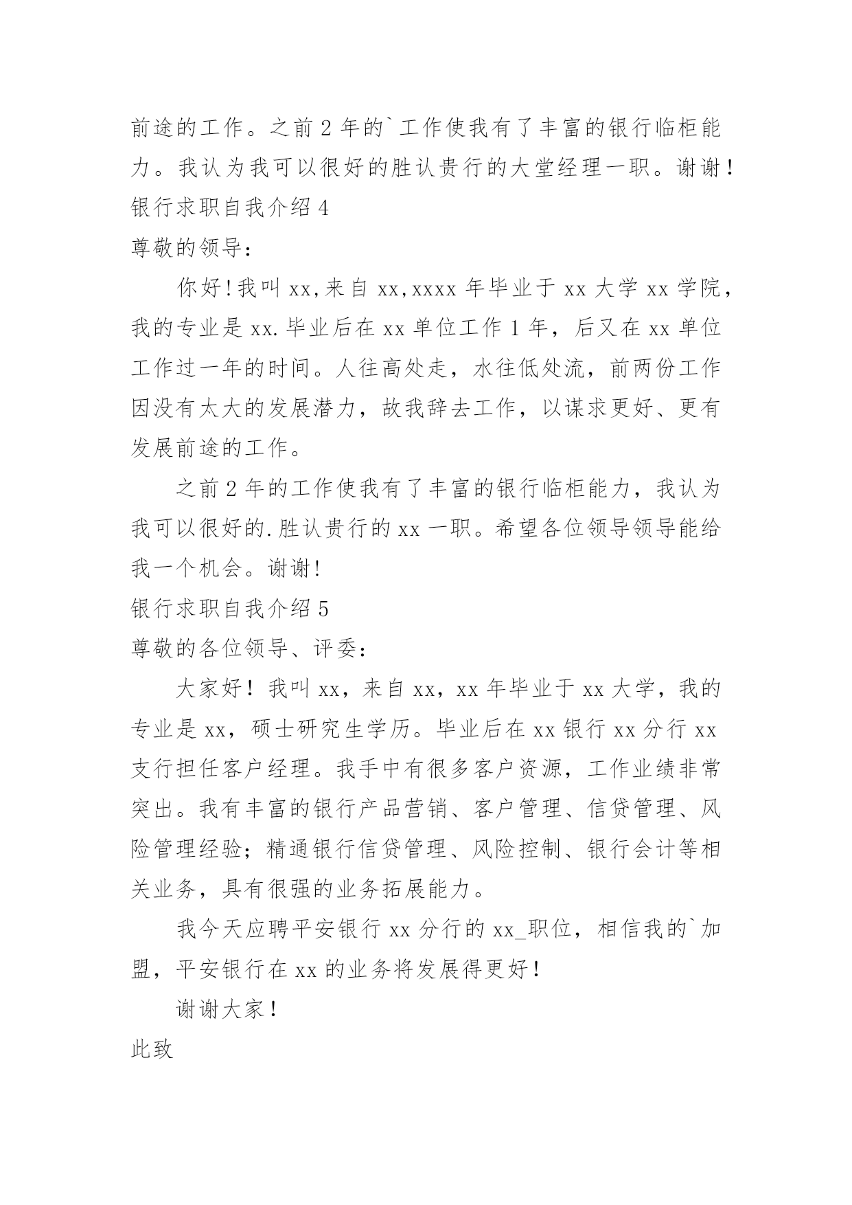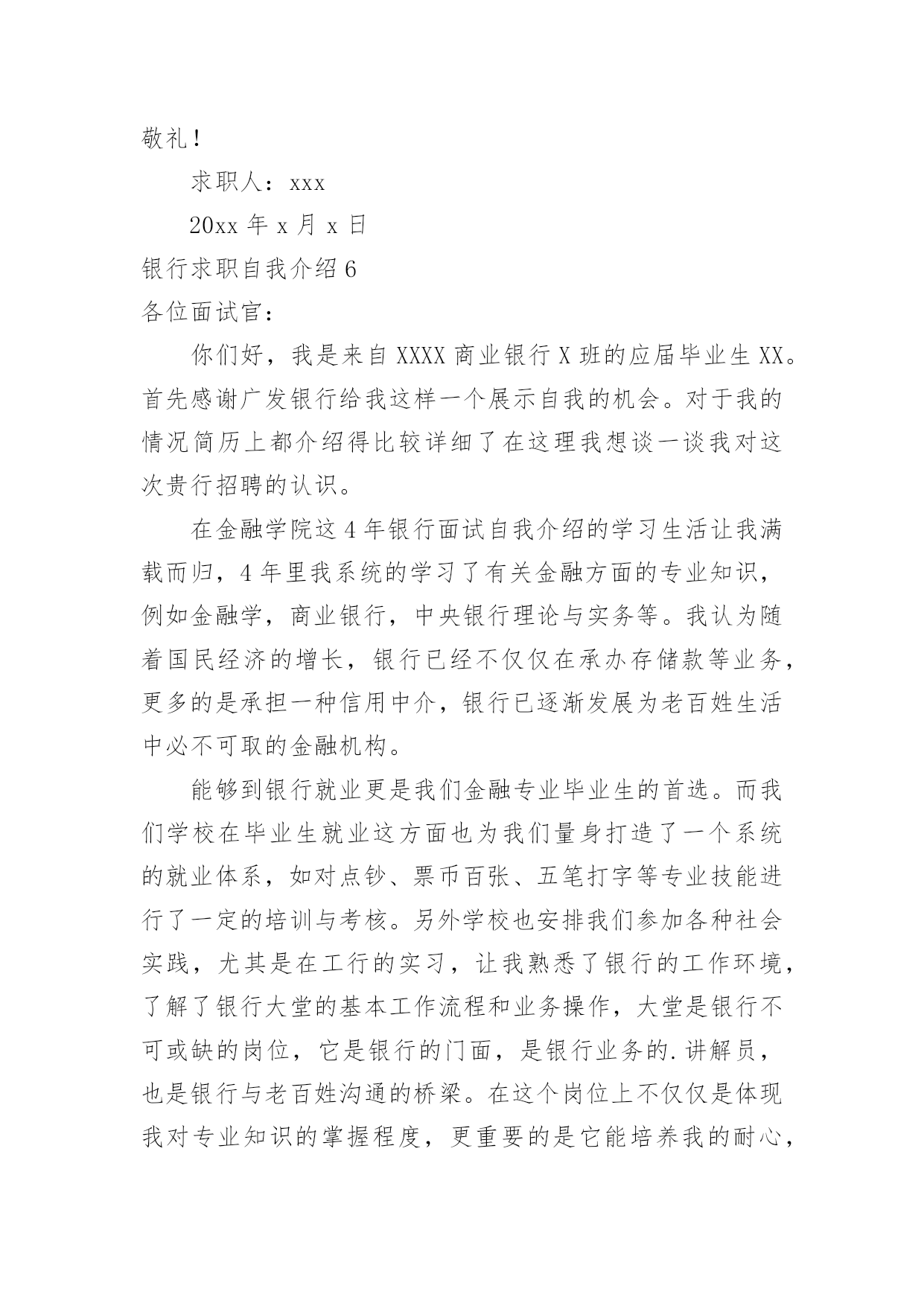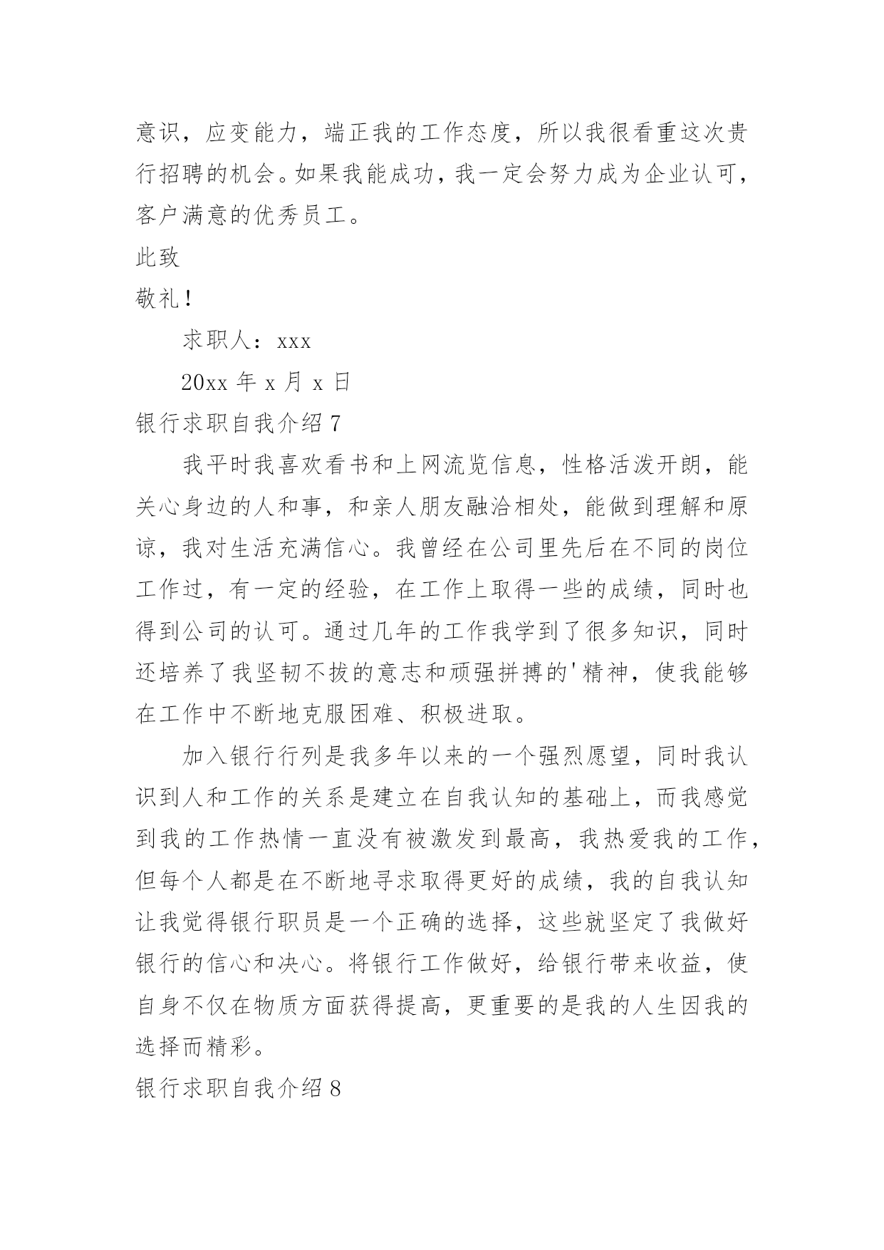 银行求职自我介绍银行求职自我介绍合集15篇初到一个新的环境,我们有必要对自己进行适当的介绍,通过自我介绍可以得到他人的欣赏。怎么写自我介绍才能避免踩雷呢?以下是小编为大家整理的银行求职自我介绍,仅供参考,欢迎大家阅读。银行求职自我介绍1尊敬的领导:您好!我是这次面试的第xx号考生,xx,蒙族。20xx年xx月,我毕业于xx大学xx学院xx专业,在大学的四年里,我学习了经济学,管理学、金融学和法律的基础知识。大学期间表现优秀,曾获得院级优秀假期社会实践论文。20xx年寒假,我曾在福利院和养老院进行假期社会实践,帮助残疾儿童补习功课,照顾孤寡老人的一些生活起居。在这个期间,我提高了与人沟通的能力,同时培养了良好的服务的意识。我性格开朗为人坦率,有责任感。同时我态度严谨、认真。银行的工作通常比较琐碎,我的优点是能够把琐碎的事情专心致志的做好。我的'基本人生观是乐观奋斗,这种人生观使我通常比较重视精神生活,比如:合作无间的工作伙伴和认可我的工作环境。爱因斯坦曾经说过:“对一个人来说,所期望的不是别的,而仅仅是他能全力以赴和献身于一种事业。”我认为这份工作能够实现我的人生价值,希望贵行能够认可我,给我这个机会,谢谢。银行求职自我介绍2尊敬的各位领导、评委:大家好!我叫x,来自x,x年毕业于x大学,我的专业是x,硕士研究生学历。毕业后在建设银行上海分行x支行担任客户经理。我手中有很多客户资源,工作业绩非常突出我有丰富的`银行产品营销、客户管理、信贷管理、风险管理经验;精通银行信贷管理、风险控制、银行会计等相关业务,具有很强的业务拓展能力。另外,我对人热情,能够很好的和别人交流,表达能力强,我希望您能给我一次机会,我相信我可以做得很好。我今天应聘建设银行x分行的x职位,相信我的加盟,建设银行在x的业务将发展得更好!谢谢大家!银行求职自我介绍3各位考官:大家好!我叫xx,来自XX,XX年毕业于XX学校XX专业。毕业后在XX银行XX支行工作1年,后又在XX市商业银行工作过一年的时间。人往高处走,水往低处流。前两份工作因没有太大的发展潜力,故我辞去工作,以谋求更好,更有发展前途的工作。之前2年的`工作使我有了丰富的银行临柜能力。我认为我可以很好的胜认贵行的大堂经理一职。谢谢!银行求职自我介绍4尊敬的领导:你好!我叫xx,来自xx,xxxx年毕业于xx大学xx学院,我的专业是xx.毕业后在xx单位工作1年,后又在xx单位工作过一年的时间。人往高处走,水往低处流,前两份工作因没有太大的发展潜力,故我辞去工作,以谋求更好、更有发展前途的工作。之前2年的工作使我有了丰富的银行临柜能力,我认为我可以很好的.胜认贵行的xx一职。希望各位领导领导能给我一个机会。谢谢!银行求职自我介绍5尊敬的各位领导、评委:大家好!我叫xx,来自xx,xx年毕业于xx大学,我的专业是xx,硕士研究生学历。毕业后在xx银行xx分行xx支行担任客户经理。我手中有很多客户资源,工作业绩非常突出。我有丰富的银行产品营销、客户管理、信贷管理、风险管理经验;精通银行信贷管理、风险控制、银行会计等相关业务,具有很强的业务拓展能力。我今天应聘平安银行xx分行的xx_职位,相信我的`加盟,平安银行在xx的业务将发展得更好!谢谢大家!此致敬礼!求职人:xxx20xx年x月x日银行求职自我介绍6各位面试官:你们好,我是来自XXXX商业银行X班的应届毕业生XX。首先感谢广发银行给我这样一个展示自我的机会。对于我的情况简历上都介绍得比较详细了在这理我想谈一谈我对这次贵行招聘的认识。在金融学院这4年银行面试自我介绍的学习生活让我满载而归,4年里我系统的学习了有关金融方面的专业知识,例如金融学,商业银行,中央银行理论与实务等。我认为随着国民经济的增长,银行已经不仅仅在承办存储款等业务,更多的是承担一种信用中介,银行已逐渐发展为老百姓生活中必不可取的金融机构。能够到银行就业更是我们金融专业毕业生的首选。而我们学校在毕业生就业这方面也为我们量身打造了一个系统的就业体系,如对点钞、票币百张、五笔打字等专业技能进行了一定的培训与考核。另外学校也安排我们参加各种社会实践,尤其是在工行的实习,让我熟悉了银行的工作环境,了解了银行大堂的基本工作流程和业务操作,大堂是银行不可或缺的岗位,它是银行的门面,是银行业务的.讲解员,也是银行与老百姓沟通的桥梁。在这个岗位上不仅仅是体现我对专业知识的掌握程度,更重要的是它能培养我的耐心,意识,应变能力,端正我的工作态度,所以我很看重这次贵行招聘的机会。如果我能成功,我一定会努力成为企业认可,客户满意的优秀员工。此致敬礼!求职人:xxx20xx年x月x日银行求职自我介绍7我平时我喜欢看书和上网流览信息,性格活泼开朗,能关心身边的人和事,和亲人朋友融洽相处,能做到理解和原谅,我对生活