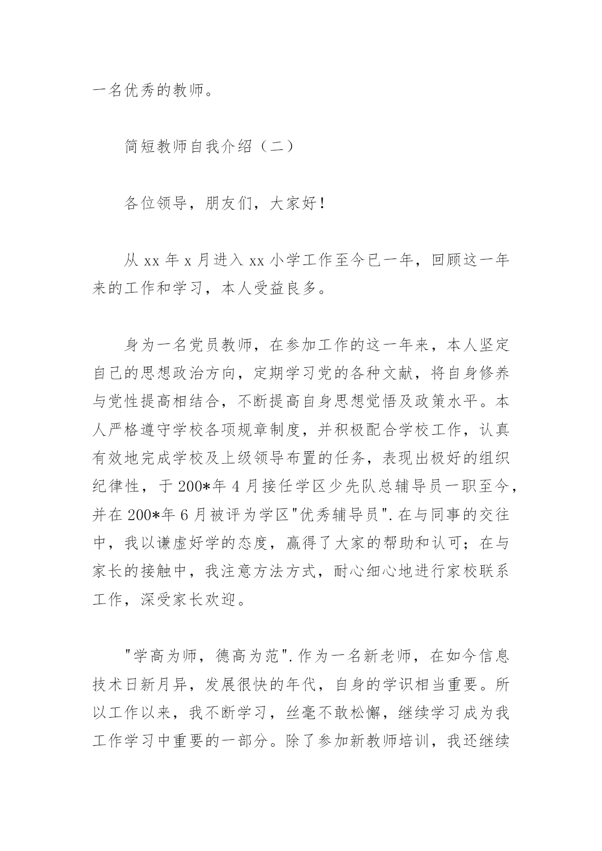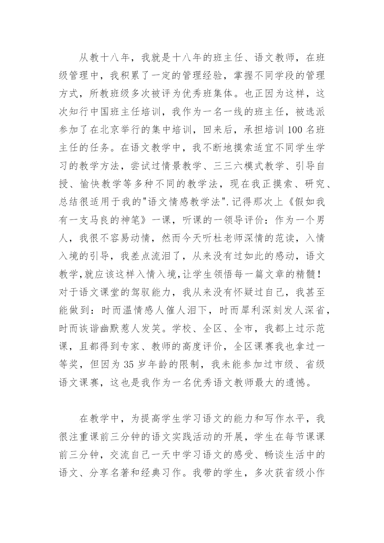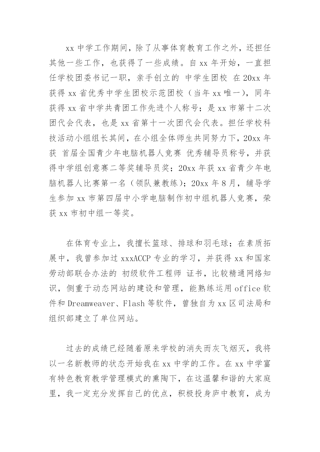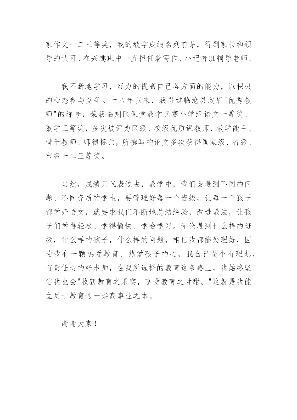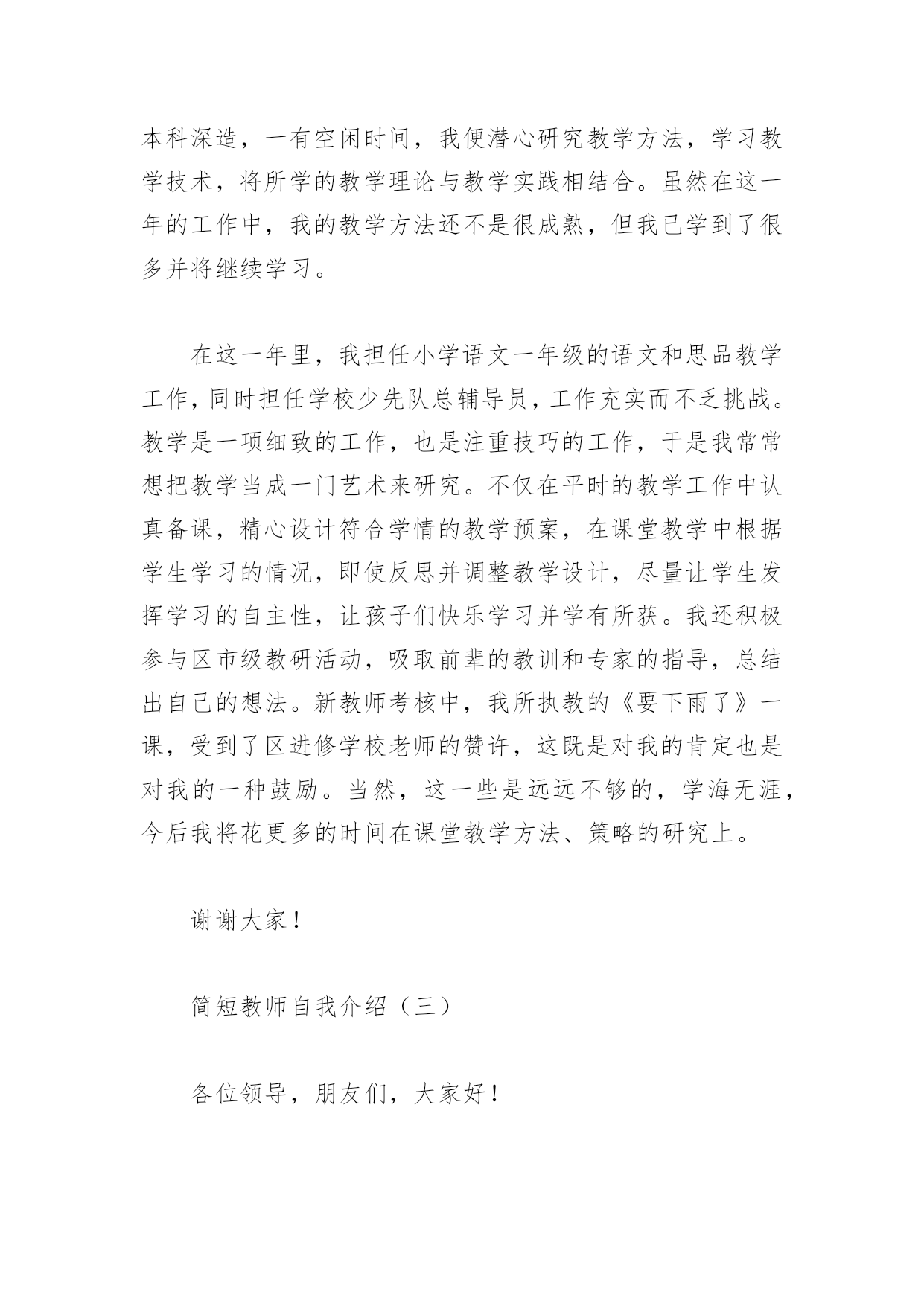 简短教师自我介绍简短教师自我介绍(一)我是一名有着13年教龄的体育教师,中学体育教育一级职称,来到xx中学任教之前,一直工作在xx中学。在十三年的教育教学实践中,通过自己的努力和各学科老师的帮助,逐步形成了自己的教学风格,注重身教,师生相处和谐,有较强的课堂组织调控能力和课程创新能力。积极参加教科研活动,20xx年参加了xx市首批新课程改革试验,并在省教科所体育教研组的带领下,参与了国家级课题《超体重儿童健康行为的实验与研究》的研究,荣获国家二等奖,撰写的论文中,《中学生体育课的教法与激趣》一文发表在《安徽教育论坛》20xx年第二期,《认识CAI》在20xx年xx市电化教学论文评比中获二等奖,《议中学生体育兴趣的培养》一文荣获20xx年度xx中市区教育学会举办的教育教学论文评比二等奖。在学科竞赛中,20xx年获合肥市首届体育教师(初中组)基本功比赛一等奖,同年参加安徽省第二届中小学体育教师教学基本功比赛,获初中组个人总分二等奖。20xx-20xx年获x市学校体育工作先进个人,20xx年被xx区任命为首批骨干教师并保持至今,20xx年获xx市电化教育(现代教育技术)工作先进个人。xx中学工作期间,除了从事体育教育工作之外,还担任其他一些工作,也获得了一些成绩。自xx年开始,一直担任学校团委书记一职,亲手创立的中学生团校在20xx年获得xx省优秀中学生团校示范团校(当年xx唯一),同年获得xx省中学共青团工作先进个人称号;是xx市第十二次团代会代表,也是xx省第十一次团代会代表。担任学校科技活动小组组长其间,在小组全体师生共同努力下,20xx年获首届全国青少年电脑机器人竞赛优秀辅导员称号,并获得中学组创意赛二等奖辅导员奖;20xx年获xx省青少年电脑机器人比赛第一名(领队兼教练);20xx年8月,辅导学生参加xx市第四届中小学电脑制作初中组机器人竞赛,荣获xx市初中组一等奖。在体育专业上,我擅长篮球、排球和羽毛球;在素质拓展中,我曾参加过xxxACCP专业的学习,并获得xx和国家劳动部联合办法的初级软件工程师证书,比较精通网络知识,侧重于动态网站的建设和管理,能熟练运用office软件和Dreamweaver、Flash等软件,曾独自为xx区司法局和组织部建立了单位网站。过去的成绩已经随着原来学校的消失而灰飞烟灭,我将以一名新教师的状态开始我在xx中学的工作。在xx中学富有特色教育教学管理模式的熏陶下,在这温馨和谐的大家庭里,我一定充分发挥自己的优点,积极投身庐中教育,成为一名优秀的教师。简短教师自我介绍(二)各位领导,朋友们,大家好!从xx年x月进入xx小学工作至今已一年,回顾这一年来的工作和学习,本人受益良多。身为一名党员教师,在参加工作的这一年来,本人坚定自己的思想政治方向,定期学习党的各种文献,将自身修养与党性提高相结合,不断提高自身思想觉悟及政策水平。本人严格遵守学校各项规章制度,并积极配合学校工作,认真有效地完成学校及上级领导布置的任务,表现出极好的组织纪律性,于200*年4月接任学区少先队总辅导员一职至今,并在200*年6月被评为学区"优秀辅导员".在与同事的交往中,我以谦虚好学的态度,赢得了大家的帮助和认可;在与家长的接触中,我注意方法方式,耐心细心地进行家校联系工作,深受家长欢迎。"学高为师,德高为范".作为一名新老师,在如今信息技术日新月异,发展很快的年代,自身的学识相当重要。所以工作以来,我不断学习,丝毫不敢松懈,继续学习成为我工作学习中重要的一部分。除了参加新教师培训,我还继续本科深造,一有空闲时间,我便潜心研究教学方法,学习教学技术,将所学的教学理论与教学实践相结合。虽然在这一年的工作中,我的教学方法还不是很成熟,但我已学到了很多并将继续学习。在这一年里,我担任小学语文一年级的语文和思品教学工作,同时担任学校少先队总辅导员,工作充实而不乏挑战。教学是一项细致的工作,也是注重技巧的工作,于是我常常想把教学当成一门艺术来研究。不仅在平时的教学工作中认真备课,精心设计符合学情的教学预案,在课堂教学中根据学生学习的情况,即使反思并调整教学设计,尽量让学生发挥学习的自主性,让孩子们快乐学习并学有所获。我还积极参与区市级教研活动,吸取前辈的教训和专家的指导,总结出自己的想法。新教师考核中,我所执教的《要下雨了》一课,受到了区进修学校老师的赞许,这既是对我的肯定也是对我的一种鼓励。当然,这一些是远远不够的,学海无涯,今后我将花更多的时间在课堂教学方法、策略的研究上。谢谢大家!简短教师自我介绍(三)各位领导,朋友们,大家好!从教十八年,我就是十八年的班主任、语文教师,在班级管理中,我积累了一定的管理经验,掌握不同学段的管理方式,所教班级多次被评为优秀班集体。也正因为这样,这次知行中国班主任培训,我作为一名一线的班主任