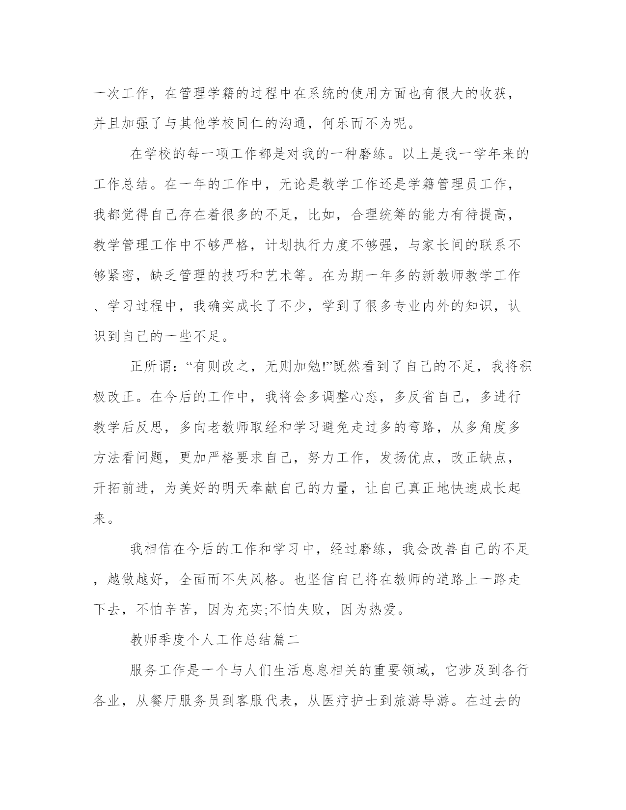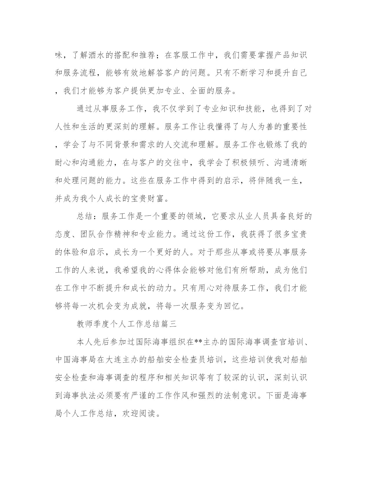 2023年教师季度个人工作总结个人年终工作总结个人工作总结(精选16篇)对某一单位、某一部门工作进行全面性总结,既反映工作的概况,取得的成绩,存在的问题、缺点,也要写经验教训和今后如何改进的意见等。那关于总结格式是怎样的呢?而个人总结又该怎么写呢?下面是我给大家整理的总结范文,欢迎大家阅读分享借鉴,希望对大家能够有所帮助。教师季度个人工作总结篇一回顾初上工作岗位的这一年多,在各位领导和老师的热心支持和帮助下,我认真做好教学工作,积极完成学校布置的各项任务。下面我把这期间的工作做简要的汇报总结。一、师德表现一年来,我在思想上严以律己,热爱党的教育事业。在工作中更是时时刻刻严格要求自己,积极参加各类学习活动,努力提高自己的思想觉悟和业务水平。服从学校的工作安排,配合领导、老师们做好校内外的各项工作。二、教育教学情况在教学工作中,我注意做到以下几点:1、深入细致的备好每一节课。在备课中,我认真分析教材,力求准确把握重点,难点。并注重参阅各种资料,制定符合学生认知规律的教学方法及教学形式。注意弱化难点强调重点。教案编写认真,并不断归纳总结提高教学水平。2、认真上好每一节课。上课时注重学生主动性的发挥,发散学生的思维,注重综合能力的培养,有意识的培养学生的思维的严谨性及逻辑性,在教学中提高学生的思维素质,保证每一节课的质量。3、认真及时批改作业,注意听取学生的意见,及时了解学生的学习情况和相关动态,并有目的的对学生进行辅导。4、坚持听课,注意学习组里老师的教学经验,努力探索适合自己的教学模式。能够做到坚持听课,对自己的教学促进很大。不仅如此,还抓住每次外出学习的机会,取长补短,收获良多。5、注重教育理论的学习,并注意把一些先进的理论应用于课堂,做到学有所用。6、扎实自己的基本功。通过向老教师和优秀教师、网络课堂的学习,切实提高自己的基本功。三、幼儿园工作情况与学籍管理管理员工作。上班初,学校领导出于对学校教师的合理安排,让我一个普校毕业生一进校幼儿园的班主任工作,在担当幼儿园班主任期间认识到工作的重要性,除了维持好正常的教学秩序,保证同学良好的学习环境外,更应该关注每一个学生的思想状况,全面了解学生的生活情况和家庭背景。我严格的从孩子的身心健康发展为出发点安排自己的工作。后来应全国的电子学籍建设工作,学校让我负责学籍的相关工作,从最初的开会,到后期的学籍的录入,导入系统我都认真的完成每一次工作,在管理学籍的过程中在系统的使用方面也有很大的收获,并且加强了与其他学校同仁的沟通,何乐而不为呢。在学校的每一项工作都是对我的一种磨练。以上是我一学年来的工作总结。在一年的工作中,无论是教学工作还是学籍管理员工作,我都觉得自己存在着很多的不足,比如,合理统筹的能力有待提高,教学管理工作中不够严格,计划执行力度不够强,与家长间的联系不够紧密,缺乏管理的技巧和艺术等。在为期一年多的新教师教学工作、学习过程中,我确实成长了不少,学到了很多专业内外的知识,认识到自己的一些不足。正所谓:“有则改之,无则加勉!”既然看到了自己的不足,我将积极改正。在今后的工作中,我将会多调整心态,多反省自己,多进行教学后反思,多向老教师取经和学习避免走过多的弯路,从多角度多方法看问题,更加严格要求自己,努力工作,发扬优点,改正缺点,开拓前进,为美好的明天奉献自己的力量,让自己真正地快速成长起来。我相信在今后的工作和学习中,经过磨练,我会改善自己的不足,越做越好,全面而不失风格。也坚信自己将在教师的道路上一路走下去,不怕辛苦,因为充实;不怕失败,因为热爱。教师季度个人工作总结篇二服务工作是一个与人们生活息息相关的重要领域,它涉及到各行各业,从餐厅服务员到客服代表,从医疗护士到旅游导游。在过去的一段时间里,我有幸从事了一份服务工作岗位,并且通过这个经历学到了很多。在这篇文章中,我将总结一些我个人在服务工作中获得的心得体会,分享给大家。第二段:态度至关重要。在服务工作中,态度是决定成败的关键。要想取得客户的满意和信任,我们必须要展现出诚挚、友善和专业的态度。不论是餐厅服务员还是客服代表,我们都要学会聆听客户的需求,尊重他们的意见,并提供积极的解决方案。正确认识到自己是为客户提供服务的,而不是高高在上的“老板”,能够帮助我们更好地与客户建立起良好的沟通和信任关系。第三段:团队合作也同样重要。在服务工作中,团队合作也起到了至关重要的作用。无论是酒店接待员还是旅游导游,我们都要与其他团队成员配合默契,合作无间。团队合作不仅能够提高工作效率,还能增加服务质量。通过共同努力,我们能够更好地解决问题,处理紧急情况,并取得更大的成就。同时,团队合作也能够让我们学会互相支持和倾听,从而提高工作和生活的质量。第四段:专业能力是基础。无论在什么行业,