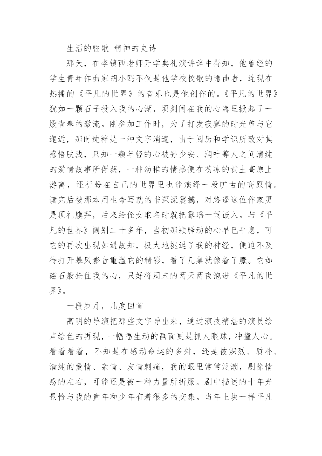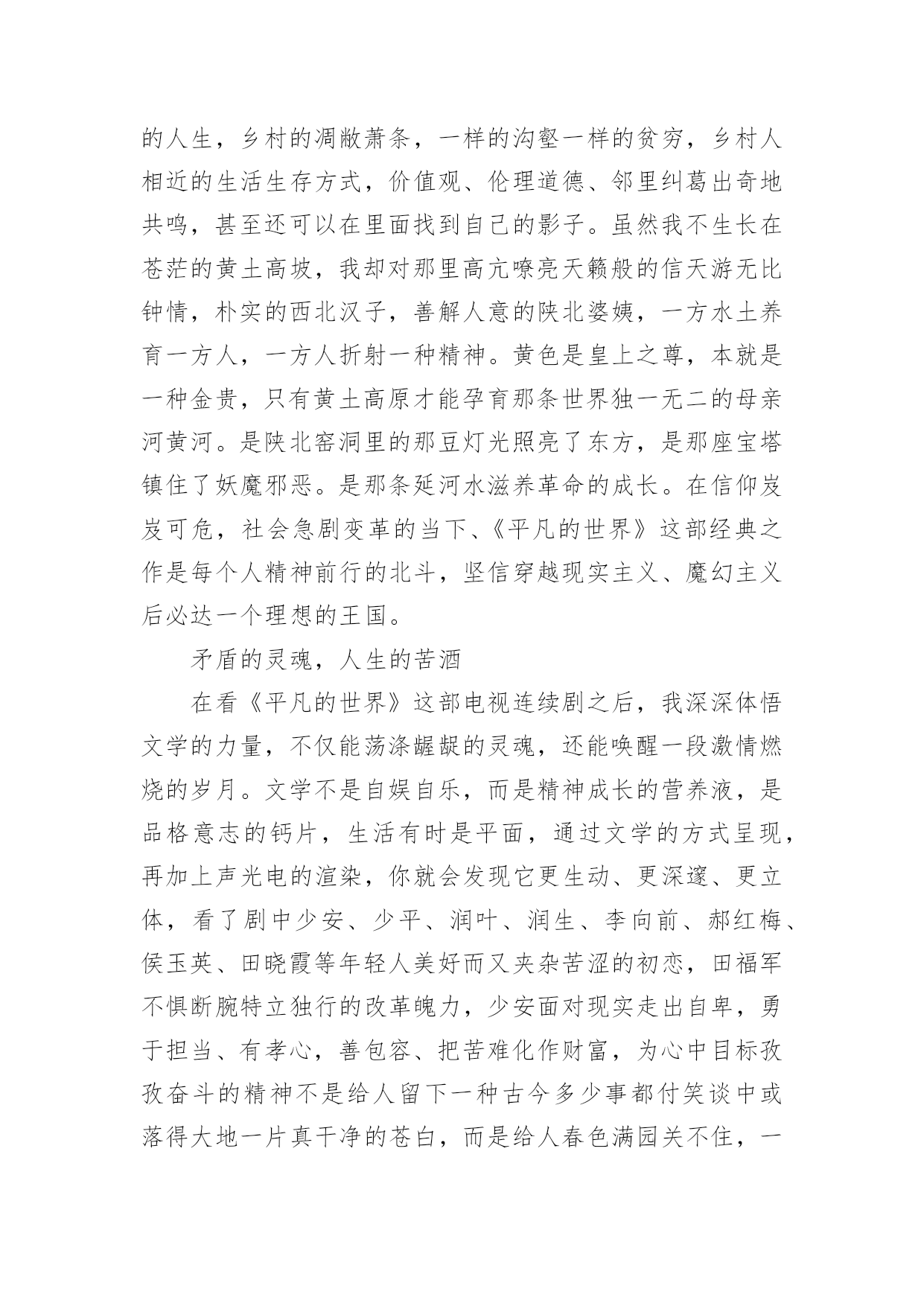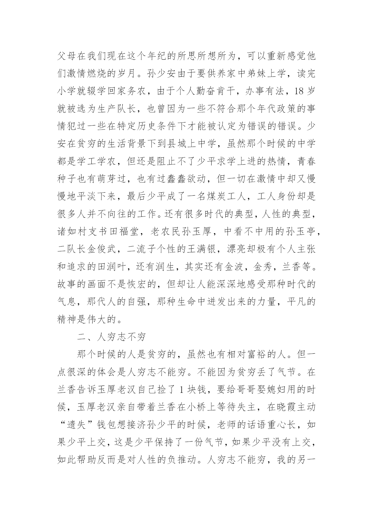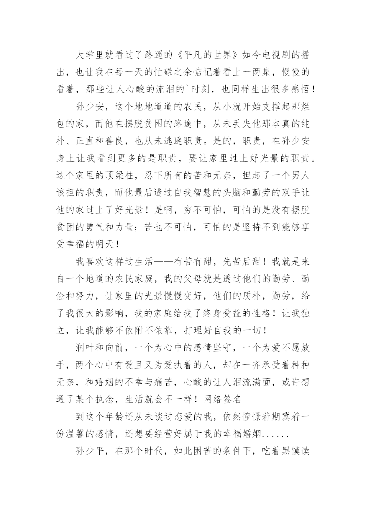 《平凡的世界》观后感《平凡的世界》观后感集合4篇在看完一部作品以后,相信你一定有很多值得分享的收获,为此就要认真思考观后感如何写了。到底应如何写观后感呢?下面是小编精心整理的《平凡的世界》观后感,供大家参考借鉴,希望可以帮助到有需要的朋友。《平凡的世界》观后感篇1电视剧《平凡的世界》是之前的一部大戏,是根据小说改编的,这个是我们不陌生的,电视剧《平凡的世界》观后感范文1000字一起欣赏一下!近段日子,一鼓作气把电视剧《平凡的世界》给看完了,说实话之前就有看过路遥《平凡的世界》系列小说,第一次接触这部小说,还只是单纯的因为这是获得茅盾文学奖的作品,看过了才发现一发不可收拾,也只有看过了,才很久都不敢触碰这部书,总是感觉心灵深处被触动着。一、简介先谈谈我对这部书的整体映像吧,故事围绕着在陕北高土地上的一个平凡而普通的农村展开,时间跨越了文革到改革开放前几年,故事的主角是孙姓兄弟,有不屈从于命运的少平,有努力改变家中生活光景的少安。这是一部讲述父辈故事的书,虽然我的父辈并没有重复孙姓兄弟的故事,但在特定的年代下,我感到可以触及父辈的故事,可以重新体会父母在我们现在这个年纪的所思所想所为,可以重新感觉他们激情燃烧的岁月。孙少安由于要供养家中弟妹上学,读完小学就辍学回家务农,由于个人勤奋肯干,办事有法,18岁就被选为生产队长,也曾因为一些不符合那个年代政策的事情犯过一些在特定历史条件下才能被认定为错误的错误。少安在贫穷的生活背景下到县城上中学,虽然那个时候的中学都是学工学农,但还是阻止不了少平求学上进的热情,青春种子也有萌芽过,也有过蠢蠢欲动,但一切在激情中却又慢慢地平淡下来,最后少平成了一名煤炭工人,工人身份却是很多人并不向往的工作。还有很多时代的典型,人性的典型,诸如村支书田福堂,老农民孙玉厚,中看不中用的孙玉亭,二队长金俊武,二流子个性的王满银,漂亮却极有个人主张和追求的田润叶,还有润生,其实还有金波,金秀,兰香等。故事的画面不是恢宏的,但却让人能深深地感受那种时代的气息,那代人的自强,那种生命中迸发出来的力量,平凡的精神是伟大的。二、人穷志不穷那个时候的人是贫穷的,虽然也有相对富裕的人。但一点很深的体会是人穷志不能穷。不能因为贫穷丢了气节。在兰香告诉玉厚老汉自己捡了1块钱,要给哥哥娶媳妇用的时候,玉厚老汉亲自带着兰香在小桥上等待失主,在晓霞主动“遗失”钱包想接济孙少平的时候,老师的话语重心长,如果少平上交,这是少平保持了一份气节,如果少平没有上交,如此帮助反而是对人性的负推动。人穷志不能穷,我的另一点理解是,在贫穷的生活中,要有理解,要有奋斗,要能吃苦,要不怕苦。少平有自己的理想,他看读书,看思考,向往着能够成为一名有身份,有生活尊严的人。少安也有自己的想法,想把全家的光景过好,包括晓霞、兰香等,也许我们的父辈并不能指出我们应该有什么样了理想,应该向往什么,他们告诉了我们生活的底线,哪些是我们不能触碰的,但他们可能无法告诉我们我们追求的应该是什么,他们有他们的局限性,也可以说是历史的局限性。作为我们,要保持良好品质,也要积极进取,努力实现理想,起码要做好自己该做的,我们要接过父辈手中的职责,帮助家里把光景过好。三、要有道道,而且不是空道道现在这个社会讲要能说会道,其实那个年代也要求能说会道,但说什么,能说的同时会不会做,孙玉亭就是一个很典型的例子,他积极的参加大队支委会,参加各种议事,关心国家时政,也打着自己的小九九,但这种人并不很受人待见。他本是太原钢厂的工人,却因为自己怕苦,因为生活作风的问题被厂子开除,参加劳动不积极,并不是所谓的领导却有着领导的作派,喜欢指手划脚却没啥大本事。两口子天天过在理想的口号中,却不是最坚定的理想主义者。看着就觉得有点猥琐,也许这个词用得不恰当,但很不受人待见。我在想人,除了会说,最基础的应该是会脚踏实地去做,然后才是带着自己思想的会说,而不是人云亦云地喊口号。《平凡的世界》观后感篇2《平凡的世界》,全景式地描写了中国现代城乡生活,通过复杂的矛盾纠葛,以孙少平等人为代表刻画了社会各阶层普通人们的形象,人的自尊、自强与自信,人生的奋斗与拼搏、挫折与追求、痛苦与欢乐,纷繁地交织,读来令人荡气回肠。最让我赏识的是,从这些平凡人的故事中,作者给我们引发了一个深刻的道理,那就是我们怎么去生活,和我们对生活的态度的与思考,书中多次提到对人生的感叹,这可能是这本书的深邃所在,也是这本书的精华。人生啊!是这样不可预测。没有用永恒的痛苦,没有永恒的幸福。生活像流水一般,有时是那么平展,有时又是那么曲折。命运总是不如人愿。但往往是在无数的痛苦中,在重重的矛盾和艰辛中才使人成熟起来,坚强起来,虽然这些东西在实际感受中给人带来的并不都是欢乐。。在一个喧嚣浮躁、道德危机的时代,每一个还拥有梦想并在追梦的人们都该再重温《