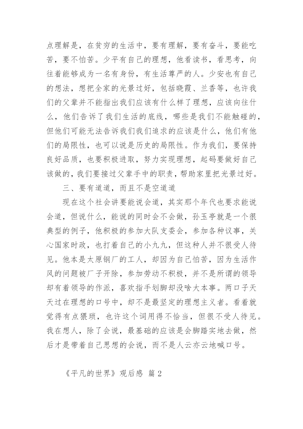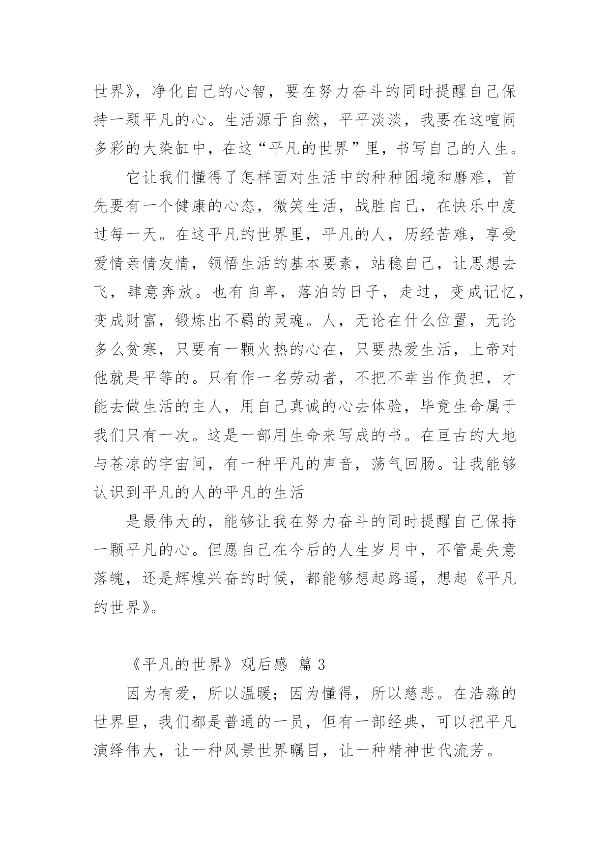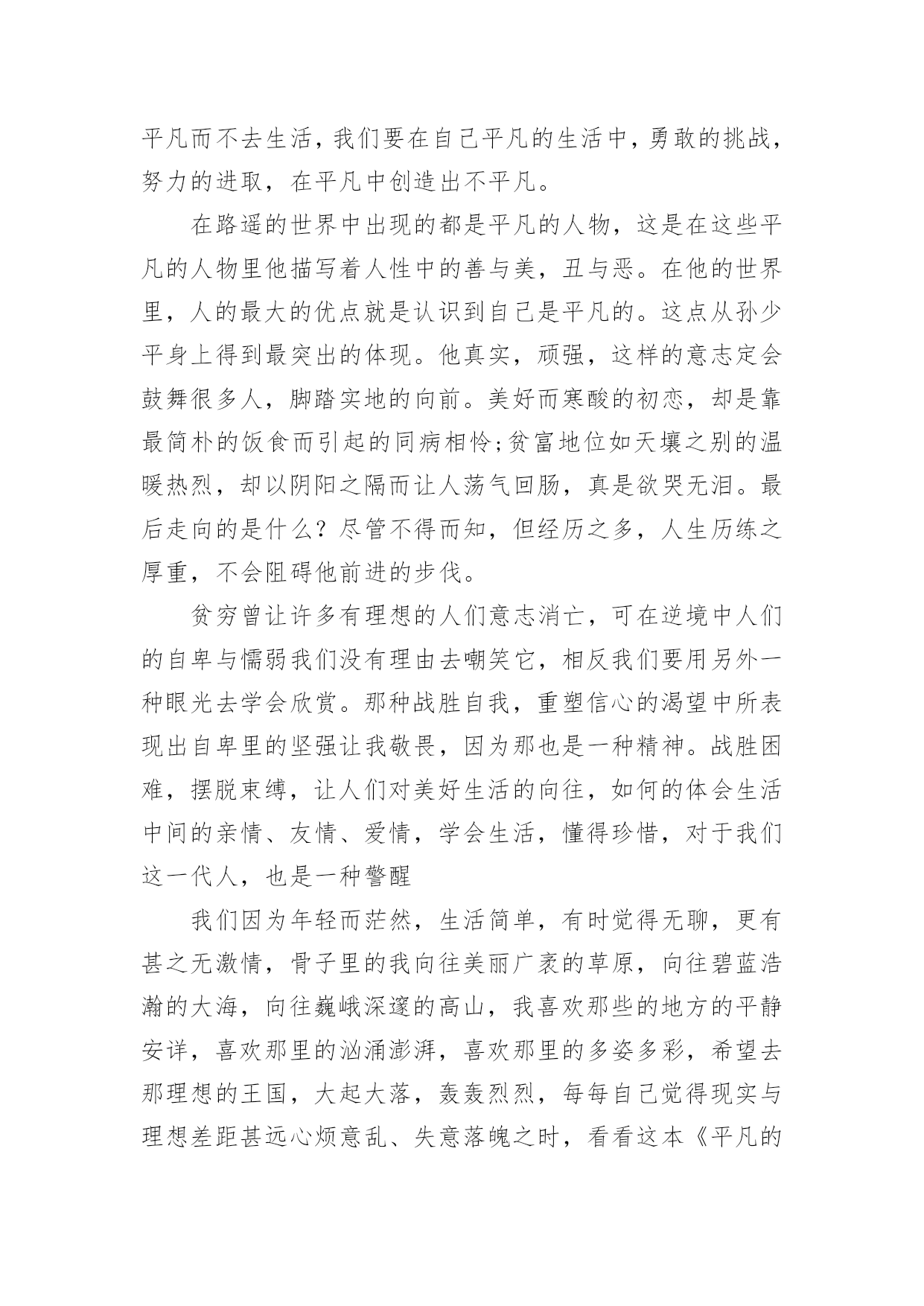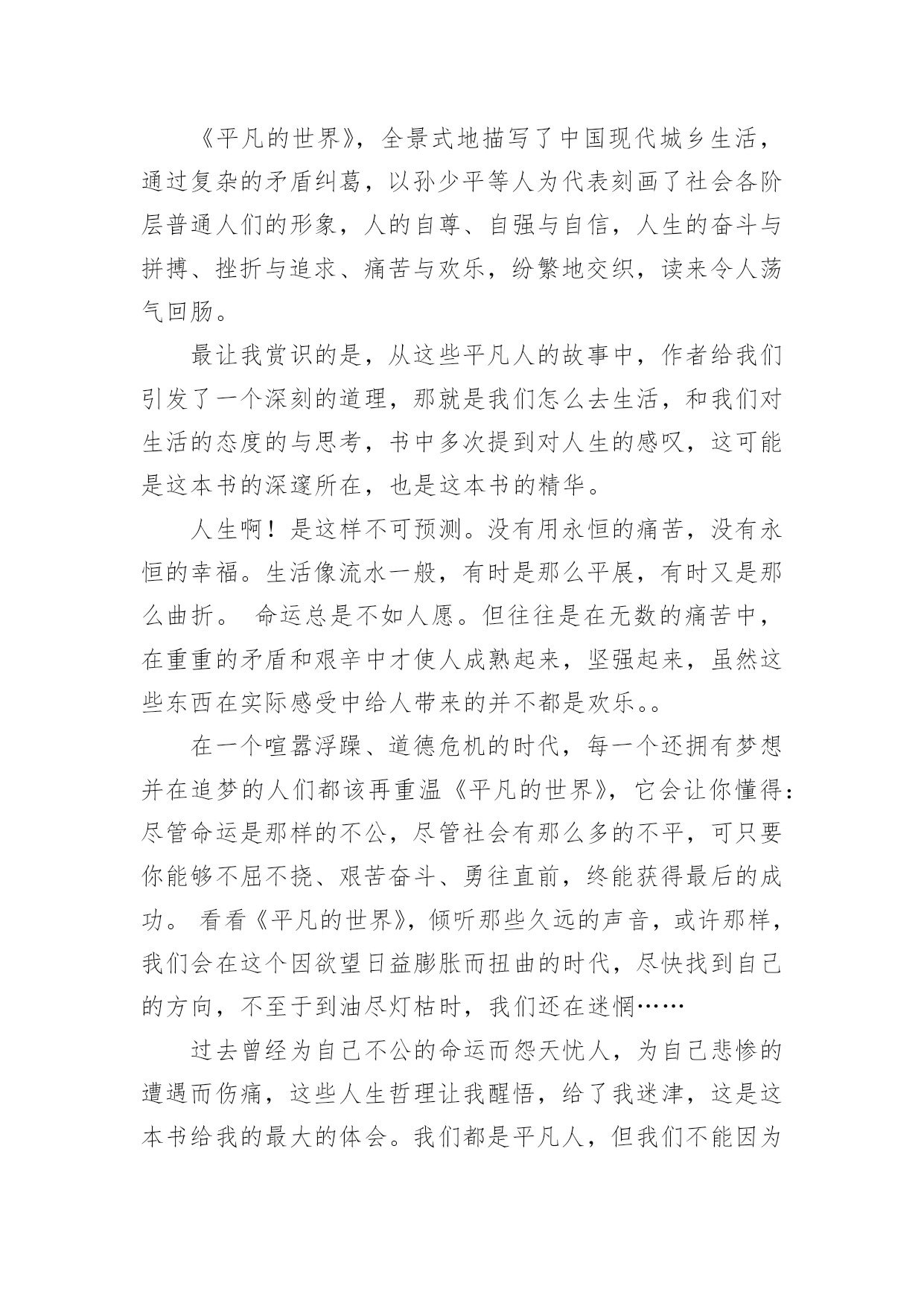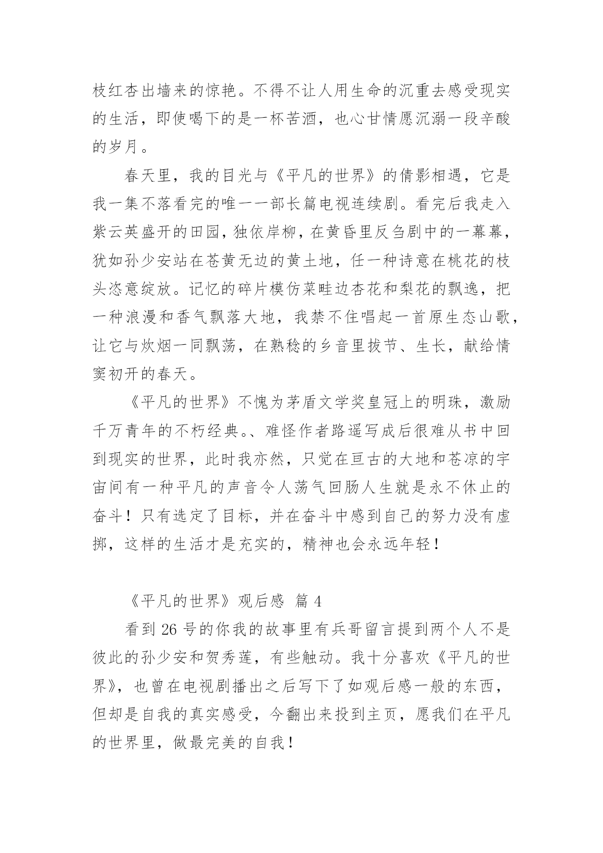 《平凡的世界》观后感《平凡的世界》观后感集合4篇在看完一部作品以后,相信你一定有很多值得分享的收获,为此就要认真思考观后感如何写了。到底应如何写观后感呢?下面是小编精心整理的《平凡的世界》观后感,供大家参考借鉴,希望可以帮助到有需要的朋友。《平凡的世界》观后感篇1电视剧《平凡的世界》是之前的一部大戏,是根据小说改编的,这个是我们不陌生的,电视剧《平凡的世界》观后感范文1000字一起欣赏一下!近段日子,一鼓作气把电视剧《平凡的世界》给看完了,说实话之前就有看过路遥《平凡的世界》系列小说,第一次接触这部小说,还只是单纯的因为这是获得茅盾文学奖的作品,看过了才发现一发不可收拾,也只有看过了,才很久都不敢触碰这部书,总是感觉心灵深处被触动着。一、简介先谈谈我对这部书的整体映像吧,故事围绕着在陕北高土地上的一个平凡而普通的农村展开,时间跨越了文革到改革开放前几年,故事的主角是孙姓兄弟,有不屈从于命运的少平,有努力改变家中生活光景的少安。这是一部讲述父辈故事的书,虽然我的父辈并没有重复孙姓兄弟的故事,但在特定的年代下,我感到可以触及父辈的故事,可以重新体会父母在我们现在这个年纪的所思所想所为,可以重新感觉他们激情燃烧的岁月。孙少安由于要供养家中弟妹上学,读完小学就辍学回家务农,由于个人勤奋肯干,办事有法,18岁就被选为生产队长,也曾因为一些不符合那个年代政策的事情犯过一些在特定历史条件下才能被认定为错误的错误。少安在贫穷的生活背景下到县城上中学,虽然那个时候的中学都是学工学农,但还是阻止不了少平求学上进的热情,青春种子也有萌芽过,也有过蠢蠢欲动,但一切在激情中却又慢慢地平淡下来,最后少平成了一名煤炭工人,工人身份却是很多人并不向往的工作。还有很多时代的典型,人性的典型,诸如村支书田福堂,老农民孙玉厚,中看不中用的孙玉亭,二队长金俊武,二流子个性的王满银,漂亮却极有个人主张和追求的田润叶,还有润生,其实还有金波,金秀,兰香等。故事的画面不是恢宏的,但却让人能深深地感受那种时代的气息,那代人的自强,那种生命中迸发出来的力量,平凡的精神是伟大的。二、人穷志不穷那个时候的人是贫穷的,虽然也有相对富裕的人。但一点很深的体会是人穷志不能穷。不能因为贫穷丢了气节。在兰香告诉玉厚老汉自己捡了1块钱,要给哥哥娶媳妇用的时候,玉厚老汉亲自带着兰香在小桥上等待失主,在晓霞主动“遗失”钱包想接济孙少平的时候,老师的话语重心长,如果少平上交,这是少平保持了一份气节,如果少平没有上交,如此帮助反而是对人性的负推动。人穷志不能穷,我的另一点理解是,在贫穷的生活中,要有理解,要有奋斗,要能吃苦,要不怕苦。少平有自己的理想,他看读书,看思考,向往着能够成为一名有身份,有生活尊严的人。少安也有自己的想法,想把全家的光景过好,包括晓霞、兰香等,也许我们的父辈并不能指出我们应该有什么样了理想,应该向往什么,他们告诉了我们生活的底线,哪些是我们不能触碰的,但他们可能无法告诉我们我们追求的应该是什么,他们有他们的局限性,也可以说是历史的局限性。作为我们,要保持良好品质,也要积极进取,努力实现理想,起码要做好自己该做的,我们要接过父辈手中的职责,帮助家里把光景过好。三、要有道道,而且不是空道道现在这个社会讲要能说会道,其实那个年代也要求能说会道,但说什么,能说的同时会不会做,孙玉亭就是一个很典型的例子,他积极的参加大队支委会,参加各种议事,关心国家时政,也打着自己的小九九,但这种人并不很受人待见。他本是太原钢厂的工人,却因为自己怕苦,因为生活作风的问题被厂子开除,参加劳动不积极,并不是所谓的领导却有着领导的作派,喜欢指手划脚却没啥大本事。两口子天天过在理想的口号中,却不是最坚定的理想主义者。看着就觉得有点猥琐,也许这个词用得不恰当,但很不受人待见。我在想人,除了会说,最基础的应该是会脚踏实地去做,然后才是带着自己思想的会说,而不是人云亦云地喊口号。《平凡的世界》观后感篇2《平凡的世界》,全景式地描写了中国现代城乡生活,通过复杂的矛盾纠葛,以孙少平等人为代表刻画了社会各阶层普通人们的形象,人的自尊、自强与自信,人生的奋斗与拼搏、挫折与追求、痛苦与欢乐,纷繁地交织,读来令人荡气回肠。最让我赏识的是,从这些平凡人的故事中,作者给我们引发了一个深刻的道理,那就是我们怎么去生活,和我们对生活的态度的与思考,书中多次提到对人生的感叹,这可能是这本书的深邃所在,也是这本书的精华。人生啊!是这样不可预测。没有用永恒的痛苦,没有永恒的幸福。生活像流水一般,有时是那么平展,有时又是那么曲折。命运总是不如人愿。但往往是在无数的痛苦中,在重重的矛盾和艰辛中才使人成熟起来,坚强起来,虽然这些东西在实际感受中给人带来的并不都是欢乐。。在一个喧嚣浮躁、道德危机的时代,每一个还拥有梦想并在追梦的人们都该再重温《