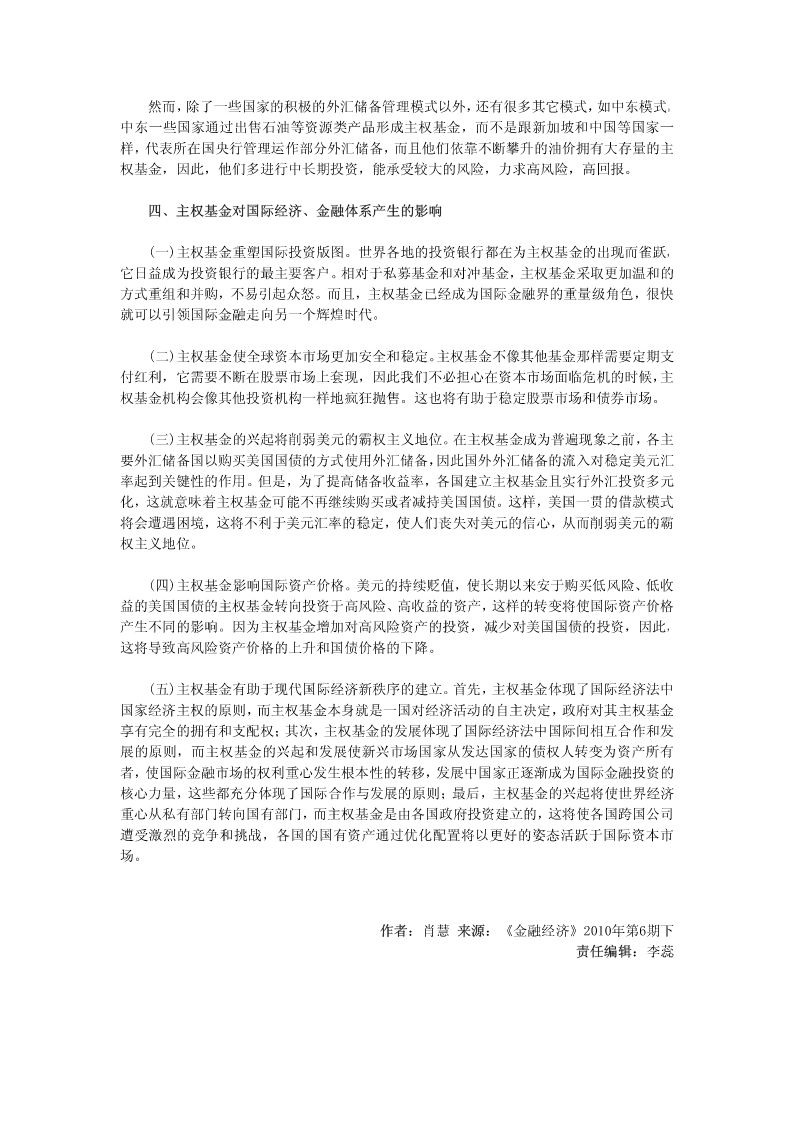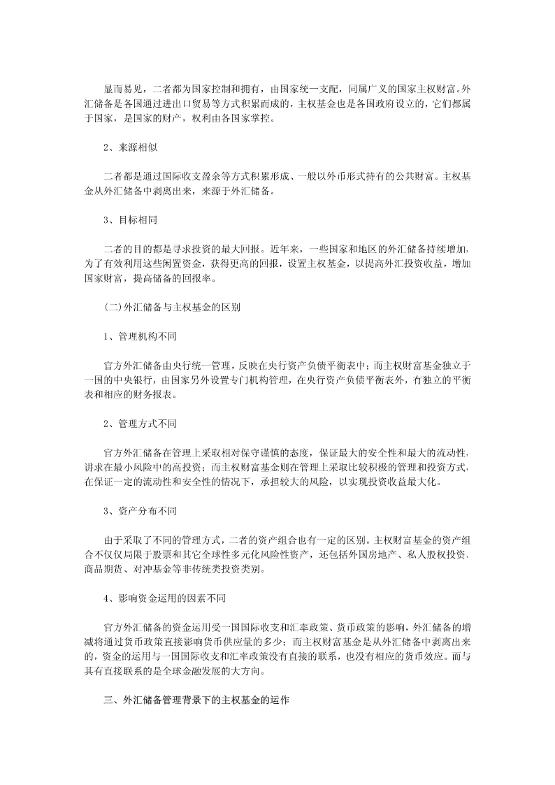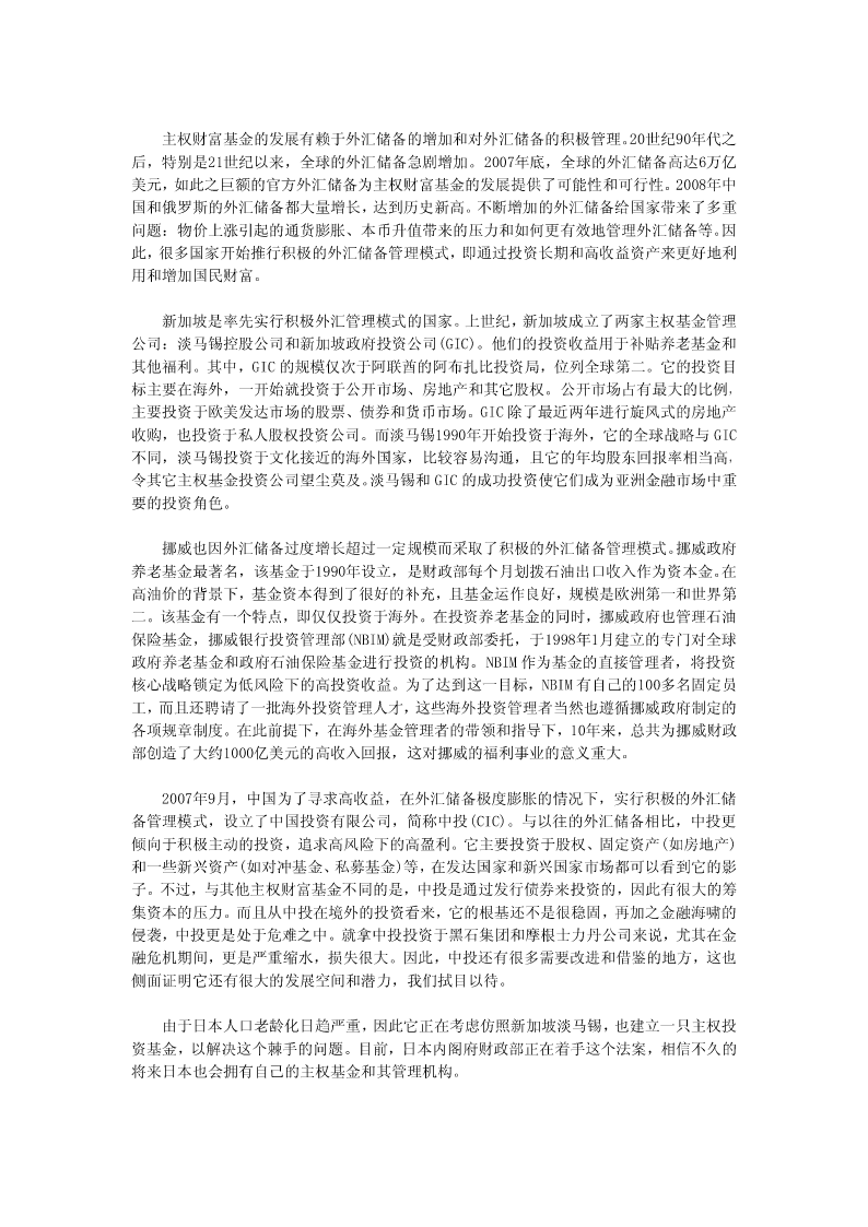 外汇储备管理与主权基金的发展摘要:随着全球各国政府部门和中央银行拥有的储备资产飞速增长,主权基金近年来发展迅速,规模快速扩张,主权基金已经引起了国际社会的普遍关注。外汇储备是主权基金的主要来源之一,本文对外汇储备及主权基金做了比较分析,阐述了主权基金的发展历程及对国际经济与金融体系的影响。关键词:主权基金,外汇储备,投资在过去几年里,一些国家的外汇盈余持续增加,特别是新兴市场国家和产油国累积了大量国际资产。为了提高这些资产的投资收益,这些国家和地区在外汇储备安全性和流动性得到保证之下,将一部分外汇储备剥离出来,成立专门的投资公司,也就是“主权基金”。近年来,各种形式的主权基金大量涌现,成为国际金融市场中的一支新兴力量,起着举足轻重的作用。随着我国国际收支持续“双顺差”,我国的外汇储备规模不断扩大,目前,我国拥有的外汇储备已居世界首位。如何提高外汇储备使用效率及盈利能力是我国储备资产管理当局面临的巨大挑战。在满足对外汇储备常规需求的基础上,为了更有效地经营管理好这些储备以获得更高回报,有必要寻求一种积极的外汇储备管理模式。2007年我国设立国家主权基金,这是促进国际收支平衡、提高资产收益率、有助于降低外汇储备存量的一个长期制度安排,是推行外汇储备多元化管理,提高外汇投资收益的理性选择。一、主权基金的发展历程主权基金又称主权财富基金,指由主权国家政府建立并拥有的由股票、债券或其它金融资产组成的基金,主要来源于国家财政盈余、外汇储备盈余、自然资源出口盈余等,由政府设置专门的投资机构管理。目前,阿拉伯联合酋长国、挪威、沙特阿拉伯王国、中国、科威特、俄罗斯和新加坡是世界上主权财富基金规模最大的几个国家。最早的主权财富基金要追溯到1953年成立的科威特投资局。此后,为提高销售石油获得的资金收益率,阿联酋、伊朗等产油国也成了了主权基金,以应对国家未来面临的发展困境。自上世纪80年代开始,新加坡、马来西亚等亚洲的出口型国家,为了提高外汇储备的投资收益,也纷纷建立了主权财富基金。据统计,到2007年底,共有36个国家和地区建立了主权财富基金,资金规模约3.3万亿美元。其中,阿联酋成立的阿布扎比投资局规模最大,拥有基金高达9000亿美元;中国和俄罗斯的主权基金规模也达到2000亿美元和1280亿美元。据测,到2010年和2015年,主权基金的资产规模将有望达到5万亿美元和10万亿美元。同时,日本、德国、印度等一些国家也正在考虑设立主权财富基金。二、外汇储备与主权基金的联系与区别一般情况下,人们在提到主权财富基金时,都会将之与官方外汇储备相混淆。实际上,它们是相互联系、相互区别、相互影响的。(一)外汇储备与主权基金的相似处1、归属地相同显而易见,二者都为国家控制和拥有,由国家统一支配,同属广义的国家主权财富。外汇储备是各国通过进出口贸易等方式积累而成的,主权基金也是各国政府设立的,它们都属于国家,是国家的财产,权利由各国家掌控。2、来源相似二者都是通过国际收支盈余等方式积累形成、一般以外币形式持有的公共财富。主权基金从外汇储备中剥离出来,来源于外汇储备。3、目标相同二者的目的都是寻求投资的最大回报。近年来,一些国家和地区的外汇储备持续增加,为了有效利用这些闲置资金,获得更高的回报,设置主权基金,以提高外汇投资收益,增加国家财富,提高储备的回报率。(二)外汇储备与主权基金的区别1、管理机构不同官方外汇储备由央行统一管理,反映在央行资产负债平衡表中;而主权财富基金独立于一国的中央银行,由国家另外设置专门机构管理,在央行资产负债平衡表外,有独立的平衡表和相应的财务报表。2、管理方式不同官方外汇储备在管理上采取相对保守谨慎的态度,保证最大的安全性和最大的流动性,讲求在最小风险中的高投资;而主权财富基金则在管理上采取比较积极的管理和投资方式,在保证一定的流动性和安全性的情况下,承担较大的风险,以实现投资收益最大化。3、资产分布不同由于采取了不同的管理方式,二者的资产组合也有一定的区别。主权财富基金的资产组合不仅仅局限于股票和其它全球性多元化风险性资产,还包括外国房地产、私人股权投资、商品期货、对冲基金等非传统类投资类别。4、影响资金运用的因素不同官方外汇储备的资金运用受一国国际收支和汇率政策、货币政策的影响,外汇储备的增减将通过货币政策直接影响货币供应量的多少;而主权财富基金是从外汇储备中剥离出来的,资金的运用与一国国际收支和汇率政策没有直接的联系,也没有相应的货币效应。而与其有直接联系的是全球金融发展的大方向。三、外汇储备管理背景下的主权基金的运作主权财富基金的发展有赖于外汇储备的