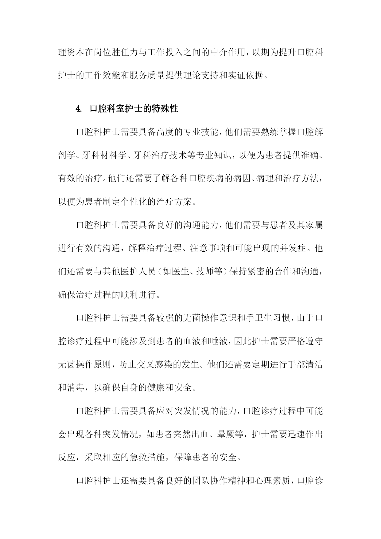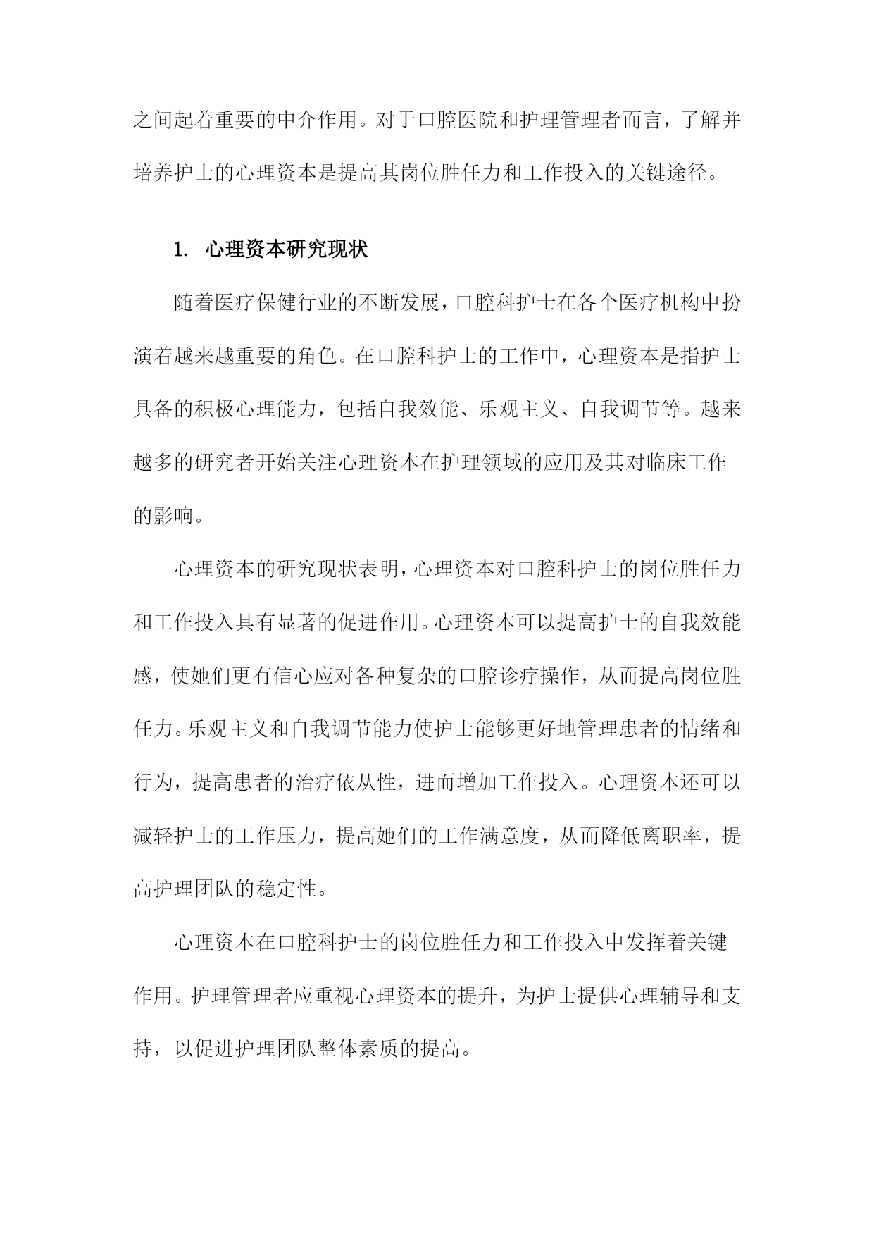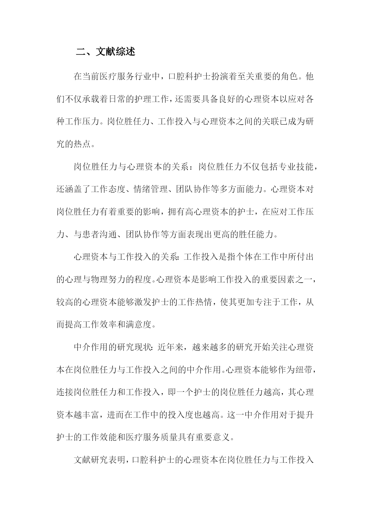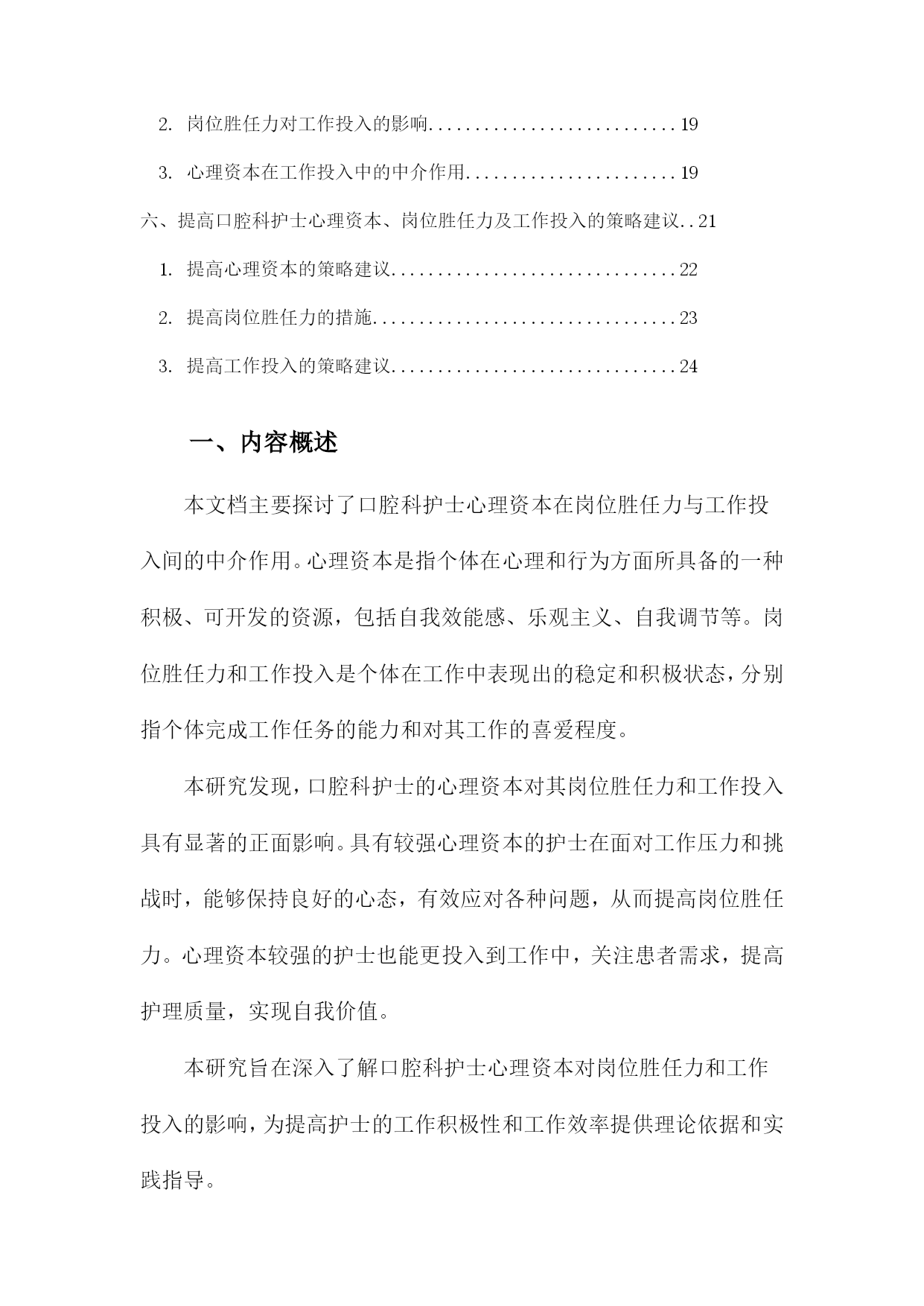 口腔科护士心理资本在岗位胜任力与工作投入间的中介作用目录一、内容概述................................................2二、文献综述................................................21.心理资本研究现状......................................42.岗位胜任力研究现状....................................43.工作投入研究现状......................................54.口腔科室护士的特殊性..................................7三、研究方法................................................81.研究对象..............................................92.研究工具.............................................103.数据收集与处理.......................................10四、研究结果分析...........................................111.口腔科护士心理资本现状分析...........................122.岗位胜任力现状分析...................................133.工作投入现状分析.....................................144.心理资本在岗位胜任力与工作投入间的中介作用分析.......15五、心理资本在岗位胜任力与工作投入间的中介作用机制探讨.....161.心理资本对岗位胜任力的影响...........................172.岗位胜任力对工作投入的影响...........................193.心理资本在工作投入中的中介作用.......................19六、提高口腔科护士心理资本、岗位胜任力及工作投入的策略建议..211.提高心理资本的策略建议...............................222.提高岗位胜任力的措施.................................233.提高工作投入的策略建议...............................24一、内容概述本文档主要探讨了口腔科护士心理资本在岗位胜任力与工作投入间的中介作用。心理资本是指个体在心理和行为方面所具备的一种积极、可开发的资源,包括自我效能感、乐观主义、自我调节等。岗位胜任力和工作投入是个体在工作中表现出的稳定和积极状态,分别指个体完成工作任务的能力和对其工作的喜爱程度。本研究发现,口腔科护士的心理资本对其岗位胜任力和工作投入具有显著的正面影响。具有较强心理资本的护士在面对工作压力和挑战时,能够保持良好的心态,有效应对各种问题,从而提高岗位胜任力。心理资本较强的护士也能更投入到工作中,关注患者需求,提高护理质量,实现自我价值。本研究旨在深入了解口腔科护士心理资本对岗位胜任力和工作投入的影响,为提高护士的工作积极性和工作效率提供理论依据和实践指导。二、文献综述在当前医疗服务行业中,口腔科护士扮演着至关重要的角色。他们不仅承载着日常的护理工作,还需要具备良好的心理资本以应对各种工作压力。岗位胜任力、工作投入与心理资本之间的关联已成为研究的热点。岗位胜任力与心理资本的关系:岗位胜任力不仅包括专业技能,还涵盖了工作态度、情绪管理、团队协作等多方面能力。心理资本对岗位胜任力有着重要的影响,拥有高心理资本的护士,在应对工作压力、与患者沟通、团队协作等方面表现出更高的胜任能力。心理资本与工作投入的关系:工作投入是指个体在工作中所付出的心理与物理努力的程度。心理资本是影响工作投入的重要因素之一,较高的心理资本能够激发护士的工作热情,使其更加专注于工作,从而提高工作效率和满意度。中介作用的研究现状:近年来,越来越多的研究开始关注心理资本在岗位胜任力与工作投入之间的中介作用。心理资本能够作为纽带,连接岗位胜任力和工作投入,即一个护士的岗位胜任力越高,其心理资本越丰富,进而在工作中的投入度也越高。这一中介作用对于提升护士的工作效能和医疗服务质量具有重要意义。文献研究表明,口腔科护士的心理资本在岗位胜任力与工作投入之间起着重要的中介作用。对于口腔医院和护理管理者而言,了解并培养护士的心理资本是提