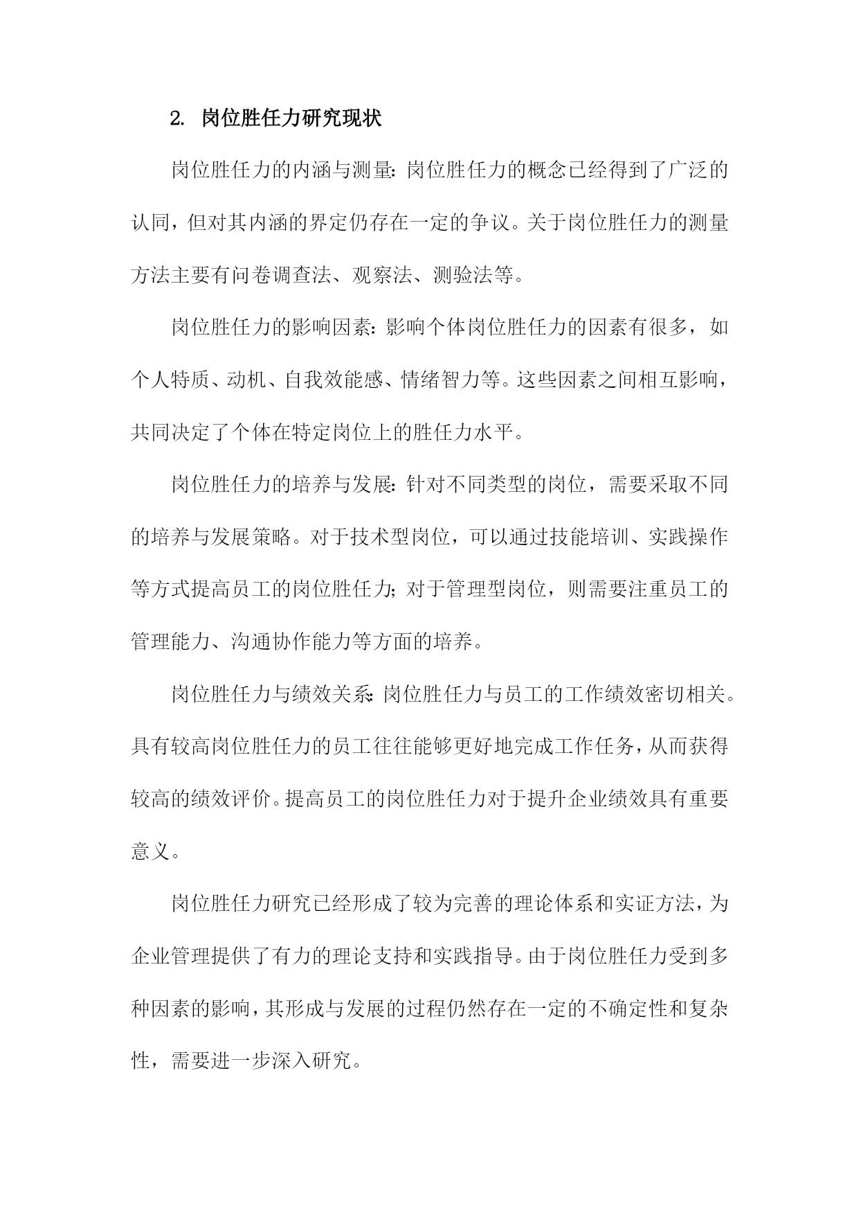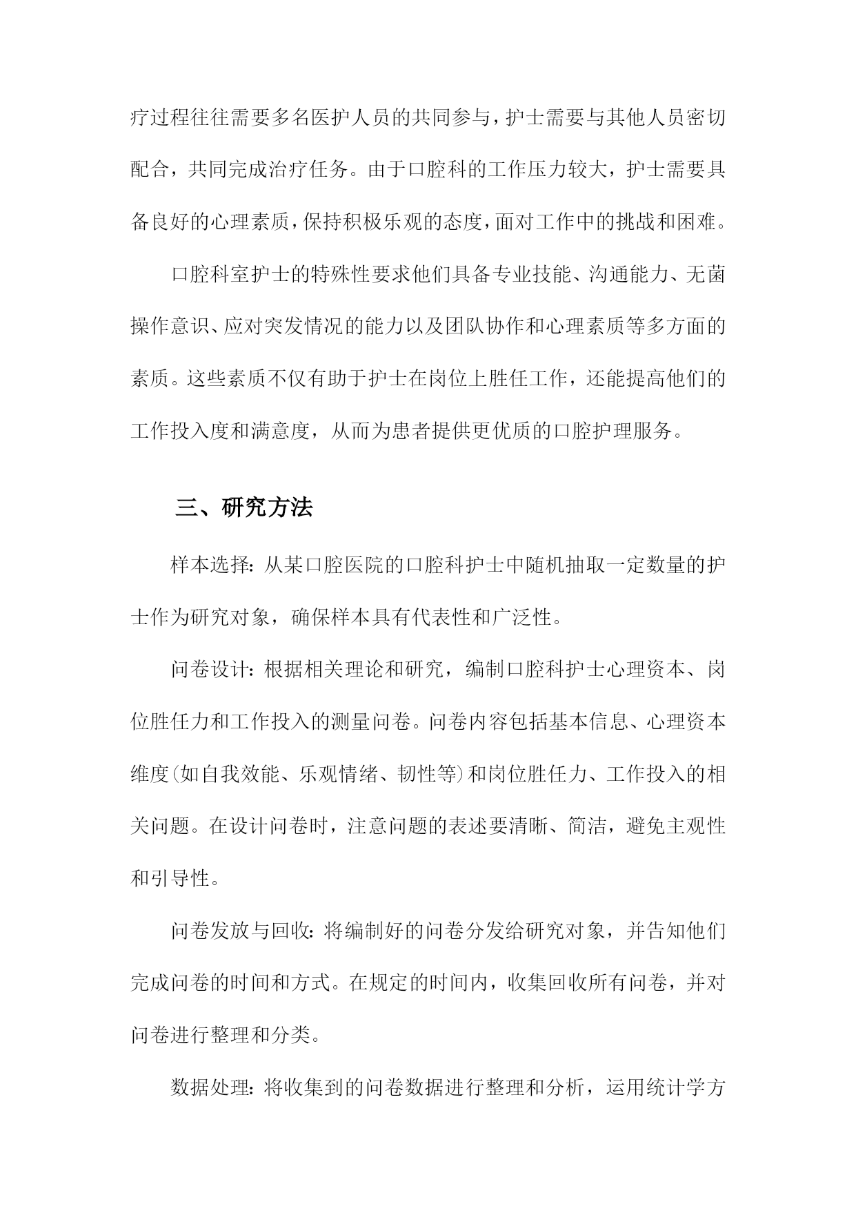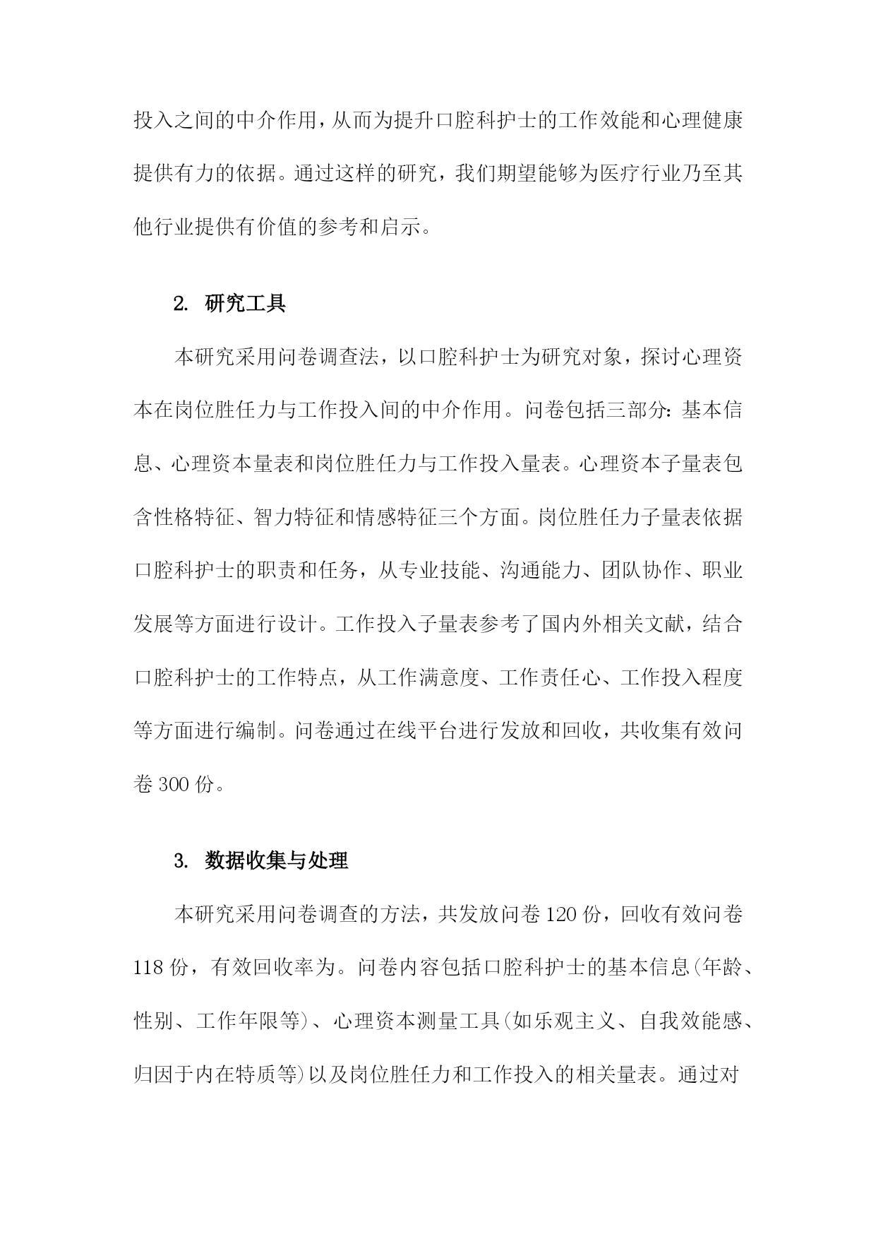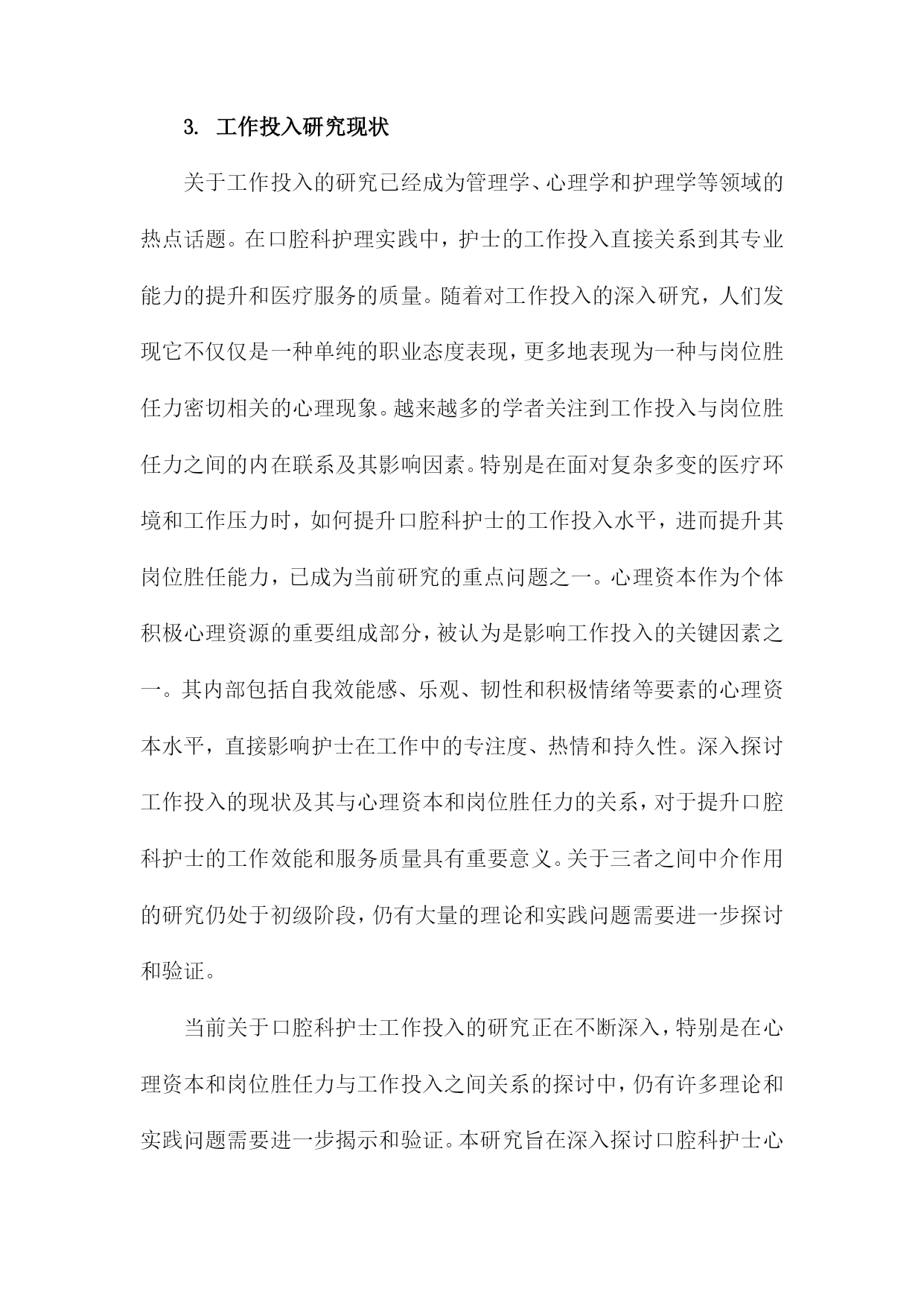 口腔科护士心理资本在岗位胜任力与工作投入间的中介作用目录一、内容概述................................................2二、文献综述................................................21.心理资本研究现状......................................42.岗位胜任力研究现状....................................43.工作投入研究现状......................................54.口腔科室护士的特殊性..................................7三、研究方法................................................81.研究对象..............................................92.研究工具.............................................103.数据收集与处理.......................................10四、研究结果分析...........................................111.口腔科护士心理资本现状分析...........................122.岗位胜任力现状分析...................................133.工作投入现状分析.....................................144.心理资本在岗位胜任力与工作投入间的中介作用分析.......15五、心理资本在岗位胜任力与工作投入间的中介作用机制探讨.....161.心理资本对岗位胜任力的影响...........................172.岗位胜任力对工作投入的影响...........................193.心理资本在工作投入中的中介作用.......................19六、提高口腔科护士心理资本、岗位胜任力及工作投入的策略建议..211.提高心理资本的策略建议...............................222.提高岗位胜任力的措施.................................233.提高工作投入的策略建议...............................24一、内容概述本文档主要探讨了口腔科护士心理资本在岗位胜任力与工作投入间的中介作用。心理资本是指个体在心理和行为方面所具备的一种积极、可开发的资源,包括自我效能感、乐观主义、自我调节等。岗位胜任力和工作投入是个体在工作中表现出的稳定和积极状态,分别指个体完成工作任务的能力和对其工作的喜爱程度。本研究发现,口腔科护士的心理资本对其岗位胜任力和工作投入具有显著的正面影响。具有较强心理资本的护士在面对工作压力和挑战时,能够保持良好的心态,有效应对各种问题,从而提高岗位胜任力。心理资本较强的护士也能更投入到工作中,关注患者需求,提高护理质量,实现自我价值。本研究旨在深入了解口腔科护士心理资本对岗位胜任力和工作投入的影响,为提高护士的工作积极性和工作效率提供理论依据和实践指导。二、文献综述在当前医疗服务行业中,口腔科护士扮演着至关重要的角色。他们不仅承载着日常的护理工作,还需要具备良好的心理资本以应对各种工作压力。岗位胜任力、工作投入与心理资本之间的关联已成为研究的热点。岗位胜任力与心理资本的关系:岗位胜任力不仅包括专业技能,还涵盖了工作态度、情绪管理、团队协作等多方面能力。心理资本对岗位胜任力有着重要的影响,拥有高心理资本的护士,在应对工作压力、与患者沟通、团队协作等方面表现出更高的胜任能力。心理资本与工作投入的关系:工作投入是指个体在工作中所付出的心理与物理努力的程度。心理资本是影响工作投入的重要因素之一,较高的心理资本能够激发护士的工作热情,使其更加专注于工作,从而提高工作效率和满意度。中介作用的研究现状:近年来,越来越多的研究开始关注心理资本在岗位胜任力与工作投入之间的中介作用。心理资本能够作为纽带,连接岗位胜任力和工作投入,即一个护士的岗位胜任力越高,其心理资本越丰富,进而在工作中的投入度也越高。这一中介作用对于提升护士的工作效能和医疗服务质量具有重要意义。文献研究表明,口腔科护士的心理资本在岗位胜任力与工作投入之间起着重要的中介作用。对于口腔医院和护理管理者而言,了解并培养护士的心理资本是提