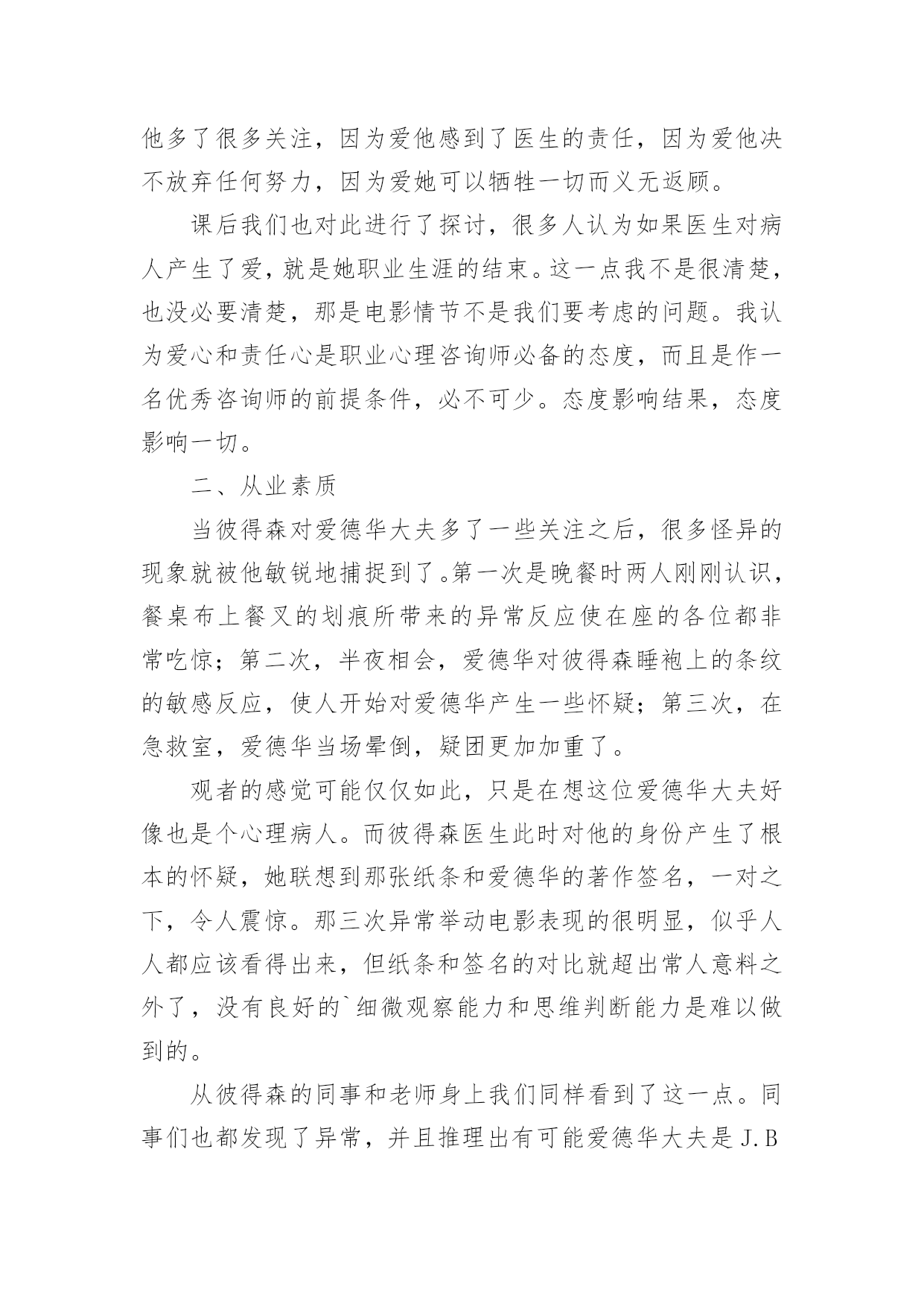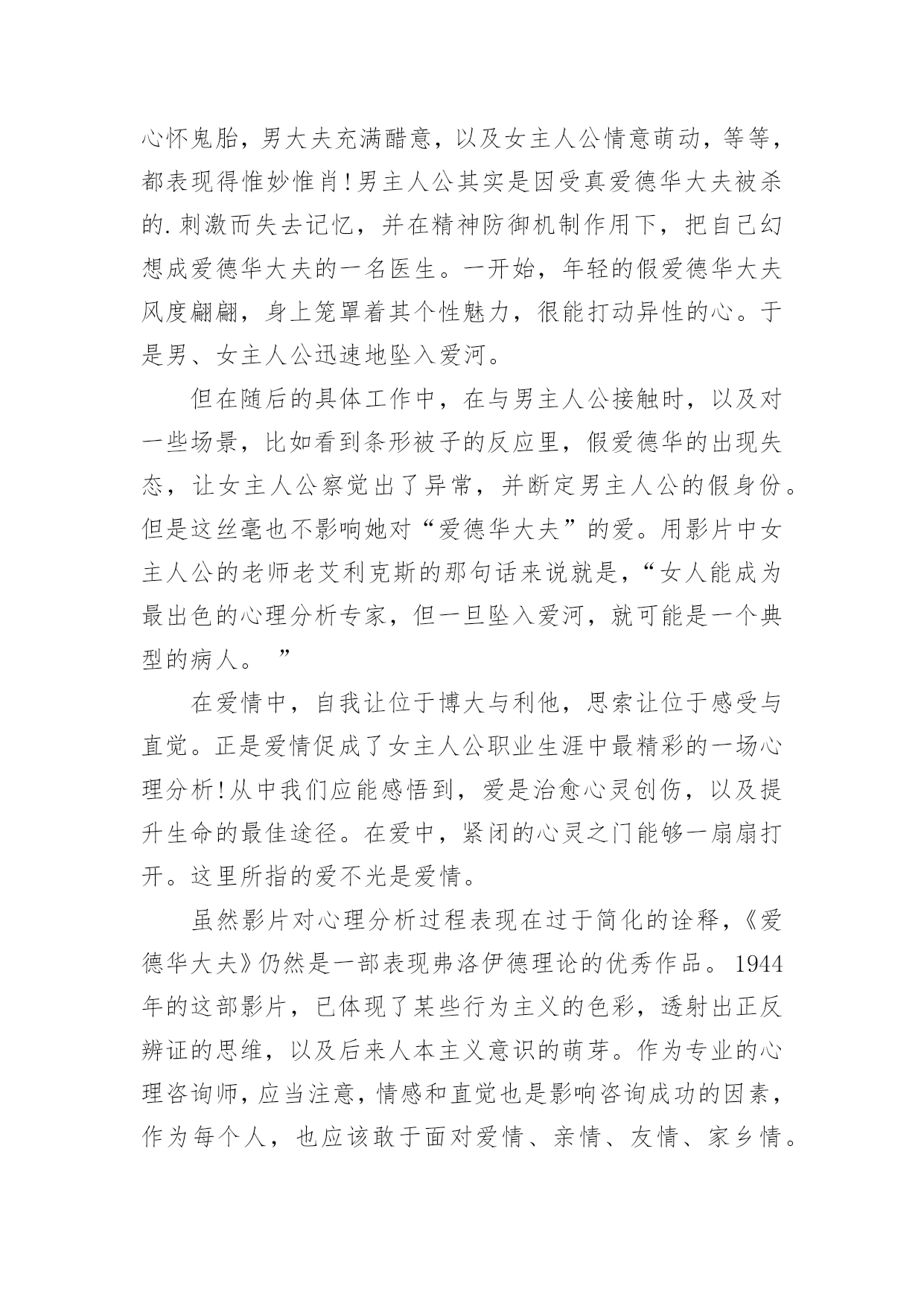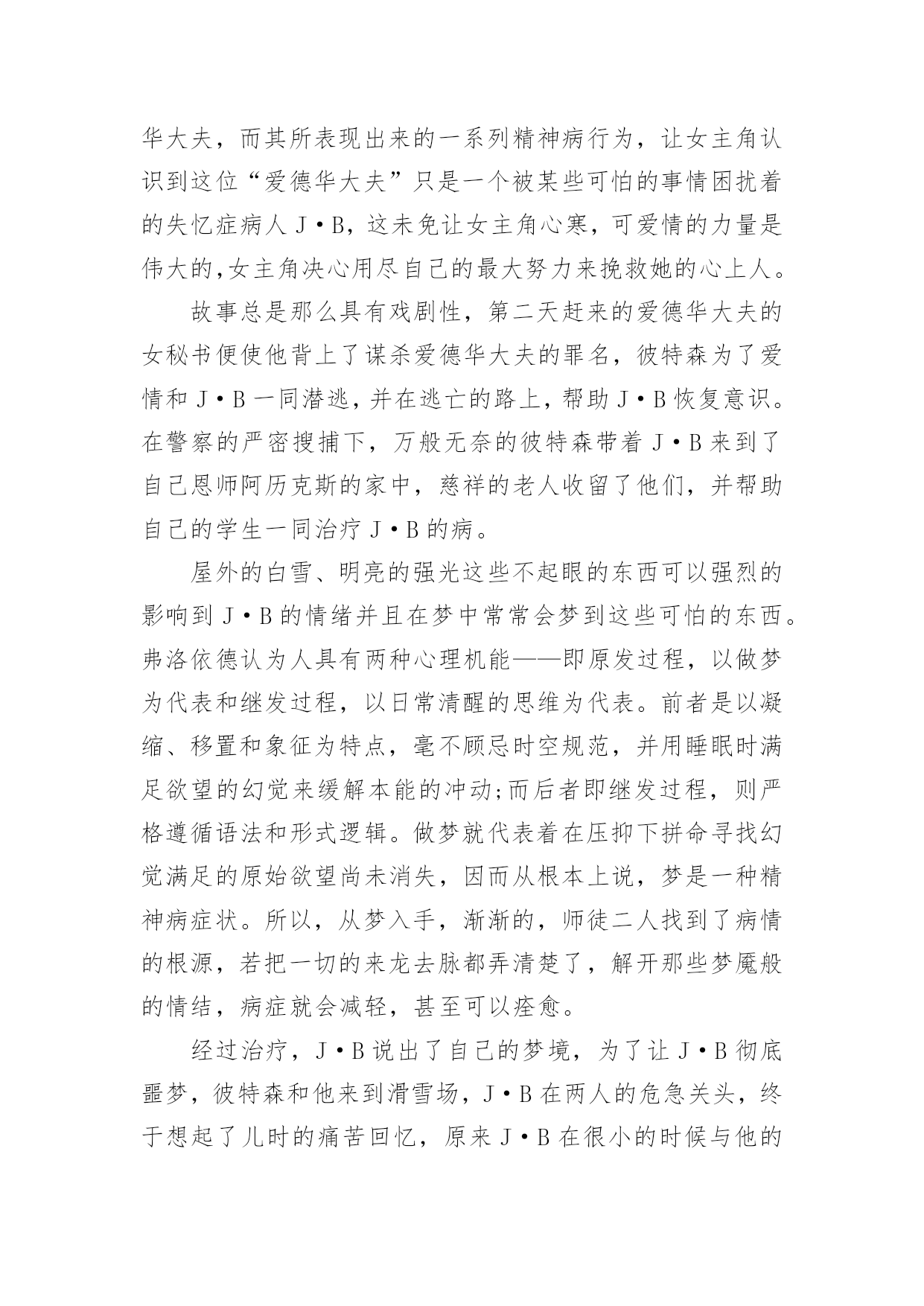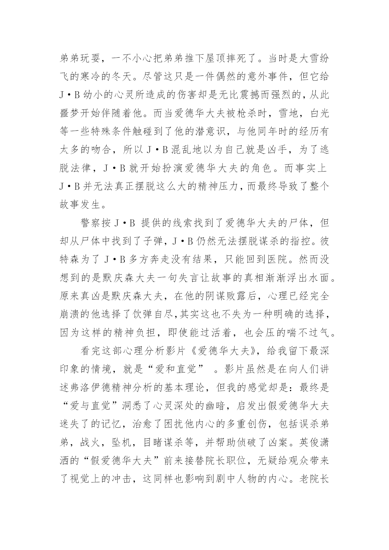 爱德华大夫观后感爱德华大夫观后感看完一部影视作品以后,对人生或者事物一定产生了许多感想吧,观后感简单来说就是观赏过后的感触。那么观后感到底应该怎么写呢?以下是小编精心整理的爱德华大夫观后感,仅供参考,大家一起来看看吧。爱德华大夫观后感1怀着好奇与激动的情绪,我欣赏完这110分钟的心理悬念片。虽然《爱德华大夫》是黑白片,但是透过希区柯克的悬疑拍摄手段,一场场扣人心弦的剧情,一向吸引着观看者的眼球。个性是影片中关于心理医生的描绘更是栩栩如生,可谓是入木三分。剧中的主角彼得森大夫和爱德华大夫的形象更是深入人心,令观看者不由自主地对心理咨询和心理研究产生浓厚的兴趣。影片主要讲述心理学中的犯罪情结,以一个有童年阴影的心理医生的犯罪情结贯穿全篇,其中夹杂着专业的心理咨询知识和应用,还有关于梦的解释与破译……一切一切都是心理学的资料,这毫无疑问地使我们这些学习心理学咨询的学生对心理学更加感兴趣。《爱德华大夫》里那美丽的女医生让我感动,不为别的,只为她的职业道德。应对一个杀人嫌疑,她完全不必冒着生命危险去实践作为医生的职责,她提出自己的看法,让警方去寻跟问底,她完成了作为医生的工作,她是不会受到任何的指责的。然而心理医生的直觉及职责感,使她最后揭开迷团。还看影片中的个案,冒名顶替的爱德华医生一夜之间以“爱德华”的名义出此刻众人面前,追溯根源到此人的童年,正如弗洛伊德所说的,人的行为深受童年早期经验的影响。此人在童年时,从扶手上滑下,把坐在扶手下端的弟弟撞到围栏的尖端上,以致弟弟惨死。这种梦魇般的经历一向缠绕着这个脆弱的心灵。二十年后的某一天,他与爱德华医生去滑雪,当爱德华医生因意外摔落悬崖时,童年的阴影回忆与白色的雪地和滑雪轨迹产生重合,从而引发他的犯罪情结和冒名顶替的赎罪式的举动。同时,白色和轨迹的图样也成为了他所惧怕的刺激,也就成为了侦破他异常行为的钥匙。影片中的彼得森医生应对的病人竟是自己所深爱的男人,在理性与感性,专业与生活的.强烈矛盾中挣扎,此处更凸现了她的专业精神和人道主义的内涵。我相信这也是一个专业心理咨询师或专业心理分析师所应当具备的良好素质。再说影片中梦的解释和重组更是令人拍案称奇。当事人的奇怪的梦中所出现的每一件物品、摆设,每一个人,每一个动作,每一句对话都仿佛具有特定的含义。弗洛伊德说梦是一种象征。那么每一个象征就是一个不可忽视的细节,就是一个破译和重组整合的关键。剧中的彼得森医生就是因为深受弗洛伊德理论的影响,仔细推敲,逐个分析,最后揪出幕后真正的凶手,还她的爱人一个清白。综上所述,此片把心理与悬疑结合,揭开了心理学神秘的面纱,同时把心理学进行推广至专业水平。我认为我们能够从此片中获得心理学教科书上不曾记载的知识,它将巩固我们现有的知识,又激发我们用心地思考问题、提出问题。因此,我觉得此片就应推荐给每一个爱好心理学,有志于研究心理学的人,一齐去探索心理世界的奥秘。爱德华大夫观后感2《爱德华大夫》这部影片虽是上世纪的一部老片,可在几十年后的今天,我看完之后,仍觉得是电影中的不朽佳作。其故事情节,演员以及对爱情的诠释和对病人的心理分析和心理治疗的方法堪称经典。影片是以一段关于心理分析的语句“心理分析是现代科学处理健康人的情感问题的一种方法。分析者只要求引导病人谈出他潜藏的问题,使其敞开心扉。一旦围绕病人的情结被揭示出来并加以解释,病人的痛症和混乱就会消失。”和一句莎士比亚名言“非理性的恶魔就会被逐出人类的灵魂。”表明了这将是一个始终贯彻弗洛依德理论的有关心理分析的故事。影片一开始,英俊年轻的“爱德华大夫”的出场让大家觉得其年龄与其资历并不相符,事实的确如后面的故事所讲述的。而专心学术的美女心理大夫彼特森在见到这位“爱德华大夫”时一见倾心,很快两人便产生了爱慕之情。随着故事的发展彼特森渐渐发现,“爱德华大夫”并非真正的爱德华大夫,而其所表现出来的一系列精神病行为,让女主角认识到这位“爱德华大夫”只是一个被某些可怕的事情困扰着的失忆症病人J·B,这未免让女主角心寒,可爱情的力量是伟大的,女主角决心用尽自己的最大努力来挽救她的心上人。故事总是那么具有戏剧性,第二天赶来的爱德华大夫的女秘书便使他背上了谋杀爱德华大夫的罪名,彼特森为了爱情和J·B一同潜逃,并在逃亡的路上,帮助J·B恢复意识。在警察的严密搜捕下,万般无奈的彼特森带着J·B来到了自己恩师阿历克斯的家中,慈祥的老人收留了他们,并帮助自己的学生一同治疗J·B的病。屋外的白雪、明亮的强光这些不起眼的东西可以强烈的影响到J·B的情绪并且在梦中常常会梦到这些可怕的东西。弗洛依德认为人具有两种心理机能——即原发过程,以做梦为代表和继发过程,以日常清醒的思维为代表。前者是以凝缩、移置和象征为特点,毫不顾忌时空规范,并用睡眠时满足欲望的幻觉来缓解本能的冲动;而后者即继发过程,则严格