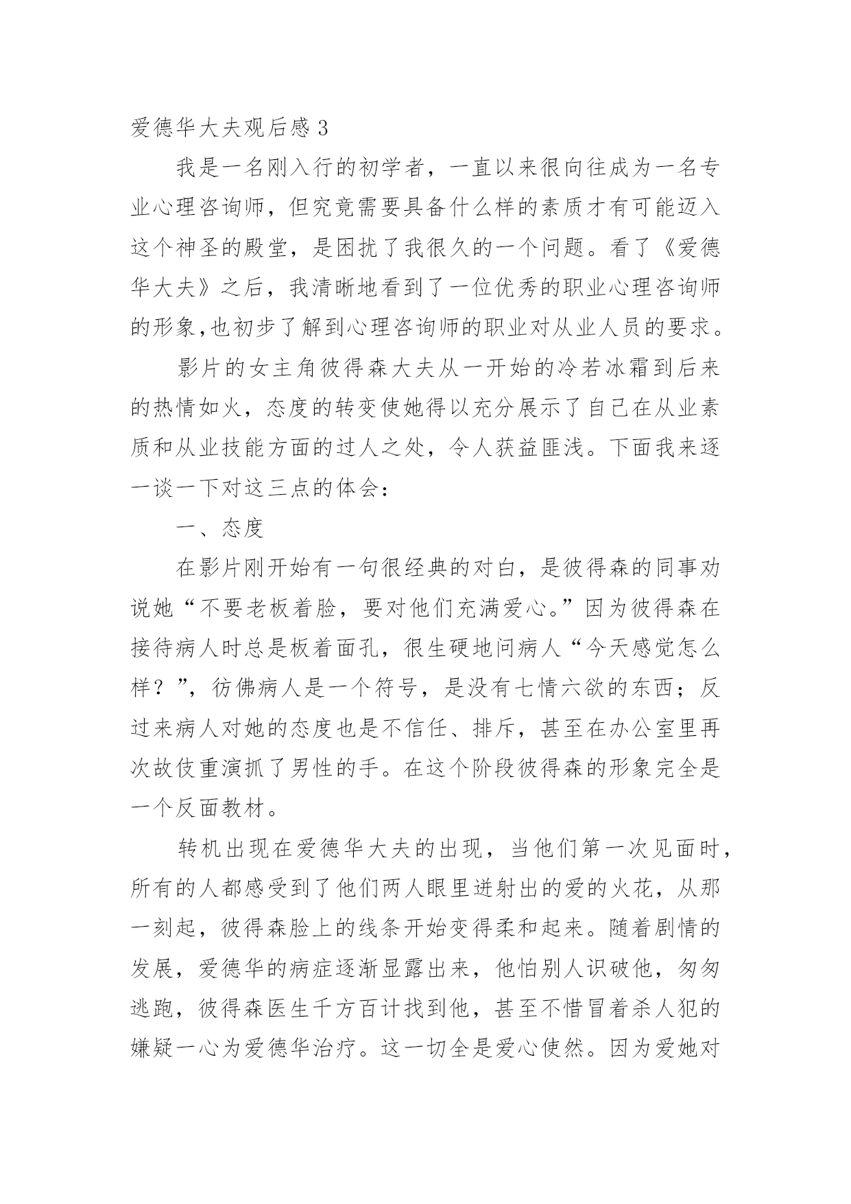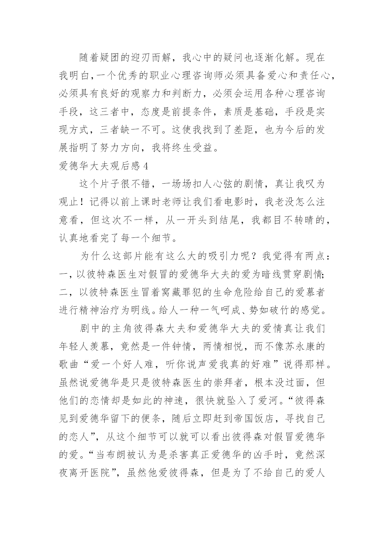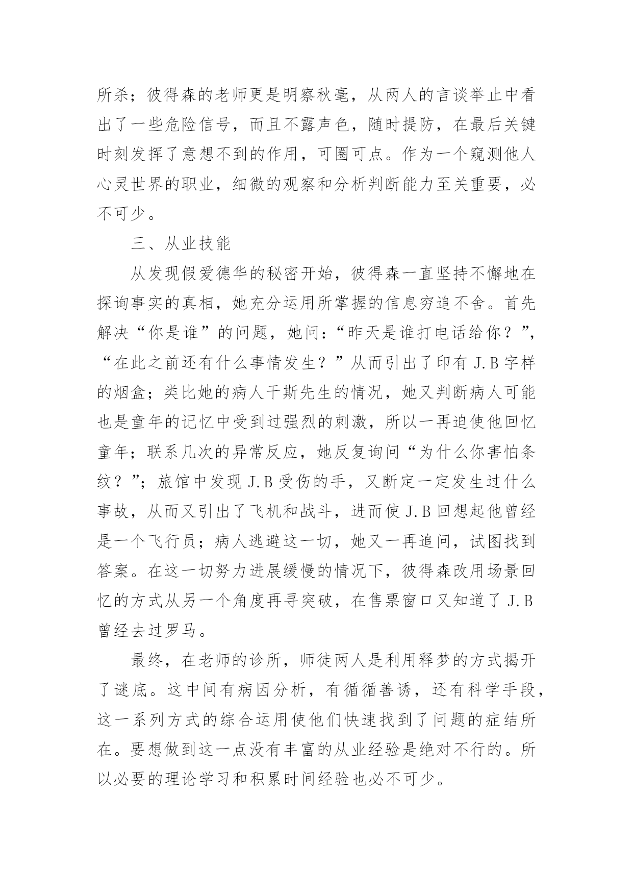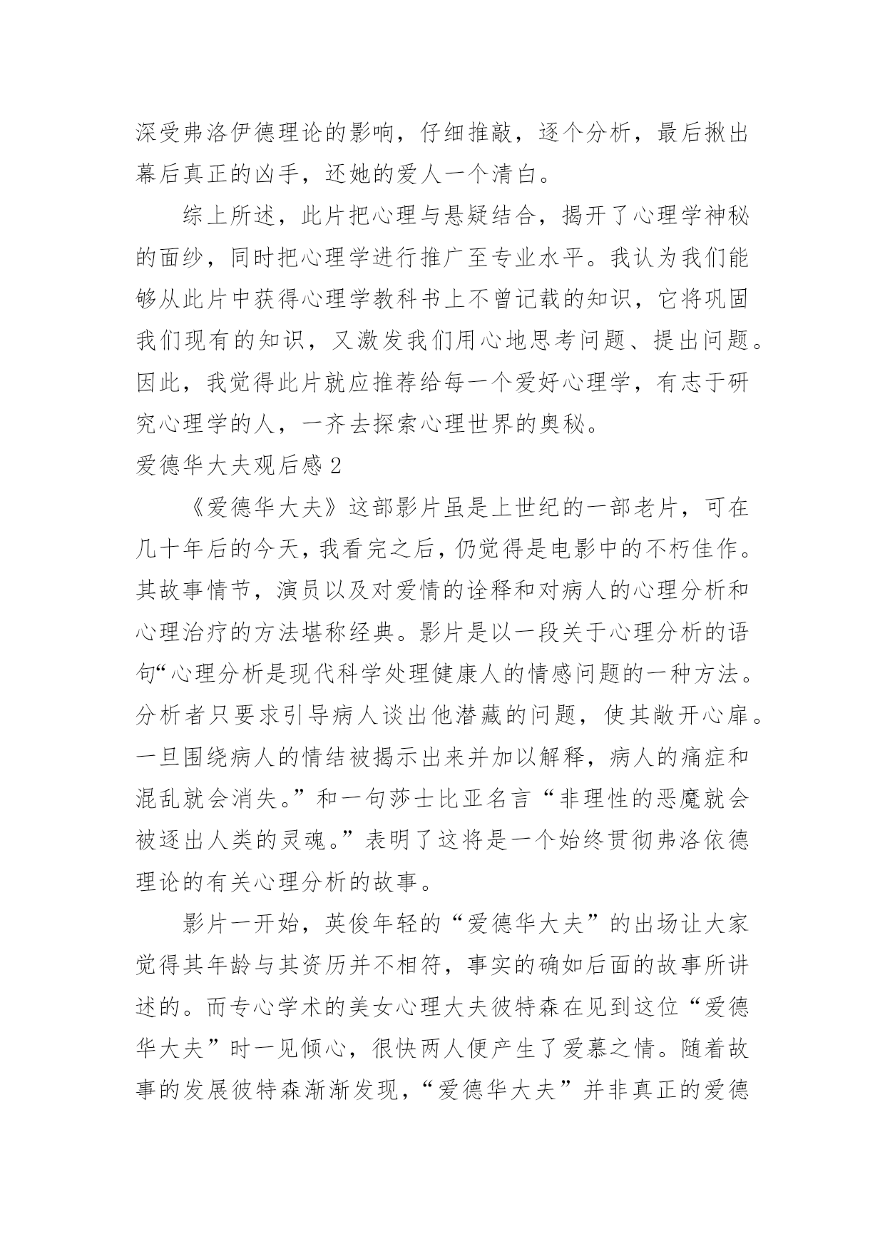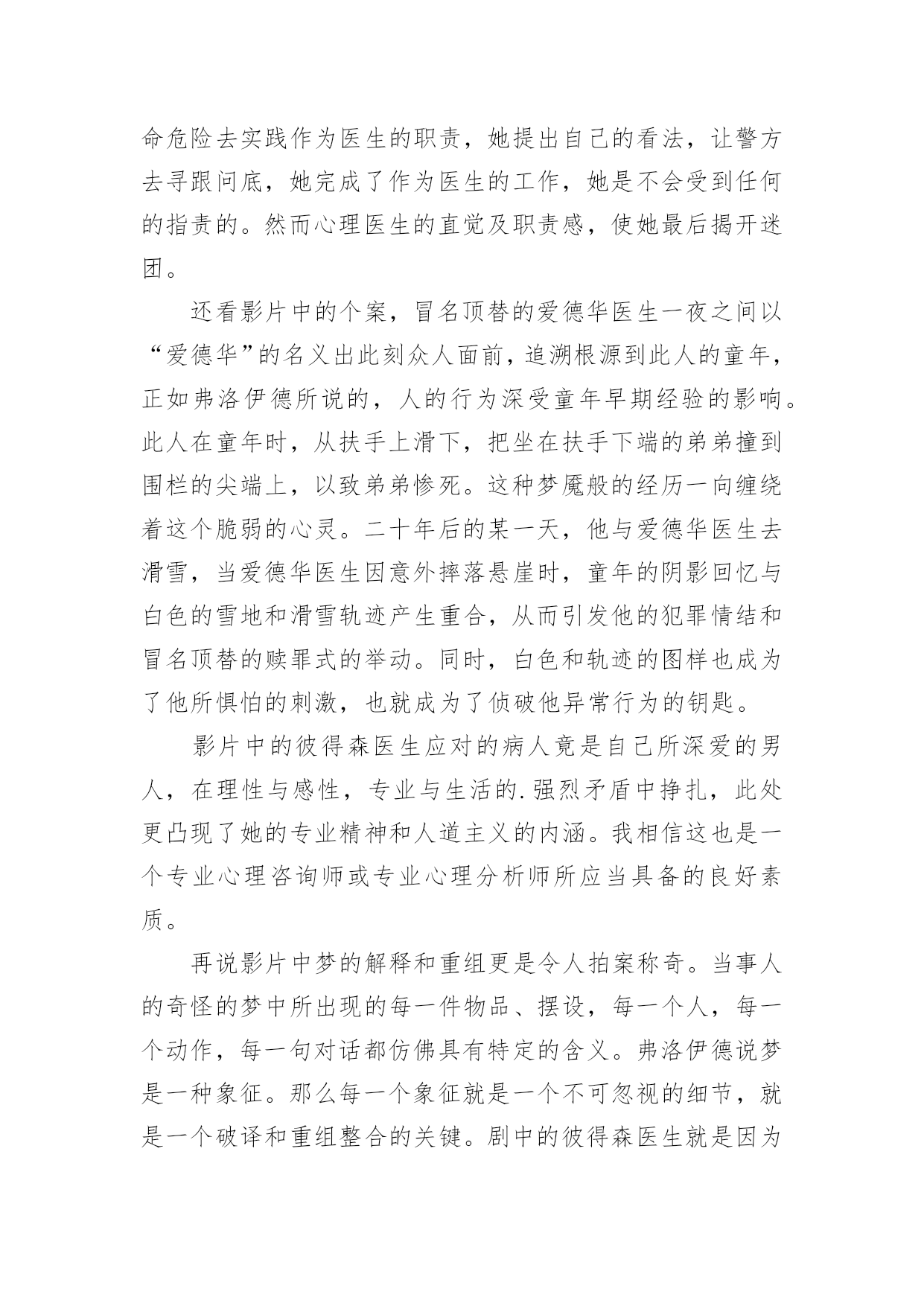 爱德华大夫观后感爱德华大夫观后感看完一部影视作品以后,对人生或者事物一定产生了许多感想吧,观后感简单来说就是观赏过后的感触。那么观后感到底应该怎么写呢?以下是小编精心整理的爱德华大夫观后感,仅供参考,大家一起来看看吧。爱德华大夫观后感1怀着好奇与激动的情绪,我欣赏完这110分钟的心理悬念片。虽然《爱德华大夫》是黑白片,但是透过希区柯克的悬疑拍摄手段,一场场扣人心弦的剧情,一向吸引着观看者的眼球。个性是影片中关于心理医生的描绘更是栩栩如生,可谓是入木三分。剧中的主角彼得森大夫和爱德华大夫的形象更是深入人心,令观看者不由自主地对心理咨询和心理研究产生浓厚的兴趣。影片主要讲述心理学中的犯罪情结,以一个有童年阴影的心理医生的犯罪情结贯穿全篇,其中夹杂着专业的心理咨询知识和应用,还有关于梦的解释与破译……一切一切都是心理学的资料,这毫无疑问地使我们这些学习心理学咨询的学生对心理学更加感兴趣。《爱德华大夫》里那美丽的女医生让我感动,不为别的,只为她的职业道德。应对一个杀人嫌疑,她完全不必冒着生命危险去实践作为医生的职责,她提出自己的看法,让警方去寻跟问底,她完成了作为医生的工作,她是不会受到任何的指责的。然而心理医生的直觉及职责感,使她最后揭开迷团。还看影片中的个案,冒名顶替的爱德华医生一夜之间以“爱德华”的名义出此刻众人面前,追溯根源到此人的童年,正如弗洛伊德所说的,人的行为深受童年早期经验的影响。此人在童年时,从扶手上滑下,把坐在扶手下端的弟弟撞到围栏的尖端上,以致弟弟惨死。这种梦魇般的经历一向缠绕着这个脆弱的心灵。二十年后的某一天,他与爱德华医生去滑雪,当爱德华医生因意外摔落悬崖时,童年的阴影回忆与白色的雪地和滑雪轨迹产生重合,从而引发他的犯罪情结和冒名顶替的赎罪式的举动。同时,白色和轨迹的图样也成为了他所惧怕的刺激,也就成为了侦破他异常行为的钥匙。影片中的彼得森医生应对的病人竟是自己所深爱的男人,在理性与感性,专业与生活的.强烈矛盾中挣扎,此处更凸现了她的专业精神和人道主义的内涵。我相信这也是一个专业心理咨询师或专业心理分析师所应当具备的良好素质。再说影片中梦的解释和重组更是令人拍案称奇。当事人的奇怪的梦中所出现的每一件物品、摆设,每一个人,每一个动作,每一句对话都仿佛具有特定的含义。弗洛伊德说梦是一种象征。那么每一个象征就是一个不可忽视的细节,就是一个破译和重组整合的关键。剧中的彼得森医生就是因为深受弗洛伊德理论的影响,仔细推敲,逐个分析,最后揪出幕后真正的凶手,还她的爱人一个清白。综上所述,此片把心理与悬疑结合,揭开了心理学神秘的面纱,同时把心理学进行推广至专业水平。我认为我们能够从此片中获得心理学教科书上不曾记载的知识,它将巩固我们现有的知识,又激发我们用心地思考问题、提出问题。因此,我觉得此片就应推荐给每一个爱好心理学,有志于研究心理学的人,一齐去探索心理世界的奥秘。爱德华大夫观后感2《爱德华大夫》这部影片虽是上世纪的一部老片,可在几十年后的今天,我看完之后,仍觉得是电影中的不朽佳作。其故事情节,演员以及对爱情的诠释和对病人的心理分析和心理治疗的方法堪称经典。影片是以一段关于心理分析的语句“心理分析是现代科学处理健康人的情感问题的一种方法。分析者只要求引导病人谈出他潜藏的问题,使其敞开心扉。一旦围绕病人的情结被揭示出来并加以解释,病人的痛症和混乱就会消失。”和一句莎士比亚名言“非理性的恶魔就会被逐出人类的灵魂。”表明了这将是一个始终贯彻弗洛依德理论的有关心理分析的故事。影片一开始,英俊年轻的“爱德华大夫”的出场让大家觉得其年龄与其资历并不相符,事实的确如后面的故事所讲述的。而专心学术的美女心理大夫彼特森在见到这位“爱德华大夫”时一见倾心,很快两人便产生了爱慕之情。随着故事的发展彼特森渐渐发现,“爱德华大夫”并非真正的爱德华大夫,而其所表现出来的一系列精神病行为,让女主角认识到这位“爱德华大夫”只是一个被某些可怕的事情困扰着的失忆症病人J·B,这未免让女主角心寒,可爱情的力量是伟大的,女主角决心用尽自己的最大努力来挽救她的心上人。故事总是那么具有戏剧性,第二天赶来的爱德华大夫的女秘书便使他背上了谋杀爱德华大夫的罪名,彼特森为了爱情和J·B一同潜逃,并在逃亡的路上,帮助J·B恢复意识。在警察的严密搜捕下,万般无奈的彼特森带着J·B来到了自己恩师阿历克斯的家中,慈祥的老人收留了他们,并帮助自己的学生一同治疗J·B的病。屋外的白雪、明亮的强光这些不起眼的东西可以强烈的影响到J·B的情绪并且在梦中常常会梦到这些可怕的东西。弗洛依德认为人具有两种心理机能——即原发过程,以做梦为代表和继发过程,以日常清醒的思维为代表。前者是以凝缩、移置和象征为特点,毫不顾忌时空规范,并用睡眠时满足欲望的幻觉来缓解本能的冲动;而后者即继发过程,则严格