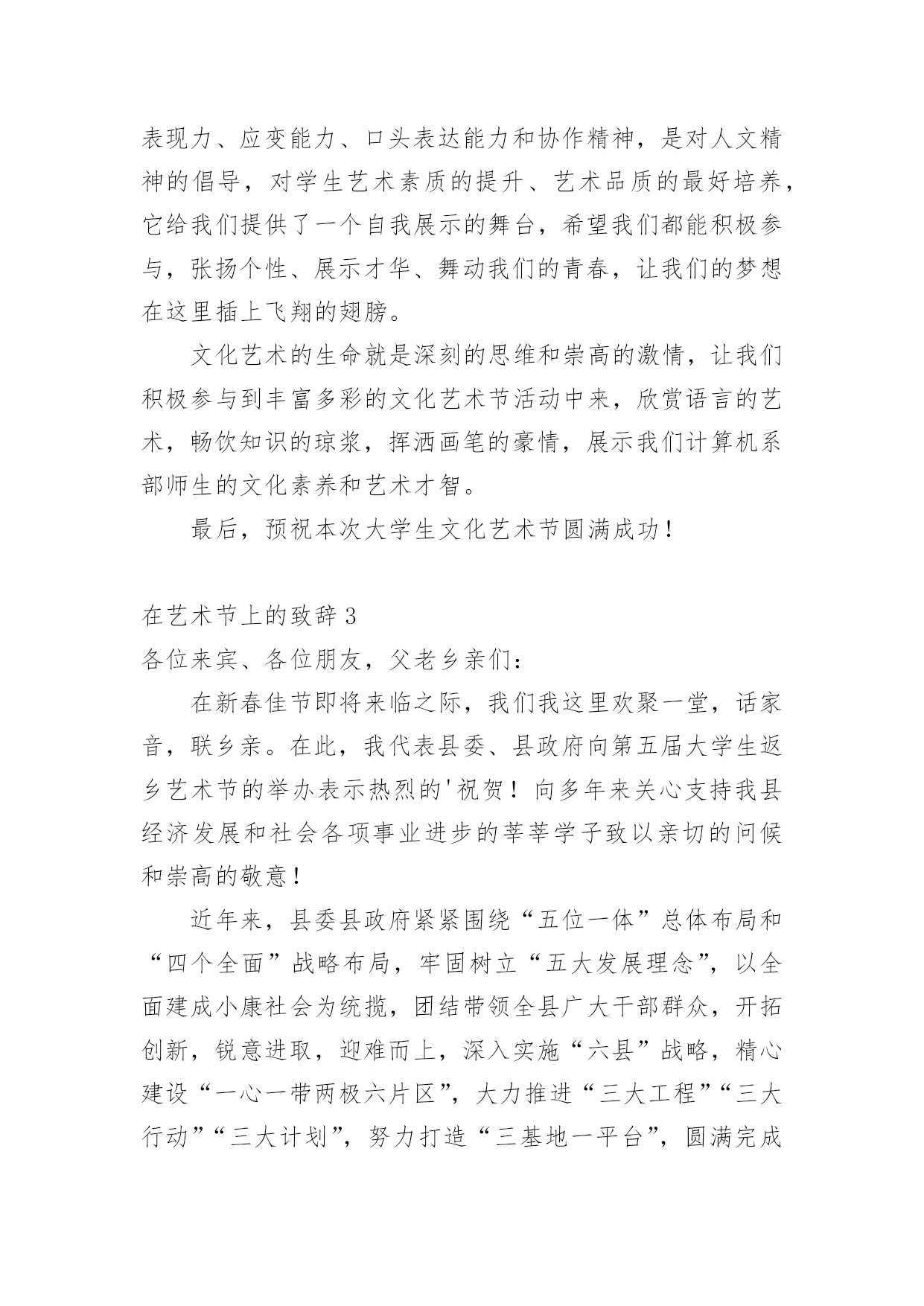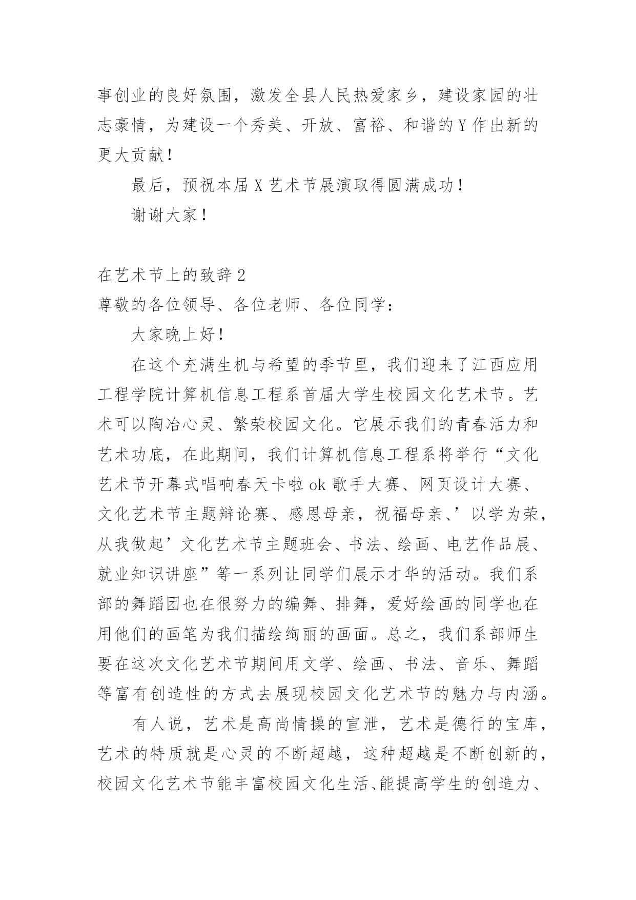 在艺术节上的致辞在学习、工作乃至生活中,大家对致辞都不陌生吧,致辞要求风格的雅、俗、庄、谐要适当。那么问题来了,到底什么样的致辞才合乎规范呢?以下是小编精心整理的在艺术节上的致辞,希望能够帮助到大家。在艺术节上的致辞1尊敬的各位领导、各位来宾:诗词如画赋新风,歌舞欢腾鼓壮志。今天X艺术节展演在这里隆重举行。首先,我代表县委、县政府,对本届艺术节的成功举办表示热烈的祝贺!向光临本届艺术节的各位领导、各位嘉宾表示热烈的欢迎!向精心组织、积极参与本届艺术节的文艺工作者们表示衷心的感谢!X艺术节是富有我县特色的群众性文化活动,已成功举办七届,每届都独具特色,一届比一届精彩。今年更是“气氛浓烈、参与广泛、声势浩大、节目精彩”。本届艺术节的主题是:“和谐、创业、崛起”。主题鲜明地指出了当前我县的工作形势:“引领全民创业、建设和谐社会,实现快速崛起”。当前,全县上下掀起全民创业的热潮,各条战线的干部群众,聚精会神搞建设,一心一意谋发展,经济、社会步入健康快速发展的新的历史时期。希望全县文艺工作者,再接再厉,勇于创新,创造更多更好更精更美的优秀文化作品,满足人民群众的文化需求,丰富人民群众的文化生活,为营造团结向上、充满活力、谋事创业的良好氛围,激发全县人民热爱家乡,建设家园的壮志豪情,为建设一个秀美、开放、富裕、和谐的Y作出新的更大贡献!最后,预祝本届X艺术节展演取得圆满成功!谢谢大家!在艺术节上的致辞2尊敬的各位领导、各位老师、各位同学:大家晚上好!在这个充满生机与希望的季节里,我们迎来了江西应用工程学院计算机信息工程系首届大学生校园文化艺术节。艺术可以陶冶心灵、繁荣校园文化。它展示我们的青春活力和艺术功底,在此期间,我们计算机信息工程系将举行“文化艺术节开幕式唱响春天卡啦ok歌手大赛、网页设计大赛、文化艺术节主题辩论赛、感恩母亲,祝福母亲、’以学为荣,从我做起’文化艺术节主题班会、书法、绘画、电艺作品展、就业知识讲座”等一系列让同学们展示才华的活动。我们系部的舞蹈团也在很努力的编舞、排舞,爱好绘画的同学也在用他们的画笔为我们描绘绚丽的画面。总之,我们系部师生要在这次文化艺术节期间用文学、绘画、书法、音乐、舞蹈等富有创造性的方式去展现校园文化艺术节的魅力与内涵。有人说,艺术是高尚情操的宣泄,艺术是德行的宝库,艺术的特质就是心灵的不断超越,这种超越是不断创新的,校园文化艺术节能丰富校园文化生活、能提高学生的创造力、表现力、应变能力、口头表达能力和协作精神,是对人文精神的倡导,对学生艺术素质的提升、艺术品质的最好培养,它给我们提供了一个自我展示的舞台,希望我们都能积极参与,张扬个性、展示才华、舞动我们的青春,让我们的梦想在这里插上飞翔的翅膀。文化艺术的生命就是深刻的思维和崇高的激情,让我们积极参与到丰富多彩的文化艺术节活动中来,欣赏语言的艺术,畅饮知识的琼浆,挥洒画笔的豪情,展示我们计算机系部师生的文化素养和艺术才智。最后,预祝本次大学生文化艺术节圆满成功!在艺术节上的致辞3各位来宾、各位朋友,父老乡亲们:在新春佳节即将来临之际,我们我这里欢聚一堂,话家音,联乡亲。在此,我代表县委、县政府向第五届大学生返乡艺术节的举办表示热烈的'祝贺!向多年来关心支持我县经济发展和社会各项事业进步的莘莘学子致以亲切的问候和崇高的敬意!近年来,县委县政府紧紧围绕“五位一体”总体布局和“四个全面”战略布局,牢固树立“五大发展理念”,以全面建成小康社会为统揽,团结带领全县广大干部群众,开拓创新,锐意进取,迎难而上,深入实施“六县”战略,精心建设“一心一带两极六片区”,大力推进“三大工程”“三大行动”“三大计划”,努力打造“三基地一平台”,圆满完成了“十二五”时期各项目标任务,实现了“十三五”时期的良好开局,创造了经济增长速度最快、城乡面貌变化最大、人民得到实惠最多的可喜成绩。当代大学生思维活跃,富有激情,接受新生事物快,毕业之后将会成为社会的中坚力量。希望你们充分利用好这一优势,珍惜学校的美好时光,树立正确的世界观、人生观、价值观,把个人的奋斗目标和服务社会结合起来,认真学习专业知识,提高自身综合素质,为以后走向社会打下坚实的基础。家乡的发展需要大量的人才,也为各类人才,特别是大学生们施展才华、建功立业提供了广阔的舞台和难得的机遇。家乡人民感谢你们,你们在成长成材的路上,孜孜不倦,刻苦攻读,为全县七万八千多名在校学生树立了榜样。当你们学业有成之时,不忘贫困山区困难学生的健康成长,你们成立的“洮声大学生文艺志愿者协会”和举办的大学生返乡艺术节活动,向全县人民传递了时代最强音,汇聚了加快发展的正能量,同时也丰富了广大人民群众的精神文化生活。月是故乡圆,人是故乡亲。家乡的土最厚,家乡的水最甜,家乡的人最亲,最难割舍的还是家乡情结。真诚希望大家不管将来走到哪里,时刻情