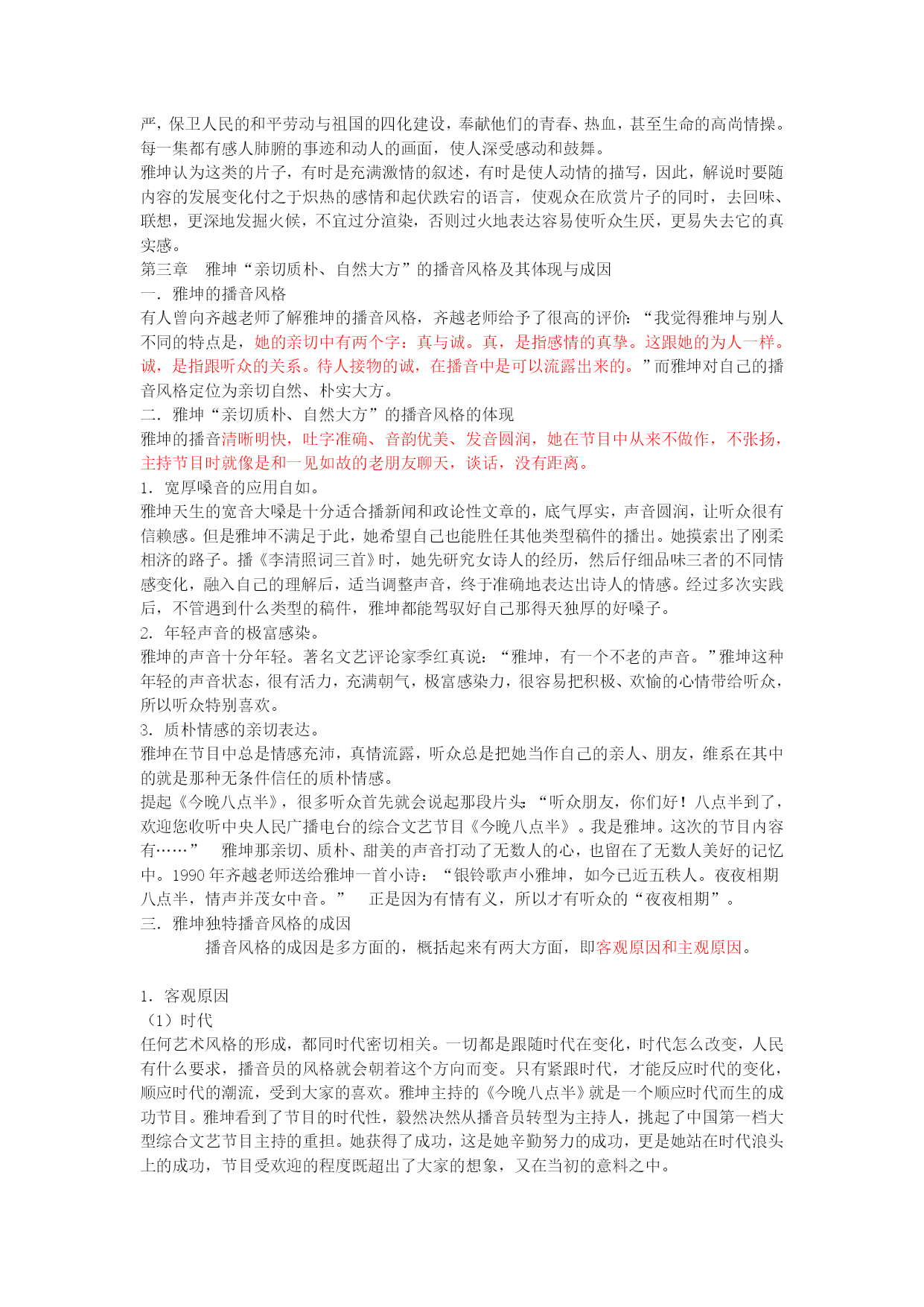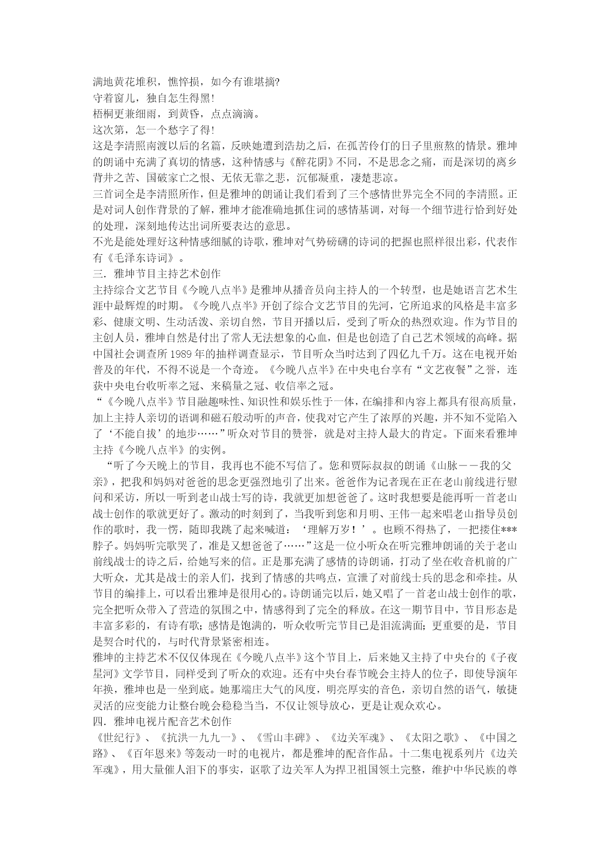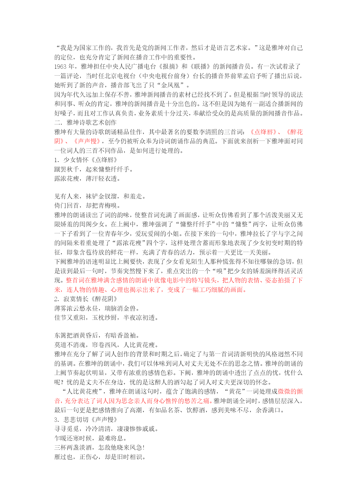 雅坤播音艺术研究内容提要:对于蓬勃发展的中国播音事业来说,记录和整理各位播音艺术名家的作品和资料,是对中国播音事业几十年发展的回顾和总结,也是对中国播音事业的继承和发展,具有现实的意义。雅坤作为中国播音事业突出的代表,其成长轨迹和代表作品具有历史研究的重要价值,她的经验值得新的播音工作者参考借鉴。所以整理记录雅坤的相关音像、文字资料成为播音工作者一项重要的任务。关键词:雅坤播音艺术创作播音艺术风格从延安新华广播电台到今天中国广播电视事业的一片繁荣,中国广播电视史上出现了众多很有造诣的播音艺术名家。中央人民广播电台的雅坤是播音艺术名家中一位杰出的代表。她播的新闻被中央电视台前台长播音元老孟启予称为“播音部飞出的金凤凰”;她所播的通讯流畅丰满、自然亲切、以情感人;她所播的专题独具特色、风采各异;她播的李清照系列诗词,至今仍被奉为典范;她主持的中央人民广播电台综合文艺节目《今晚八点半》曾创下四亿九千万的收听率,这在电视已经开始普及的年代,不得不说是一个奇迹。雅坤在中国播音史上的成就,宛如一颗闪闪发光的星星,在天空中大放异彩,为众人所景仰。第一章雅坤生平简介和她在中国播音史上的地位和贡献一.雅坤生平简介雅坤,原名佟雅坤,1942年生,辽宁沈阳人,中共党员,播音指导,曾任中国广播电视学会主持人节目研究委员会副会长。目前已退休返聘,享受政府特殊津贴。20世纪60年代,电台缺乏专业人才,周恩来总理特批从应届高中生里挑选播音员。雅坤与众不同的好嗓子让她很轻松就通过了面试。随后在北京广播学院培训时,雅坤得到了严格系统的专业培训。1961年至1986年底,雅坤曾先后在《各地人民广播电台联播》、《新闻报纸摘要》、《祖国各地》等重要和重点节目中担任播音工作,她宏亮、庄重、典雅的播音风格受到社会各界的充分肯定。这期间的大量播音实践,雅坤在全面掌握各类文体播音技巧的同时,也逐步形成了自己“亲切质朴、自然大方”的播音风格。1987年1月1日,雅坤离开播音部,调入文艺部,开始主持一档综艺节目《今晚八点半》,这是她从播音员到主持人的转型。二.雅坤在中国播音史上的地位和贡献雅坤1961年进入中央人民广播电台,从事了四十多年新闻、专题、音乐、戏剧、文学等各类节目的播音,是在中国播音界享有盛誉的播音员,曾荣获第一、二届“金话筒”金奖。1987至1998年,雅坤任中央人民广播电台名牌综艺节目《今晚八点半》的主持人,她演播的音乐专题节目《永不消逝的歌声——纪念音乐家王洛宾》,获得首届中国播音作品奖一等奖;主持的《今晚八点半》春节特别节目《春灯乐》,获第二届中国主持作品奖一等奖。之后雅坤担任文学节目《子夜星河》的主持人,负责录制一部分诗歌、散文和小说。由她担任播音的作品两次获亚广联娱乐节目奖,1次获亚广联信息节目奖特别推荐。在播音创作方面,雅坤形成了自己亲切质朴、自然大方的独特播音风格。雅坤的播音还经常被外台采用,为中外文化交流作出了贡献。除播音工作外,她还经常去北京广播学院和各地广播电台讲课,为祖国的播音事业培养了大批播音人材和播音爱好者。雅坤在听众中的影响是巨大的。雅坤的不张扬,不做作,亲切自然,真实质朴赢得了听众对她的尊敬和爱戴。赢得听众对自己的信任和爱戴,这是播音工作者最大的幸福,也是对播音工作者取得的成绩的最好证明。第二章雅坤主要播音艺术创作一.雅坤新闻艺术创作“我是为国家工作的,我首先是党的新闻工作者,然后才是语言艺术家。”这是雅坤对自己的定位,也充分肯定了新闻在播音工作中的重要性。1963年,雅坤担任中央人民广播电台《报摘》和《联播》的新闻播音员。有一次试着录了一篇评论,当时任北京电视台(中央电视台前身)台长的播音界前辈孟启予听了播出后说,她听到了新的声音,播音部飞出了只“金凤凰”。因为年代久远加上保存不善,雅坤新闻播音的素材已经找不到了。但是根据当时领导的说法和同事、听众的肯定,雅坤的新闻播音是十分出色的。这不但是因为她有一副适合播新闻的好嗓子,而且对工作认真负责,业务素质十分过关,奉献给受众的是高质量的新闻播音作品。二.雅坤诗歌艺术创作雅坤有大量的诗歌朗诵精品佳作,其中最著名的要数李清照的三首词:《点绛唇》、《醉花阴》、《声声慢》,至今仍被听众奉为诗词朗诵作品的典范。下面就来剖析一下雅坤面对同一位词人的三首不同作品,是如何进行处理的。1.少女情怀《点绛唇》蹴罢秋千,起来慵整纤纤手。露浓花瘦,薄汗轻衣透。见有人来,袜铲金钗溜,和羞走。倚门回首,却把青梅嗅。雅坤的朗诵读出了词的韵味,使整首词充满了画面感,让听众仿佛看到了那个活泼美丽又无限娇羞的闺阁少女。在上阙中,雅坤强调了“慵整纤纤手”中的“慵整”两字,让听众仿佛一下子看到了一位青春年少,爱玩爱闹的小姐。在接下来的一句中,雅坤拉长了字与字之间的间隔来着重处理了“露浓花瘦”四个字,这样处理含蓄而形象地表现