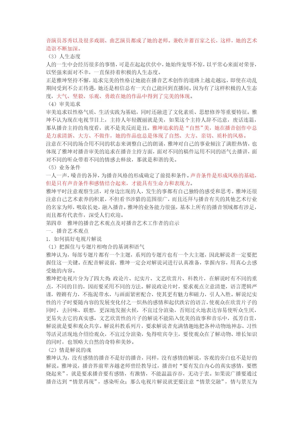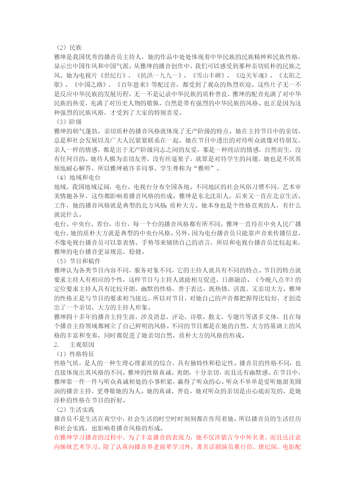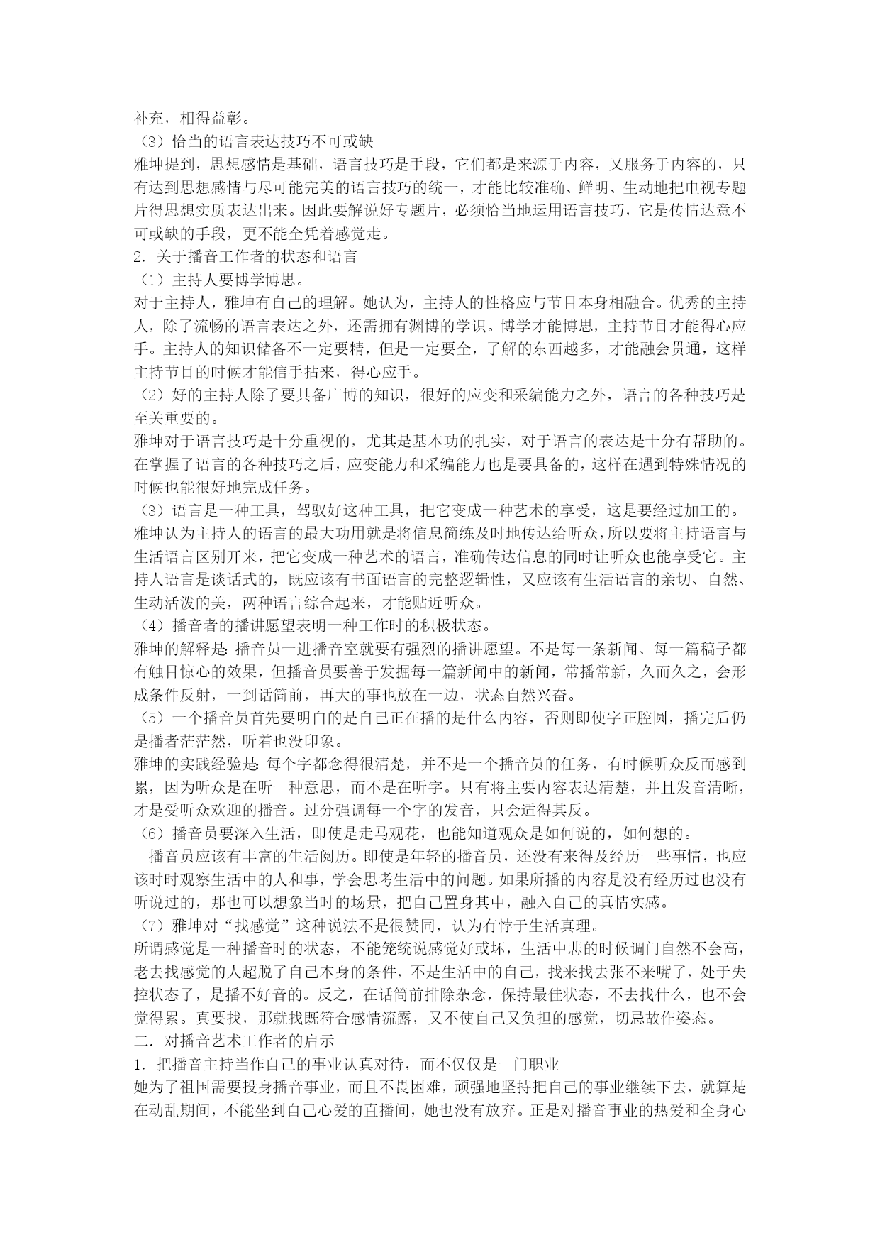 雅坤播音艺术研究内容提要:对于蓬勃发展的中国播音事业来说,记录和整理各位播音艺术名家的作品和资料,是对中国播音事业几十年发展的回顾和总结,也是对中国播音事业的继承和发展,具有现实的意义。雅坤作为中国播音事业突出的代表,其成长轨迹和代表作品具有历史研究的重要价值,她的经验值得新的播音工作者参考借鉴。所以整理记录雅坤的相关音像、文字资料成为播音工作者一项重要的任务。关键词:雅坤播音艺术创作播音艺术风格从延安新华广播电台到今天中国广播电视事业的一片繁荣,中国广播电视史上出现了众多很有造诣的播音艺术名家。中央人民广播电台的雅坤是播音艺术名家中一位杰出的代表。她播的新闻被中央电视台前台长播音元老孟启予称为“播音部飞出的金凤凰”;她所播的通讯流畅丰满、自然亲切、以情感人;她所播的专题独具特色、风采各异;她播的李清照系列诗词,至今仍被奉为典范;她主持的中央人民广播电台综合文艺节目《今晚八点半》曾创下四亿九千万的收听率,这在电视已经开始普及的年代,不得不说是一个奇迹。雅坤在中国播音史上的成就,宛如一颗闪闪发光的星星,在天空中大放异彩,为众人所景仰。第一章雅坤生平简介和她在中国播音史上的地位和贡献一.雅坤生平简介雅坤,原名佟雅坤,1942年生,辽宁沈阳人,中共党员,播音指导,曾任中国广播电视学会主持人节目研究委员会副会长。目前已退休返聘,享受政府特殊津贴。20世纪60年代,电台缺乏专业人才,周恩来总理特批从应届高中生里挑选播音员。雅坤与众不同的好嗓子让她很轻松就通过了面试。随后在北京广播学院培训时,雅坤得到了严格系统的专业培训。1961年至1986年底,雅坤曾先后在《各地人民广播电台联播》、《新闻报纸摘要》、《祖国各地》等重要和重点节目中担任播音工作,她宏亮、庄重、典雅的播音风格受到社会各界的充分肯定。这期间的大量播音实践,雅坤在全面掌握各类文体播音技巧的同时,也逐步形成了自己“亲切质朴、自然大方”的播音风格。1987年1月1日,雅坤离开播音部,调入文艺部,开始主持一档综艺节目《今晚八点半》,这是她从播音员到主持人的转型。二.雅坤在中国播音史上的地位和贡献雅坤1961年进入中央人民广播电台,从事了四十多年新闻、专题、音乐、戏剧、文学等各类节目的播音,是在中国播音界享有盛誉的播音员,曾荣获第一、二届“金话筒”金奖。1987至1998年,雅坤任中央人民广播电台名牌综艺节目《今晚八点半》的主持人,她演播的音乐专题节目《永不消逝的歌声——纪念音乐家王洛宾》,获得首届中国播音作品奖一等奖;主持的《今晚八点半》春节特别节目《春灯乐》,获第二届中国主持作品奖一等奖。之后雅坤担任文学节目《子夜星河》的主持人,负责录制一部分诗歌、散文和小说。由她担任播音的作品两次获亚广联娱乐节目奖,1次获亚广联信息节目奖特别推荐。在播音创作方面,雅坤形成了自己亲切质朴、自然大方的独特播音风格。雅坤的播音还经常被外台采用,为中外文化交流作出了贡献。除播音工作外,她还经常去北京广播学院和各地广播电台讲课,为祖国的播音事业培养了大批播音人材和播音爱好者。雅坤在听众中的影响是巨大的。雅坤的不张扬,不做作,亲切自然,真实质朴赢得了听众对她的尊敬和爱戴。赢得听众对自己的信任和爱戴,这是播音工作者最大的幸福,也是对播音工作者取得的成绩的最好证明。第二章雅坤主要播音艺术创作一.雅坤新闻艺术创作“我是为国家工作的,我首先是党的新闻工作者,然后才是语言艺术家。”这是雅坤对自己的定位,也充分肯定了新闻在播音工作中的重要性。1963年,雅坤担任中央人民广播电台《报摘》和《联播》的新闻播音员。有一次试着录了一篇评论,当时任北京电视台(中央电视台前身)台长的播音界前辈孟启予听了播出后说,她听到了新的声音,播音部飞出了只“金凤凰”。因为年代久远加上保存不善,雅坤新闻播音的素材已经找不到了。但是根据当时领导的说法和同事、听众的肯定,雅坤的新闻播音是十分出色的。这不但是因为她有一副适合播新闻的好嗓子,而且对工作认真负责,业务素质十分过关,奉献给受众的是高质量的新闻播音作品。二.雅坤诗歌艺术创作雅坤有大量的诗歌朗诵精品佳作,其中最著名的要数李清照的三首词:《点绛唇》、《醉花阴》、《声声慢》,至今仍被听众奉为诗词朗诵作品的典范。下面就来剖析一下雅坤面对同一位词人的三首不同作品,是如何进行处理的。1.少女情怀《点绛唇》蹴罢秋千,起来慵整纤纤手。露浓花瘦,薄汗轻衣透。见有人来,袜铲金钗溜,和羞走。倚门回首,却把青梅嗅。雅坤的朗诵读出了词的韵味,使整首词充满了画面感,让听众仿佛看到了那个活泼美丽又无限娇羞的闺阁少女。在上阙中,雅坤强调了“慵整纤纤手”中的“慵整”两字,让听众仿佛一下子看到了一位青春年少,爱玩爱闹的小姐。在接下来的一句中,雅坤拉长了字与字之间的间隔来着重处理了“露浓花瘦”四个字,这样处理含蓄而形象地表现