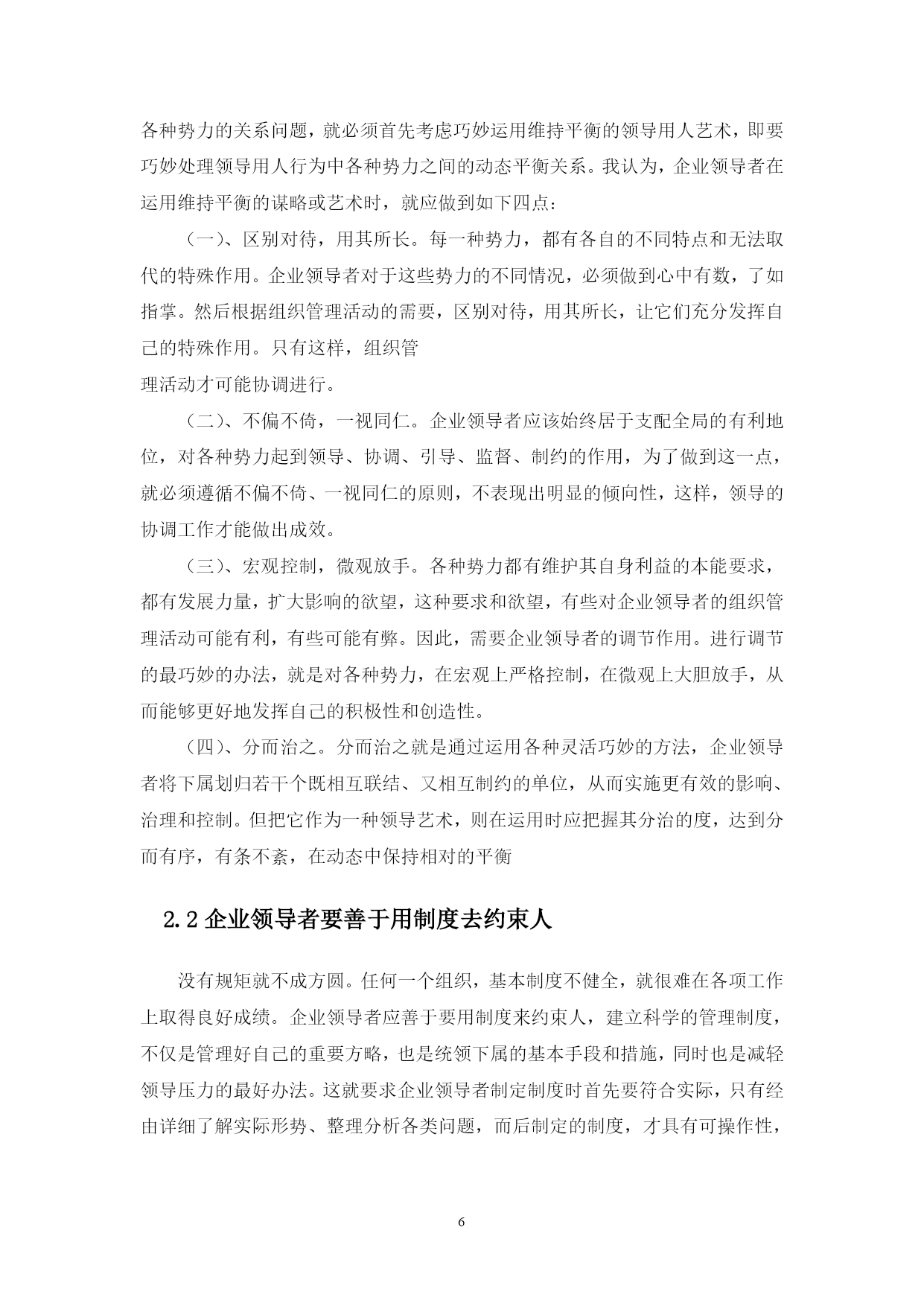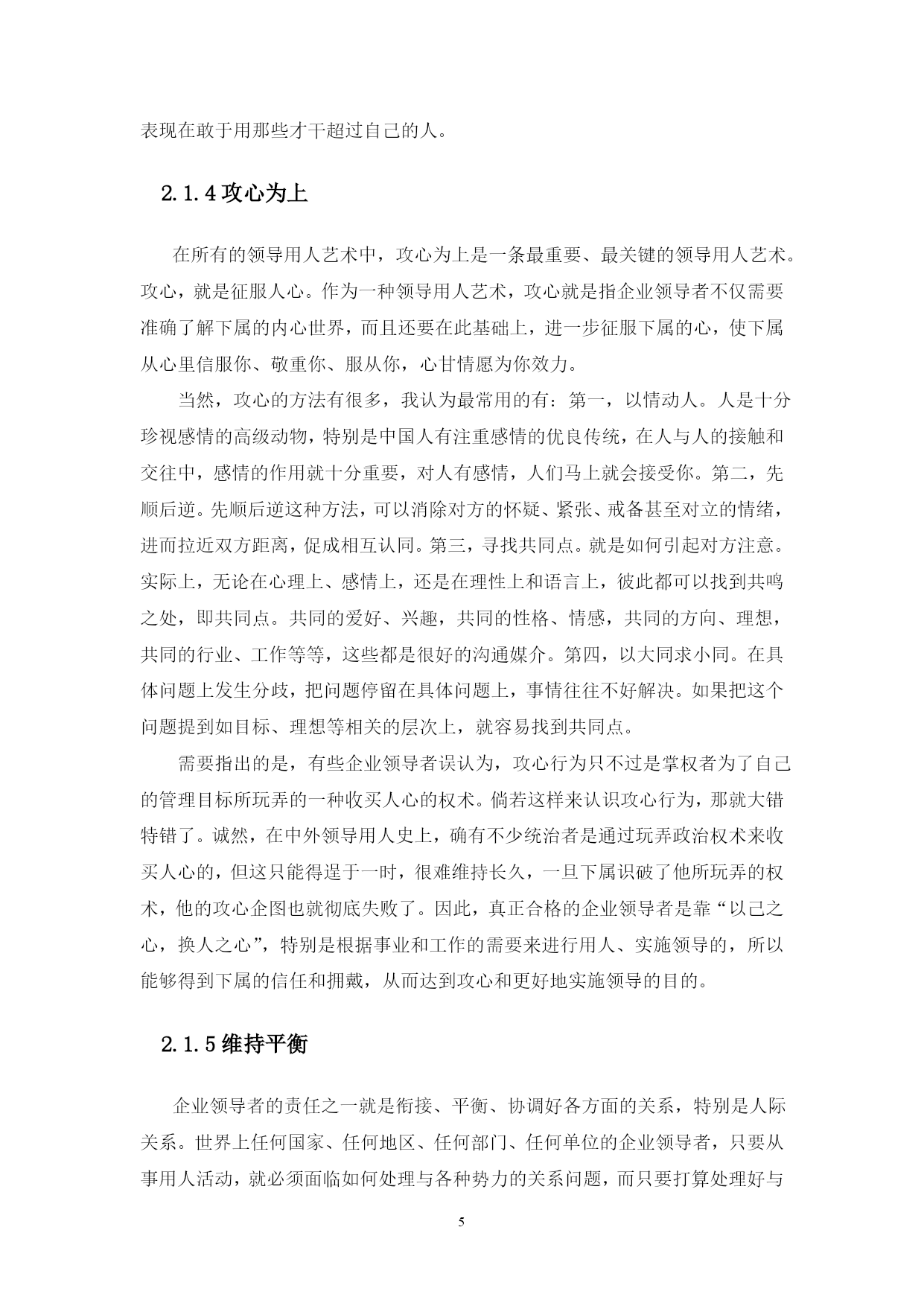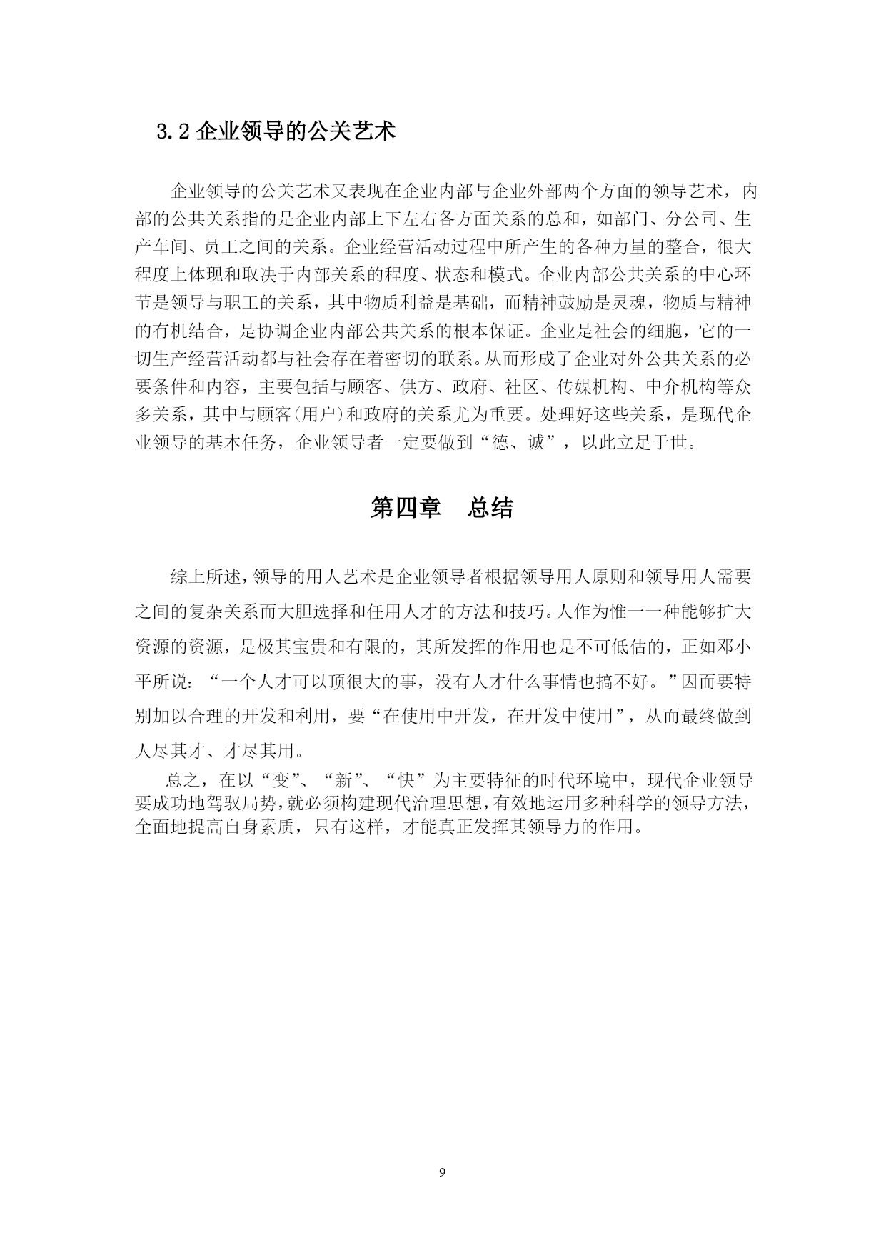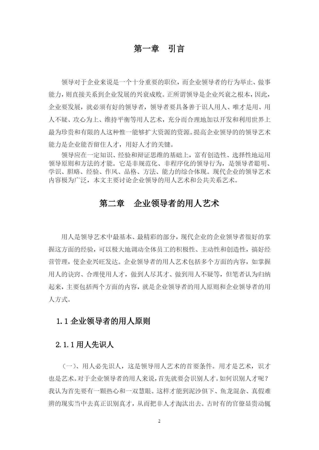 PAGEPAGE10论企业领导艺术摘要:作为一个企业的领导,其行为举止都将影响到这个企业未来的发展方向。领导艺术是新时期企业领导必然面临的课题,面对瞬息万变的客观环境,不但需要有新的领导治理思想与之对应,也要求把握现代领导艺术来实施领导活动和实现领奖励。现今人们日益重视企业家才能对企业发展的影响力,领导者在组织中的四种角色,体现出领导艺术独特性、影响力广泛性等特点。领导艺术可表现为倡导企业文化的艺术、用人的艺术、提高企业绩效的艺术。文章分析了不同形式的领导艺术。关键词:企业领导领导者领导艺术OnthecorporateleadershipAbstract:Asabusinessleader,hisbehaviorwillaffectthefuturedir-ectionofthisbusiness.Newleadershipisthesubjectofbusinessle-aderstofacethefaceofever-changingobjectivecircumstances,notonlytheneedfornewthinkingofthecorrespondingleadinggovernance,butalsotograspthemodernartofleadershiprequiredtoleadtheimpl-ementationofleadershipactivitiesandachieveawards.Todaythereisgrowingemphasisonentrepreneurshipinfluenceonenterprisedevelopment,leadersofthefourrolesintheorganization,reflectingtheuniquena-tureofleadership,influence,widespreadandsoon.Leadershipcanbeexpressedastheartofpromotingcorporateculture,employingtheart,theartofimprovingbusinessperformance.Approachtocaseanalysispaperdiscussesthedifferentformsofthekeyelementsofleadership.Keywords:BusinessLeadersLeadershipLeadership引言领导对于企业来说是一个十分重要的职位,而企业领导者的行为举止、做事能力,则直接关系到企业发展的兴衰成败。正所谓领导是企业兴衰之根本,因此,企业要发展,就必须有好的领导者,领导者要具备善于识人用人、唯才是用、用人不疑、攻心为上、维持平衡等用人艺术,充分而合理地加以开发和利用世界上最为珍贵和有限的人这种惟一能够扩大资源的资源。提高企业领导的的领导艺术能力是企业能否留住人才,用好人才的关键。领导应在一定知识、经验和辩证思维的基础上,富有创造性、选择性地运用领导原则和方法的才能。它是非规范化、非程序化的领导行为,是领导者聪明、学识、胆略、经验、作风、品格、方法、能力的综合体现。现代企业的领导艺术内容极为广泛,本文主要讨论企业领导的用人艺术和公共关系艺术。企业领导者的用人艺术用人是领导艺术中最基本、最精彩的部分,现代企业的企业领导者很好的掌握这方面的经验,可以极大地调动全体员工的积极性、主动性和创造性,搞好经营管理,使企业兴旺发达。企业领导者的用人艺术包括多个方面的内容,如掌握用人的诀窍、合理使用人才,做到人尽其才、做到用人不疑等,但笔者认为归纳起来,主要包括两个方面的内容,就是企业领导者的用人原则和企业领导者的用人方式。1.1企业领导者的用人原则2.1.1用人先识人(一)、用人必先识人,这是领导用人艺术的首要条件。用才是艺术,识才也是艺术。对于企业领导者的用人来说,首先就要会识别人才。如何识别人才呢?我认为首先要有一颗热心和一双慧眼。这样才能到泥沙俱下、鱼龙混杂、真假难辨的现实当中去真正识别真才,从而把非人才淘汰出去。古时有的官僚显贵动辄养食客三千,偶有可用者即可满足。现代社会是个讲效率的时代,则哪能养那么多闲人冗员呢?(二)、我认为识别人才要正确掌握用人的标准,识人以微。认识和选拔人才,要注意细微之处用心观察。革命战争年代,毛泽东为林彪配置政治人才时颇伤脑筋,但后来他终于从一些细小而具体的事情中发现罗荣桓同志是个老实人,既有很强的原则性,又善于和人相处,就派他去当红四军政委,后又担任八路军一一五师政委和中国人民解放军第四野战军政委,成为出类拔萃的政治将领。(三)、我认为作为一个企业领导者更需要有识才的好本