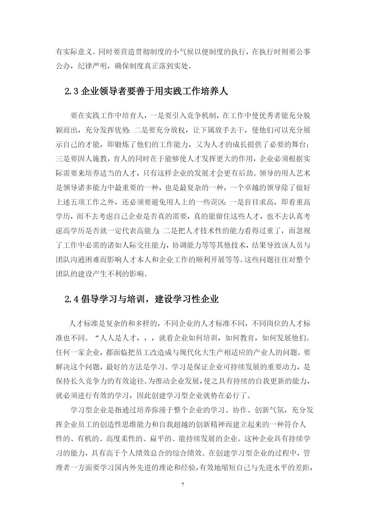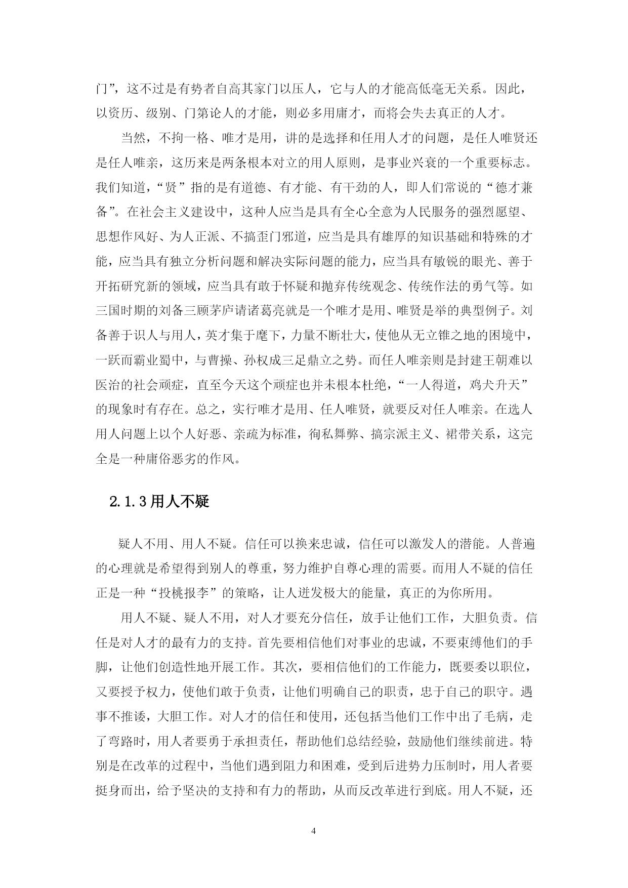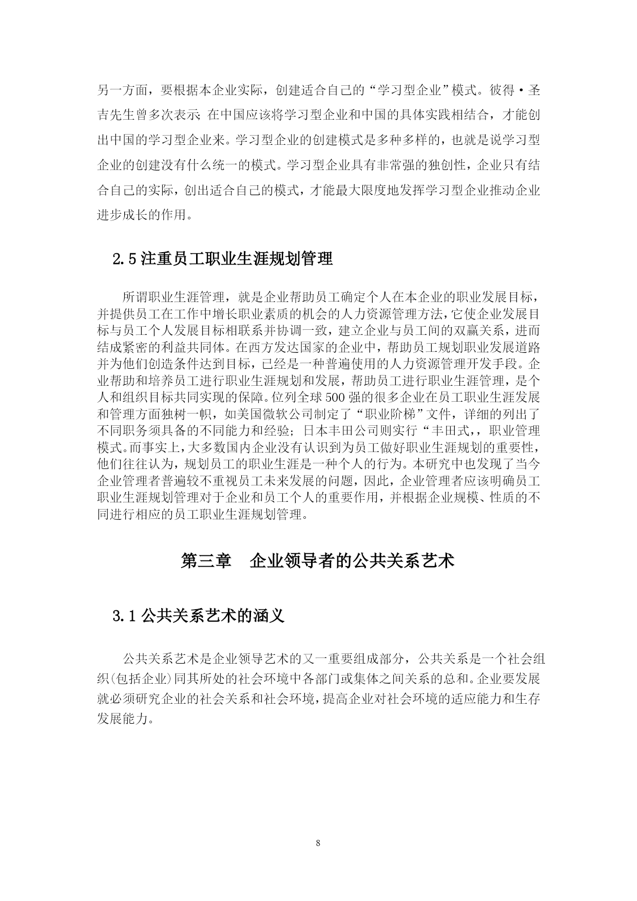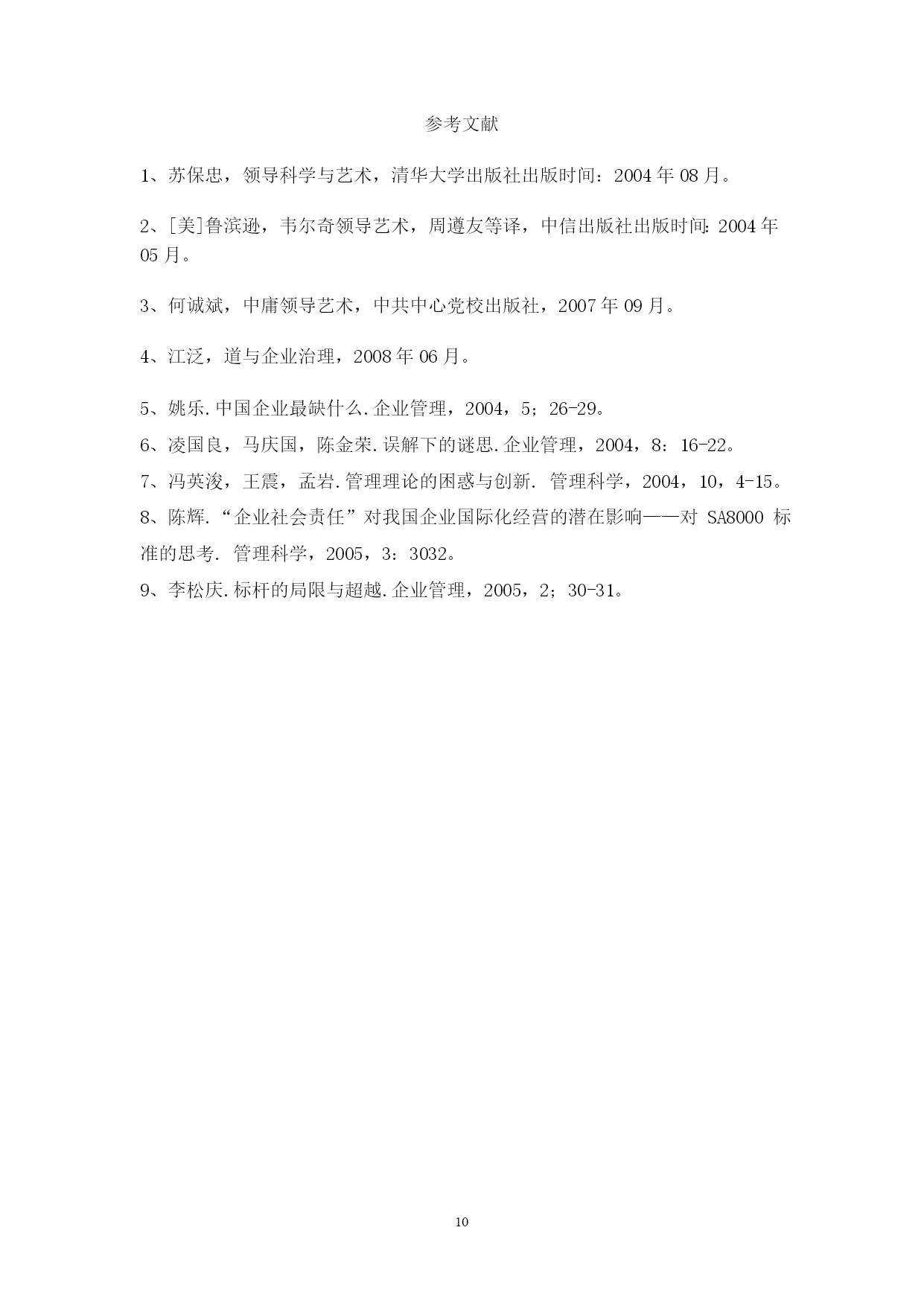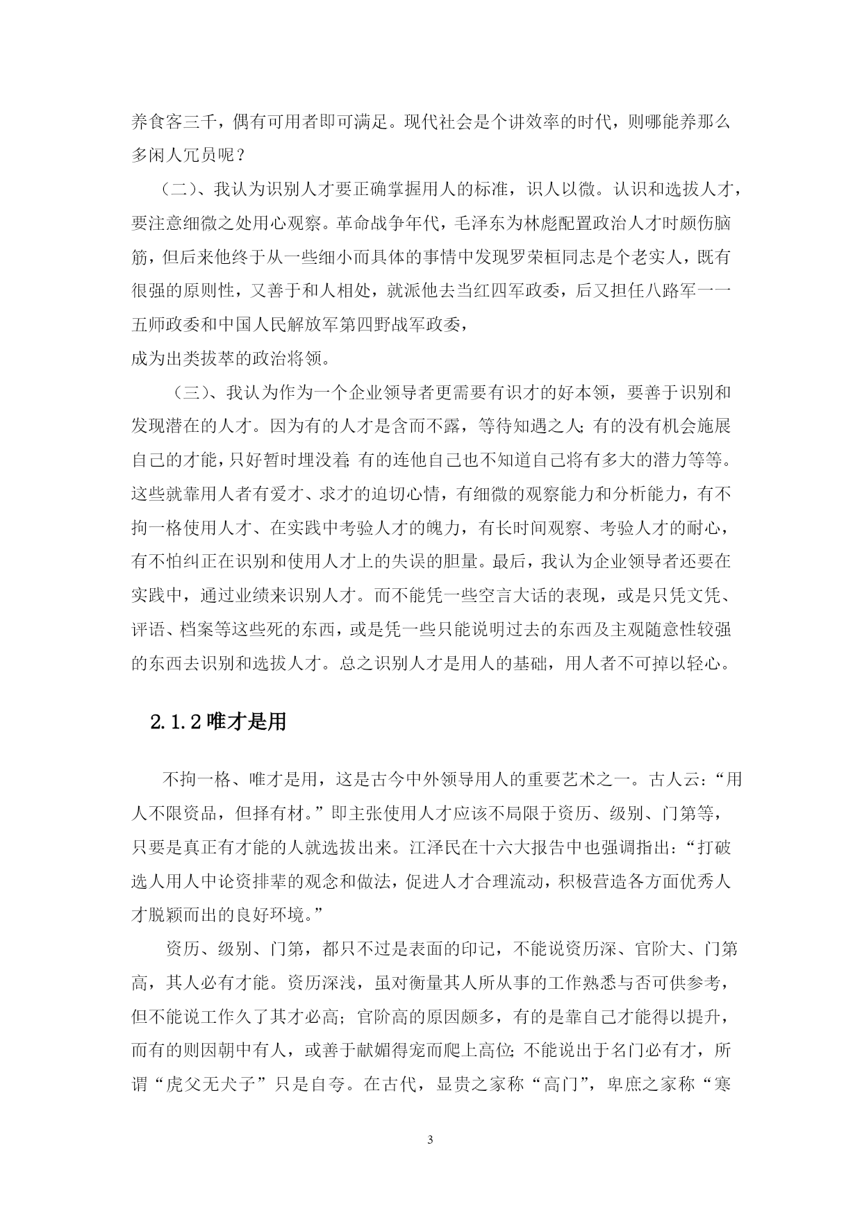PAGEPAGE10论企业领导艺术摘要:作为一个企业的领导,其行为举止都将影响到这个企业未来的发展方向。领导艺术是新时期企业领导必然面临的课题,面对瞬息万变的客观环境,不但需要有新的领导治理思想与之对应,也要求把握现代领导艺术来实施领导活动和实现领奖励。现今人们日益重视企业家才能对企业发展的影响力,领导者在组织中的四种角色,体现出领导艺术独特性、影响力广泛性等特点。领导艺术可表现为倡导企业文化的艺术、用人的艺术、提高企业绩效的艺术。文章分析了不同形式的领导艺术。关键词:企业领导领导者领导艺术OnthecorporateleadershipAbstract:Asabusinessleader,hisbehaviorwillaffectthefuturedir-ectionofthisbusiness.Newleadershipisthesubjectofbusinessle-aderstofacethefaceofever-changingobjectivecircumstances,notonlytheneedfornewthinkingofthecorrespondingleadinggovernance,butalsotograspthemodernartofleadershiprequiredtoleadtheimpl-ementationofleadershipactivitiesandachieveawards.Todaythereisgrowingemphasisonentrepreneurshipinfluenceonenterprisedevelopment,leadersofthefourrolesintheorganization,reflectingtheuniquena-tureofleadership,influence,widespreadandsoon.Leadershipcanbeexpressedastheartofpromotingcorporateculture,employingtheart,theartofimprovingbusinessperformance.Approachtocaseanalysispaperdiscussesthedifferentformsofthekeyelementsofleadership.Keywords:BusinessLeadersLeadershipLeadership引言领导对于企业来说是一个十分重要的职位,而企业领导者的行为举止、做事能力,则直接关系到企业发展的兴衰成败。正所谓领导是企业兴衰之根本,因此,企业要发展,就必须有好的领导者,领导者要具备善于识人用人、唯才是用、用人不疑、攻心为上、维持平衡等用人艺术,充分而合理地加以开发和利用世界上最为珍贵和有限的人这种惟一能够扩大资源的资源。提高企业领导的的领导艺术能力是企业能否留住人才,用好人才的关键。领导应在一定知识、经验和辩证思维的基础上,富有创造性、选择性地运用领导原则和方法的才能。它是非规范化、非程序化的领导行为,是领导者聪明、学识、胆略、经验、作风、品格、方法、能力的综合体现。现代企业的领导艺术内容极为广泛,本文主要讨论企业领导的用人艺术和公共关系艺术。企业领导者的用人艺术用人是领导艺术中最基本、最精彩的部分,现代企业的企业领导者很好的掌握这方面的经验,可以极大地调动全体员工的积极性、主动性和创造性,搞好经营管理,使企业兴旺发达。企业领导者的用人艺术包括多个方面的内容,如掌握用人的诀窍、合理使用人才,做到人尽其才、做到用人不疑等,但笔者认为归纳起来,主要包括两个方面的内容,就是企业领导者的用人原则和企业领导者的用人方式。1.1企业领导者的用人原则2.1.1用人先识人(一)、用人必先识人,这是领导用人艺术的首要条件。用才是艺术,识才也是艺术。对于企业领导者的用人来说,首先就要会识别人才。如何识别人才呢?我认为首先要有一颗热心和一双慧眼。这样才能到泥沙俱下、鱼龙混杂、真假难辨的现实当中去真正识别真才,从而把非人才淘汰出去。古时有的官僚显贵动辄养食客三千,偶有可用者即可满足。现代社会是个讲效率的时代,则哪能养那么多闲人冗员呢?(二)、我认为识别人才要正确掌握用人的标准,识人以微。认识和选拔人才,要注意细微之处用心观察。革命战争年代,毛泽东为林彪配置政治人才时颇伤脑筋,但后来他终于从一些细小而具体的事情中发现罗荣桓同志是个老实人,既有很强的原则性,又善于和人相处,就派他去当红四军政委,后又担任八路军一一五师政委和中国人民解放军第四野战军政委,成为出类拔萃的政治将领。(三)、我认为作为一个企业领导者更需要有识才的好本