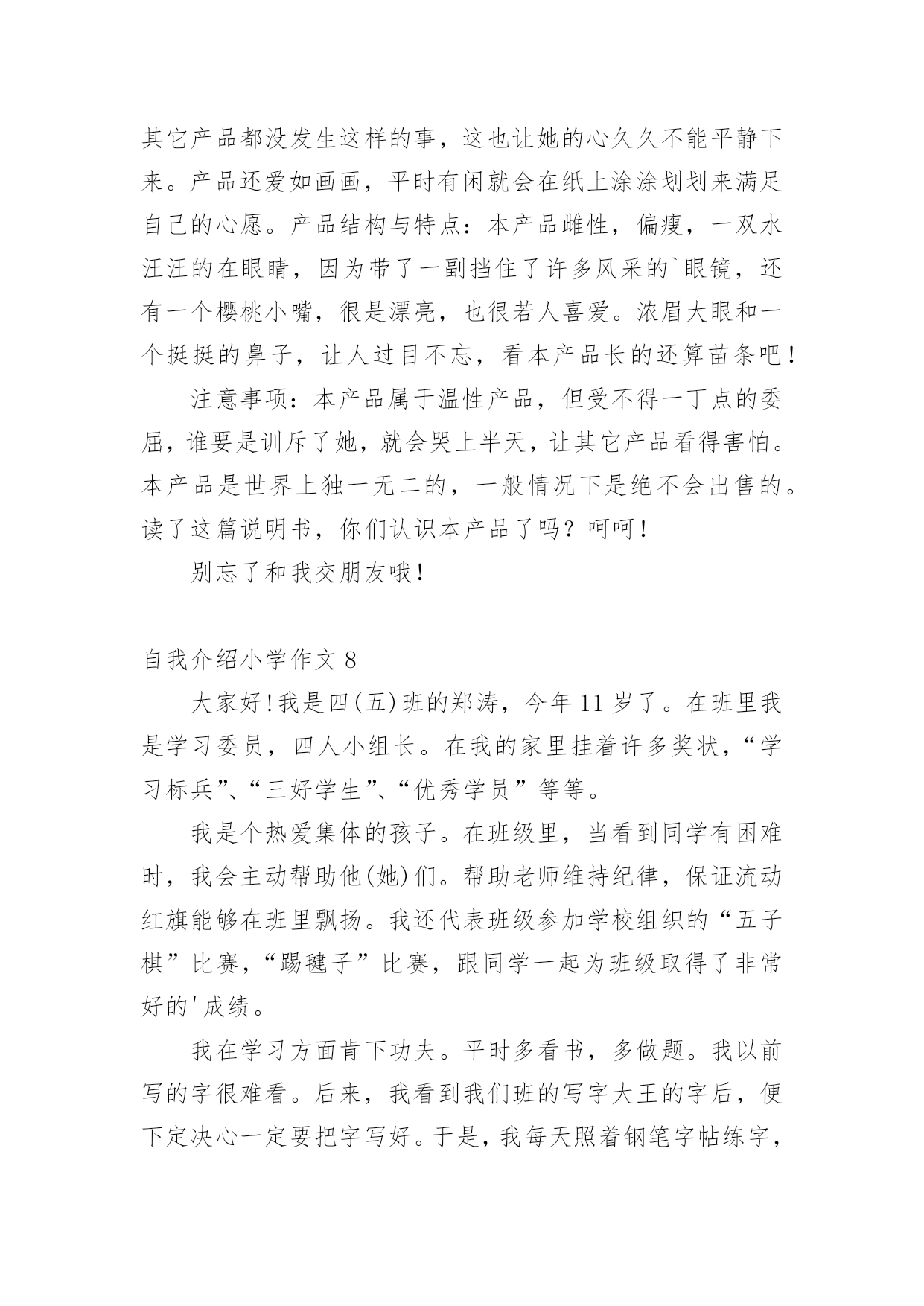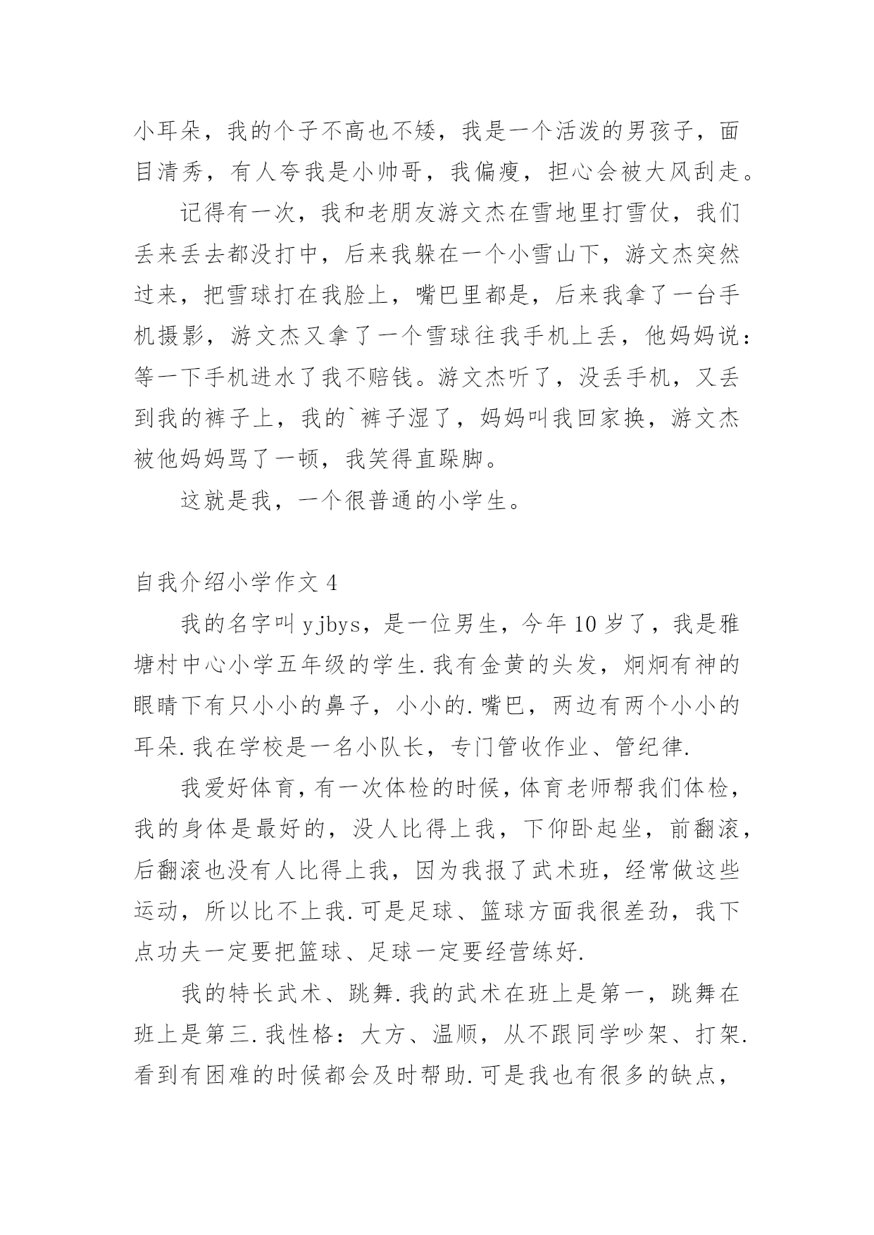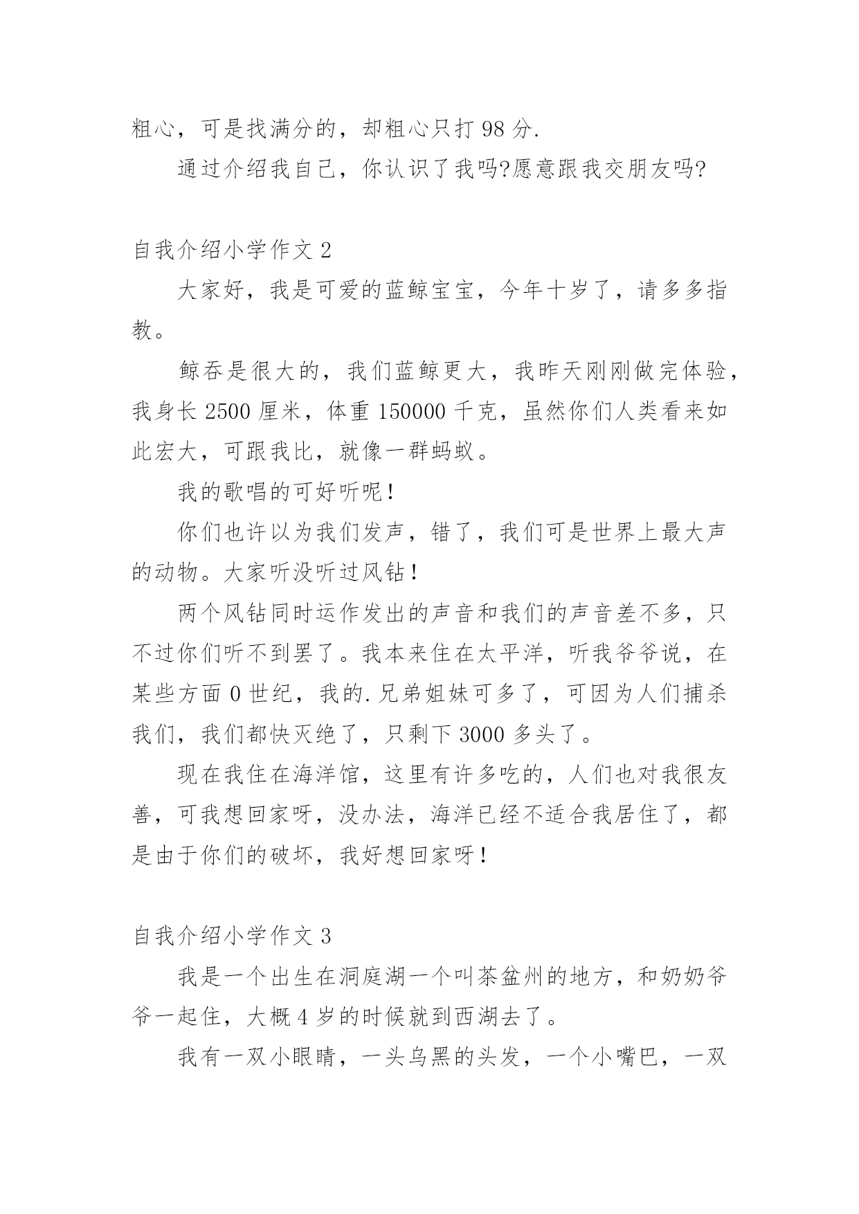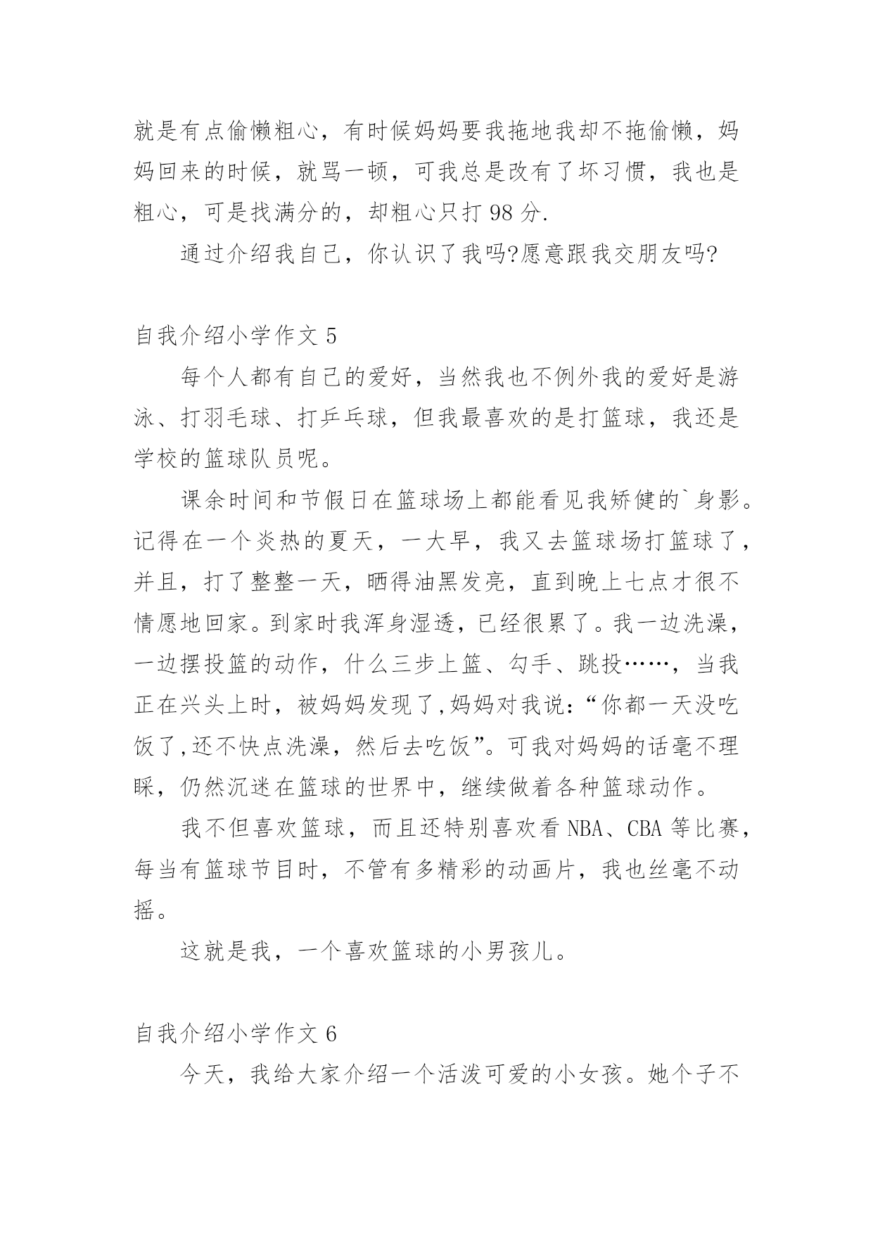 自我介绍小学作文当我们在一个新环境中,进行自我介绍是必不可少的,自我介绍可以拉近我们与陌生人的关系。那要怎么写好自我介绍呢?下面是小编整理的自我介绍小学作文,供大家参考借鉴,希望可以帮助到有需要的朋友。自我介绍小学作文1同学们:我的名字叫xx,是一位男生,今年10岁了,我是雅塘村中心小学五年级的学生.我有金黄的头发,炯炯有神的眼睛下有只小小的.鼻子,小小的嘴巴,两边有两个小小的耳朵.我在学校是一名小队长,专门管收作业、管纪律.我爱好体育,有一次体检的时候,体育老师帮我们体检,我的身体是最好的,没人比得上我,下仰卧起坐,前翻滚,后翻滚也没有人比得上我,因为我报了武术班,经常做这些运动,所以比不上我.可是足球、篮球方面我很差劲,我下点功夫一定要把篮球、足球一定要经营练好.我的特长武术、跳舞.我的武术在班上是第一,跳舞在班上是第三.我性格:大方、温顺,从不跟同学吵架、打架.看到有困难的时候都会及时帮助.可是我也有很多的缺点,就是有点偷懒粗心,有时候妈妈要我拖地我却不拖偷懒,妈妈回来的时候,就骂一顿,可我总是改有了坏习惯,我也是粗心,可是找满分的,却粗心只打98分.通过介绍我自己,你认识了我吗?愿意跟我交朋友吗?自我介绍小学作文2大家好,我是可爱的蓝鲸宝宝,今年十岁了,请多多指教。鲸吞是很大的,我们蓝鲸更大,我昨天刚刚做完体验,我身长2500厘米,体重150000千克,虽然你们人类看来如此宏大,可跟我比,就像一群蚂蚁。我的歌唱的可好听呢!你们也许以为我们发声,错了,我们可是世界上最大声的动物。大家听没听过风钻!两个风钻同时运作发出的声音和我们的声音差不多,只不过你们听不到罢了。我本来住在太平洋,听我爷爷说,在某些方面0世纪,我的.兄弟姐妹可多了,可因为人们捕杀我们,我们都快灭绝了,只剩下3000多头了。现在我住在海洋馆,这里有许多吃的,人们也对我很友善,可我想回家呀,没办法,海洋已经不适合我居住了,都是由于你们的破坏,我好想回家呀!自我介绍小学作文3我是一个出生在洞庭湖一个叫茶盆州的地方,和奶奶爷爷一起住,大概4岁的时候就到西湖去了。我有一双小眼睛,一头乌黑的头发,一个小嘴巴,一双小耳朵,我的个子不高也不矮,我是一个活泼的男孩子,面目清秀,有人夸我是小帅哥,我偏瘦,担心会被大风刮走。记得有一次,我和老朋友游文杰在雪地里打雪仗,我们丢来丢去都没打中,后来我躲在一个小雪山下,游文杰突然过来,把雪球打在我脸上,嘴巴里都是,后来我拿了一台手机摄影,游文杰又拿了一个雪球往我手机上丢,他妈妈说:等一下手机进水了我不赔钱。游文杰听了,没丢手机,又丢到我的裤子上,我的`裤子湿了,妈妈叫我回家换,游文杰被他妈妈骂了一顿,我笑得直跺脚。这就是我,一个很普通的小学生。自我介绍小学作文4我的名字叫yjbys,是一位男生,今年10岁了,我是雅塘村中心小学五年级的学生.我有金黄的头发,炯炯有神的眼睛下有只小小的鼻子,小小的.嘴巴,两边有两个小小的耳朵.我在学校是一名小队长,专门管收作业、管纪律.我爱好体育,有一次体检的时候,体育老师帮我们体检,我的身体是最好的,没人比得上我,下仰卧起坐,前翻滚,后翻滚也没有人比得上我,因为我报了武术班,经常做这些运动,所以比不上我.可是足球、篮球方面我很差劲,我下点功夫一定要把篮球、足球一定要经营练好.我的特长武术、跳舞.我的武术在班上是第一,跳舞在班上是第三.我性格:大方、温顺,从不跟同学吵架、打架.看到有困难的时候都会及时帮助.可是我也有很多的缺点,就是有点偷懒粗心,有时候妈妈要我拖地我却不拖偷懒,妈妈回来的时候,就骂一顿,可我总是改有了坏习惯,我也是粗心,可是找满分的,却粗心只打98分.通过介绍我自己,你认识了我吗?愿意跟我交朋友吗?自我介绍小学作文5每个人都有自己的爱好,当然我也不例外我的爱好是游泳、打羽毛球、打乒乓球,但我最喜欢的是打篮球,我还是学校的篮球队员呢。课余时间和节假日在篮球场上都能看见我矫健的`身影。记得在一个炎热的夏天,一大早,我又去篮球场打篮球了,并且,打了整整一天,晒得油黑发亮,直到晚上七点才很不情愿地回家。到家时我浑身湿透,已经很累了。我一边洗澡,一边摆投篮的动作,什么三步上篮、勾手、跳投……,当我正在兴头上时,被妈妈发现了,妈妈对我说:“你都一天没吃饭了,还不快点洗澡,然后去吃饭”。可我对妈妈的话毫不理睬,仍然沉迷在篮球的世界中,继续做着各种篮球动作。我不但喜欢篮球,而且还特别喜欢看NBA、CBA等比赛,每当有篮球节目时,不管有多精彩的动画片,我也丝毫不动摇。这就是我,一个喜欢篮球的小男孩儿。自我介绍小学作文6今天,我给大家介绍一个活泼可爱的小女孩。她个子不太高、瘦瘦的,浓浓的眉毛、水汪汪的大眼睛,扁鼻子、樱桃小嘴。可能由于其他五官长得还不错,那扁鼻子便没那么引人注意了。你们知道这个人是谁吗?