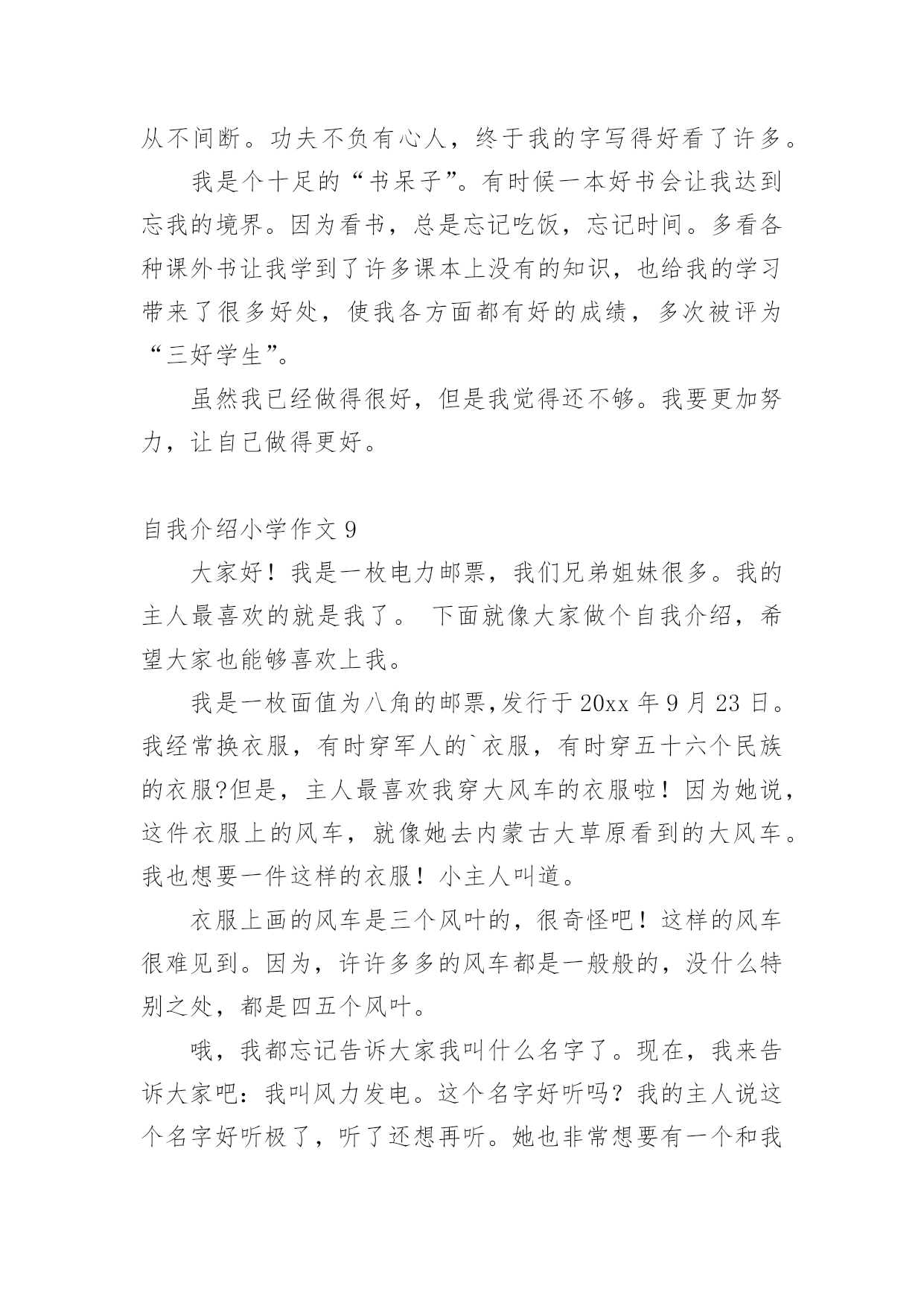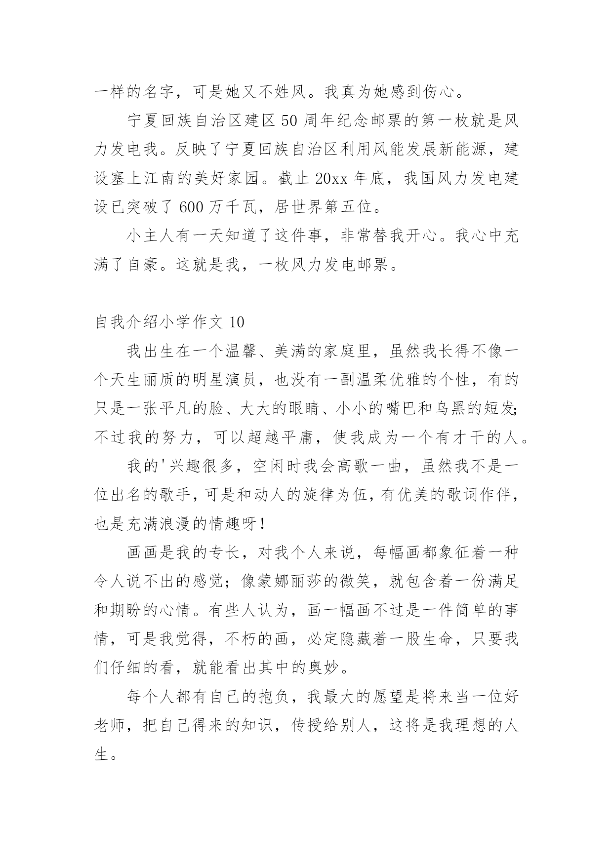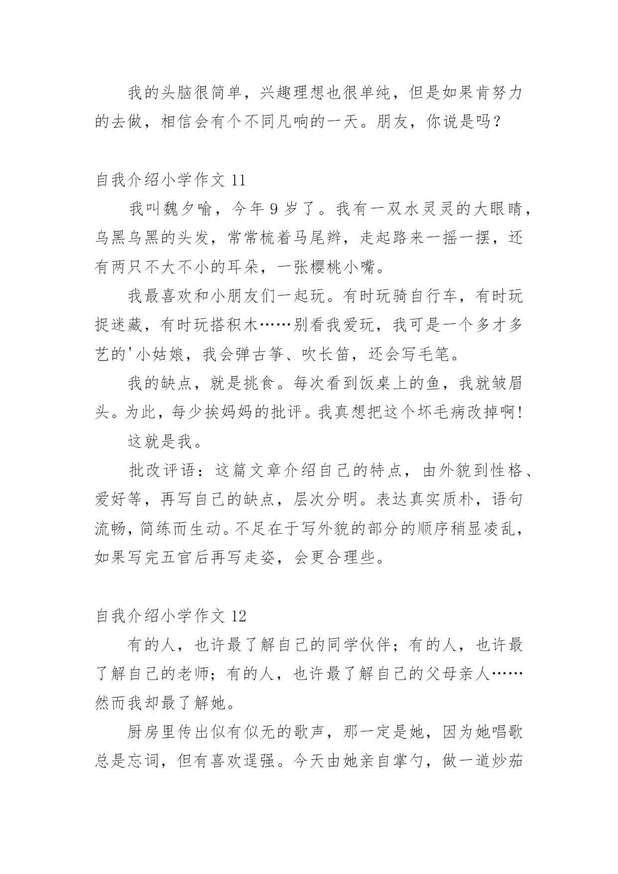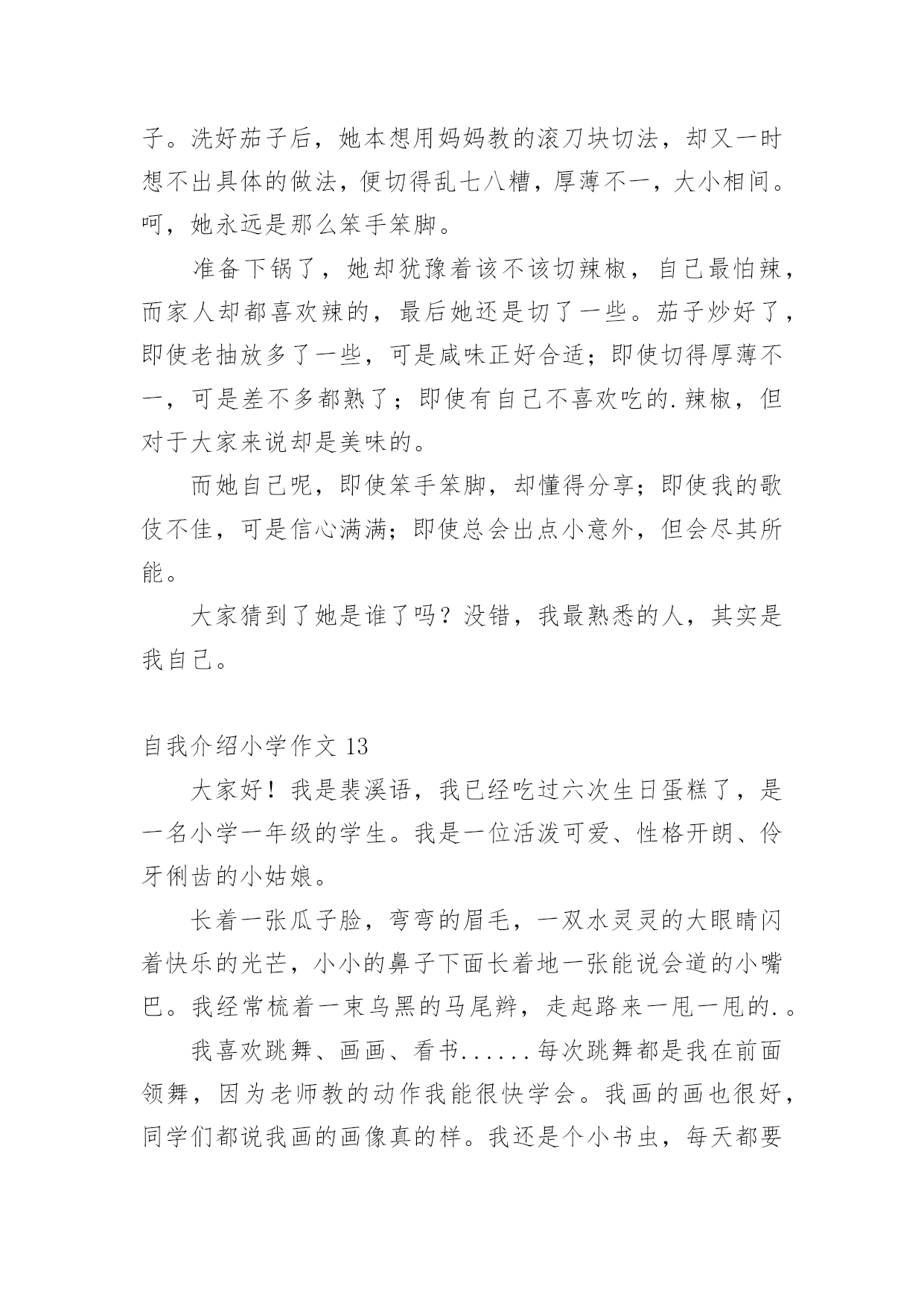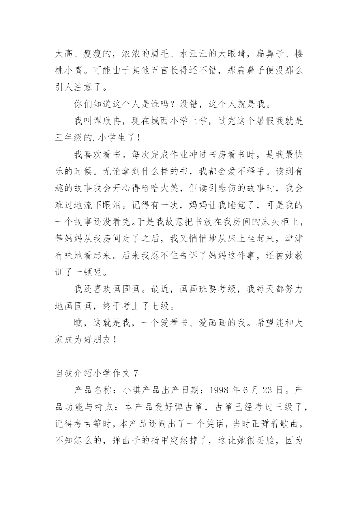 自我介绍小学作文当我们在一个新环境中,进行自我介绍是必不可少的,自我介绍可以拉近我们与陌生人的关系。那要怎么写好自我介绍呢?下面是小编整理的自我介绍小学作文,供大家参考借鉴,希望可以帮助到有需要的朋友。自我介绍小学作文1同学们:我的名字叫xx,是一位男生,今年10岁了,我是雅塘村中心小学五年级的学生.我有金黄的头发,炯炯有神的眼睛下有只小小的.鼻子,小小的嘴巴,两边有两个小小的耳朵.我在学校是一名小队长,专门管收作业、管纪律.我爱好体育,有一次体检的时候,体育老师帮我们体检,我的身体是最好的,没人比得上我,下仰卧起坐,前翻滚,后翻滚也没有人比得上我,因为我报了武术班,经常做这些运动,所以比不上我.可是足球、篮球方面我很差劲,我下点功夫一定要把篮球、足球一定要经营练好.我的特长武术、跳舞.我的武术在班上是第一,跳舞在班上是第三.我性格:大方、温顺,从不跟同学吵架、打架.看到有困难的时候都会及时帮助.可是我也有很多的缺点,就是有点偷懒粗心,有时候妈妈要我拖地我却不拖偷懒,妈妈回来的时候,就骂一顿,可我总是改有了坏习惯,我也是粗心,可是找满分的,却粗心只打98分.通过介绍我自己,你认识了我吗?愿意跟我交朋友吗?自我介绍小学作文2大家好,我是可爱的蓝鲸宝宝,今年十岁了,请多多指教。鲸吞是很大的,我们蓝鲸更大,我昨天刚刚做完体验,我身长2500厘米,体重150000千克,虽然你们人类看来如此宏大,可跟我比,就像一群蚂蚁。我的歌唱的可好听呢!你们也许以为我们发声,错了,我们可是世界上最大声的动物。大家听没听过风钻!两个风钻同时运作发出的声音和我们的声音差不多,只不过你们听不到罢了。我本来住在太平洋,听我爷爷说,在某些方面0世纪,我的.兄弟姐妹可多了,可因为人们捕杀我们,我们都快灭绝了,只剩下3000多头了。现在我住在海洋馆,这里有许多吃的,人们也对我很友善,可我想回家呀,没办法,海洋已经不适合我居住了,都是由于你们的破坏,我好想回家呀!自我介绍小学作文3我是一个出生在洞庭湖一个叫茶盆州的地方,和奶奶爷爷一起住,大概4岁的时候就到西湖去了。我有一双小眼睛,一头乌黑的头发,一个小嘴巴,一双小耳朵,我的个子不高也不矮,我是一个活泼的男孩子,面目清秀,有人夸我是小帅哥,我偏瘦,担心会被大风刮走。记得有一次,我和老朋友游文杰在雪地里打雪仗,我们丢来丢去都没打中,后来我躲在一个小雪山下,游文杰突然过来,把雪球打在我脸上,嘴巴里都是,后来我拿了一台手机摄影,游文杰又拿了一个雪球往我手机上丢,他妈妈说:等一下手机进水了我不赔钱。游文杰听了,没丢手机,又丢到我的裤子上,我的`裤子湿了,妈妈叫我回家换,游文杰被他妈妈骂了一顿,我笑得直跺脚。这就是我,一个很普通的小学生。自我介绍小学作文4我的名字叫yjbys,是一位男生,今年10岁了,我是雅塘村中心小学五年级的学生.我有金黄的头发,炯炯有神的眼睛下有只小小的鼻子,小小的.嘴巴,两边有两个小小的耳朵.我在学校是一名小队长,专门管收作业、管纪律.我爱好体育,有一次体检的时候,体育老师帮我们体检,我的身体是最好的,没人比得上我,下仰卧起坐,前翻滚,后翻滚也没有人比得上我,因为我报了武术班,经常做这些运动,所以比不上我.可是足球、篮球方面我很差劲,我下点功夫一定要把篮球、足球一定要经营练好.我的特长武术、跳舞.我的武术在班上是第一,跳舞在班上是第三.我性格:大方、温顺,从不跟同学吵架、打架.看到有困难的时候都会及时帮助.可是我也有很多的缺点,就是有点偷懒粗心,有时候妈妈要我拖地我却不拖偷懒,妈妈回来的时候,就骂一顿,可我总是改有了坏习惯,我也是粗心,可是找满分的,却粗心只打98分.通过介绍我自己,你认识了我吗?愿意跟我交朋友吗?自我介绍小学作文5每个人都有自己的爱好,当然我也不例外我的爱好是游泳、打羽毛球、打乒乓球,但我最喜欢的是打篮球,我还是学校的篮球队员呢。课余时间和节假日在篮球场上都能看见我矫健的`身影。记得在一个炎热的夏天,一大早,我又去篮球场打篮球了,并且,打了整整一天,晒得油黑发亮,直到晚上七点才很不情愿地回家。到家时我浑身湿透,已经很累了。我一边洗澡,一边摆投篮的动作,什么三步上篮、勾手、跳投……,当我正在兴头上时,被妈妈发现了,妈妈对我说:“你都一天没吃饭了,还不快点洗澡,然后去吃饭”。可我对妈妈的话毫不理睬,仍然沉迷在篮球的世界中,继续做着各种篮球动作。我不但喜欢篮球,而且还特别喜欢看NBA、CBA等比赛,每当有篮球节目时,不管有多精彩的动画片,我也丝毫不动摇。这就是我,一个喜欢篮球的小男孩儿。自我介绍小学作文6今天,我给大家介绍一个活泼可爱的小女孩。她个子不太高、瘦瘦的,浓浓的眉毛、水汪汪的大眼睛,扁鼻子、樱桃小嘴。可能由于其他五官长得还不错,那扁鼻子便没那么引人注意了。你们知道这个人是谁吗?
