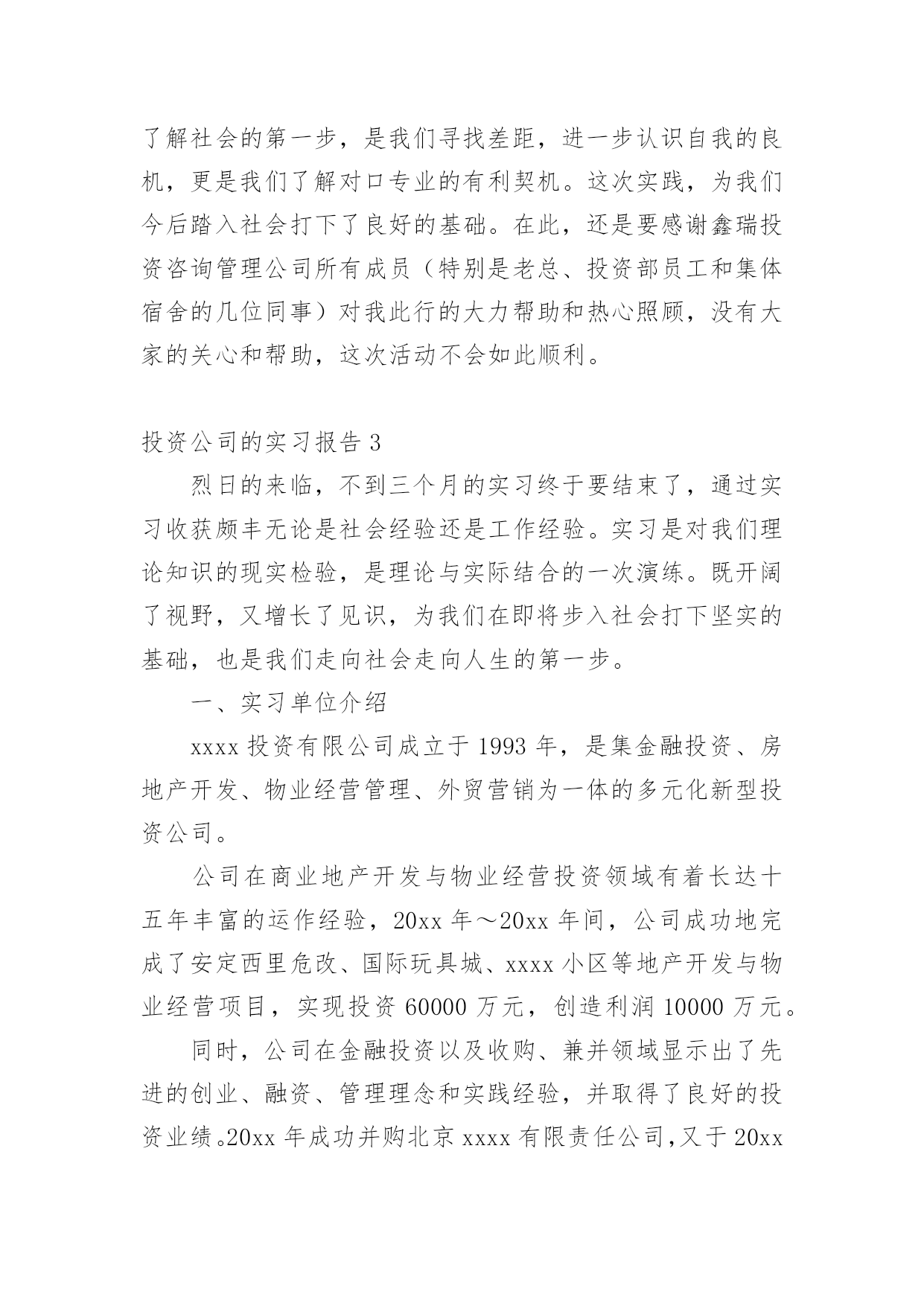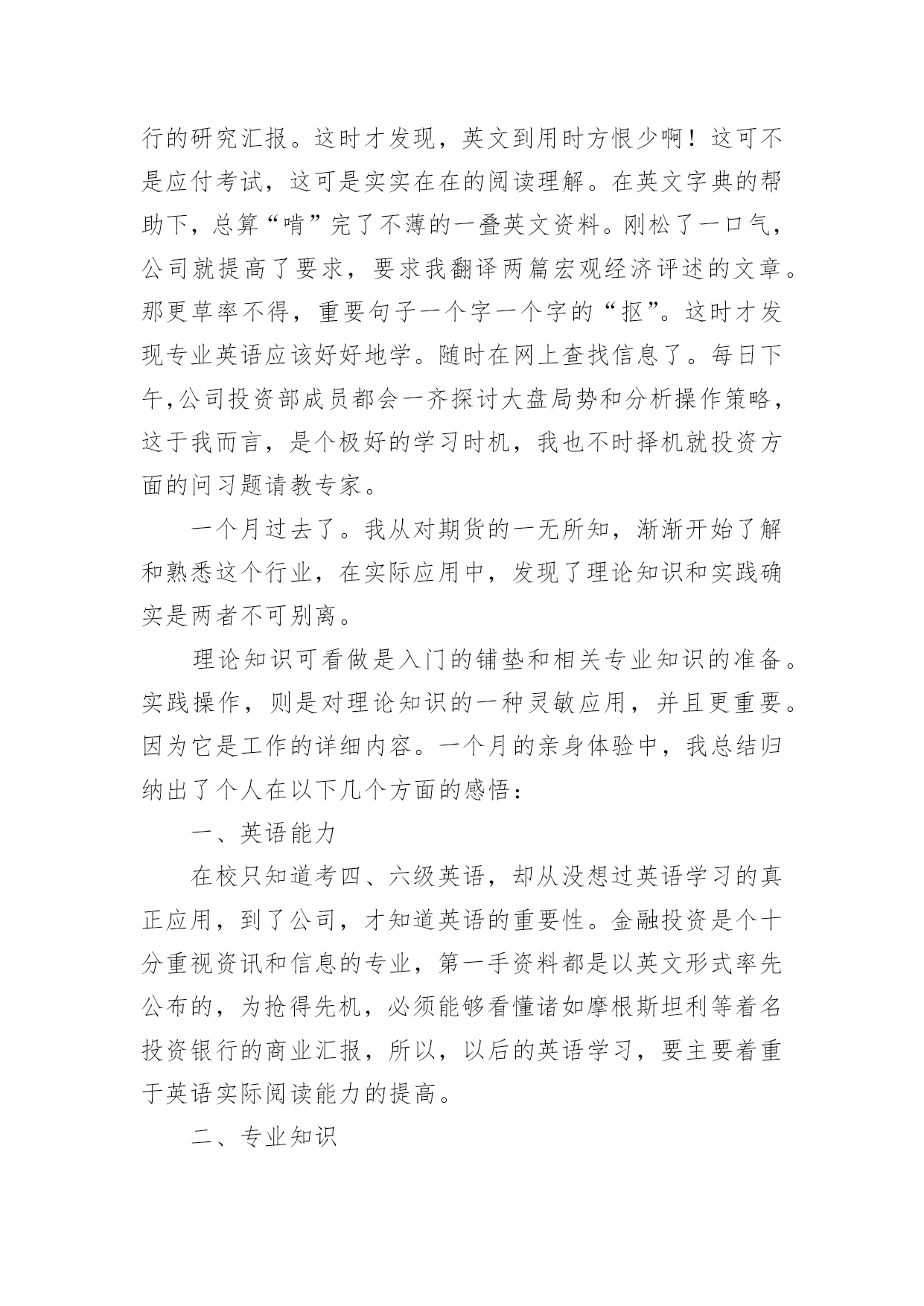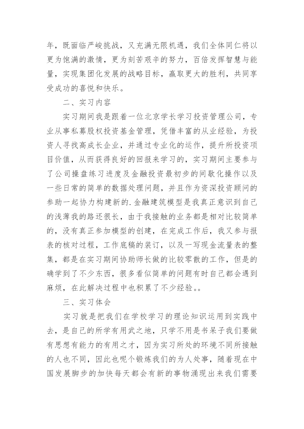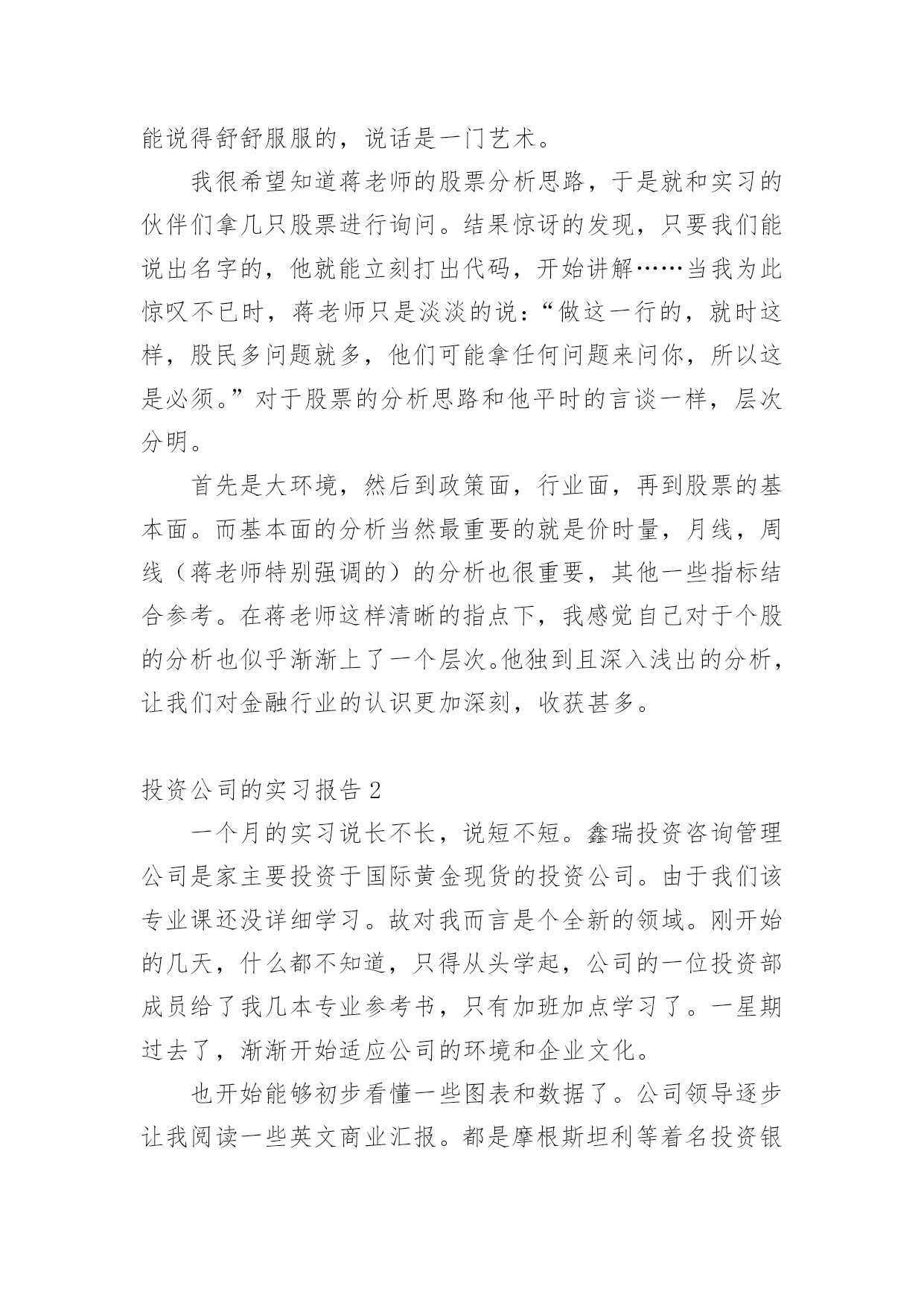 投资公司的实习报告随着个人的素质不断提高,报告不再是罕见的东西,报告根据用途的不同也有着不同的类型。那么你真正懂得怎么写好报告吗?下面是小编收集整理的投资公司的实习报告,希望对大家有所帮助。投资公司的实习报告1今年暑假,经过重重关卡——简历筛选,面试考核,我很荣幸被华泰证券股份有限公司录取为暑期实习生,分配到公司旗下最大、历史最悠久的、也在公司的作为标杆性的营业部——止马营营业部进行了为期一个月的实习。在这短短4个星期多的实习生活,自然是收获颇丰,不仅对证券公司的日常工作流程有了实地的、细致的了解,更重要的是结识了一批有十几年的证券从业经验的专业人士(在此,我应该称他们为指导老师)。在与长辈们和同龄人的交流中以及自己的实习期间的耳濡目染和亲身体会,我对于证券行业有了一些颇深的认识。另外,这次实习经历也让我感觉到了自己今后事业发展的方向,也明确了自己当前的不足,以及自己需要在学校为未来做些什么。感谢面试我的人力资源总监李总,谢谢您给了我这次实习的机会;感谢营业部总经理马总,谢谢您对我们实习生的大力支持和鼓励;感谢实习生团队带头人季总,谢谢您每天晨会上对我们工作的细致指导和尊尊教诲。特别感谢我的指导老师——张总,谢谢您对我的关心,和不厌其烦地解答我奇奇怪怪的问题的耐心,您的解答让我对证券行业有了更深层次的认识,您的言行和工作态度让我无形中也懂得了许多简单而深刻的道理。还有有幸一起实习的伙伴们,和你们交流和学习,并肩作战的时光很充实,很快乐!“以客户服务为中心、以客户需求为导向、以客户满意为目的”是华泰证券坚持的服务理念。华泰证券拥有证券经纪服务、资产管理服务、投资银行服务、固定收益服务和直接投资服务为基本架构的完善的专业证券服务体系,以及研究咨询、信息技术和风险管理等强有力的服务支持体系。XX年年,华泰证券在“高效、诚信、稳健、创新”核心价值观的基础上,明确提出了“做最具责任感的理财专家”的品牌精神,得到了市场和社会各界的广泛认同。华泰证券的市场地位和品牌影响力不断提升,正在成长为具有核心服务优势和较强市场竞争能力的`综合金融服务提供商。值得谈的是季总,作为客户经理,他每天和各种各样个性的客户打交道,帮他们处理各式各样奇奇怪怪的问题,还要管理我们这群不太懂事的实习生,可谓工作繁琐至极。但他总能处理地井井有条,他有几乎让每一个怒气冲冲的客户到他那谈完之后,笑眯眯、乐呵呵的回去的本事。他很注意说话的语气、措辞和分寸,并且很有自己的风格,他说一句话同一个意思,不同的语气可能把人说得发彪,也可能说得舒舒服服的,说话是一门艺术。我很希望知道蒋老师的股票分析思路,于是就和实习的伙伴们拿几只股票进行询问。结果惊讶的发现,只要我们能说出名字的,他就能立刻打出代码,开始讲解……当我为此惊叹不已时,蒋老师只是淡淡的说:“做这一行的,就时这样,股民多问题就多,他们可能拿任何问题来问你,所以这是必须。”对于股票的分析思路和他平时的言谈一样,层次分明。首先是大环境,然后到政策面,行业面,再到股票的基本面。而基本面的分析当然最重要的就是价时量,月线,周线(蒋老师特别强调的)的分析也很重要,其他一些指标结合参考。在蒋老师这样清晰的指点下,我感觉自己对于个股的分析也似乎渐渐上了一个层次。他独到且深入浅出的分析,让我们对金融行业的认识更加深刻,收获甚多。投资公司的实习报告2一个月的实习说长不长,说短不短。鑫瑞投资咨询管理公司是家主要投资于国际黄金现货的投资公司。由于我们该专业课还没详细学习。故对我而言是个全新的领域。刚开始的几天,什么都不知道,只得从头学起,公司的一位投资部成员给了我几本专业参考书,只有加班加点学习了。一星期过去了,渐渐开始适应公司的环境和企业文化。也开始能够初步看懂一些图表和数据了。公司领导逐步让我阅读一些英文商业汇报。都是摩根斯坦利等着名投资银行的研究汇报。这时才发现,英文到用时方恨少啊!这可不是应付考试,这可是实实在在的阅读理解。在英文字典的帮助下,总算“啃”完了不薄的一叠英文资料。刚松了一口气,公司就提高了要求,要求我翻译两篇宏观经济评述的文章。那更草率不得,重要句子一个字一个字的“抠”。这时才发现专业英语应该好好地学。随时在网上查找信息了。每日下午,公司投资部成员都会一齐探讨大盘局势和分析操作策略,这于我而言,是个极好的学习时机,我也不时择机就投资方面的问习题请教专家。一个月过去了。我从对期货的一无所知,渐渐开始了解和熟悉这个行业,在实际应用中,发现了理论知识和实践确实是两者不可别离。理论知识可看做是入门的铺垫和相关专业知识的准备。实践操作,则是对理论知识的一种灵敏应用,并且更重要。因为它是工作的详细内容。一个月的亲身体验中,我总结归纳出了个人在以下几个方面的感悟:一、英语能力在校只知道考四、六级英语,却从没想过英语学习的真正应用,到