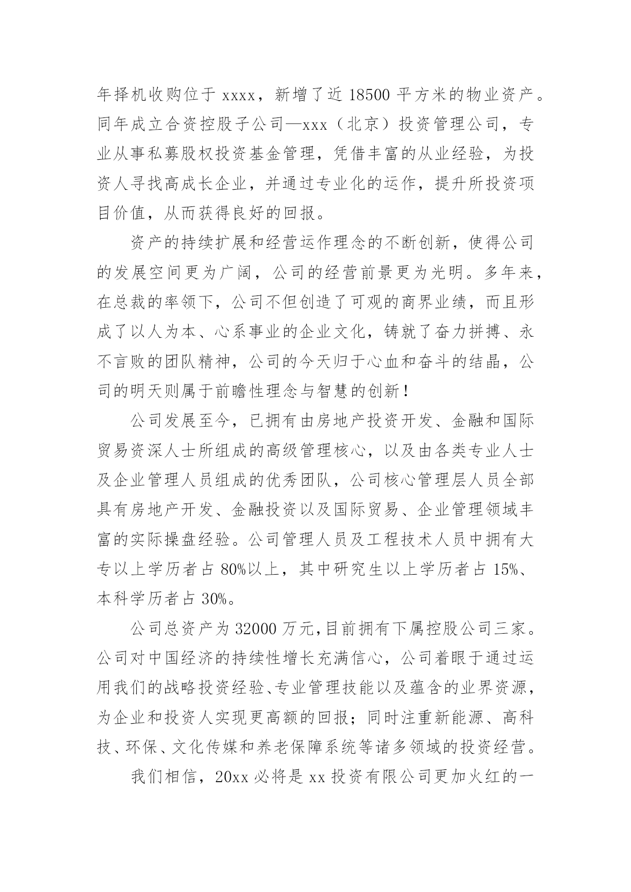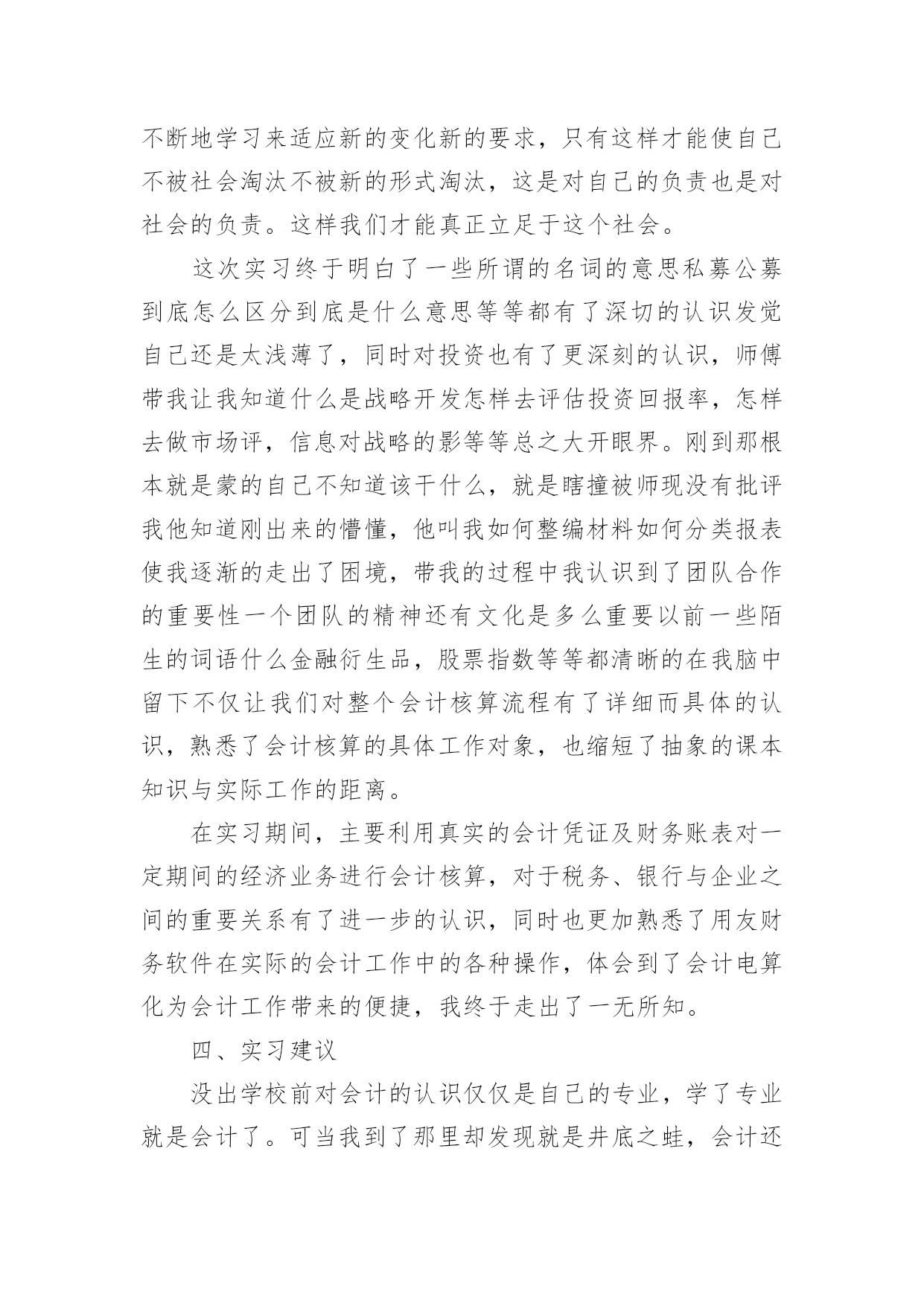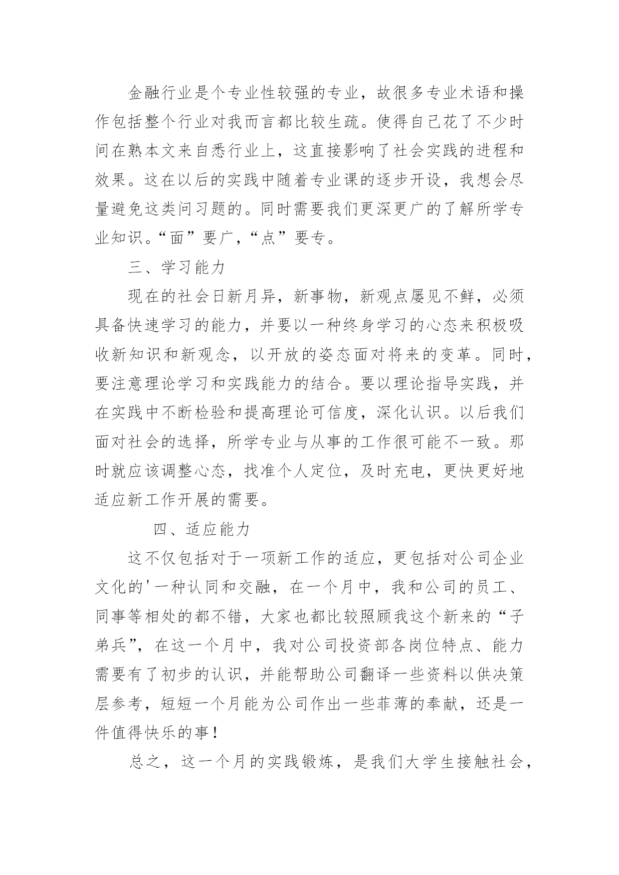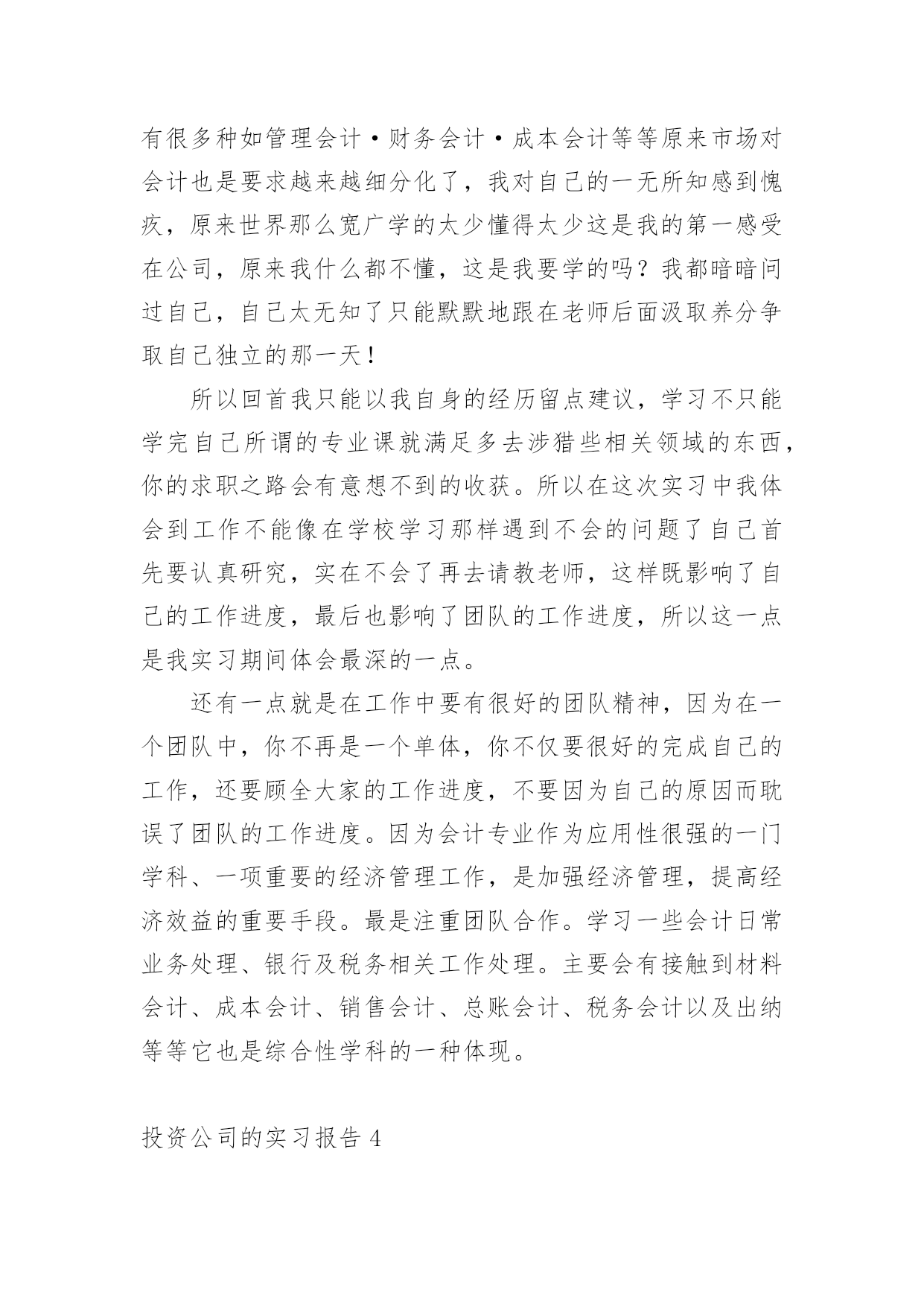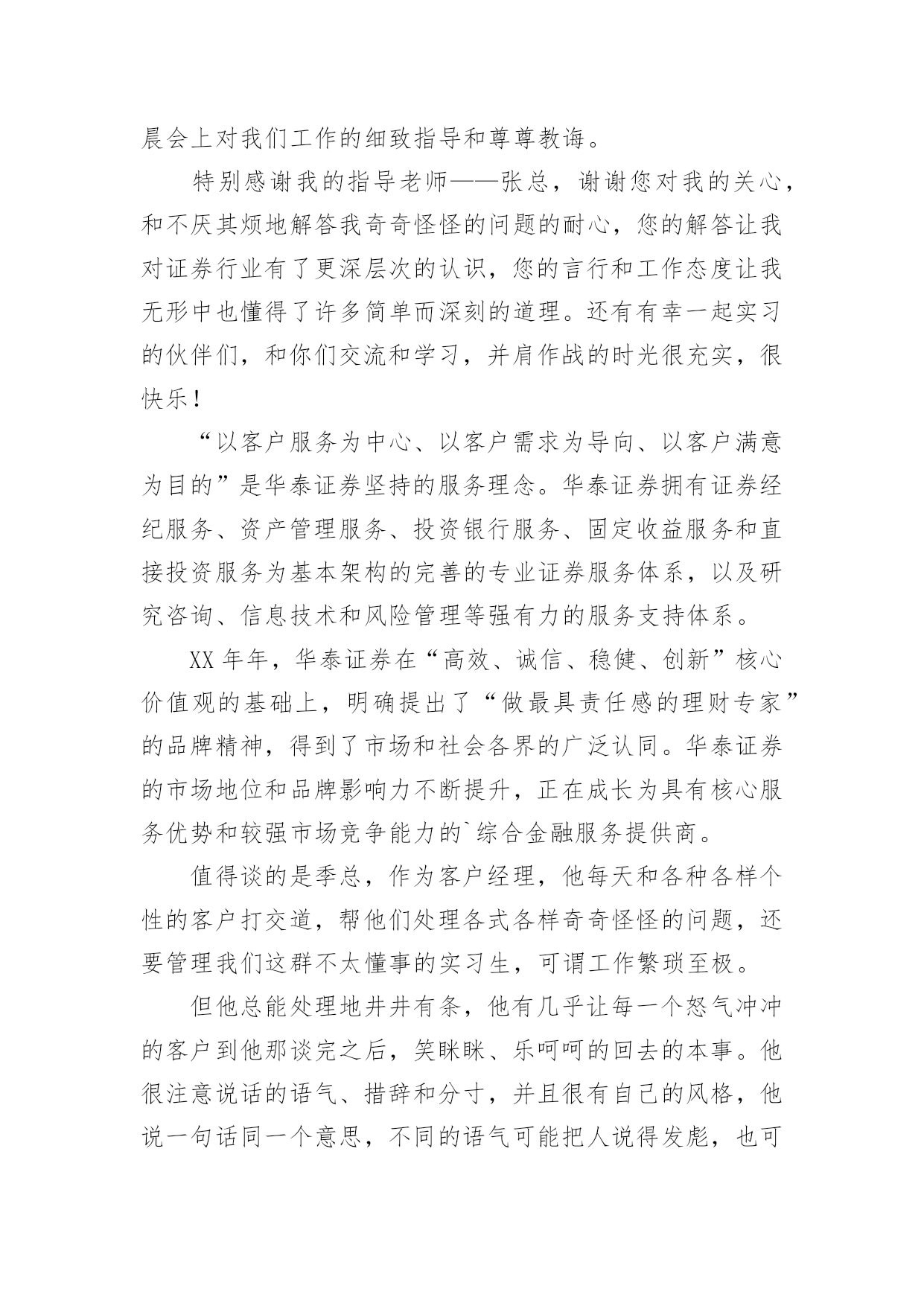 投资公司的实习报告随着个人的素质不断提高,报告不再是罕见的东西,报告根据用途的不同也有着不同的类型。那么你真正懂得怎么写好报告吗?下面是小编收集整理的投资公司的实习报告,希望对大家有所帮助。投资公司的实习报告1今年暑假,经过重重关卡——简历筛选,面试考核,我很荣幸被华泰证券股份有限公司录取为暑期实习生,分配到公司旗下最大、历史最悠久的、也在公司的作为标杆性的营业部——止马营营业部进行了为期一个月的实习。在这短短4个星期多的实习生活,自然是收获颇丰,不仅对证券公司的日常工作流程有了实地的、细致的了解,更重要的是结识了一批有十几年的证券从业经验的专业人士(在此,我应该称他们为指导老师)。在与长辈们和同龄人的交流中以及自己的实习期间的耳濡目染和亲身体会,我对于证券行业有了一些颇深的认识。另外,这次实习经历也让我感觉到了自己今后事业发展的方向,也明确了自己当前的不足,以及自己需要在学校为未来做些什么。感谢面试我的人力资源总监李总,谢谢您给了我这次实习的机会;感谢营业部总经理马总,谢谢您对我们实习生的大力支持和鼓励;感谢实习生团队带头人季总,谢谢您每天晨会上对我们工作的细致指导和尊尊教诲。特别感谢我的指导老师——张总,谢谢您对我的关心,和不厌其烦地解答我奇奇怪怪的问题的耐心,您的解答让我对证券行业有了更深层次的认识,您的言行和工作态度让我无形中也懂得了许多简单而深刻的道理。还有有幸一起实习的伙伴们,和你们交流和学习,并肩作战的时光很充实,很快乐!“以客户服务为中心、以客户需求为导向、以客户满意为目的”是华泰证券坚持的服务理念。华泰证券拥有证券经纪服务、资产管理服务、投资银行服务、固定收益服务和直接投资服务为基本架构的完善的专业证券服务体系,以及研究咨询、信息技术和风险管理等强有力的服务支持体系。XX年年,华泰证券在“高效、诚信、稳健、创新”核心价值观的基础上,明确提出了“做最具责任感的理财专家”的品牌精神,得到了市场和社会各界的广泛认同。华泰证券的市场地位和品牌影响力不断提升,正在成长为具有核心服务优势和较强市场竞争能力的`综合金融服务提供商。值得谈的是季总,作为客户经理,他每天和各种各样个性的客户打交道,帮他们处理各式各样奇奇怪怪的问题,还要管理我们这群不太懂事的实习生,可谓工作繁琐至极。但他总能处理地井井有条,他有几乎让每一个怒气冲冲的客户到他那谈完之后,笑眯眯、乐呵呵的回去的本事。他很注意说话的语气、措辞和分寸,并且很有自己的风格,他说一句话同一个意思,不同的语气可能把人说得发彪,也可能说得舒舒服服的,说话是一门艺术。我很希望知道蒋老师的股票分析思路,于是就和实习的伙伴们拿几只股票进行询问。结果惊讶的发现,只要我们能说出名字的,他就能立刻打出代码,开始讲解……当我为此惊叹不已时,蒋老师只是淡淡的说:“做这一行的,就时这样,股民多问题就多,他们可能拿任何问题来问你,所以这是必须。”对于股票的分析思路和他平时的言谈一样,层次分明。首先是大环境,然后到政策面,行业面,再到股票的基本面。而基本面的分析当然最重要的就是价时量,月线,周线(蒋老师特别强调的)的分析也很重要,其他一些指标结合参考。在蒋老师这样清晰的指点下,我感觉自己对于个股的分析也似乎渐渐上了一个层次。他独到且深入浅出的分析,让我们对金融行业的认识更加深刻,收获甚多。投资公司的实习报告2一个月的实习说长不长,说短不短。鑫瑞投资咨询管理公司是家主要投资于国际黄金现货的投资公司。由于我们该专业课还没详细学习。故对我而言是个全新的领域。刚开始的几天,什么都不知道,只得从头学起,公司的一位投资部成员给了我几本专业参考书,只有加班加点学习了。一星期过去了,渐渐开始适应公司的环境和企业文化。也开始能够初步看懂一些图表和数据了。公司领导逐步让我阅读一些英文商业汇报。都是摩根斯坦利等着名投资银行的研究汇报。这时才发现,英文到用时方恨少啊!这可不是应付考试,这可是实实在在的阅读理解。在英文字典的帮助下,总算“啃”完了不薄的一叠英文资料。刚松了一口气,公司就提高了要求,要求我翻译两篇宏观经济评述的文章。那更草率不得,重要句子一个字一个字的“抠”。这时才发现专业英语应该好好地学。随时在网上查找信息了。每日下午,公司投资部成员都会一齐探讨大盘局势和分析操作策略,这于我而言,是个极好的学习时机,我也不时择机就投资方面的问习题请教专家。一个月过去了。我从对期货的一无所知,渐渐开始了解和熟悉这个行业,在实际应用中,发现了理论知识和实践确实是两者不可别离。理论知识可看做是入门的铺垫和相关专业知识的准备。实践操作,则是对理论知识的一种灵敏应用,并且更重要。因为它是工作的详细内容。一个月的亲身体验中,我总结归纳出了个人在以下几个方面的感悟:一、英语能力在校只知道考四、六级英语,却从没想过英语学习的真正应用,到