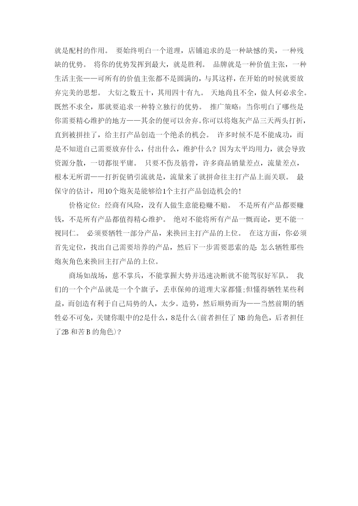 用二八定律来谈淘宝商城运营管理文章来源:HYPERLINK"http://www.bjlgw.net/"百家乐对于网站运营者来讲,一个网站的整体状况都是需要每个细节来不断完善,不断诊断、测试、调整,才能够达到最终的营销型商城,对于中型垂直化的商城和淘宝商城运营和C店运营的企业来讲涉及更多的是战略问题,而不是单单的几个产品的走量,当然企业也是要盈利的。下面利用2、8定律来谈网站运营中的操作,分享的是实战配合理论,理论也不是凭空遐想,根据一些大店铺的长期观察和电商行业的动态来定,总有你认可的观点。这个世界通过某些法则运算是公正的。商人付出了努力,为客户提供了便利,便应当获得合理的报酬。商人是一个处理器,他们将无序的市场变得有序,以满足客户的需求。他们更像一个设计师和建筑师——市场是商人设计和创建的。店铺定位:店铺只能有一个定位,不能风格多变,不能奢求所有人都喜欢。如果什么都想获得,最终只会表现平平。店铺的风格定位是一种取舍,为了获得一部分客户,就必须要果断的放弃另一部分客户。风格就是一种残疾,一种缺憾的美丽——我们的缺点太多,难以全部完善,所以只能尽力发挥我们的长处,而不是费时费力的补充短处。扬长永远比避短有效。在二八原理面前,木桶原理就是个渣。产品定位:店铺80%的产品注定都是配角,只能作为一种跑龙套的角色。我们要很快分清楚哪些产品是精英,哪些是炮灰。对于那些炮灰产品,涉及到打折,引流,赠品,甚至降权都要用到,它们就是用来顶缸的。主打产品不要轻易降价,要保留充足的库存,好的口碑,详尽的描述,不错的毛利,所有产品都要尽可能向它们引流。产品描述:产品的描述也要遵从二八原理,只要将其中的20%说明白,让顾客领悟并认可了就够了。产品描述要使用聚光灯的模式,周围一片漆黑,然后聚焦产品的最独特卖点。理解这种残缺,这种不完美,才能集合店铺的资源优势,打造出一个拳头产品。懂得放弃,才能拥有。装修定位:怎么让一个2B看起来很NB?很简单:放一批SB在2B周围。这就是配村的作用。要始终明白一个道理,店铺追求的是一种缺憾的美,一种残缺的优势。将你的优势发挥到最大,就是胜利。品牌就是一种价值主张,一种生活主张——可所有的价值主张都不是圆满的,与其这样,在开始的时候就要放弃完美的思想。大衍之数五十,其用四十有九。天地尚且不全,做人何必求全。既然不求全,那就要追求一种特立独行的优势。推广策略:当你明白了哪些是你需要精心维护的地方——其余的便可以舍弃。你可以将炮灰产品三天两头打折,直到被拼挂了,给主打产品创造一个绝杀的机会。许多时候不是不能成功,而是不知道自己需要放弃什么,付出什么,维护什么?因为太平均用力,就会导致资源分散,一切都很平庸。只要不伤及筋骨,许多商品销量差点,流量差点,根本无所谓——打折促销引流就是,流量来了就拼命往主打产品上面关联。最保守的估计,用10个炮灰是能够给1个主打产品创造机会的!价格定位:经商有风险,没有人做生意能稳赚不赔。不是所有产品都要赚钱,不是所有产品都值得精心维护。绝对不能将所有产品一慨而论,更不能一视同仁。必须要牺牲一部分产品,来换回主打产品的上位。在这方面,你必须首先定位,找出自己需要培养的产品,然后下一步需要思索的是:怎么牺牲那些炮灰角色来换回主打产品的上位。商场如战场,慈不掌兵,不能掌握大势并迅速决断就不能驾驭好军队。我们的一个个产品就是一个个旗子,丢車保帅的道理大家都懂;但懂得牺牲某些利益,而创造有利于自己局势的人,太少。造势,然后顺势而为——当然前期的牺牲必不可免,关键你眼中的2是什么,8是什么(前者担任了NB的角色,后者担任了2B和苦B的角色)?