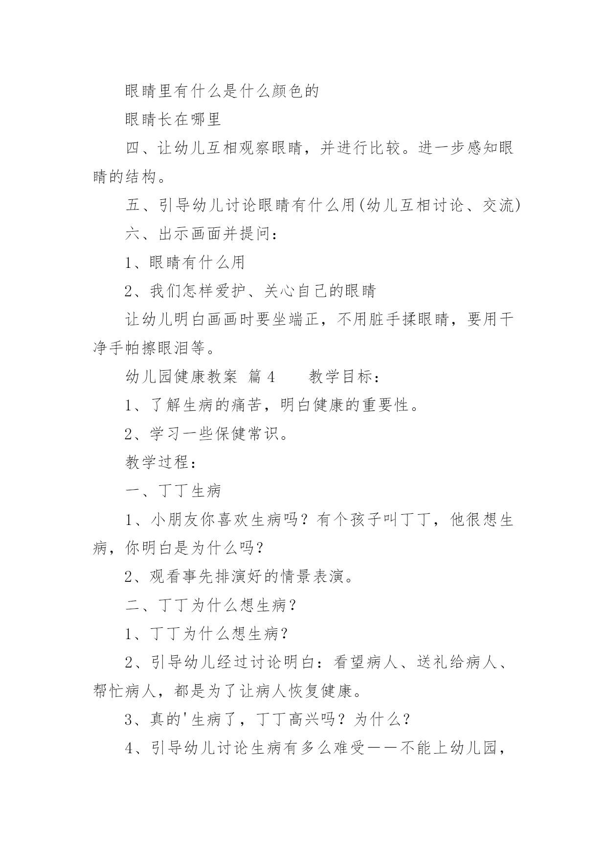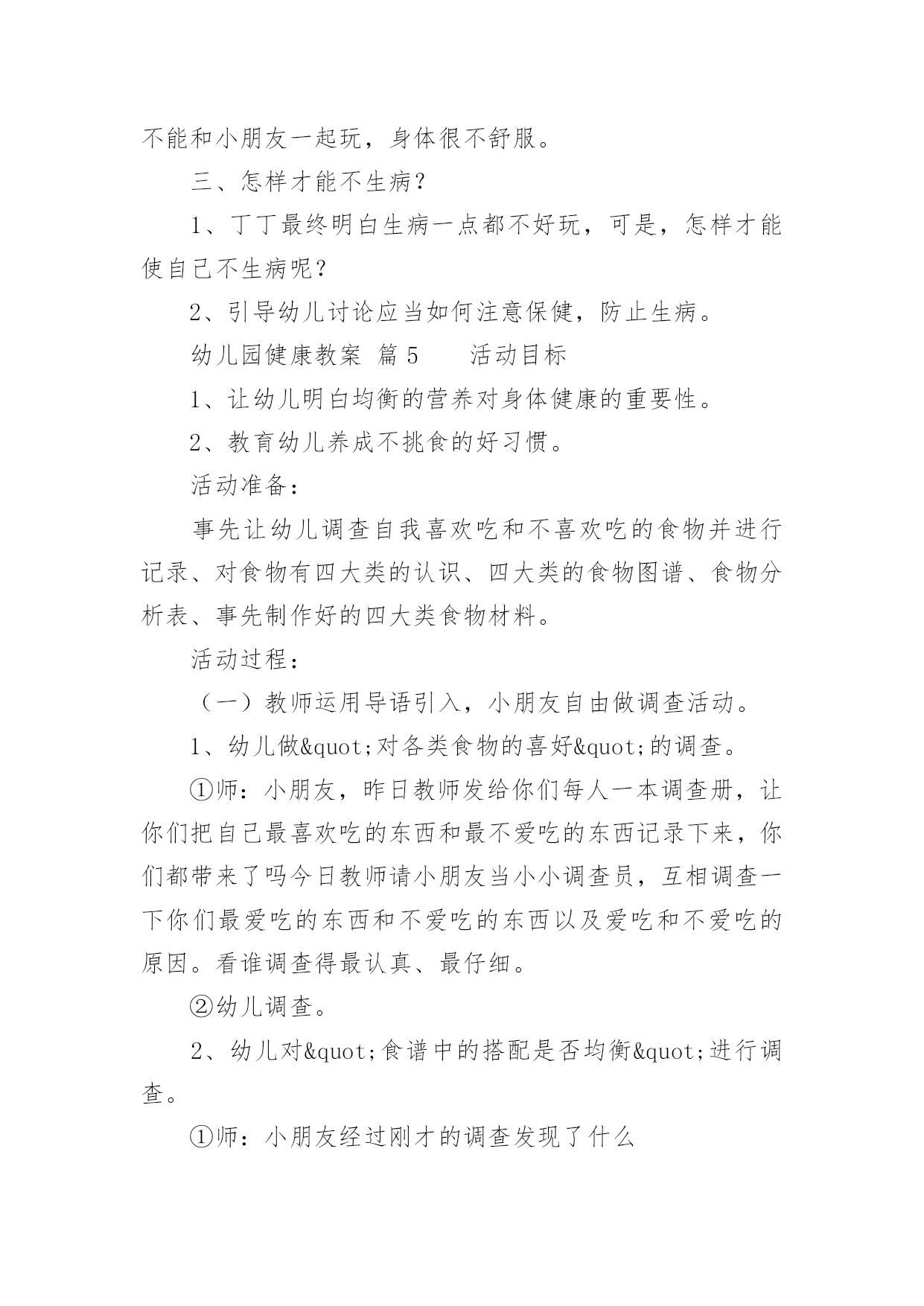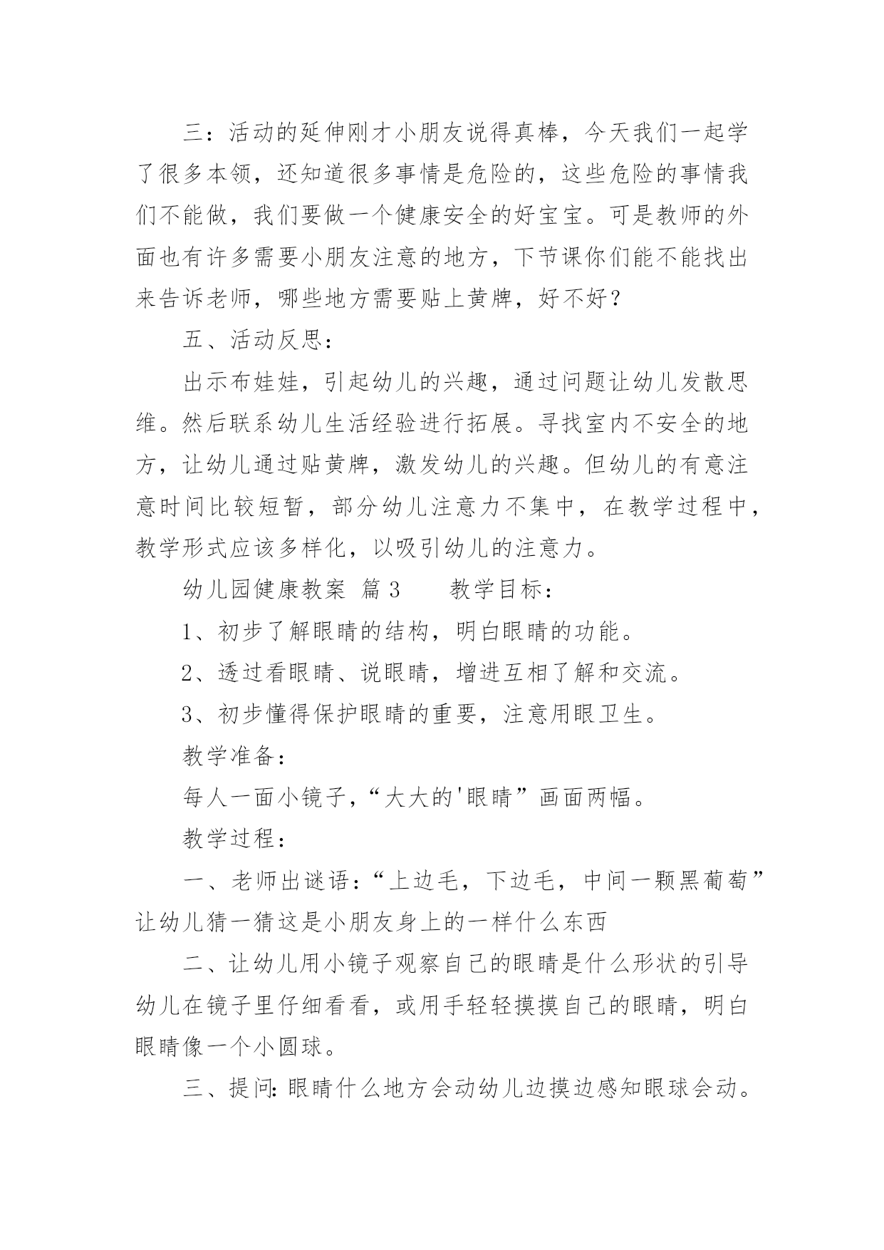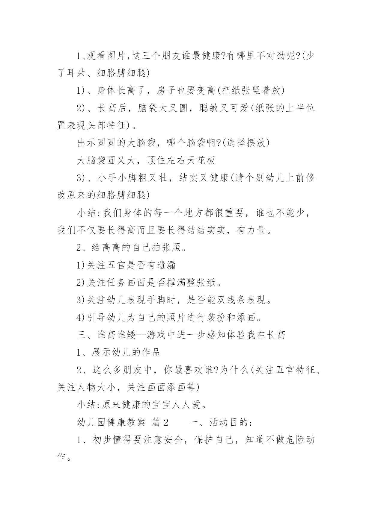 幼儿园健康教案【精】幼儿园健康教案22篇作为一名教学工作者,总不可避免地需要编写教案,编写教案助于积累教学经验,不断提高教学质量。快来参考教案是怎么写的吧!下面是小编收集整理的幼儿园健康教案,希望对大家有所帮助。幼儿园健康教案篇1活动目标:1.尝试按照纸的大小比例人物长高的基本特征,身体各部位不遗漏。2.萌发快快长高的愿望,懂得保护自己的身体,体验自己健康成长的快乐。活动准备:幼儿绘画纸、勾线笔、图片活动过程:一、我在长高--分享与讨论,感知自己身体成长的变化1、刚从妈妈肚子里生出来的`时候,我是这样的;小班了我开始来幼儿园了,我是这样的;现在,我是中班的哥哥姐姐了,我又是这样的。(出示三个阶段的照片)2、随着我们一天一天的长大,我们有哪些变化呢?小结:我们一天天的长大,身体也在发生变化,一天天的长高了。二、我要长高--通过观察比较,感受绘画人物的比例和特征。1、观看图片,这三个朋友谁最健康?有哪里不对劲呢?(少了耳朵、细胳膊细腿)1)、身体长高了,房子也要变高(把纸张竖着放)2)、长高后,脑袋大又圆,聪敏又可爱(纸张的上半位置表现头部特征)。出示圆圆的大脑袋,哪个脑袋啊?(选择摆放)大脑袋圆又大,顶住左右天花板3)、小手小脚粗又壮,结实又健康(请个别幼儿上前修改原来的细胳膊细腿)小结:我们身体的每一个地方都很重要,谁也不能少,我们不仅要长得高而且要长得结结实实,有力量。2、给高高的自己拍张照。1)关注五官是否有遗漏2)关注任务画面是否撑满整张纸。3)关注幼儿表现手脚时,是否能双线条表现。4)引导幼儿为自己的照片进行装扮和添画。三、谁高谁矮--游戏中进一步感知体验我在长高1、展示幼儿的作品2、这么多朋友中,你最喜欢谁?为什么(关注五官特征、关注人物大小,关注画面添画等)小结:原来健康的宝宝人人爱。幼儿园健康教案篇2一、活动目的:1、初步懂得要注意安全,保护自己,知道不做危险动作。2、学习履行一些简单的安全行为。二、活动重难点:学习履行一些简单的安全行为。三、活动准备出示布娃娃,引起幼儿的兴趣,通过问题让幼儿发散思维。然后联系幼儿生活经验进行拓展。寻找室内不安全的地方,让幼儿通过贴黄牌,激发幼儿的兴趣。但幼儿的有意注意时间比较短暂,部分幼儿注意力不集中,在教学过程中,教学形式应该多样化,以吸引幼儿的注意力。:黄色标记、玩具小象。四、活动过程:一、情景导入,引起幼儿对活动的兴趣1、出示布娃娃,引起幼儿的兴趣:今天老师请来了一位小客人,小象它怎么了,怎么身上有那么多的创可贴?哪里受伤了?,提问让幼儿发散思维,着让幼儿猜测2、我们来听听到底发生了什么事?二、用一个故事导入在学校什么东西是危险,并联系幼儿生活经验进行拓展。1、听故事,理解故事内容。2、请幼儿详细描述自己受伤的.过程。三、幼儿仔细观察--发现问题--解决问题1、让幼儿仔细观察教室里,有没有不安全的地方师:看看我们的教室里有哪些东西,小朋友要特别注意,不能随意乱碰2、发现了问题之后,让幼儿将这些地方贴上黄色标记,已警示小朋友要注意。三:活动的延伸刚才小朋友说得真棒,今天我们一起学了很多本领,还知道很多事情是危险的,这些危险的事情我们不能做,我们要做一个健康安全的好宝宝。可是教师的外面也有许多需要小朋友注意的地方,下节课你们能不能找出来告诉老师,哪些地方需要贴上黄牌,好不好?五、活动反思:出示布娃娃,引起幼儿的兴趣,通过问题让幼儿发散思维。然后联系幼儿生活经验进行拓展。寻找室内不安全的地方,让幼儿通过贴黄牌,激发幼儿的兴趣。但幼儿的有意注意时间比较短暂,部分幼儿注意力不集中,在教学过程中,教学形式应该多样化,以吸引幼儿的注意力。幼儿园健康教案篇3教学目标:1、初步了解眼睛的结构,明白眼睛的功能。2、透过看眼睛、说眼睛,增进互相了解和交流。3、初步懂得保护眼睛的重要,注意用眼卫生。教学准备:每人一面小镜子,“大大的'眼睛”画面两幅。教学过程:一、老师出谜语:“上边毛,下边毛,中间一颗黑葡萄”让幼儿猜一猜这是小朋友身上的一样什么东西二、让幼儿用小镜子观察自己的眼睛是什么形状的引导幼儿在镜子里仔细看看,或用手轻轻摸摸自己的眼睛,明白眼睛像一个小圆球。三、提问:眼睛什么地方会动幼儿边摸边感知眼球会动。眼睛里有什么是什么颜色的眼睛长在哪里四、让幼儿互相观察眼睛,并进行比较。进一步感知眼睛的结构。五、引导幼儿讨论眼睛有什么用(幼儿互相讨论、交流)六、出示画面并提问:1、眼睛有什么用2、我们怎样爱护、关心自己的眼睛让幼儿明白画画时要坐端正,不用脏手揉眼睛,要用干净手帕擦眼泪等。幼儿园健康教案篇4教学目标:1、了解生病的痛苦,明白健康的重要性。2、学习一些保健常识。教学过程:一、丁丁生病1、小朋友你喜欢生病吗?有个孩子叫丁丁,他很想生病,你明白是为什么吗?2、观看事先排演好的情景表演。二