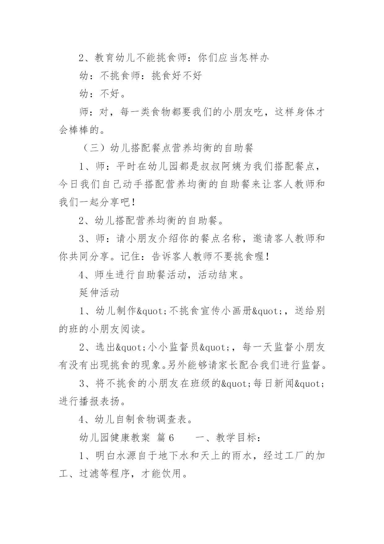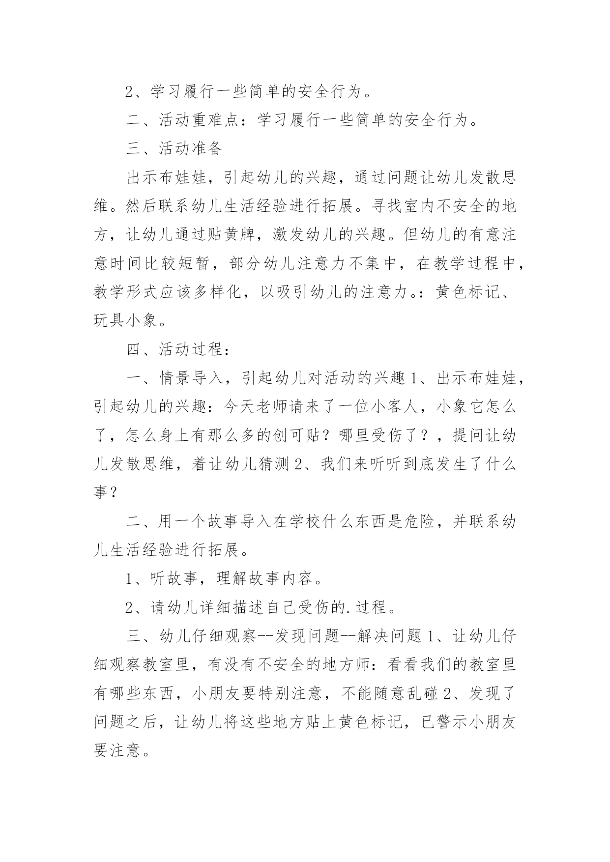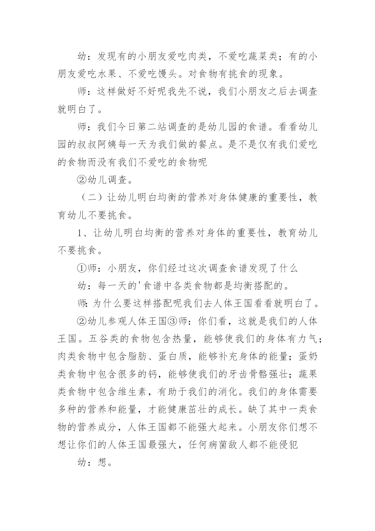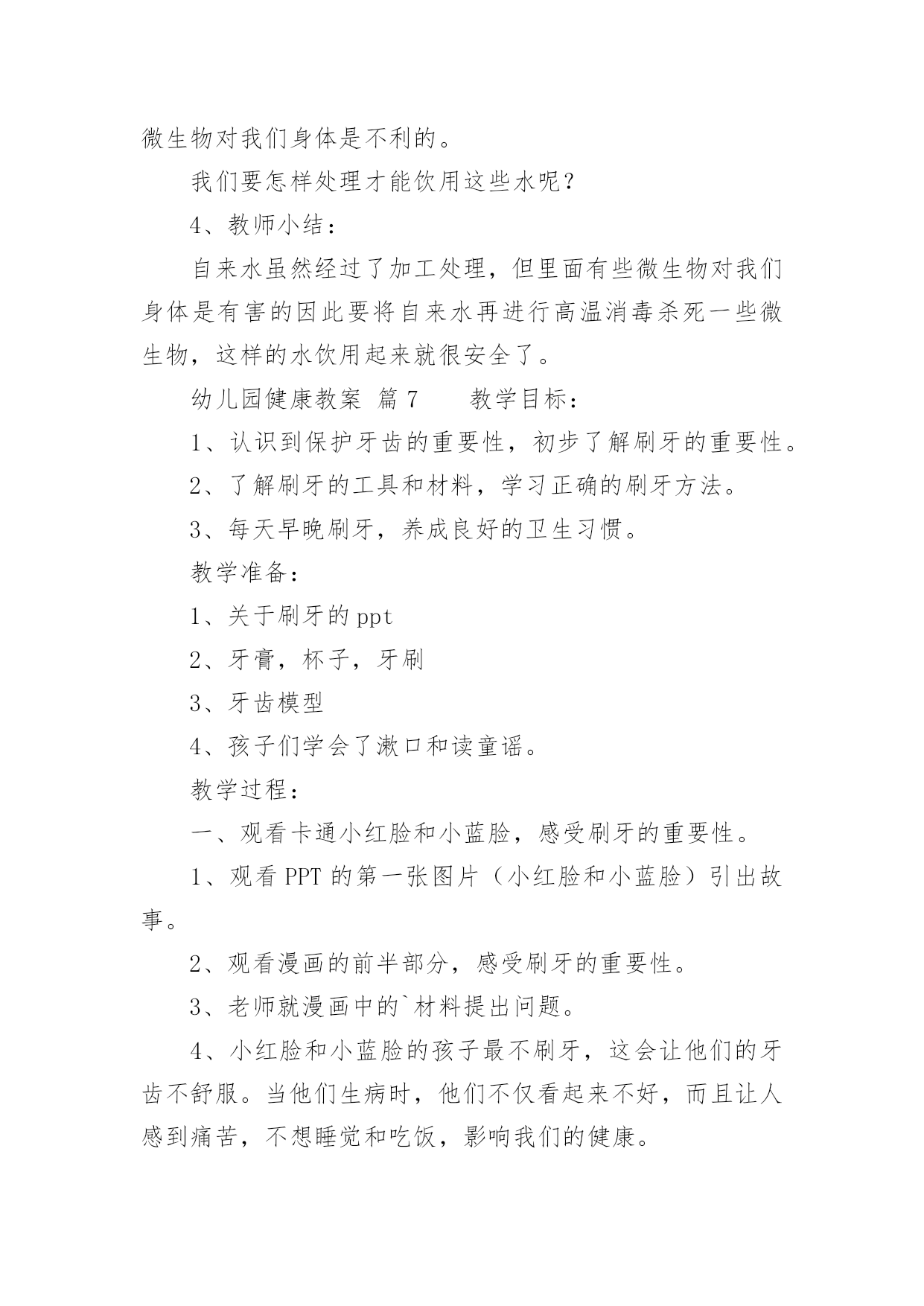 幼儿园健康教案【精】幼儿园健康教案22篇作为一名教学工作者,总不可避免地需要编写教案,编写教案助于积累教学经验,不断提高教学质量。快来参考教案是怎么写的吧!下面是小编收集整理的幼儿园健康教案,希望对大家有所帮助。幼儿园健康教案篇1活动目标:1.尝试按照纸的大小比例人物长高的基本特征,身体各部位不遗漏。2.萌发快快长高的愿望,懂得保护自己的身体,体验自己健康成长的快乐。活动准备:幼儿绘画纸、勾线笔、图片活动过程:一、我在长高--分享与讨论,感知自己身体成长的变化1、刚从妈妈肚子里生出来的`时候,我是这样的;小班了我开始来幼儿园了,我是这样的;现在,我是中班的哥哥姐姐了,我又是这样的。(出示三个阶段的照片)2、随着我们一天一天的长大,我们有哪些变化呢?小结:我们一天天的长大,身体也在发生变化,一天天的长高了。二、我要长高--通过观察比较,感受绘画人物的比例和特征。1、观看图片,这三个朋友谁最健康?有哪里不对劲呢?(少了耳朵、细胳膊细腿)1)、身体长高了,房子也要变高(把纸张竖着放)2)、长高后,脑袋大又圆,聪敏又可爱(纸张的上半位置表现头部特征)。出示圆圆的大脑袋,哪个脑袋啊?(选择摆放)大脑袋圆又大,顶住左右天花板3)、小手小脚粗又壮,结实又健康(请个别幼儿上前修改原来的细胳膊细腿)小结:我们身体的每一个地方都很重要,谁也不能少,我们不仅要长得高而且要长得结结实实,有力量。2、给高高的自己拍张照。1)关注五官是否有遗漏2)关注任务画面是否撑满整张纸。3)关注幼儿表现手脚时,是否能双线条表现。4)引导幼儿为自己的照片进行装扮和添画。三、谁高谁矮--游戏中进一步感知体验我在长高1、展示幼儿的作品2、这么多朋友中,你最喜欢谁?为什么(关注五官特征、关注人物大小,关注画面添画等)小结:原来健康的宝宝人人爱。幼儿园健康教案篇2一、活动目的:1、初步懂得要注意安全,保护自己,知道不做危险动作。2、学习履行一些简单的安全行为。二、活动重难点:学习履行一些简单的安全行为。三、活动准备出示布娃娃,引起幼儿的兴趣,通过问题让幼儿发散思维。然后联系幼儿生活经验进行拓展。寻找室内不安全的地方,让幼儿通过贴黄牌,激发幼儿的兴趣。但幼儿的有意注意时间比较短暂,部分幼儿注意力不集中,在教学过程中,教学形式应该多样化,以吸引幼儿的注意力。:黄色标记、玩具小象。四、活动过程:一、情景导入,引起幼儿对活动的兴趣1、出示布娃娃,引起幼儿的兴趣:今天老师请来了一位小客人,小象它怎么了,怎么身上有那么多的创可贴?哪里受伤了?,提问让幼儿发散思维,着让幼儿猜测2、我们来听听到底发生了什么事?二、用一个故事导入在学校什么东西是危险,并联系幼儿生活经验进行拓展。1、听故事,理解故事内容。2、请幼儿详细描述自己受伤的.过程。三、幼儿仔细观察--发现问题--解决问题1、让幼儿仔细观察教室里,有没有不安全的地方师:看看我们的教室里有哪些东西,小朋友要特别注意,不能随意乱碰2、发现了问题之后,让幼儿将这些地方贴上黄色标记,已警示小朋友要注意。三:活动的延伸刚才小朋友说得真棒,今天我们一起学了很多本领,还知道很多事情是危险的,这些危险的事情我们不能做,我们要做一个健康安全的好宝宝。可是教师的外面也有许多需要小朋友注意的地方,下节课你们能不能找出来告诉老师,哪些地方需要贴上黄牌,好不好?五、活动反思:出示布娃娃,引起幼儿的兴趣,通过问题让幼儿发散思维。然后联系幼儿生活经验进行拓展。寻找室内不安全的地方,让幼儿通过贴黄牌,激发幼儿的兴趣。但幼儿的有意注意时间比较短暂,部分幼儿注意力不集中,在教学过程中,教学形式应该多样化,以吸引幼儿的注意力。幼儿园健康教案篇3教学目标:1、初步了解眼睛的结构,明白眼睛的功能。2、透过看眼睛、说眼睛,增进互相了解和交流。3、初步懂得保护眼睛的重要,注意用眼卫生。教学准备:每人一面小镜子,“大大的'眼睛”画面两幅。教学过程:一、老师出谜语:“上边毛,下边毛,中间一颗黑葡萄”让幼儿猜一猜这是小朋友身上的一样什么东西二、让幼儿用小镜子观察自己的眼睛是什么形状的引导幼儿在镜子里仔细看看,或用手轻轻摸摸自己的眼睛,明白眼睛像一个小圆球。三、提问:眼睛什么地方会动幼儿边摸边感知眼球会动。眼睛里有什么是什么颜色的眼睛长在哪里四、让幼儿互相观察眼睛,并进行比较。进一步感知眼睛的结构。五、引导幼儿讨论眼睛有什么用(幼儿互相讨论、交流)六、出示画面并提问:1、眼睛有什么用2、我们怎样爱护、关心自己的眼睛让幼儿明白画画时要坐端正,不用脏手揉眼睛,要用干净手帕擦眼泪等。幼儿园健康教案篇4教学目标:1、了解生病的痛苦,明白健康的重要性。2、学习一些保健常识。教学过程:一、丁丁生病1、小朋友你喜欢生病吗?有个孩子叫丁丁,他很想生病,你明白是为什么吗?2、观看事先排演好的情景表演。二