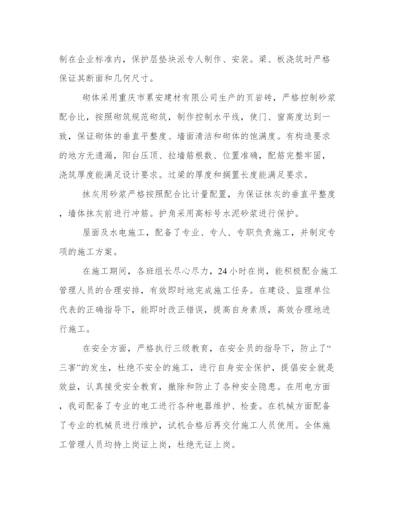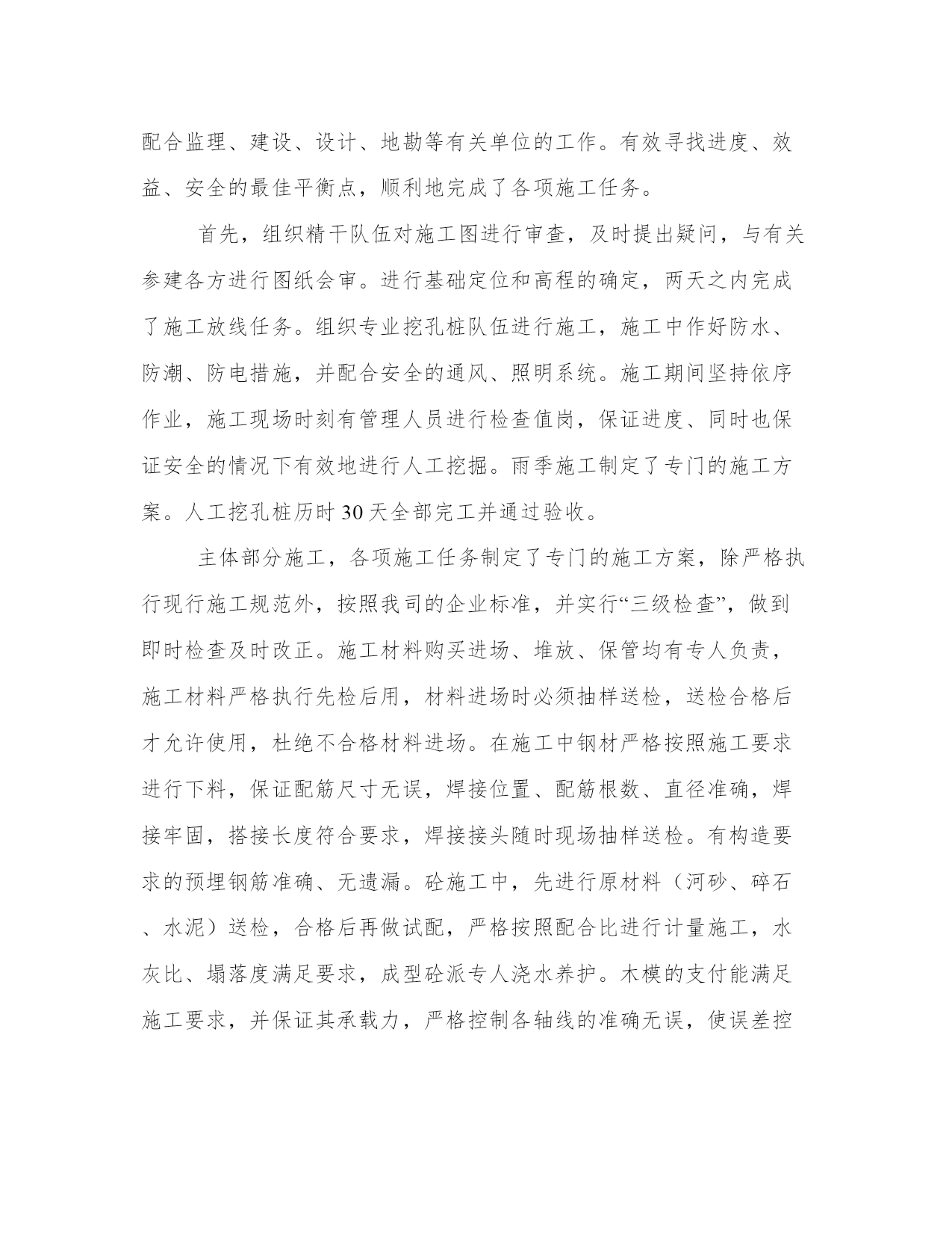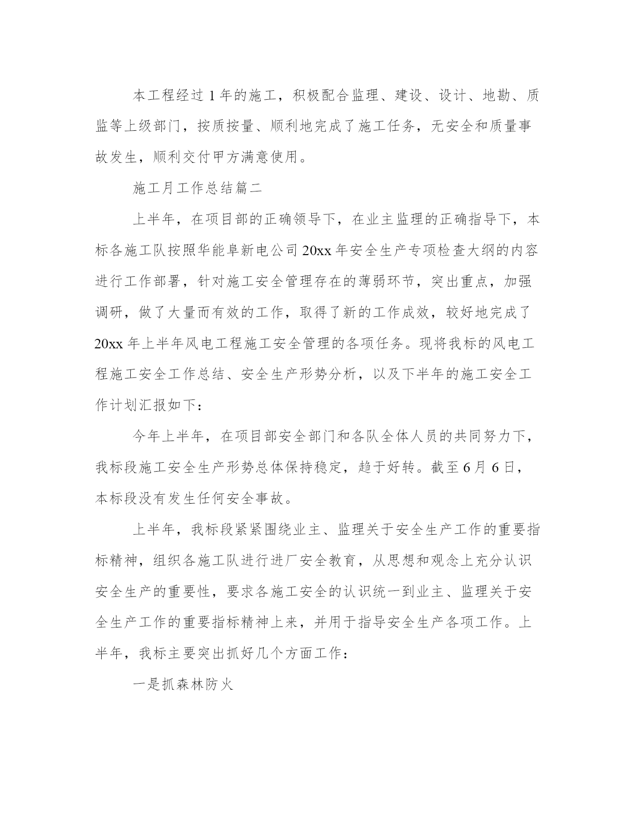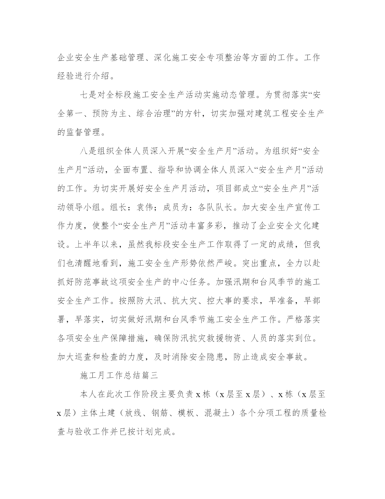 最新施工月工作总结施工工作总结(汇总16篇)总结不仅仅是总结成绩,更重要的是为了分析经验,发现做好工作的规律,也可以找出工作失误的教训。这些经验教训是非常宝贵的,对工作有很好的借鉴与指导作用,在今后工作中可以改进提高,趋利避害,避免失误。总结怎么写才能发挥它最大的作用呢?下面是小编整理的个人今后的总结范文,欢迎阅读分享,希望对大家有所帮助。施工月工作总结篇一我司承建的海怡天城工程,位于涪陵区稻香居委四组。海怡天城工程,位于涪陵区稻香居委四组。工程共分为a、b、c栋。总建筑面积33655.24㎡。建筑层数a栋24层、b栋为25层、c栋为4层,建筑高度a栋为76.2米、b栋为79.8米、c区为17.7米,结构形式为框架剪力墙结构,抗震烈度为6度,场地土类别为2类,抗震等级为二级,安全等级为i级,建筑物设计合理使用年限为xx年。该工程能满意地交给甲方使用,现对工程工作总结如下:能及时组织施工管理人员和精干的施工队伍,在项目经理雷玉全和技术负责人丁学军、周贵权的带领下,全体工作人员在职在岗、能胜任此项工程的管理工作,顺利完成各项施工任务,我项目部全体员工坚持“安全在心中,质量在手中”的施工理念,严格按照建筑工程有关规范,积极配合监理、建设、设计、地勘等有关单位的工作。有效寻找进度、效益、安全的最佳平衡点,顺利地完成了各项施工任务。首先,组织精干队伍对施工图进行审查,及时提出疑问,与有关参建各方进行图纸会审。进行基础定位和高程的确定,两天之内完成了施工放线任务。组织专业挖孔桩队伍进行施工,施工中作好防水、防潮、防电措施,并配合安全的通风、照明系统。施工期间坚持依序作业,施工现场时刻有管理人员进行检查值岗,保证进度、同时也保证安全的情况下有效地进行人工挖掘。雨季施工制定了专门的施工方案。人工挖孔桩历时30天全部完工并通过验收。主体部分施工,各项施工任务制定了专门的施工方案,除严格执行现行施工规范外,按照我司的企业标准,并实行“三级检查”,做到即时检查及时改正。施工材料购买进场、堆放、保管均有专人负责,施工材料严格执行先检后用,材料进场时必须抽样送检,送检合格后才允许使用,杜绝不合格材料进场。在施工中钢材严格按照施工要求进行下料,保证配筋尺寸无误,焊接位置、配筋根数、直径准确,焊接牢固,搭接长度符合要求,焊接接头随时现场抽样送检。有构造要求的预埋钢筋准确、无遗漏。砼施工中,先进行原材料(河砂、碎石、水泥)送检,合格后再做试配,严格按照配合比进行计量施工,水灰比、塌落度满足要求,成型砼派专人浇水养护。木模的支付能满足施工要求,并保证其承载力,严格控制各轴线的准确无误,使误差控制在企业标准内,保护层垫块派专人制作、安装。梁、板浇筑时严格保证其断面和几何尺寸。砌体采用重庆市累安建材有限公司生产的页岩砖,严格控制砂浆配合比,按照砌筑规范砌筑,制作控制水平线,使门、窗高度达到一致,保证砌体的垂直平整度、墙面清洁和砌体的饱满度。有构造要求的地方无遗漏,阳台压顶、拉墙筋根数、位置准确,配筋完整牢固,浇筑厚度能满足设计要求。过梁的厚度和搁置长度能满足要求。抹灰用砂浆严格按照配合比计量配置,为保证抹灰的垂直平整度,墙体抹灰前进行冲筋。护角采用高标号水泥砂浆进行保护。屋面及水电施工,配备了专业、专人、专职负责施工,并制定专项的施工方案。在施工期间,各班组长尽心尽力,24小时在岗,能积极配合施工管理人员的合理安排,有效即时地完成施工任务。在建设、监理单位代表的正确指导下,能即时改正错误,提高自身素质,高效合理地进行施工。在安全方面,严格执行三级教育,在安全员的指导下,防止了“三害”的发生,杜绝不安全的施工,进行自身安全保护,提倡安全就是效益,认真接受安全教育,撤除和防止了各种安全隐患。在用电方面,我司配备了专业的电工进行各种电器维护、检查。在机械方面配备了专业的机械员进行维护,试机合格后再交付施工人员使用。全体施工管理人员均持上岗证上岗,杜绝无证上岗。本工程经过1年的施工,积极配合监理、建设、设计、地勘、质监等上级部门,按质按量、顺利地完成了施工任务,无安全和质量事故发生,顺利交付甲方满意使用。施工月工作总结篇二上半年,在项目部的正确领导下,在业主监理的正确指导下,本标各施工队按照华能阜新电公司20xx年安全生产专项检查大纲的内容进行工作部署,针对施工安全管理存在的薄弱环节,突出重点,加强调研,做了大量而有效的工作,取得了新的工作成效,较好地完成了20xx年上半年风电工程施工安全管理的各项任务。现将我标的风电工程施工安全工作总结、安全生产形势分析,以及下半年的施工安全工作计划汇报如下:今年上半年,在项目部安全部门和各队全体人员的共同努力下,我标段施工安全生产形势总体保持稳定,趋于好转。截至6月6日,本标段没有发生任何安全事故。上