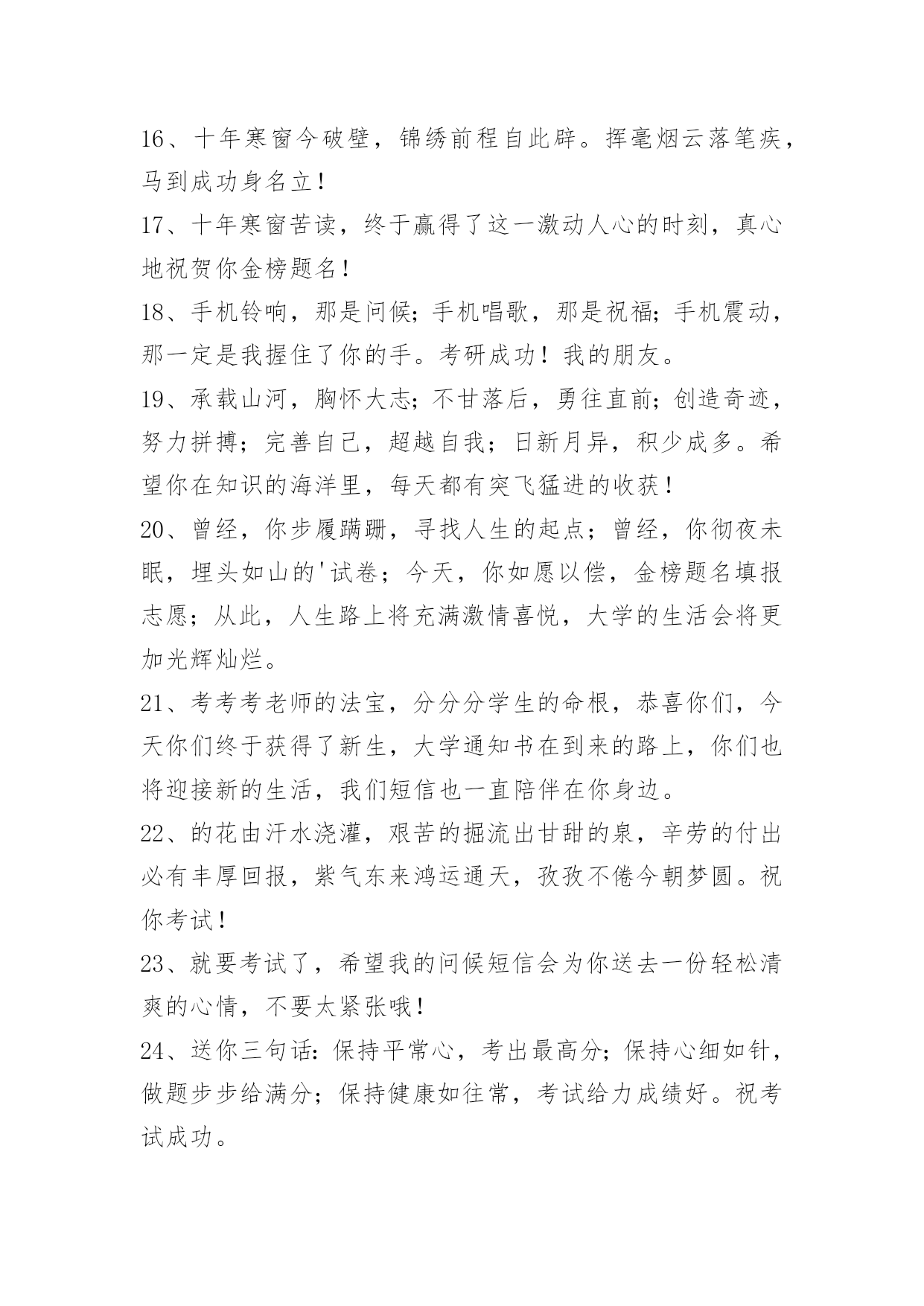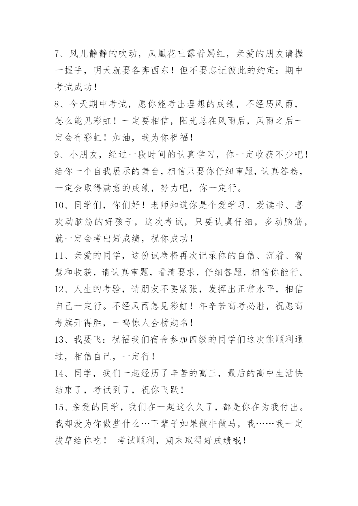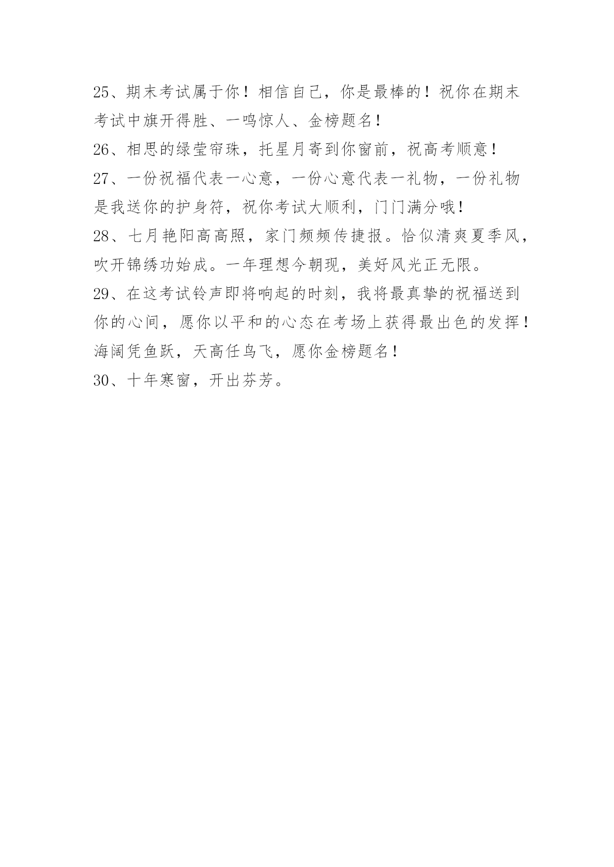 经典考试顺利祝福文案经典考试顺利祝福文案(通用30句)相信自己,我在远方为你送去最真挚的祝福,付出就会有收获!放松心情,迎接挑战,相信你,你一定是最出色的!以下是小编帮大家整理的考试顺利祝福文案,希望能帮助到大家。1、试纸浸墨香,金笔下千言。思虑心平定,谨慎落笔闲。且喜平常度,切忌神慌乱。畅游题海后,金榜题君名。考试在即,祝你成功。2、考试前总是处于紧张状态,这个时候,一条短信,一句祝福,一个玩笑可能会让绷紧的神经松弛下来,可能会有意想不到的效果哦。贝蕾丝祝福所有期末考试、中考还有考研的朋友,你们辛苦了!希望你们考上自己心目中的学校!3、风儿静静的吹动,凤凰花吐露着嫣红,亲爱的朋友请握一握手,明天就要各奔西东!但不要忘记彼此的约定:期末考试成功!4、愿你今年考上心中的大学。考试顺利!5、考试了,希望我的问候短信会为你送去一份轻松清爽的心情,不要太紧张哦!不然可会把答案忘掉的!我在这里支持着你,鼓励着你,为你祝福!6、放下包袱开动脑筋,勤于思考好好复习,祝你在专八考试中取得好成绩!7、风儿静静的吹动,凤凰花吐露着嫣红,亲爱的朋友请握一握手,明天就要各奔西东!但不要忘记彼此的约定:期中考试成功!8、今天期中考试,愿你能考出理想的成绩,不经历风雨,怎么能见彩虹!一定要相信,阳光总在风雨后,风雨之后一定会有彩虹!加油,我为你祝福!9、小朋友,经过一段时间的认真学习,你一定收获不少吧!给你一个自我展示的舞台,相信只要你仔细审题,认真答卷,一定会取得满意的成绩,努力吧,你一定行。10、同学们,你们好!老师知道你是个爱学习、爱读书、喜欢动脑筋的好孩子,这次考试,只要认真仔细,多动脑筋,就一定会考出好成绩,祝你成功!11、亲爱的同学,这份试卷将再次记录你的自信、沉着、智慧和收获,请认真审题,看清要求,仔细答题,相信你能行。12、人生的考验,请朋友不要紧张,发挥出正常水平,相信自己一定行。不经风雨怎见彩虹!年辛苦高考必胜,祝愿高考旗开得胜,一鸣惊人金榜题名!13、我要飞:祝福我们宿舍参加四级的同学们这次能顺利通过,相信自己,一定行!14、同学,我们一起经历了辛苦的高三,最后的高中生活快结束了,考试到了,祝你飞跃!15、亲爱的同学,我们在一起这么久了,都是你在为我付出。我却没为你做些什么…下辈子如果做牛做马,我……我一定拔草给你吃!考试顺利,期末取得好成绩哦!16、十年寒窗今破壁,锦绣前程自此辟。挥毫烟云落笔疾,马到成功身名立!17、十年寒窗苦读,终于赢得了这一激动人心的时刻,真心地祝贺你金榜题名!18、手机铃响,那是问候;手机唱歌,那是祝福;手机震动,那一定是我握住了你的手。考研成功!我的朋友。19、承载山河,胸怀大志;不甘落后,勇往直前;创造奇迹,努力拼搏;完善自己,超越自我;日新月异,积少成多。希望你在知识的海洋里,每天都有突飞猛进的收获!20、曾经,你步履蹒跚,寻找人生的起点;曾经,你彻夜未眠,埋头如山的'试卷;今天,你如愿以偿,金榜题名填报志愿;从此,人生路上将充满激情喜悦,大学的生活会将更加光辉灿烂。21、考考考老师的法宝,分分分学生的命根,恭喜你们,今天你们终于获得了新生,大学通知书在到来的路上,你们也将迎接新的生活,我们短信也一直陪伴在你身边。22、的花由汗水浇灌,艰苦的掘流出甘甜的泉,辛劳的付出必有丰厚回报,紫气东来鸿运通天,孜孜不倦今朝梦圆。祝你考试!23、就要考试了,希望我的问候短信会为你送去一份轻松清爽的心情,不要太紧张哦!24、送你三句话:保持平常心,考出最高分;保持心细如针,做题步步给满分;保持健康如往常,考试给力成绩好。祝考试成功。25、期末考试属于你!相信自己,你是最棒的!祝你在期末考试中旗开得胜、一鸣惊人、金榜题名!26、相思的绿莹帘珠,托星月寄到你窗前,祝高考顺意!27、一份祝福代表一心意,一份心意代表一礼物,一份礼物是我送你的护身符,祝你考试大顺利,门门满分哦!28、七月艳阳高高照,家门频频传捷报。恰似清爽夏季风,吹开锦绣功始成。一年理想今朝现,美好风光正无限。29、在这考试铃声即将响起的时刻,我将最真挚的祝福送到你的心间,愿你以平和的心态在考场上获得最出色的发挥!海阔凭鱼跃,天高任鸟飞,愿你金榜题名!30、十年寒窗,开出芬芳。