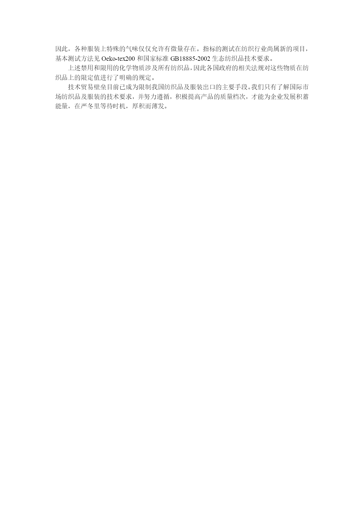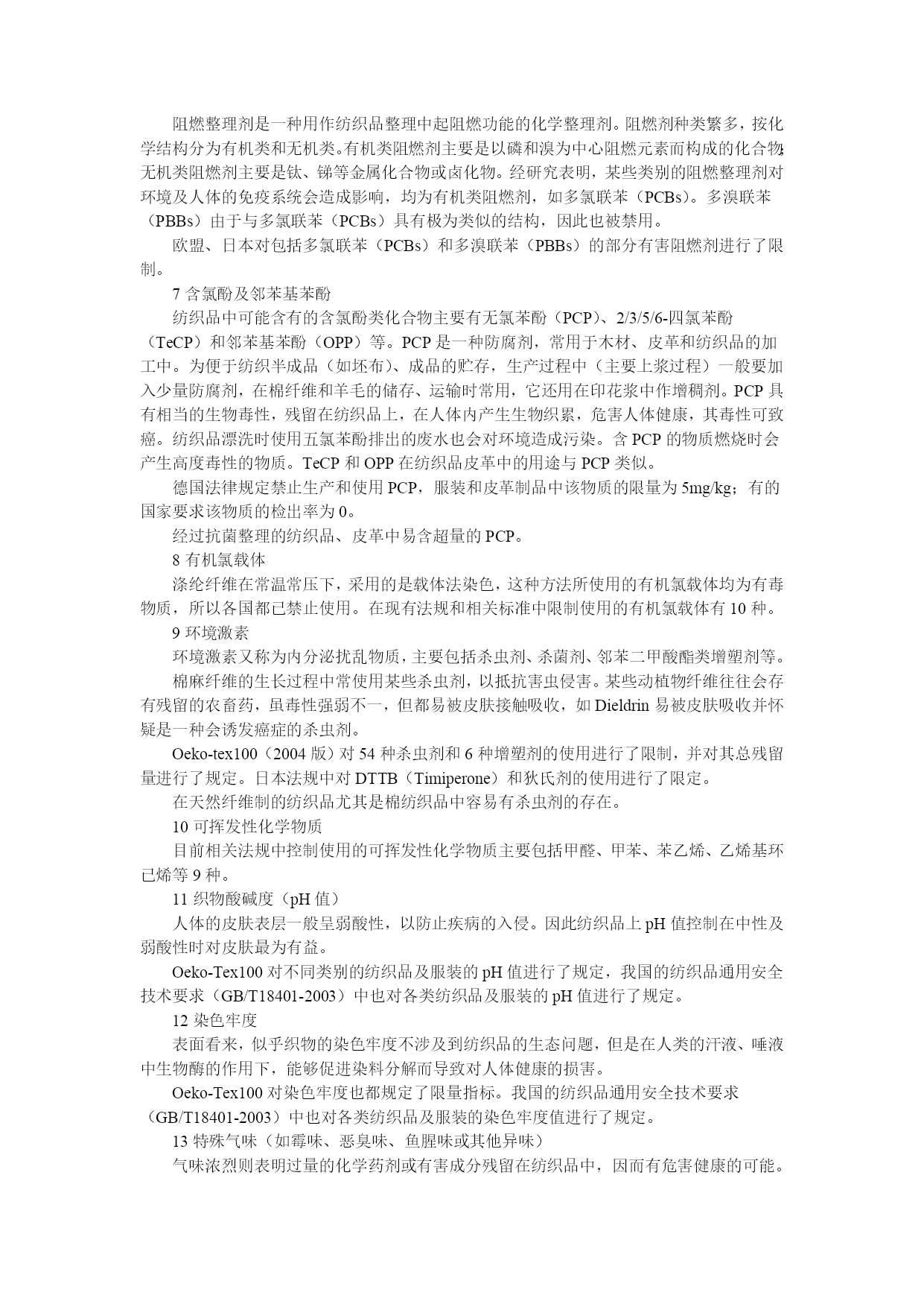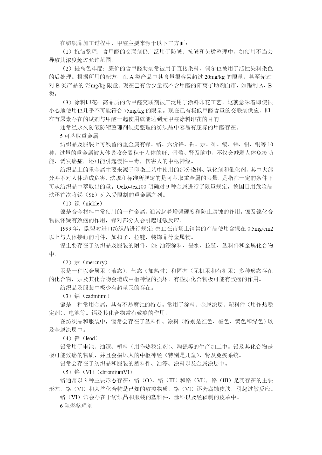 纺织品和服装中有毒有害物质及其来源纺织品中有害物质主要来源于两方面:一是纺织原料在种植过程中,为控制病虫害使用的杀虫剂、化肥、除草剂等,这些有毒有害物质残留在纺织品服装上,会引起皮肤过敏、呼吸道疾病或其他中毒反应,甚至诱发癌症;二是在纺织品加工制造和后期的印染、后整理过程中,使用的各种染料、氧化剂、催化剂、阻燃剂、增白荧光剂、树脂整理剂等多种化学物质,这些有害物质残留在纺织品上,使纺织品及服装再度蒙受污染。自1994年7月15日德国政府颁布禁用偶氮染料法令以来,到目前为止,在纺织品和化学品领域中禁用和限制的化学物质有13类约300个。下面对这13类化学物质作一个基本介绍。除用1-EP6/0.311禁用偶氮染料偶氮染料是指含一个或多个偶氮基(-N=N-)的芳香族化合物。偶氮染料是染料中非常重要的结构,属于该类结构的染料有几千种。经研究表明某些芳香胺对人体或动物具有致癌的作用或怀疑有致癌作用,因此各国的法规仅对会分解产生致癌芳香胺的偶氮染料进行禁止。德国最先颁布禁止生产和使用以联苯胺为代表的20种致癌芳香胺及可分解出这些芳香胺的染料的法令,规定进口商不得进口用这些染料加工的与人体接触的纺织品。随后,这一法令也被欧盟其它国家所使用。按照德国Bayer公司在1994年提出的禁用染料品种以及1999年德国VCI(德国化学工业协会)提出的禁用染料数据统计有146个,规定在纺织品上的致癌芳香胺的限值不超过30mg/kg,在染料中的致癌芳香胺的限定值不超过150mg/kg。禁用染料在经印染的纺织品或皮革制品中都有可能存在。2致敏性分散染料致敏染料对皮肤有过敏性和刺激性,部分分散染料被认为易起过敏反应,如果该类染料长时间接触皮肤后,会对人体产生危害。因此在一些国家的技术法规和标准中对这些染料进行了限制和禁用。目前受控的致敏性染料有20种,Oeko-tex对这20种染料的使用进行了限制,这些染料均为分散染料。德国的《食品与消费品法》中对被证明有过敏反应的6种分散染料使用进行了限制。分散染料主要用于合成纤维聚酯及其混纺产品的印染,有时也用于其他合成纤维如醋酯、聚酰胺的印染。3致癌染料致癌染料是指未经还原等化学变化即能诱发人体癌变的染料,目前已认定可致癌的染料有9种,Oeko-tex对这9种染料的使用进行了限制,其中直接染料3种,分散染料3种,碱性染料2种,酸性染料1种。4游离甲醛甲醛是一种易挥发性化合物,通常用于纺织品防皱和防缩整理剂的合成试剂,生产上还用于固色剂、防水剂、柔软剂、粘合剂等中,涉及面非常广。甲醛还是一种刺激性化合物,易引起皮肤过敏反应和人体呼吸道等疾病。少量的甲醛会对人的眼晴、皮肤和粘膜产生刺激作用,过量的甲醛会使粘膜和呼吸道严重发炎,也可导致皮炎。近期的研究还表明在蛋白质生物细胞中,已发现与甲醛反应的N-羟甲基化合物的代谢物呈现突变性,怀疑具有致癌性。日本等国的服装环保标准都对甲醛做出了明确限制。日本规定:进口幼儿服装(I类产品)不得含有甲醛,进口成人内衣、睡衣、袜子(II类产品)的甲醛含量不得超过75mg/kg,成人外衣甲醛含量不得超过300mg/kg。我国的国家纺织产品基本安全技术规范(GB/T18401-2003)中也规定:婴幼儿用品(A类)的甲醛含量不得超过20mg/kg,直接接触皮肤的产品(B类)的甲醛含量不得超过75mg/kg,非直接接触皮肤的产品(C类)的甲醛含量不得超过300mg/kg。在纺织品加工过程中,甲醛主要来源于以下三方面:(1)抗皱整理:含甲醛的交联剂仍广泛用于防皱、抗皱和免烫整理中,如使用不当会导致其浓度超过允许范围。(2)提高色牢度:廉价的含甲醛助剂常被用于直接染料,偶尔也被用于活性染料染色的后处理。根据所用的配方,在A类产品中其含量很容易超过20mg/kg的限量,甚至超过对B类产品的75mg/kg限量。现在已有含少量或不含甲醛的阳离子助剂面市,如锡利A、B类。(3)涂料印花:高品质的含甲醛交联剂被广泛用于涂料印花工艺,这就意味着即使很小心地使用也几乎不可能符合75mg/kg的限量。现在已有极低甲醛含量的交联剂供应,即在有尿素存在的试剂与甲醛一起使用就能达到无甲醛涂料印花的目的。通常经永久防皱防缩整理剂硬挺整理的纺织品中容易有超标的甲醛存在。5可萃取重金属纺织品及服装上可残留的重金属有镍、铬、六价铬、钴、汞、砷、镉、锑、铅、铜等10种。过量的重金属被人体吸收会累积于人体的肝、骨骼、肾及脑中,不仅会减弱人体免疫功能、诱发癌症,还可能引起慢性中毒,伤害人的中枢神经。纺织品上的重金属主要来源于印染工艺中使用的部分染料、氧化剂和催化剂,其中大部分并不对人体造成危害,法规和标准所规定的是可萃取重金属的限量,是指在一定的条件下可从纺织品中萃取出的量。Oeko-tex100明确对9种金属进行了限量规定,德国日用危