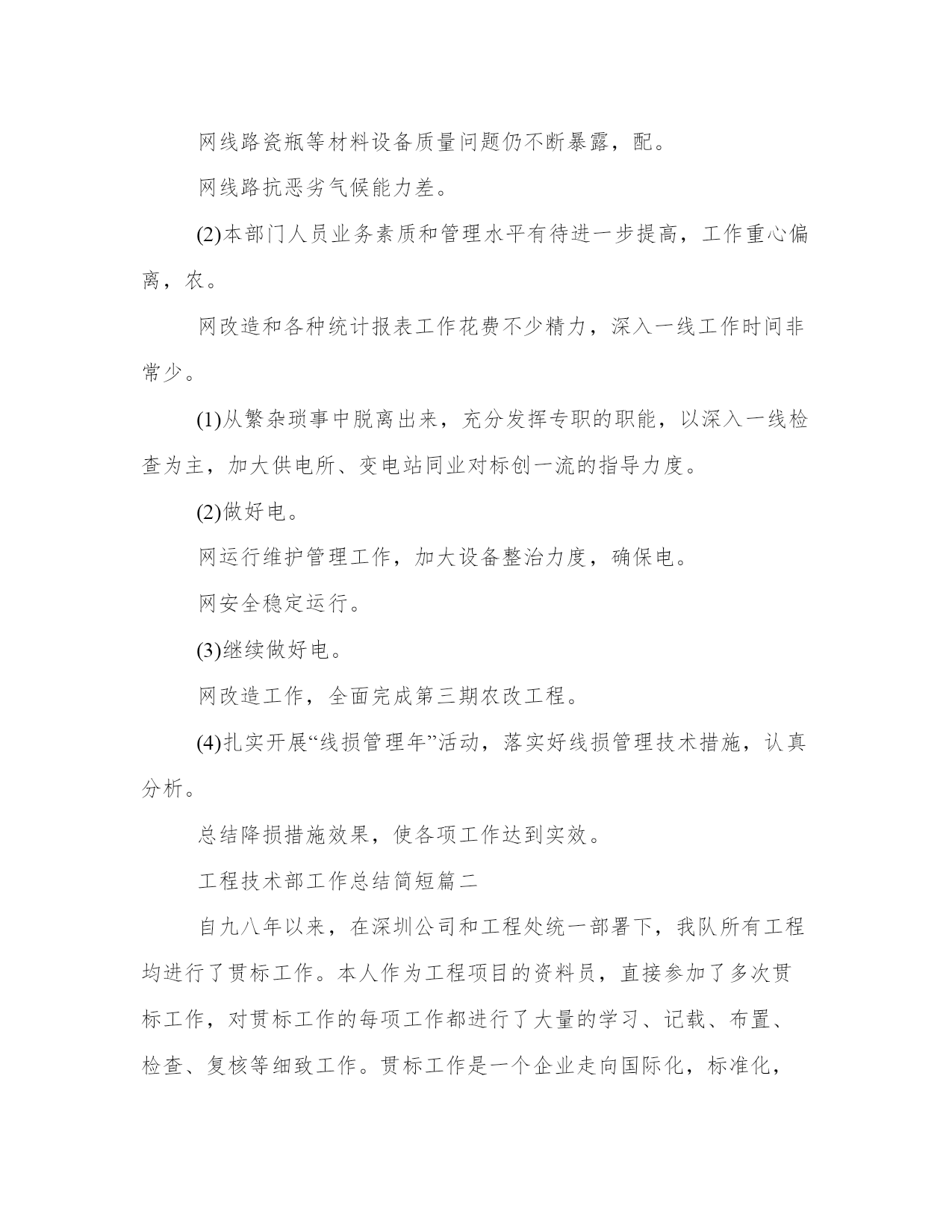 2024年工程技术部工作总结简短(优质11篇)当我们面临新的任务或项目时,总结可以帮助我们更好地理清框架,制定计划。怎样做到全面概括和准确总结,是我们写总结时需要注意的要点。我们整理了一些相关的总结样本,供大家参考和学习。工程技术部工作总结简短篇一精心安排,做好工程项目立项设计工作。三月份组织各生产单位对电。网现状进行了仔细梳理,分析薄弱环节,各自拟订了改造项目计划,我部从全局出发,通盘考虑,认真分析高中低压电。网现状,结合公司xx电。网建设规划,分期分批确定了电。网建设改造项目,先后完成了第三期第一批县
