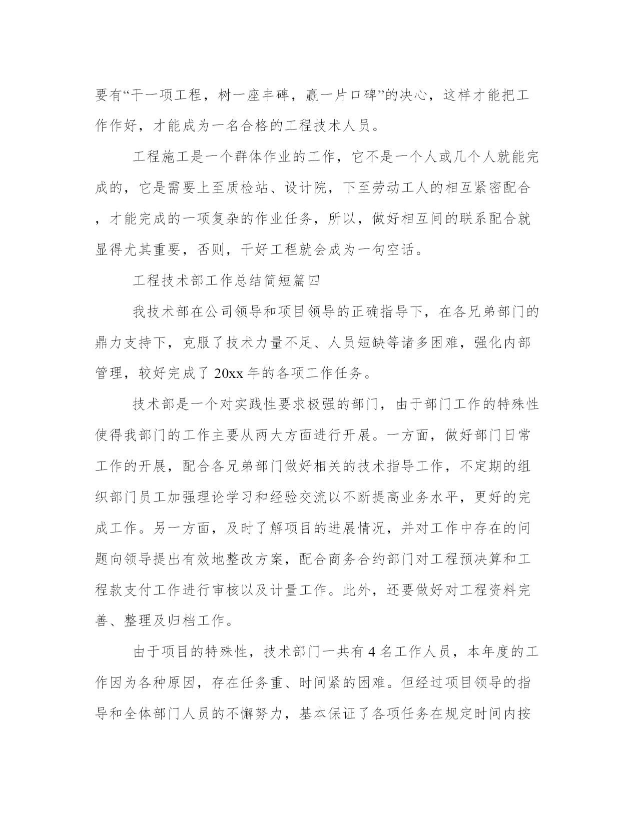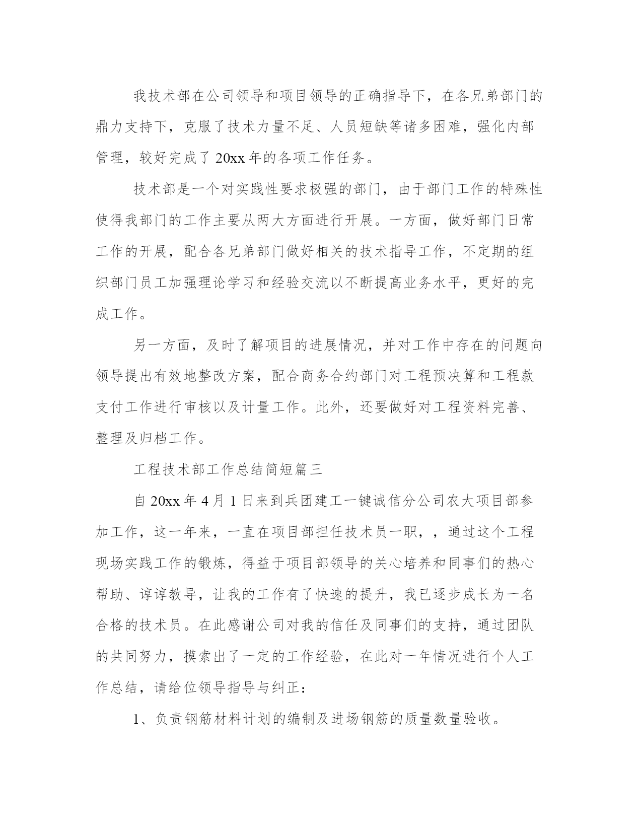 最新技术部门年终总结简短(优质11篇)总结要突出亮点和闪光点,准确评估自己的优势和不足,力求做到全面客观,树立正确的自我认知。总结应该以客观真实的态度来描述自己的表现,不夸大也不贬低。这些总结范文涵盖了各个领域的不同主题,能够满足不同读者的需求和兴趣。技术部门年终总结简短篇一_年是硕果累累的一年,对于我个人而言,_年是个人专业技能全面进步的一年。在过去的一年之中,作为泸电工程汽机工程处一名具备工程施工经验的技术干部,我部分或者全程参与了汽机专业多个施工班组的技术工作。正是在这繁忙而又充实的一年之中,在泸电