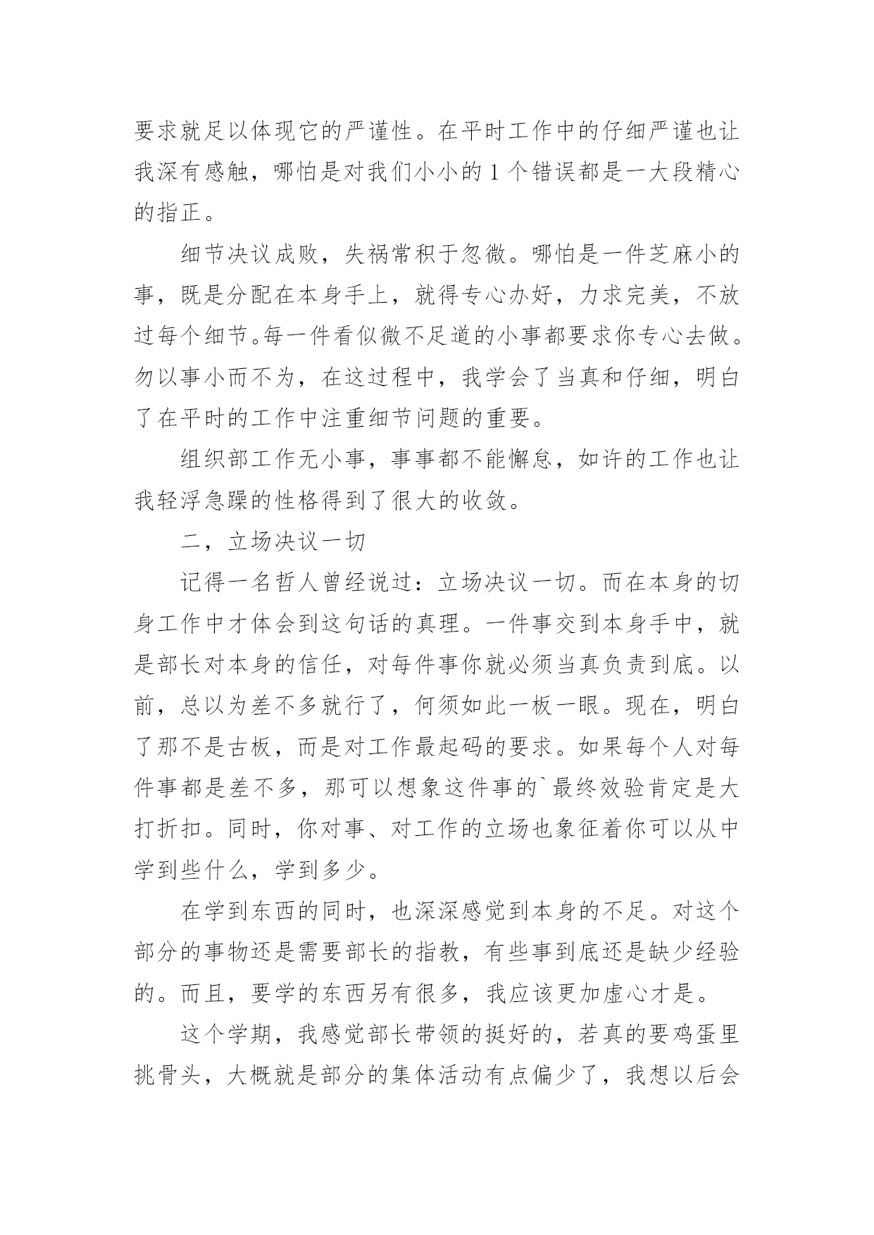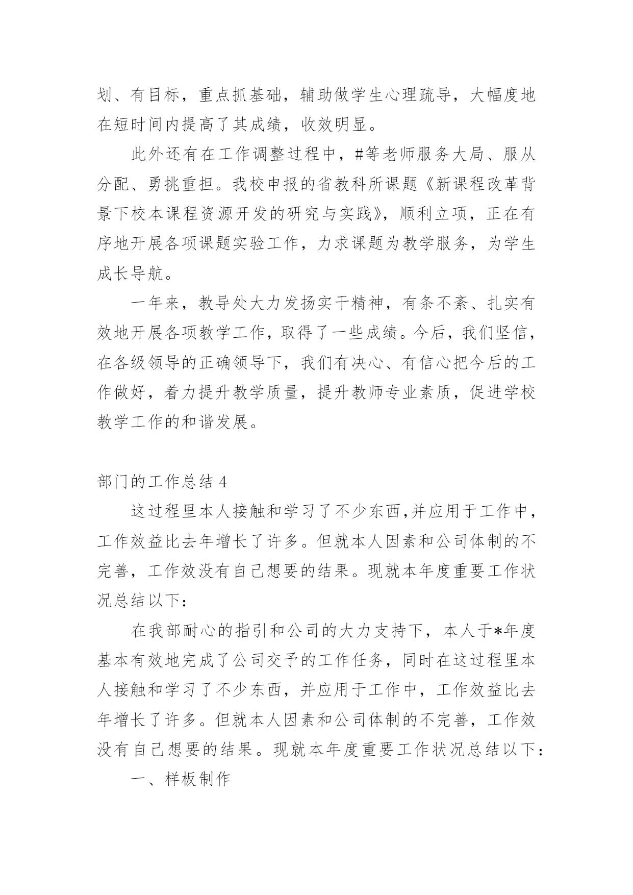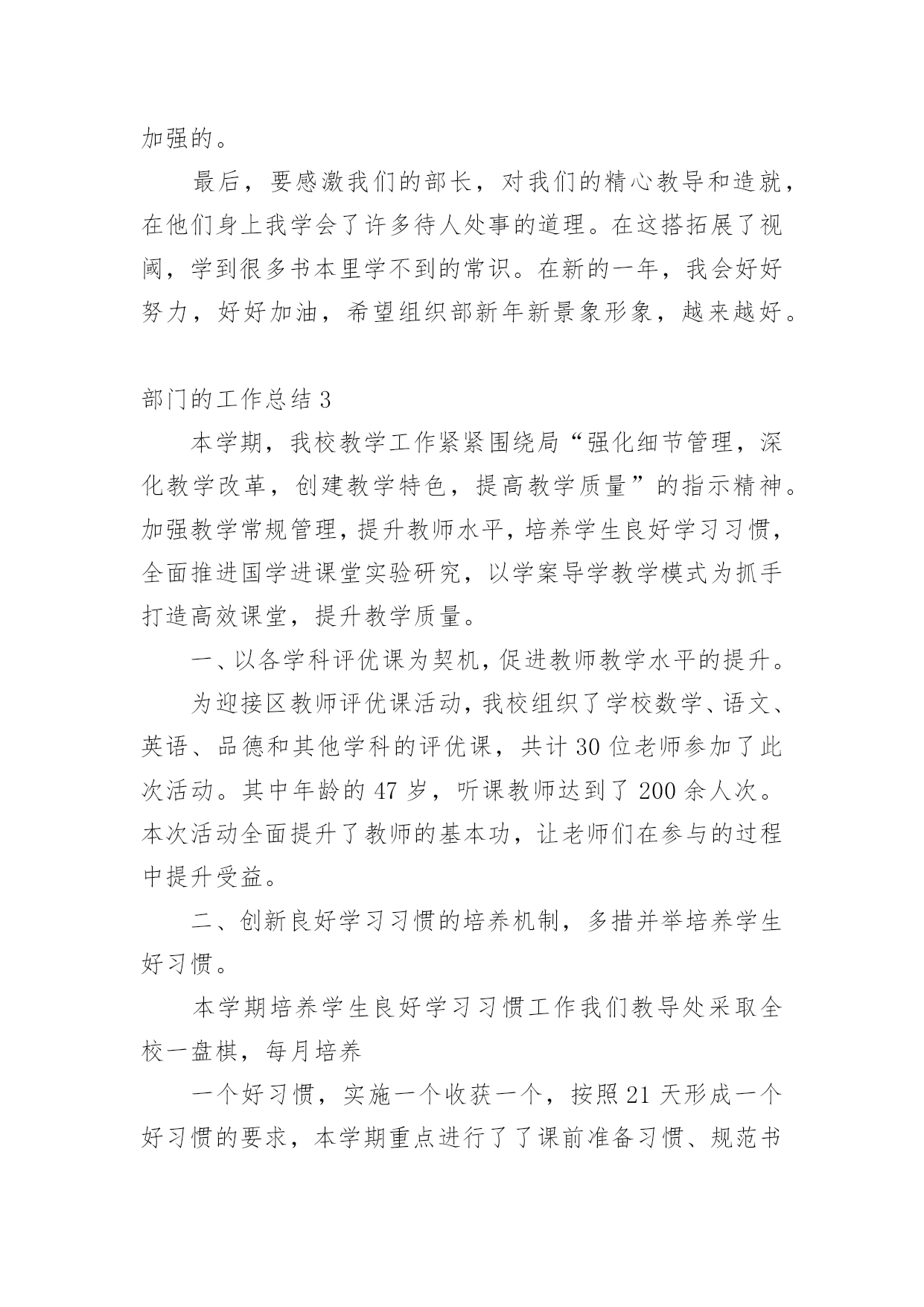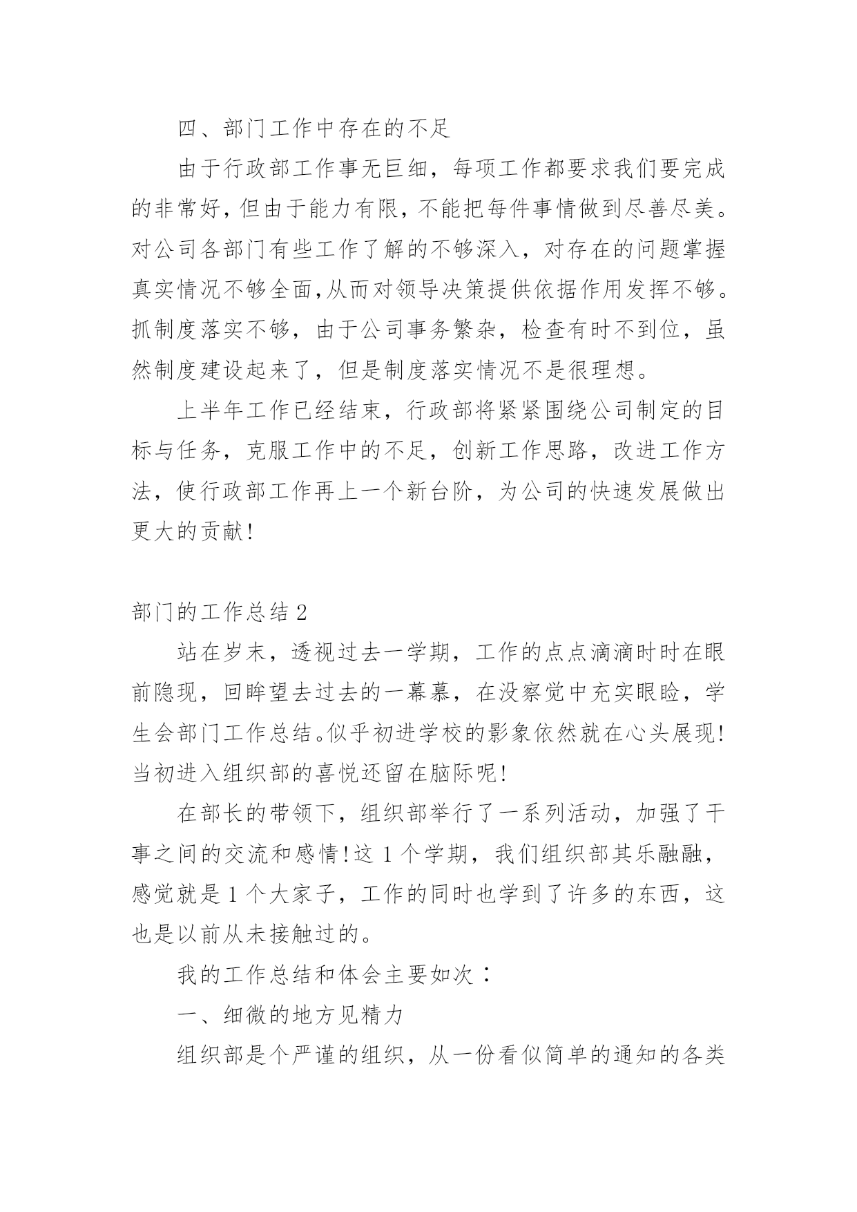 部门的工作总结部门的工作总结集锦15篇总结是指社会团体、企业单位和个人对某一阶段的学习、工作或其完成情况加以回顾和分析,得出教训和一些规律性认识的一种书面材料,它可以帮助我们总结以往思想,发扬成绩,让我们一起来学习写总结吧。但是总结有什么要求呢?下面是小编为大家收集的部门的工作总结,供大家参考借鉴,希望可以帮助到有需要的朋友。部门的工作总结1今年上半年,行政部按照年初的工作计划以及公司领导的工作部署,认真开展工作。下面就行政部上半年工作情况,总结如下。一、加强部门基础工作管理,创造良好的工作环境为各位领导和员工创造一个良好的工作环境是行政部重要的工作内容之一,上半年行政部结合工作的实际,认真履行部门工作职责,加强与公司其他部门之间的沟通与协调,使行政部的基础管理工作实现了规范化、制度化、高效化,为公司的发展创造了良好的条件。根据公司管理制度规定,对公章及证照进行合理使用与保管,对各部门使用情况进行规范,每项业务有相关单据和领导签字。根据公司规定,行政部配合财务部进行定期盘点,做到了资产及时调整、维修、更换工作,在资产配备上保证了公司各部门正常有序的`工作。库存资产保管维护完好,可以做到随用随取,安装即用的效果。加强外包单位的日常管理与培训,确保商场环境干净舒适,提高保洁人员的礼貌礼仪、安全常识等方面的综合素质,降低减少人员流动,保证其服务品质的稳定性。二、加强服务、树立良好风气行政部每月有工作重点,做到有工作重点和创新,改变行政部等待领导安排工作的被动行为。在工作方法与思路上不断改进和创新,适应公司发展的需要将行政部工作不断推进,提高办事效率增强服务意识和奉献精神。行政部分管的采购、库房、办公耗材管控及办公设备维护和保养、公车使用工作,涉及公司各个部门、以及市场部各种促销活动配合都做到提前沟通,服务在前。三、加强学习、认真履行职责行政部人员深入学习专业知识,不断补充各方面的知识和深入专研行政部业务知识。上半年,我部门加强自身学习入手,认真学习公司相关业务流程、公司制度等业务内容,切实加强了理论、业务学习的自觉性,形成了良好的学习氛围。在工作上严格按照公司要求,在公司员工行为规范和办公区环境上加强管理。为了能提高员工素质,以更好地适应公司发展深入学习,商发每月组织召开“管理人员学习培训”,学习后应用到工作中,进行实践与促进。四、部门工作中存在的不足由于行政部工作事无巨细,每项工作都要求我们要完成的非常好,但由于能力有限,不能把每件事情做到尽善尽美。对公司各部门有些工作了解的不够深入,对存在的问题掌握真实情况不够全面,从而对领导决策提供依据作用发挥不够。抓制度落实不够,由于公司事务繁杂,检查有时不到位,虽然制度建设起来了,但是制度落实情况不是很理想。上半年工作已经结束,行政部将紧紧围绕公司制定的目标与任务,克服工作中的不足,创新工作思路,改进工作方法,使行政部工作再上一个新台阶,为公司的快速发展做出更大的贡献!部门的工作总结2站在岁末,透视过去一学期,工作的点点滴滴时时在眼前隐现,回眸望去过去的一幕慕,在没察觉中充实眼睑,学生会部门工作总结。似乎初进学校的影象依然就在心头展现!当初进入组织部的喜悦还留在脑际呢!在部长的带领下,组织部举行了一系列活动,加强了干事之间的交流和感情!这1个学期,我们组织部其乐融融,感觉就是1个大家子,工作的同时也学到了许多的东西,这也是以前从未接触过的。我的工作总结和体会主要如次∶一、细微的地方见精力组织部是个严谨的组织,从一份看似简单的通知的各类要求就足以体现它的严谨性。在平时工作中的仔细严谨也让我深有感触,哪怕是对我们小小的1个错误都是一大段精心的指正。细节决议成败,失祸常积于忽微。哪怕是一件芝麻小的事,既是分配在本身手上,就得专心办好,力求完美,不放过每个细节。每一件看似微不足道的小事都要求你专心去做。勿以事小而不为,在这过程中,我学会了当真和仔细,明白了在平时的工作中注重细节问题的重要。组织部工作无小事,事事都不能懈怠,如许的工作也让我轻浮急躁的性格得到了很大的收敛。二,立场决议一切记得一名哲人曾经说过:立场决议一切。而在本身的切身工作中才体会到这句话的真理。一件事交到本身手中,就是部长对本身的信任,对每件事你就必须当真负责到底。以前,总以为差不多就行了,何须如此一板一眼。现在,明白了那不是古板,而是对工作最起码的要求。如果每个人对每件事都是差不多,那可以想象这件事的`最终效验肯定是大打折扣。同时,你对事、对工作的立场也象征着你可以从中学到些什么,学到多少。在学到东西的同时,也深深感觉到本身的不足。对这个部分的事物还是需要部长的指教,有些事到底还是缺少经验的。而且,要学的东西另有很多,我应该更加虚心才是。这个学期,我感觉部长带领的挺好的,若真的要鸡蛋里挑骨头,大概就是部分的集体活动有点偏少了