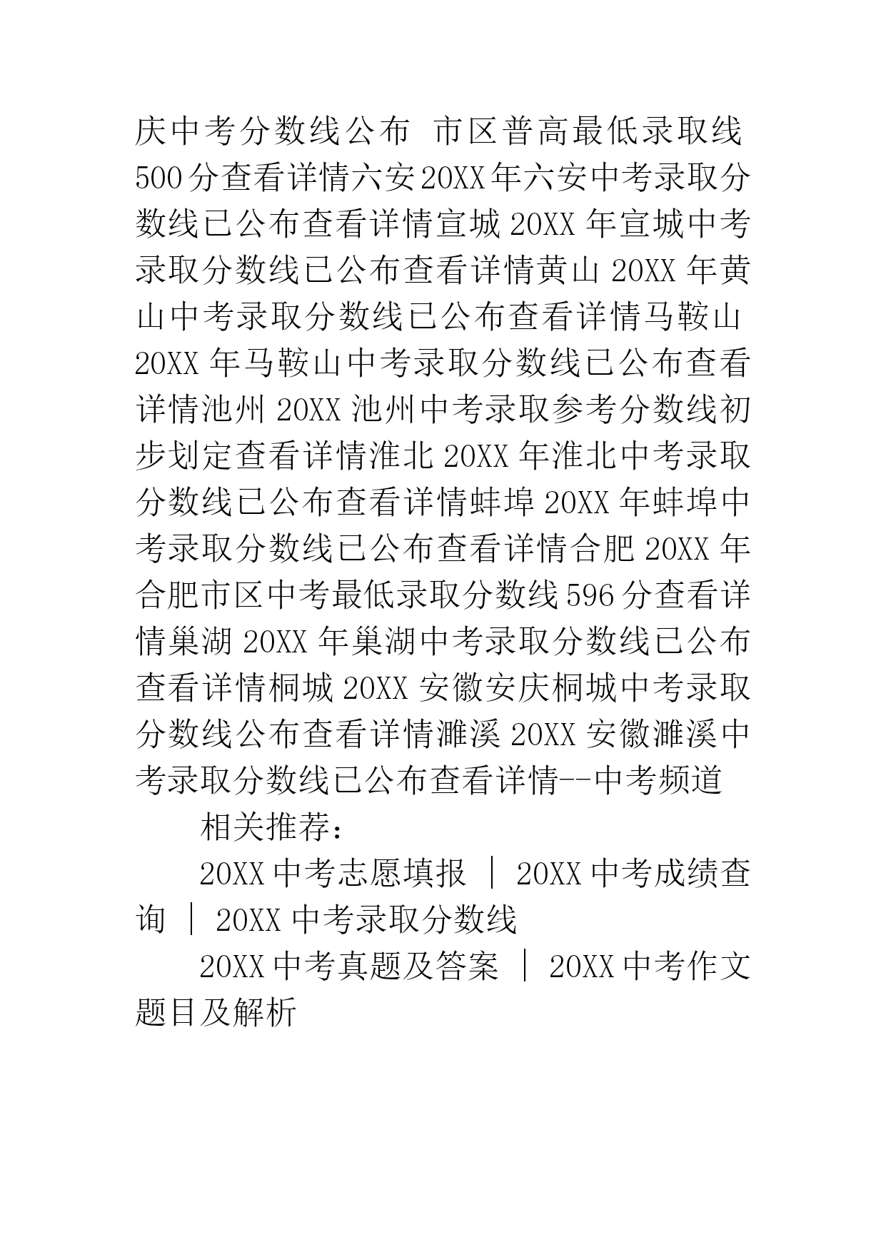 考试吧首发:20XX年安徽中考录取分数线汇总首发:20XX年安徽中考录取分数线汇总,更多20XX中考成绩查询、20XX中考分数线、20XX中考试题、20XX中考答案,尽在中考网提醒:因页面缓存,查看最新请按F5刷新,最后更新时间:20XX-8-411:22【交流】20XX年中考成绩查询及分数线交流专区20XX年安徽中考录取分数线汇总地区20XX年安徽中考分数线查看详情五年制高职20XX安徽初中起点五年制高职文化课最低控制线查看详情宿州20XX年宿州中考录取分数线已公布查看详情滁州20XX年滁州中考录取分数