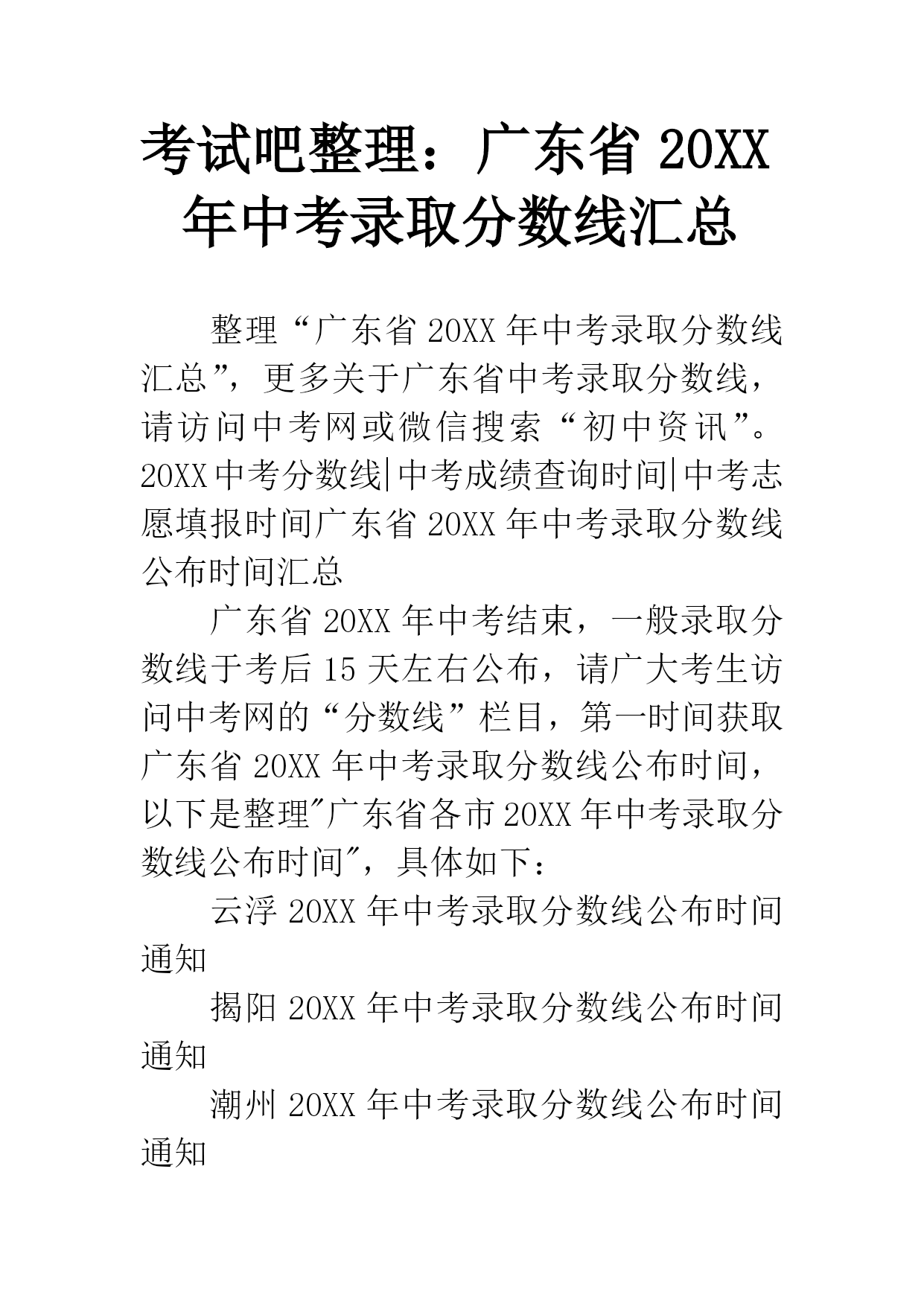 考试吧整理:广东省20XX年中考录取分数线汇总整理“广东省20XX年中考录取分数线汇总”,更多关于广东省中考录取分数线,请访问中考网或微信搜索“初中资讯”。20XX中考分数线|中考成绩查询时间|中考志愿填报时间广东省20XX年中考录取分数线公布时间汇总广东省20XX年中考结束,一般录取分数线于考后15天左右公布,请广大考生访问中考网的“分数线”栏目,第一时间获取广东省20XX年中考录取分数线公布时间,以下是整理"广东省各市20XX年中考录取分数线公布时间",具体如下:云浮20XX年中考录取分数线公布时间通