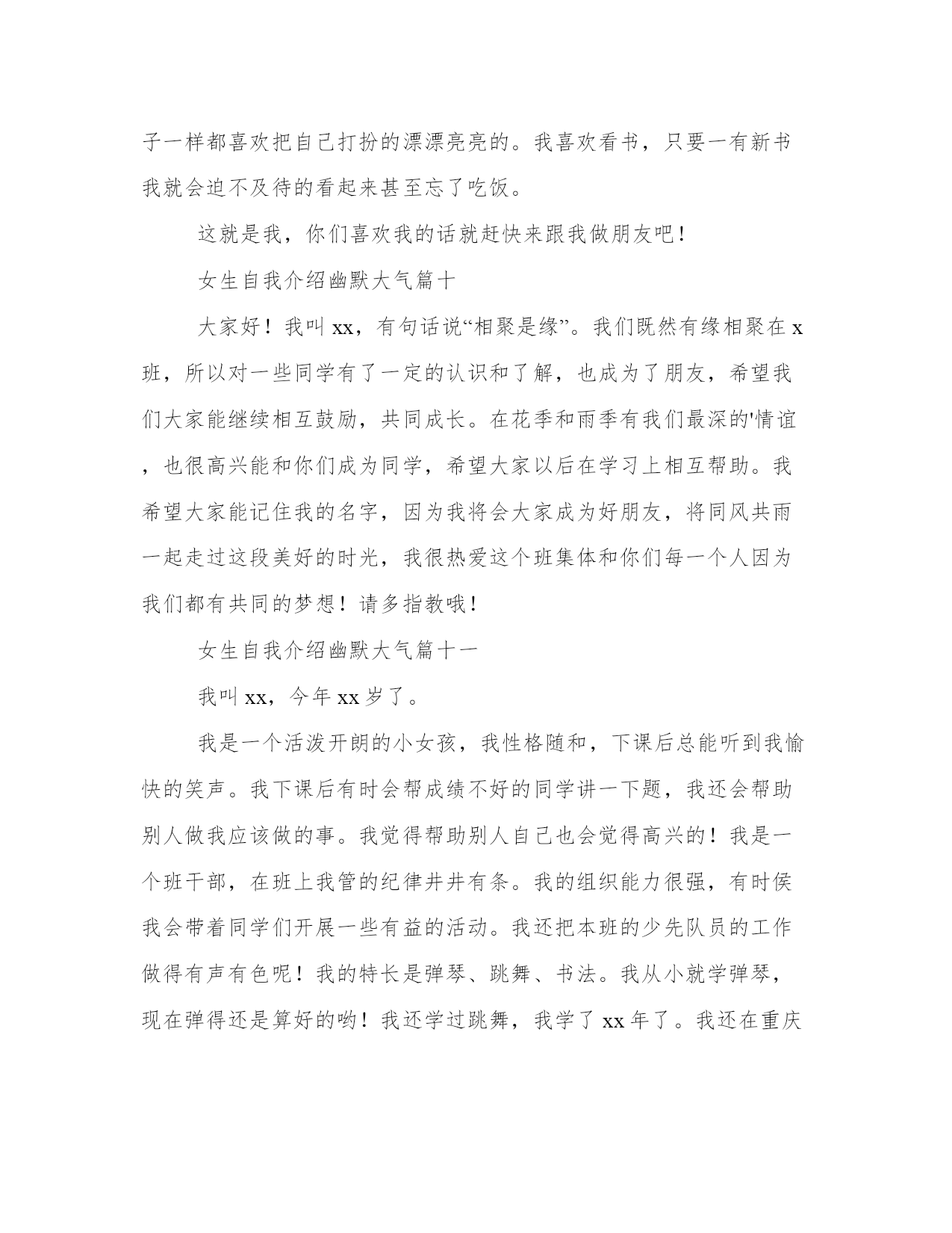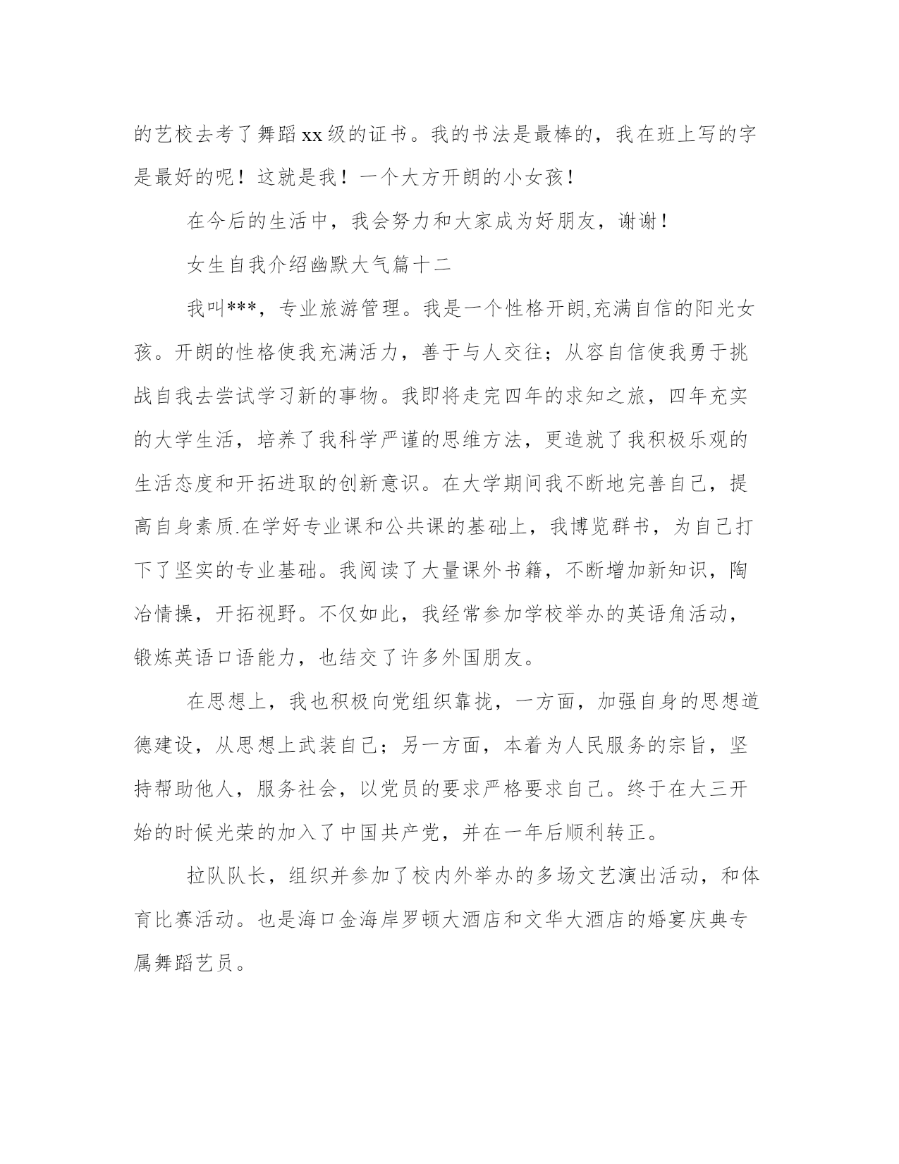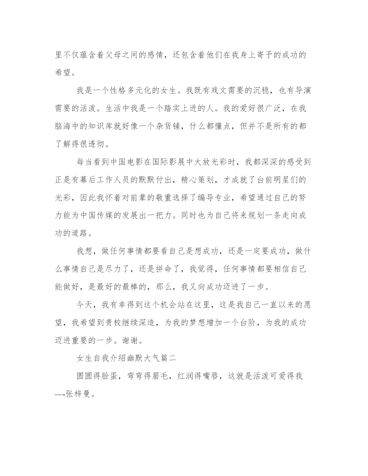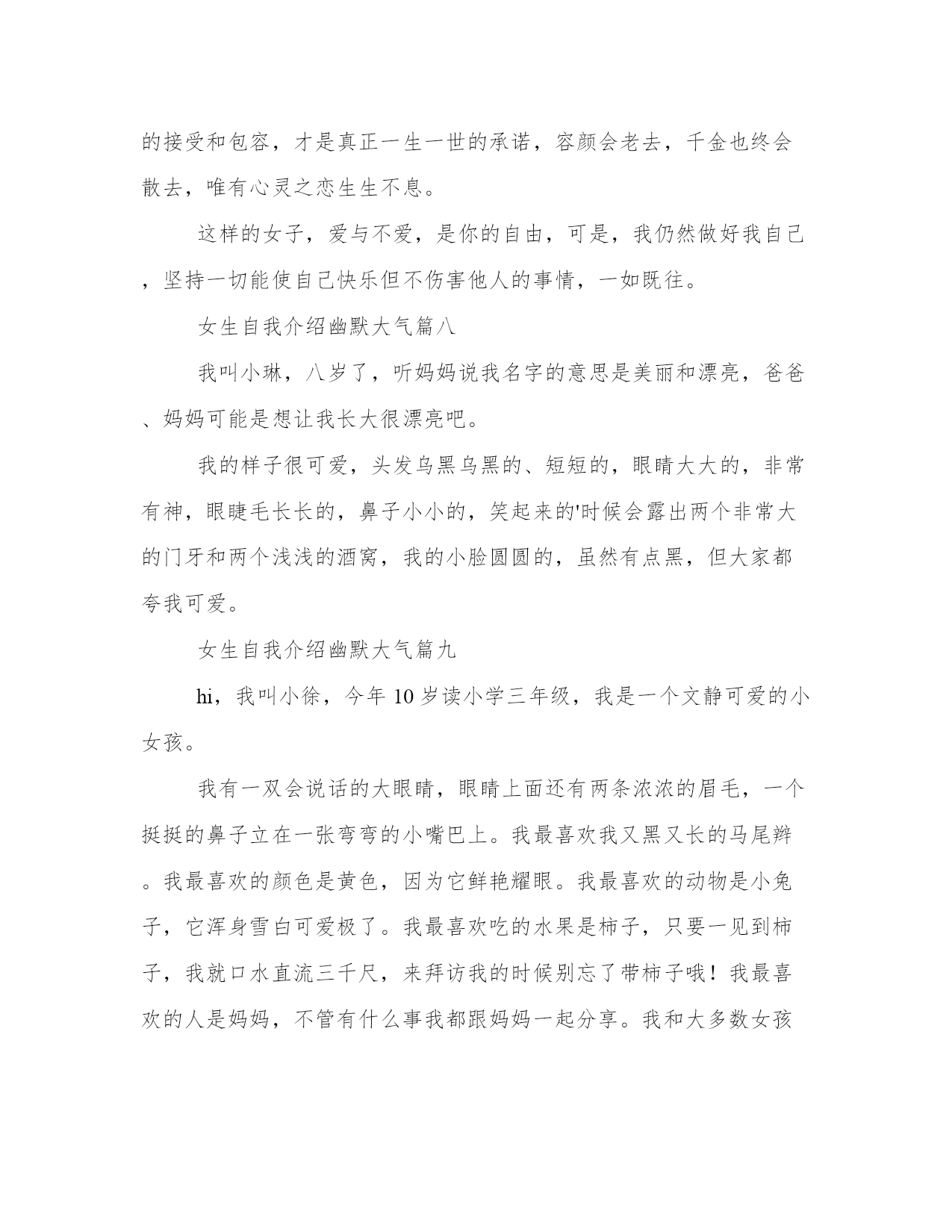 最新女生自我介绍幽默大气女生自我介绍(模板13篇)在日常学习、工作或生活中,大家总少不了接触作文或者范文吧,通过文章可以把我们那些零零散散的思想,聚集在一块。范文书写有哪些要求呢?我们怎样才能写好一篇范文呢?接下来小编就给大家介绍一下优秀的范文该怎么写,我们一起来看一看吧。女生自我介绍幽默大气篇一我叫黄莉莉,今年十岁,在xx路小学四年级学习。因为我是属猴的,爸爸妈妈希望我的名字里也有一片幽静美丽的树林,生机盎然,就给我起了个莉莉这个名字。我生活在一个幸福指数很高的4口之家,有爸爸、妈妈、弟弟和我。我热爱体育,凡是体育课上的体育项目我都喜欢。我还是我们学校长绳队的队员,每年都会代表学校参加大连市的跳长绳比赛,而且每次都能拿到相当不错的战绩。业余时间我还喜欢吹萨克斯,学了刚好一年,吹得不错。我做事用心,愿意帮助同学,结交朋友,大家都喜欢我的爽朗的笑声。当然我也有缺点,比如有时会马虎,不过我正在改呢!很高兴在这里认识了这么多的新同学,希望在少年领袖的舞台上,我们都能百尺竿头更进一步!我叫莉莉,记住我吧!女生自我介绍范文6我的名字叫xx。这个名字对于别人可能很普通。对我来说却有特殊的意义。正所谓望子成龙望女成凤,这个名字里不仅蕴含着父母之间的感情,还包含着他们在我身上寄予的成功的希望。我是一个性格多元化的女生。我既有戏文需要的沉稳,也有导演需要的活泼。生活中我是一个踏实上进的人。我的爱好很广泛,在我脑海中的知识库就好像一个杂货铺,什么都懂点,但并不是所有的都了解得很透彻。每当看到中国电影在国际影展中大放光彩时,我都深深的感受到正是有幕后工作人员的默默付出,精心策划,才成就了台前明星们的光彩,因此我怀着对前辈的敬重选择了编导专业,希望通过自己的努力能为中国传媒的发展出一把力。同时也为自己将来规划一条走向成功的道路。我想,做任何事情都要看自己是想成功,还是一定要成功,做什么事情自己是尽力了,还是拼命了,我觉得,任何事情都要相信自己能做好,是最好的最棒的,那么,我又向成功迈进了一步。今天,我有幸得到这个机会站在这里,这是我自己一直以来的愿望,我希望到贵校继续深造,为我的梦想增加一个台阶,为我的成功迈进重要的一步。谢谢。女生自我介绍幽默大气篇二圆圆得脸蛋,弯弯得眉毛,红润得嘴唇,这就是活泼可爱得我―-张梓曼。不过,我得优点也不少,比如;我爱看书,一有空,我就看一下书。如;安徒生童话、名师作文、小学语文阅读训练80篇、知心姐姐……我都爱看。因为看得书多,可以增加不少知识,视野也开阔啦,所以作文也写得不错。我非常喜欢画画。小时候我就喜欢上画画啦。父母给我买啦很多得画画书,让我自学。到我读上一年级得时候,父母就让我参加啦不少画画班,让我学会啦不少画画得知识。一次托管上图画课时,一位老师给我们讲啦她儿子得经历,让我更喜欢画画啦。这就是我――一个活泼可爱得小女孩。女生自我介绍幽默大气篇三九年前的一天,一个白白胖胖的小女孩哭着来到这个美丽的世界。这个女孩就是我—卫馨莹。一张圆圆的脸上长着一双水灵灵的大眼睛,下面长着一张能说会道的嘴。我的童年就是在书的海洋里度过的。现在我家就像一座“小图书馆”到处都是书,连厕所都不放过。记得有一次,妈妈带我去图书馆看书,我硬要妈妈给我买童话书。妈妈说:“现在我们是来看书的,不是来买书的,更何况家里书这么多,就没必要买了。”最后,我和妈妈依依不舍地回家了。在学习上,数学是我的弱项。有一次放学回到家,妈妈问我:“今天数学考了咋样?”我吞吞吐吐地说:“合格”心想四年级的数学太难了,尤其让我烦恼的是应用题。妈妈不但没有责怪我,还鼓励我说:“你不仅要看故事书,还要多看一些数学书,让数学成绩提高。”啊!这就是我,一个爱看书的我。女生自我介绍幽默大气篇四大家好,我是xxx,我是一位爱笑的女生,很高兴能和大家在同一班里学习,这是一种缘分也是一种福气.我知道在座的各位都是很优秀出类拔萃的学生,望在以后的日子里请大家多多指教.我很喜欢交朋友,我想和班上的每位同学都能成为朋友,为这三年写下最光辉最绚丽的一章.我希望我们班能成为高一年级最闪亮的一颗星星.假如我们能互相帮助,互相学习,我相信,第一肯定是我们班,有句俗话说爱拼才会赢.在此我祝愿每位同学通过自己的努力学习三年后都有好成绩,考上自己理想的大学.将本文的word文档下载到电脑,方便收藏和打印。女生自我介绍幽默大气篇五尊敬的各位评委、各位老师:大家好,我叫xx。来自水浒故里———水泊梁山。水浒英雄的正直、正气、正义深深地影响了我使我养成了不怕吃苦、勇往直前的性格。从高一开始我和同学们主持创办了“青春之声”电台并担任采、编、写、播的任务并参加过市里组织的小记者培训。我曾在学校和县市举行的'演讲、朗诵比赛中四次荣获一等奖并从初中开始就担任学