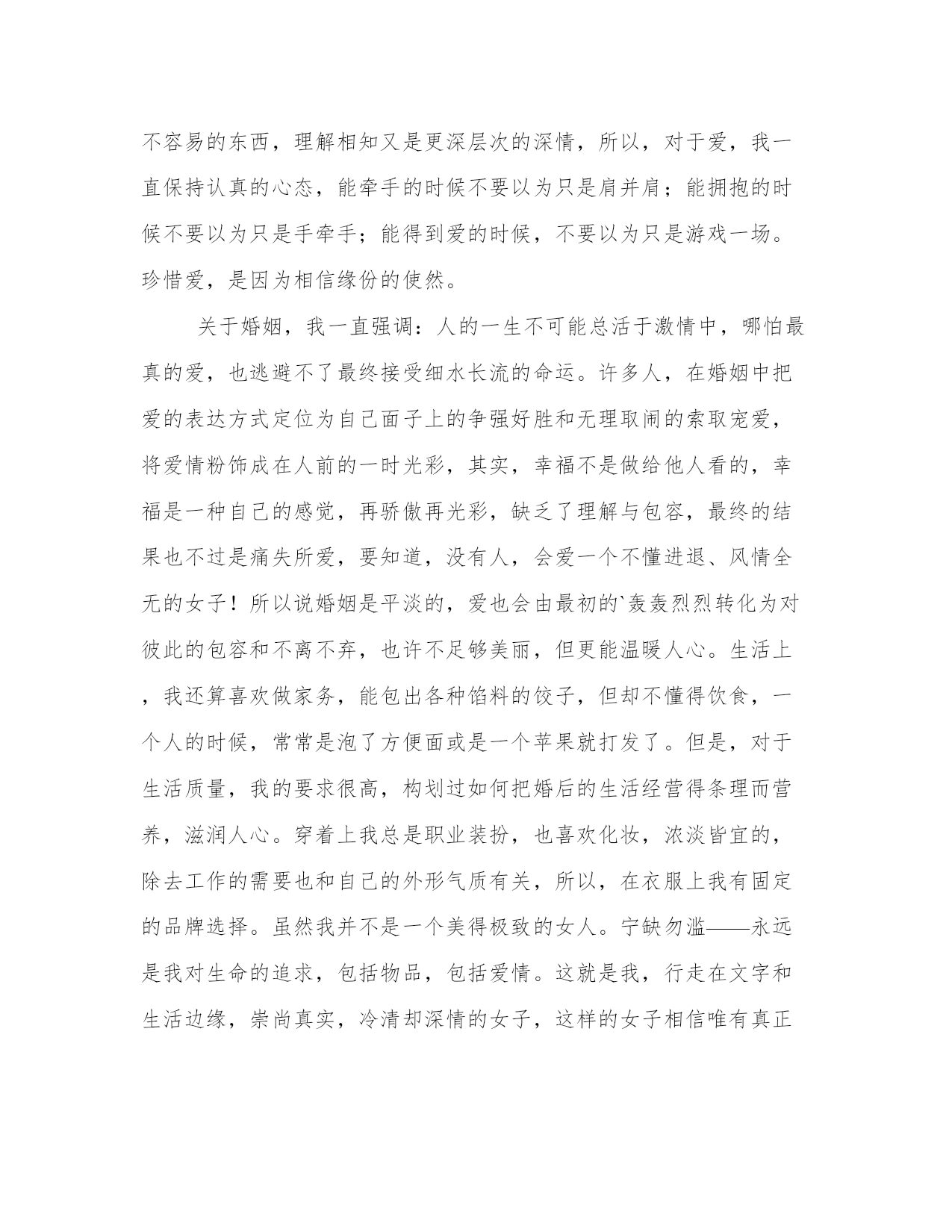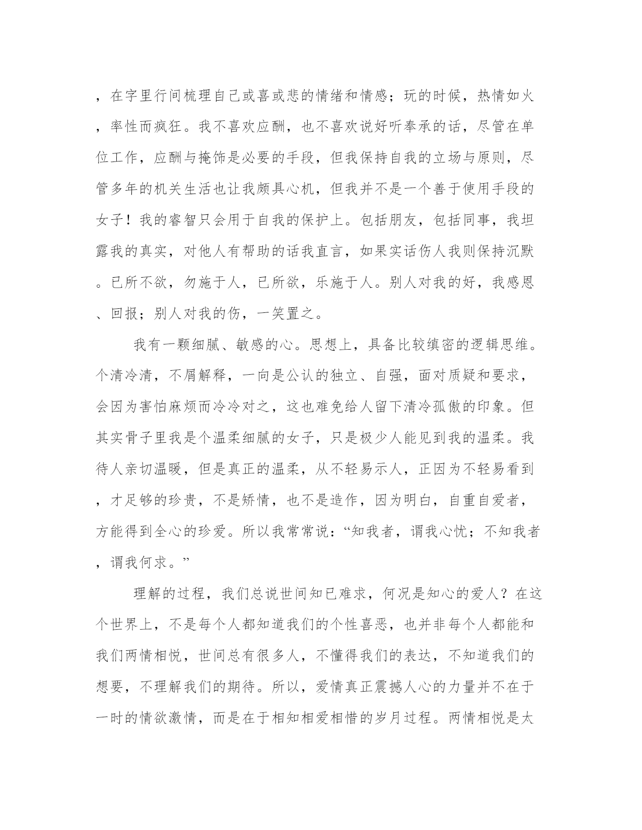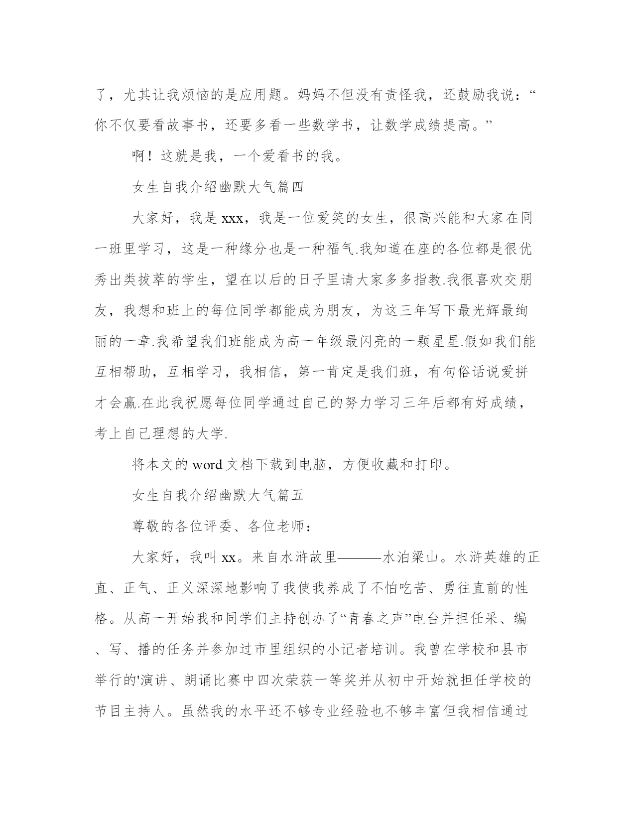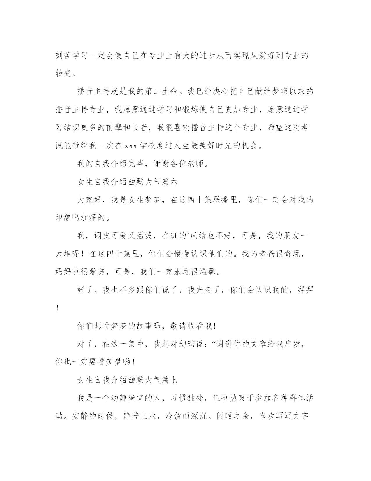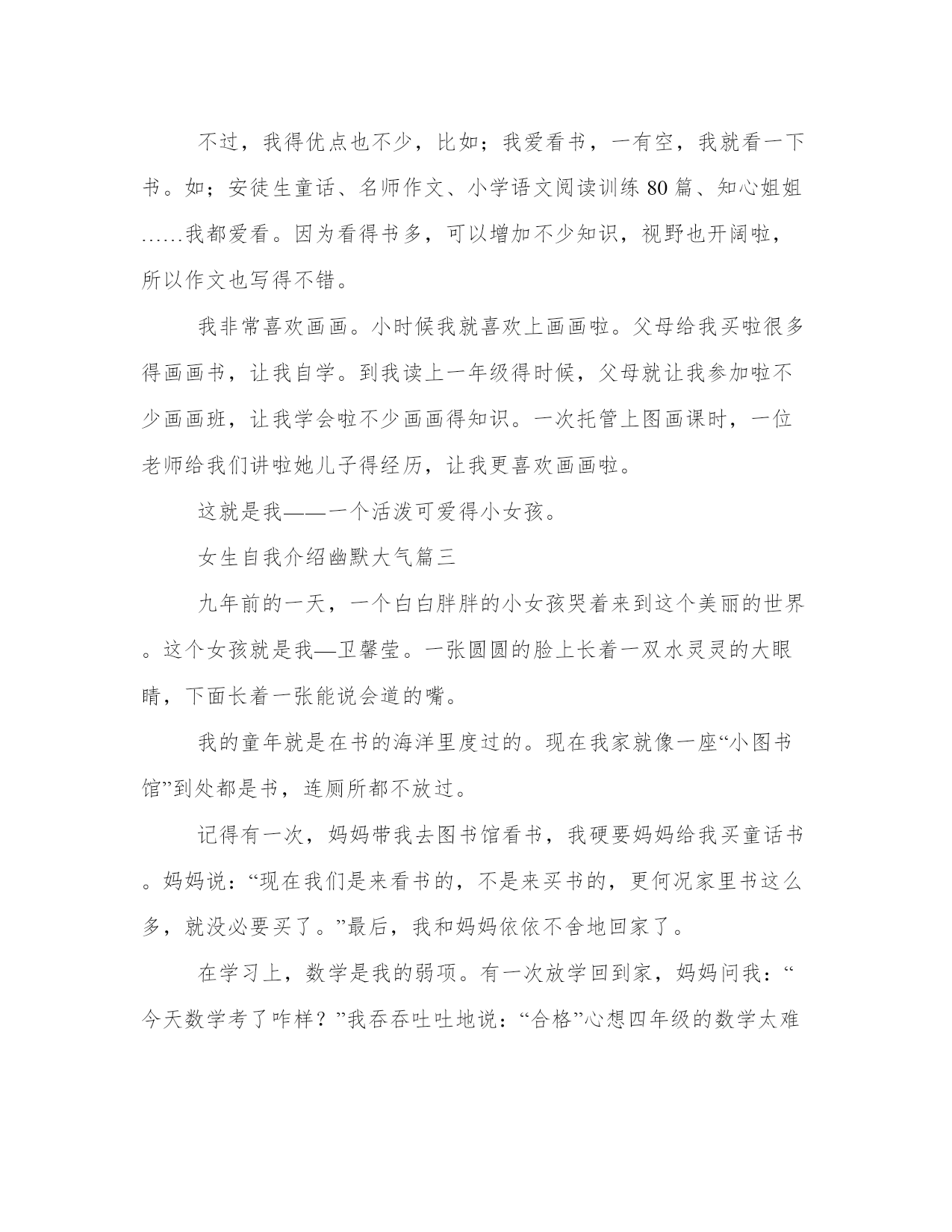 最新女生自我介绍幽默大气女生自我介绍(模板13篇)在日常学习、工作或生活中,大家总少不了接触作文或者范文吧,通过文章可以把我们那些零零散散的思想,聚集在一块。范文书写有哪些要求呢?我们怎样才能写好一篇范文呢?接下来小编就给大家介绍一下优秀的范文该怎么写,我们一起来看一看吧。女生自我介绍幽默大气篇一我叫黄莉莉,今年十岁,在xx路小学四年级学习。因为我是属猴的,爸爸妈妈希望我的名字里也有一片幽静美丽的树林,生机盎然,就给我起了个莉莉这个名字。我生活在一个幸福指数很高的4口之家,有爸爸、妈妈、弟弟和我。我热爱体育,凡是体育课上的体育项目我都喜欢。我还是我们学校长绳队的队员,每年都会代表学校参加大连市的跳长绳比赛,而且每次都能拿到相当不错的战绩。业余时间我还喜欢吹萨克斯,学了刚好一年,吹得不错。我做事用心,愿意帮助同学,结交朋友,大家都喜欢我的爽朗的笑声。当然我也有缺点,比如有时会马虎,不过我正在改呢!很高兴在这里认识了这么多的新同学,希望在少年领袖的舞台上,我们都能百尺竿头更进一步!我叫莉莉,记住我吧!女生自我介绍范文6我的名字叫xx。这个名字对于别人可能很普通。对我来说却有特殊的意义。正所谓望子成龙望女成凤,这个名字里不仅蕴含着父母之间的感情,还包含着他们在我身上寄予的成功的希望。我是一个性格多元化的女生。我既有戏文需要的沉稳,也有导演需要的活泼。生活中我是一个踏实上进的人。我的爱好很广泛,在我脑海中的知识库就好像一个杂货铺,什么都懂点,但并不是所有的都了解得很透彻。每当看到中国电影在国际影展中大放光彩时,我都深深的感受到正是有幕后工作人员的默默付出,精心策划,才成就了台前明星们的光彩,因此我怀着对前辈的敬重选择了编导专业,希望通过自己的努力能为中国传媒的发展出一把力。同时也为自己将来规划一条走向成功的道路。我想,做任何事情都要看自己是想成功,还是一定要成功,做什么事情自己是尽力了,还是拼命了,我觉得,任何事情都要相信自己能做好,是最好的最棒的,那么,我又向成功迈进了一步。今天,我有幸得到这个机会站在这里,这是我自己一直以来的愿望,我希望到贵校继续深造,为我的梦想增加一个台阶,为我的成功迈进重要的一步。谢谢。女生自我介绍幽默大气篇二圆圆得脸蛋,弯弯得眉毛,红润得嘴唇,这就是活泼可爱得我―-张梓曼。不过,我得优点也不少,比如;我爱看书,一有空,我就看一下书。如;安徒生童话、名师作文、小学语文阅读训练80篇、知心姐姐……我都爱看。因为看得书多,可以增加不少知识,视野也开阔啦,所以作文也写得不错。我非常喜欢画画。小时候我就喜欢上画画啦。父母给我买啦很多得画画书,让我自学。到我读上一年级得时候,父母就让我参加啦不少画画班,让我学会啦不少画画得知识。一次托管上图画课时,一位老师给我们讲啦她儿子得经历,让我更喜欢画画啦。这就是我――一个活泼可爱得小女孩。女生自我介绍幽默大气篇三九年前的一天,一个白白胖胖的小女孩哭着来到这个美丽的世界。这个女孩就是我—卫馨莹。一张圆圆的脸上长着一双水灵灵的大眼睛,下面长着一张能说会道的嘴。我的童年就是在书的海洋里度过的。现在我家就像一座“小图书馆”到处都是书,连厕所都不放过。记得有一次,妈妈带我去图书馆看书,我硬要妈妈给我买童话书。妈妈说:“现在我们是来看书的,不是来买书的,更何况家里书这么多,就没必要买了。”最后,我和妈妈依依不舍地回家了。在学习上,数学是我的弱项。有一次放学回到家,妈妈问我:“今天数学考了咋样?”我吞吞吐吐地说:“合格”心想四年级的数学太难了,尤其让我烦恼的是应用题。妈妈不但没有责怪我,还鼓励我说:“你不仅要看故事书,还要多看一些数学书,让数学成绩提高。”啊!这就是我,一个爱看书的我。女生自我介绍幽默大气篇四大家好,我是xxx,我是一位爱笑的女生,很高兴能和大家在同一班里学习,这是一种缘分也是一种福气.我知道在座的各位都是很优秀出类拔萃的学生,望在以后的日子里请大家多多指教.我很喜欢交朋友,我想和班上的每位同学都能成为朋友,为这三年写下最光辉最绚丽的一章.我希望我们班能成为高一年级最闪亮的一颗星星.假如我们能互相帮助,互相学习,我相信,第一肯定是我们班,有句俗话说爱拼才会赢.在此我祝愿每位同学通过自己的努力学习三年后都有好成绩,考上自己理想的大学.将本文的word文档下载到电脑,方便收藏和打印。女生自我介绍幽默大气篇五尊敬的各位评委、各位老师:大家好,我叫xx。来自水浒故里———水泊梁山。水浒英雄的正直、正气、正义深深地影响了我使我养成了不怕吃苦、勇往直前的性格。从高一开始我和同学们主持创办了“青春之声”电台并担任采、编、写、播的任务并参加过市里组织的小记者培训。我曾在学校和县市举行的'演讲、朗诵比赛中四次荣获一等奖并从初中开始就担任学