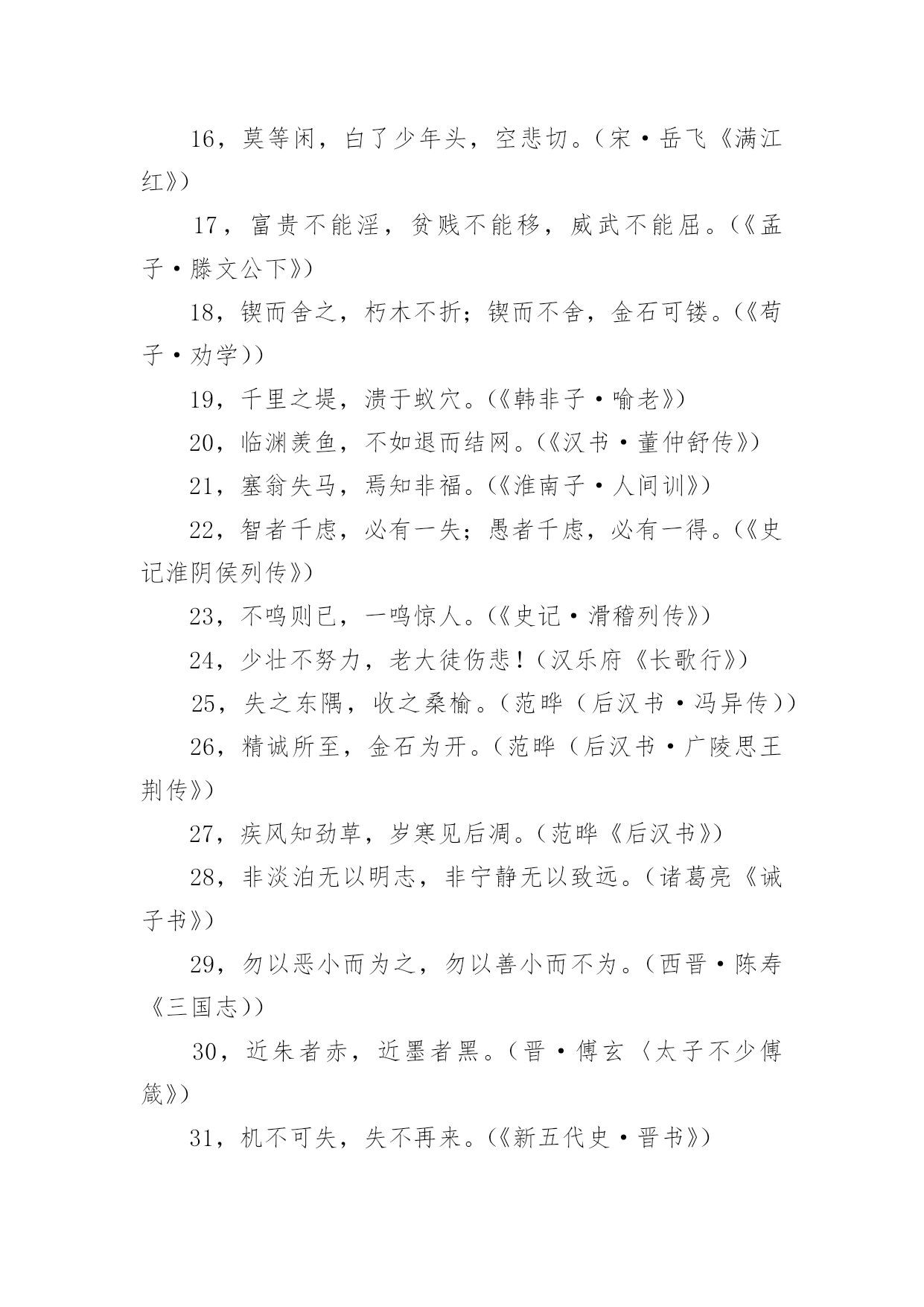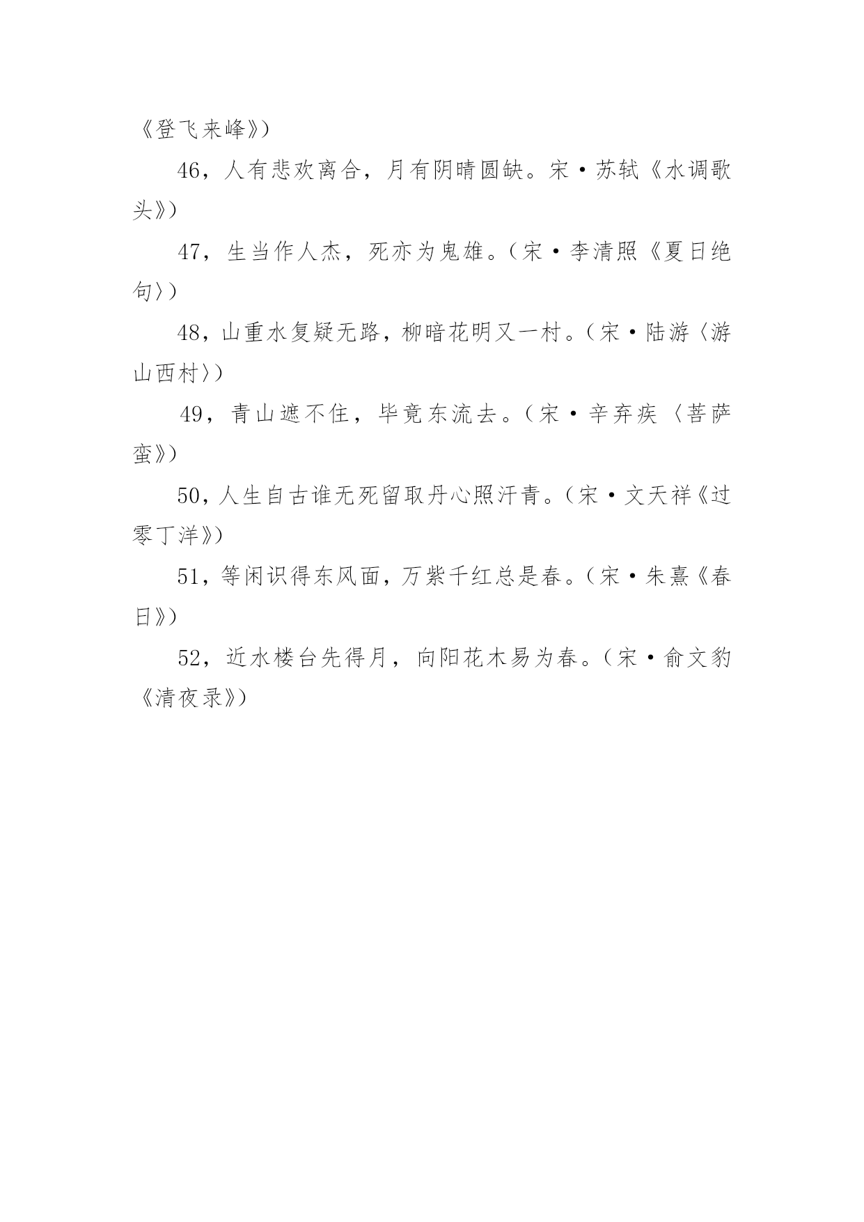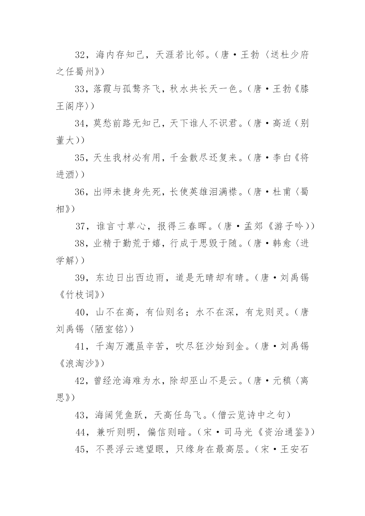 考试失败后的励志诗句考试失败后的励志诗句谁道人生无再少,门前流水尚能西!下面和小编一起来看考试失败后的'励志诗句,希望有所帮助!1,投我以桃,报之以李。(《诗经·大雅·抑》)2,路漫漫其修远兮,吾将上下而求索。(屈原(离骚》)3,满招损,谦受益。(《尚书》)4,人非圣贤,孰能无过?过而能改,善莫大焉。(《左传》)5,前事不忘,后事之师。(《战国策·赵策))6,知己知彼,百战不殆。(《孙子兵法·谋攻》)7,祸兮福之所倚,福兮祸之所伏。(《老子·五十八章))8,知人者智,自知者明。(《老子))9,物以类聚,人以群分。(《易经))10,工欲善其事,必先利其器。(《论语·卫灵公》)11,三军可夺帅也,匹夫不可夺志也。(《论语·子罕》)12,人无远虑,必有近忧。(《论语·卫灵公))13,有则改之,无则加勉。(《论语》)14,着意栽花花不发,等闲插柳柳成阴。(元·关汉卿《包待制智斩鲁》)15,三十功名尘与土八千里路云和月。(宋岳飞《满江红》)16,莫等闲,白了少年头,空悲切。(宋·岳飞《满江红》)17,富贵不能淫,贫贱不能移,威武不能屈。(《孟子·滕文公下》)18,锲而舍之,朽木不折;锲而不舍,金石可镂。(《苟子·劝学))19,千里之堤,溃于蚁穴。(《韩非子·喻老》)20,临渊羡鱼,不如退而结网。(《汉书·董仲舒传》)21,塞翁失马,焉知非福。(《淮南子·人间训》)22,智者千虑,必有一失;愚者千虑,必有一得。(《史记淮阴侯列传》)23,不鸣则已,一鸣惊人。(《史记·滑稽列传》)24,少壮不努力,老大徒伤悲!(汉乐府《长歌行》)25,失之东隅,收之桑榆。(范晔(后汉书·冯异传))26,精诚所至,金石为开。(范晔(后汉书·广陵思王荆传》)27,疾风知劲草,岁寒见后凋。(范晔《后汉书》)28,非淡泊无以明志,非宁静无以致远。(诸葛亮《诫子书》)29,勿以恶小而为之,勿以善小而不为。(西晋·陈寿《三国志))30,近朱者赤,近墨者黑。(晋·傅玄〈太子不少傅箴》)31,机不可失,失不再来。(《新五代史·晋书》)32,海内存知己,天涯若比邻。(唐·王勃〈送杜少府之任蜀州》)33,落霞与孤鹜齐飞,秋水共长天一色。(唐·王勃《膝王阁序〉)34,莫愁前路无知己,天下谁人不识君。(唐·高适(别董大))35,天生我材必有用,千金散尽还复来。(唐·李白《将进酒〉)36,出师未捷身先死,长使英雄泪满襟。(唐·杜甫〈蜀相》)37,谁言寸草心,报得三春晖。(唐·孟郊《游子吟))38,业精于勤荒于嬉,行成于思毁于随。(唐·韩愈〈进学解〉)39,东边日出西边雨,道是无晴却有晴。(唐·刘禹锡《竹枝词》)40,山不在高,有仙则名;水不在深,有龙则灵。(唐刘禹锡〈陋室铭〉)41,千淘万漉虽辛苦,吹尽狂沙始到金。(唐·刘禹锡《浪淘沙》)42,曾经沧海难为水,除却巫山不是云。(唐·元稹〈离思》)43,海阔凭鱼跃,天高任鸟飞。(僧云览诗中之句)44,兼听则明,偏信则暗。(宋·司马光《资治通鉴》)45,不畏浮云遮望眼,只缘身在最高层。(宋·王安石《登飞来峰》)46,人有悲欢离合,月有阴晴圆缺。宋·苏轼《水调歌头》)47,生当作人杰,死亦为鬼雄。(宋·李清照《夏日绝句〉)48,山重水复疑无路,柳暗花明又一村。(宋·陆游〈游山西村〉)49,青山遮不住,毕竟东流去。(宋·辛弃疾〈菩萨蛮》)50,人生自古谁无死留取丹心照汗青。(宋·文天祥《过零丁洋》)51,等闲识得东风面,万紫千红总是春。(宋·朱熹《春日》)52,近水楼台先得月,向阳花木易为春。(宋·俞文豹《清夜录》)