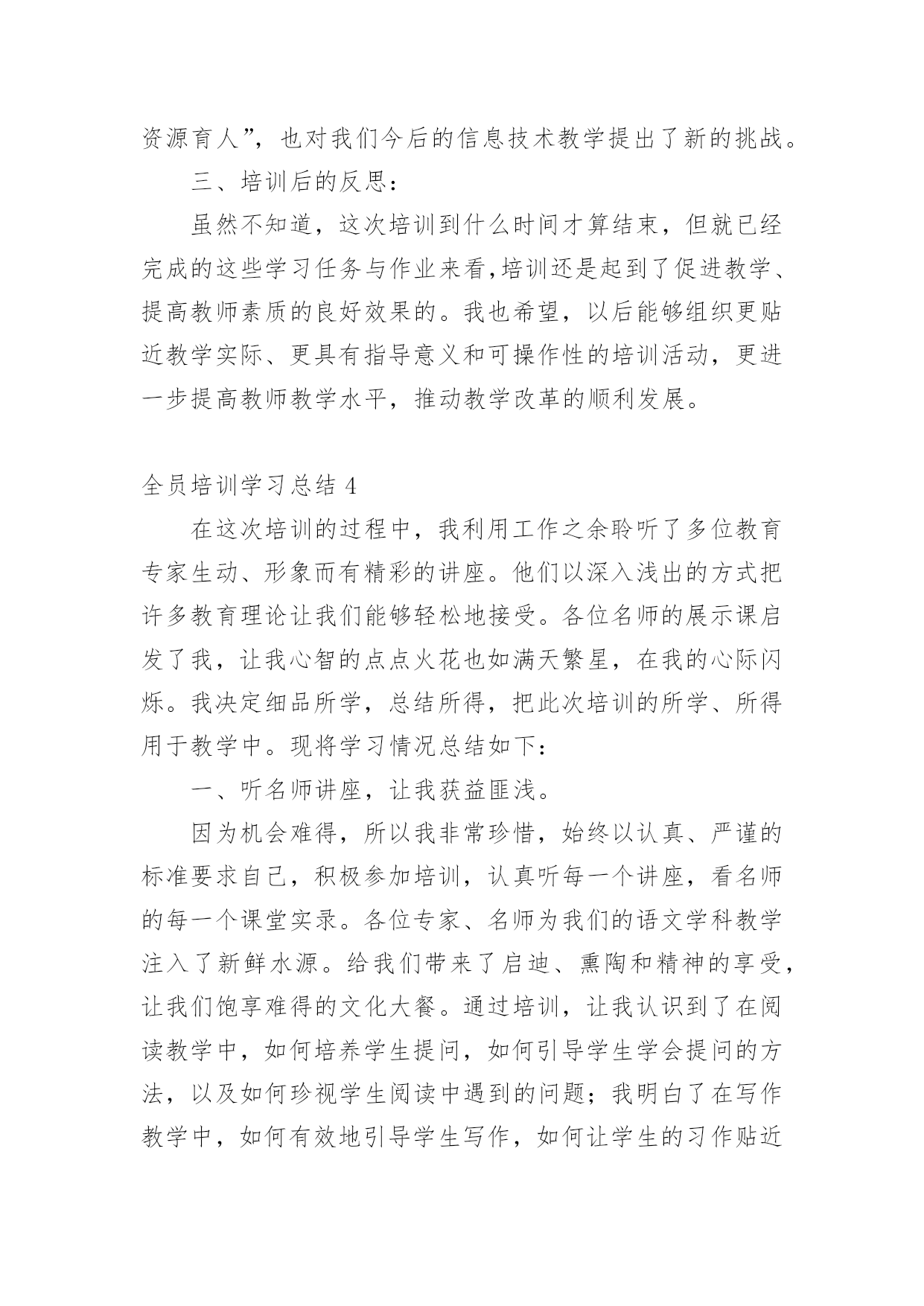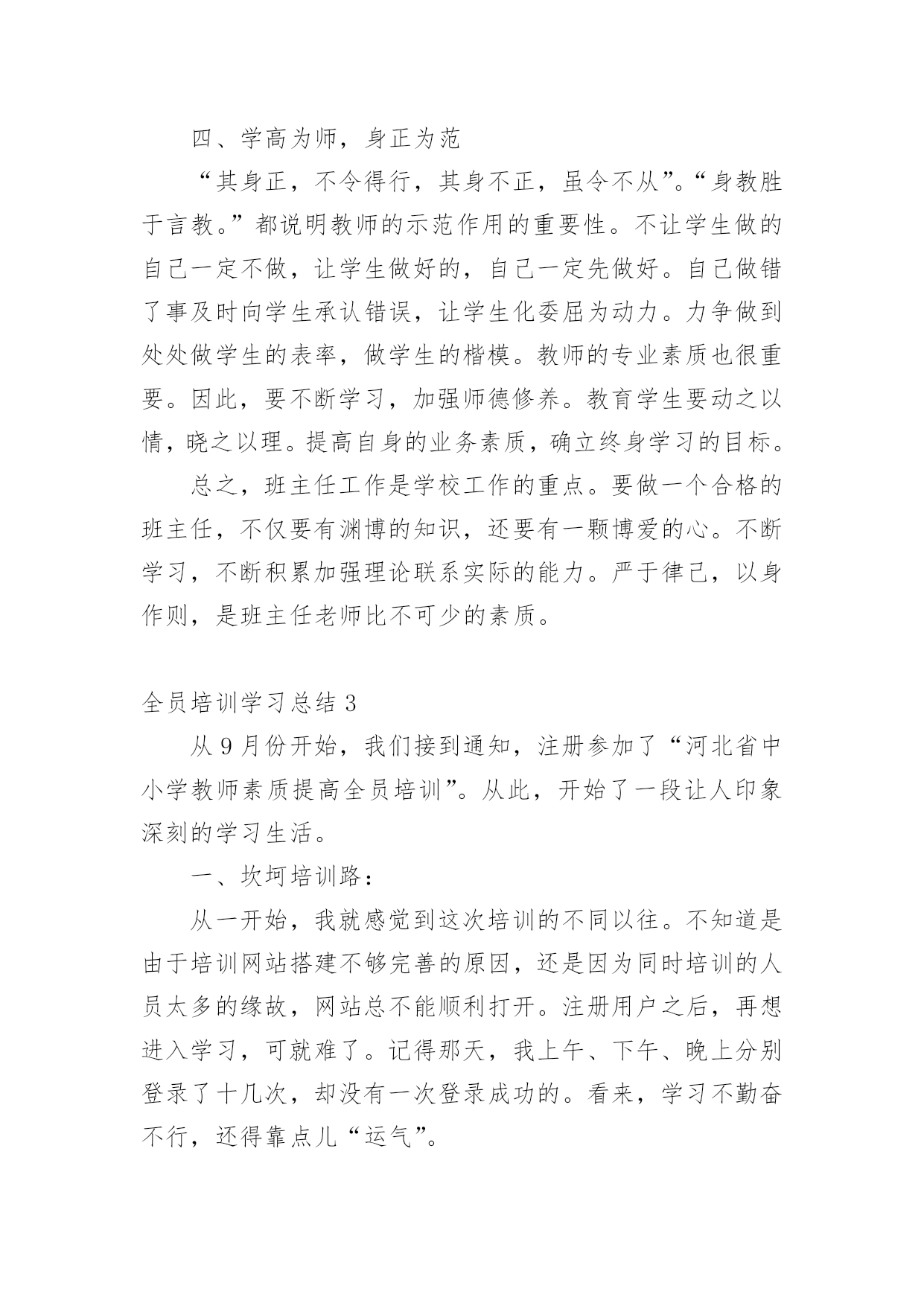 全员培训学习总结总结就是把一个时间段取得的成绩、存在的问题及得到的经验和教训进行一次全面系统的总结的书面材料,它在我们的学习、工作中起到呈上启下的作用,为此要我们写一份总结。那么我们该怎么去写总结呢?以下是小编为大家收集的全员培训学习总结,希望对大家有所帮助。全员培训学习总结1通过学习和听专家讲座等环节,我感到自己的确长了不少见识,教学思路灵活了,对自己的教学也有了新的目标和方向:首先在课堂的设计上一定要力求新颖,要能抓住学生的心,要讲求实效性,不能为了形式而活动多却没有实质内容,整堂课热闹一场却让学生无所获;教师的语言一定要有亲和力,要充分尊重学生,让他们有被重视的感觉,要做学生学习上的老师,生活中的朋友;在课堂上,教师只起一个引路的作用,不可以“满堂灌”,更不可以教师唱主角,学生作配角。另外教师的个人修养和素质也需要不断提高,要靠不断的汲取知识,学习先进经验充实自己的头脑,要有过硬的基本功。通过这么多年的教学实践,我深深的感到,要让学生喜欢你,尊重你,首先你得要在他们面前露两手,要让他们佩服你,对你心服口服。这次远程教育培训,使我对新课程教学又有了新的认识。我体会到新课程教学应该是:“学生是学习的'主体,他们应该在老师的指导下,通过自己亲自去体验、尝试,来逐渐学会生活、学会学习,从而达到从学会到会学的目的;教师要从各个方面来培养学生探究事物的兴趣和积极的态度,让他们不以学为苦,而做到以学为乐;上课的教师,首先自身素质要高,要有驾驭课堂能力,对于学生不足,教师一定要及时予以指出并指正;另外教师要善于运用启发式教学,尤其是提问题时一定要有针对性,要做到让学生有的放矢;作为教师,我想幽默、流畅、优美的语言对学生也很有吸引力。这就要求教师丰富自己的语言,有一口流利的普通话,同时也要有及时应变的能力,处理课堂上的突发事件。教师一定要注重学生探究能力的培养,让每个学生都有展示自我的机会等等。通过这种培训也让我懂得了:远程教育资源的应用不仅是服务教学,而且是服务自身,有利于自身进步。远程教育资源的作用,一是能让所有孩子一样享有优质的教育资源;二是帮助教师从繁重的工作中解放出来,让我们有时间、有精力真正用心去从事教育教学工作,不断提高自身水平。并且,我回校以后要进行校本培训,让我校所有教师的教育教学理念发生改变,视野逐渐开阔,技能大大提高,教育教学方法不断更新。教师角色的定位要求我们必须有新的教学行为方式:做学生学习与发展的促进者,做善于发现和开发学生潜能的伯乐,与学生积极互动,共同发展,做组织学生合作学习和研究性学习的引导者,做与学生平等相处、和谐发展的知心朋友。教师本人就一定要不断学习,提高自身的专业技能和素养,这次远程教育培训恰恰为我们这些基层教师提供了这样一个能与专家、同行交流的网络平台,使我们能够接触到更先进的教育理念和新的教育方法,开阔了视野。这次培训我的收获很大,也深深感到作为一名教师肩上责任的重大。教育改革的路上一定会有这样那样的问题出现,我想只要我们都能做到独善其身,一定会找到最适合社会发展和学生需求的新的教育模式和教学方法。让教育收获满园春色!全员培训学习总结2很高兴本学期参加了临江市中小学班主任全员培训。沂南县教育局做了精心准备,很多优秀教师把自己的经验介绍给我们。我认真地学习,精心研究,通过学习使我在班级管理的理念上有了一个新的思想转变,每个专题都有鲜活的案例、丰富的知识内涵及精湛的理论阐述,使我对当好班主任,抓好班级管理有了进一步的体会和认识。具体收获如下:班主任工作是一项非常辛苦和琐碎的工作,班主任不但要教好所任教的学科,还要培养一个健康向上的班集体,使每个学生德、智、体、美、劳等方面都得到充分发展,形成良好的个性品质。除了付出艰辛的劳动和辛苦的汗水外,还要有科学的教育方法和高超的教育智慧。一、尊重学生美国著名作家爱默生说过:教育成功的秘密在于尊重学生。尊重学生就是把学生看成有思想、有个性的、与成人完全平等的人。你尊重学生,学生就愿意接纳你。人是感情动物,孩子们的情感比成人更加细腻,老师一个不经意的动作,一句漫不经心的话语都会在孩子情感的湖面上荡起阵阵涟漪。“岳晓鹏”事例,使我深深的感受到:师生之间的相互尊重是何等的重要。没有爱的教育是呆板的;没有爱的教育是苍白无力的;没有爱的教育注定要失败的`。教师要做到“课上是良师;课下是益友;生活上是亲人、是朋友。教师应该用信任开启学生的心扉,用感情和爱心去感化学生,用辛勤的汗水去浇灌学生这颗幼苗。只有这样才能形成和谐的师生关系。二、注重非正式群体的引导,偶发事件的处理要有智慧,因材施教,提高教师的亲和力没有调查就没有发言权。班主任首先要深入了解,摸清班级中非正式群体的数量、类型、成员及其内部的规则特点、发展方向、权威人物等,在此基础上区别对待,因材施教,考虑如何观察
