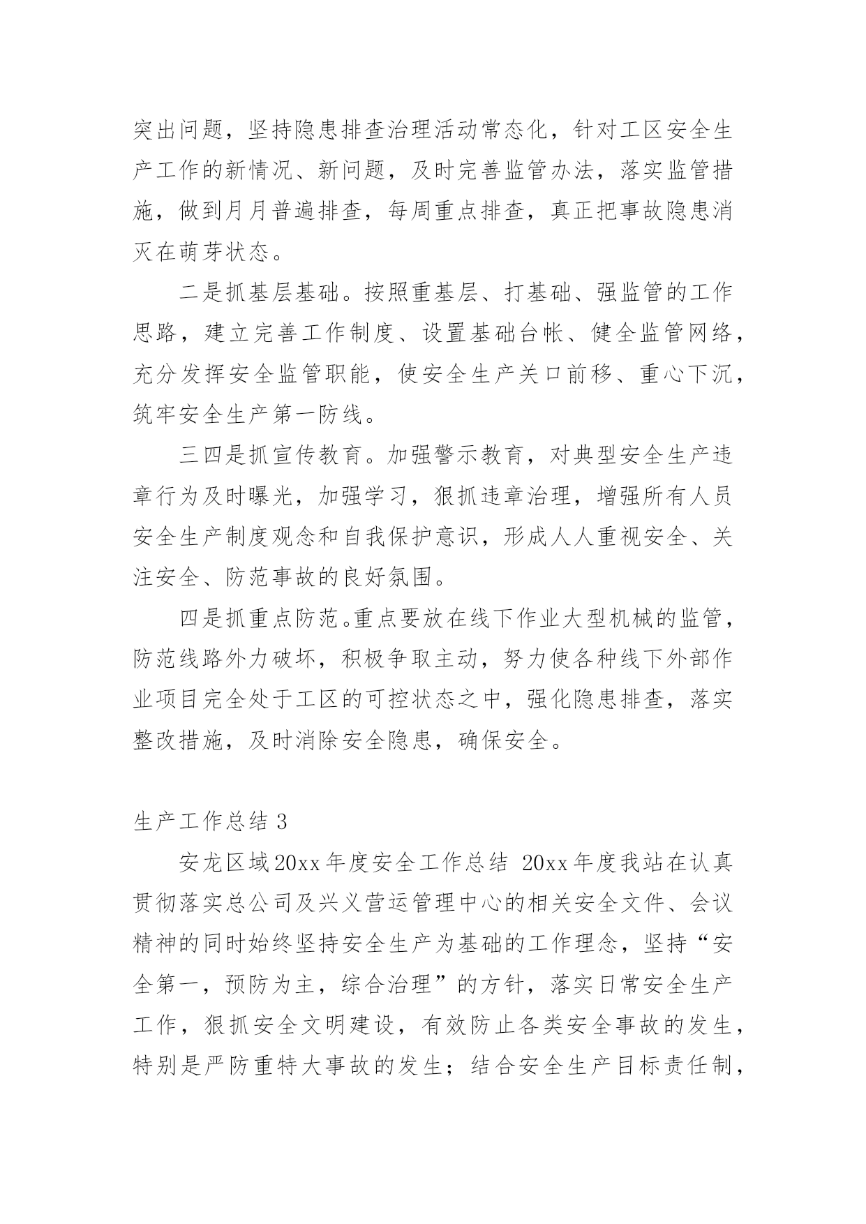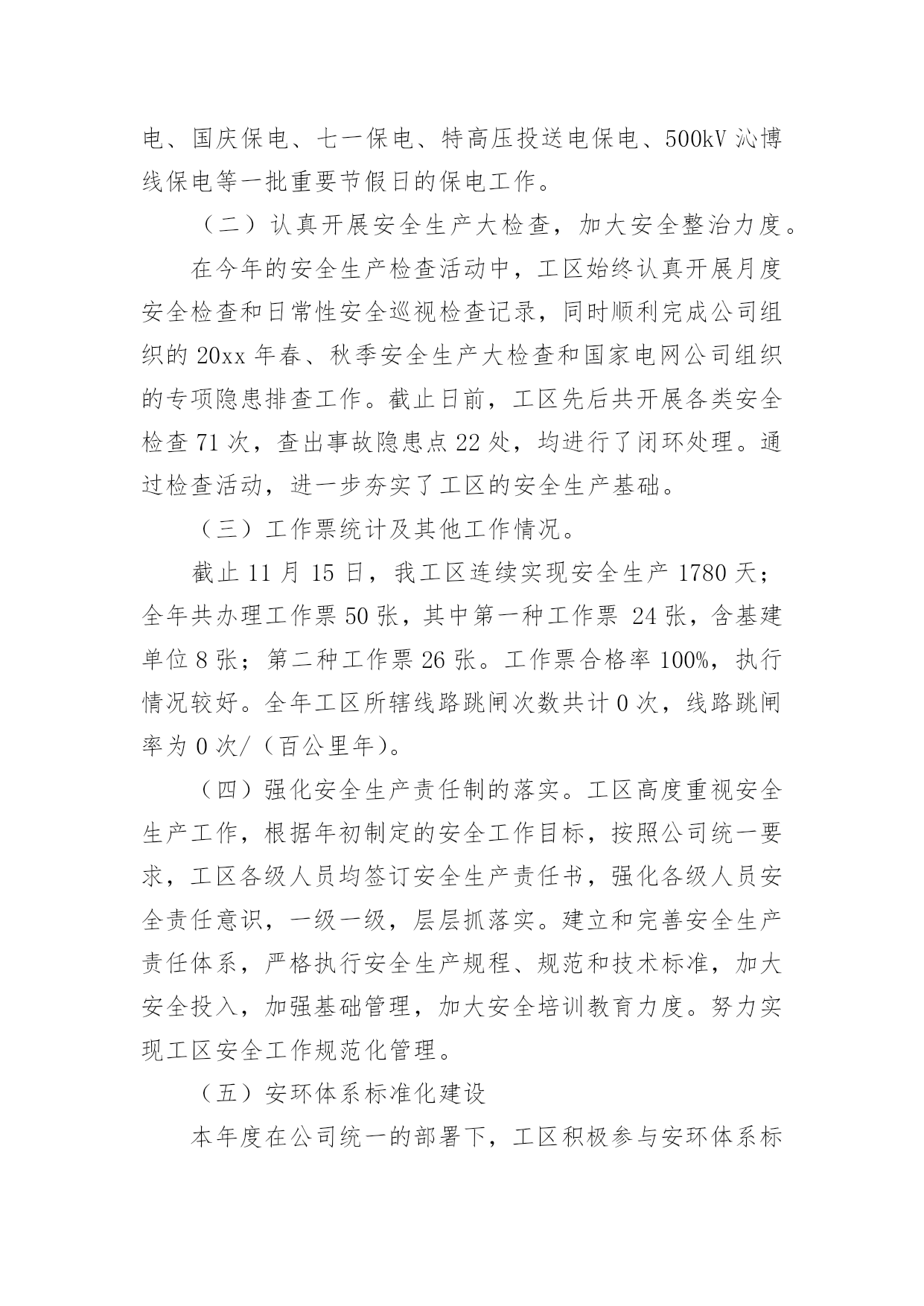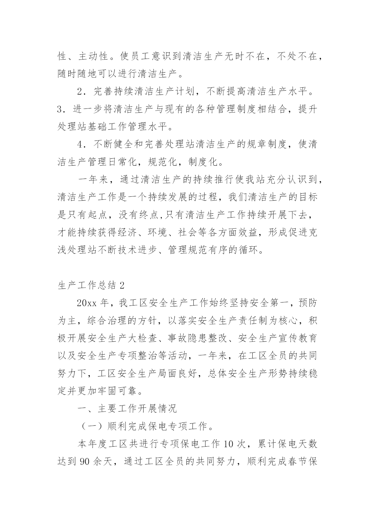 生产工作总结总结是指社会团体、企业单位和个人在自身的某一时期、某一项目或某些工作告一段落或者全部完成后进行回顾检查、分析评价,从而肯定成绩,得到经验,找出差距,得出教训和一些规律性认识的一种书面材料,它可以有效锻炼我们的语言组织能力,不妨让我们认真地完成总结吧。总结你想好怎么写了吗?以下是小编收集整理的生产工作总结,欢迎大家借鉴与参考,希望对大家有所帮助。生产工作总结120xx年,自公司推行清洁生产工作以来,克浅处理站秉着“节能”“降耗”“减污”“增效”的核心理念,积极开展一系列清洁生产相关工作,努力把克浅处理站的生产管理提高到一个新的水平。一、加强清洁生产宣传培训克浅处理站利用书报、例会的形式宣贯清洁生产的相关规定,学习清洁生产的相关知识,使全站员工正确认识实施清洁生产的重要意义。并营造清洁生产氛围和掌握清洁生产知识的不可缺少的重要形式。二、提高生产效率,优化生产系统。1、克浅处理站对沉砂池进行改造,将两作沉砂池贯通,形成回收油三段处理,将原有的两台卸油稠油泵更换为曲杆泵,并完善卸油泵房工艺流程,这样使克浅处理站两座沉砂池得到有效利用,并解决了处理站清砂期间污油不能充分回收的问题。2、新建污水系统16#污水罐,解决因污水罐设计不合理对生产系统调节造成的影响,从而提高污水处理效率。充分体现了“减污、增效”的清洁生产理念三、抓好基础工作,加强过程控制。1.狠抓各班卫生区管理,将卫生区管理工作以责任承包形式落实到各班组职责范围内。2.开展每月自检自查工作,并对查出的隐患进行专人、专项整改,坚决杜绝跑冒滴漏现象发生,建立有效的激励措施,对发现隐患及时处理、上报、解决的员工进行奖励。3.根据生产实际及时调节生产系统温度、压力、流量、加药浓度等生产参数。根据气温及时调节净化油外输油温、保温蒸汽压力等值。4.加强破乳剂用量的监测及调整,根据原油含水率、污水外排率等值。时时调整正、反相破乳剂用量。四、做好废弃物回收处理工作1.建立废旧电池回收箱,杜约废旧电池对环境造成破坏。2.化验废溶剂油、清洗油做到定点回收,及时处理。3.将废旧物资回收到废料堆,并进行分类、妥善保管。五、改造生产设备,优化工作环境六、发挥党员模范带头作用五、下步工作计划1.继续强化学习培训,提高员工清洁生产意识,使清洁生产理念在员工心里扎根,增强员工参与清洁生产的积极性、主动性。使员工意识到清洁生产无时不在,不处不在,随时随地可以进行清洁生产。2.完善持续清洁生产计划,不断提高清洁生产水平。3.进一步将清洁生产与现有的各种管理制度相结合,提升处理站基础工作管理水平。4.不断健全和完善处理站清洁生产的规章制度,使清洁生产管理日常化,规范化,制度化。一年来,通过清洁生产的持续推行使我站充分认识到,清洁生产工作是一个持续发展的过程,我们清洁生产的目标是只有起点,没有终点,只有清洁生产工作持续开展下去,才能持续获得经济、环境、社会等各方面效益,形成促进克浅处理站不断技术进步、管理规范有序的循环。生产工作总结220xx年,我工区安全生产工作始终坚持安全第一,预防为主,综合治理的方针,以落实安全生产责任制为核心,积极开展安全生产大检查、事故隐患整改、安全生产宣传教育以及安全生产专项整治等活动,一年来,在工区全员的共同努力下,工区安全生产局面良好,总体安全生产形势持续稳定并更加牢固可靠。一、主要工作开展情况(一)顺利完成保电专项工作。本年度工区共进行专项保电工作10次,累计保电天数达到90余天,通过工区全员的共同努力,顺利完成春节保电、国庆保电、七一保电、特高压投送电保电、500kV沁博线保电等一批重要节假日的保电工作。(二)认真开展安全生产大检查,加大安全整治力度。在今年的安全生产检查活动中,工区始终认真开展月度安全检查和日常性安全巡视检查记录,同时顺利完成公司组织的20xx年春、秋季安全生产大检查和国家电网公司组织的专项隐患排查工作。截止日前,工区先后共开展各类安全检查71次,查出事故隐患点22处,均进行了闭环处理。通过检查活动,进一步夯实了工区的安全生产基础。(三)工作票统计及其他工作情况。截止11月15日,我工区连续实现安全生产1780天;全年共办理工作票50张,其中第一种工作票24张,含基建单位8张;第二种工作票26张。工作票合格率100%,执行情况较好。全年工区所辖线路跳闸次数共计0次,线路跳闸率为0次/(百公里年)。(四)强化安全生产责任制的落实。工区高度重视安全生产工作,根据年初制定的安全工作目标,按照公司统一要求,工区各级人员均签订安全生产责任书,强化各级人员安全责任意识,一级一级,层层抓落实。建立和完善安全生产责任体系,严格执行安全生产规程、规范和技术标准,加大安全投入,加强基础管理,加大安全培训教育力度。努力实现工区安全工作规范化管理。(五)安环体系标准化建设