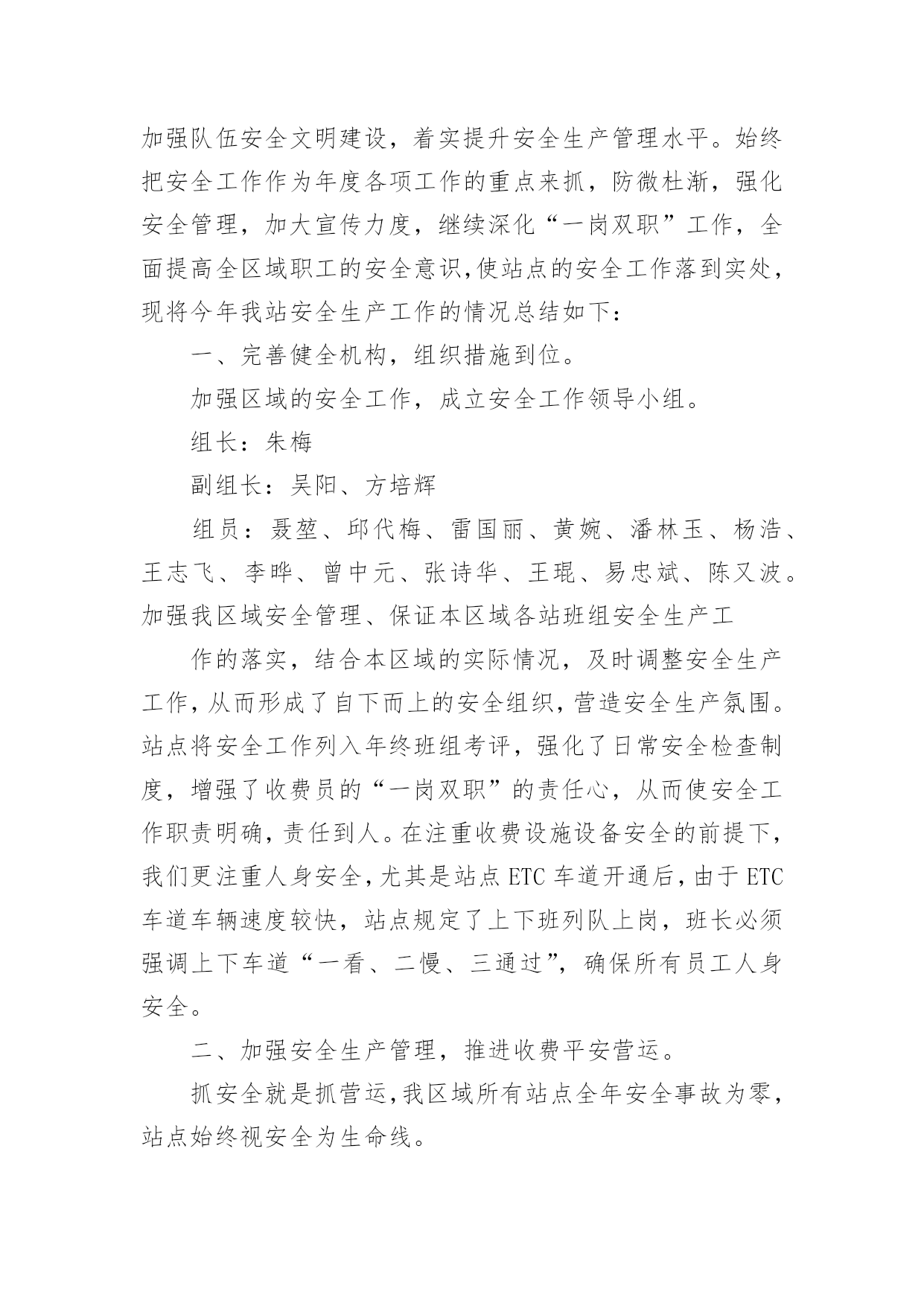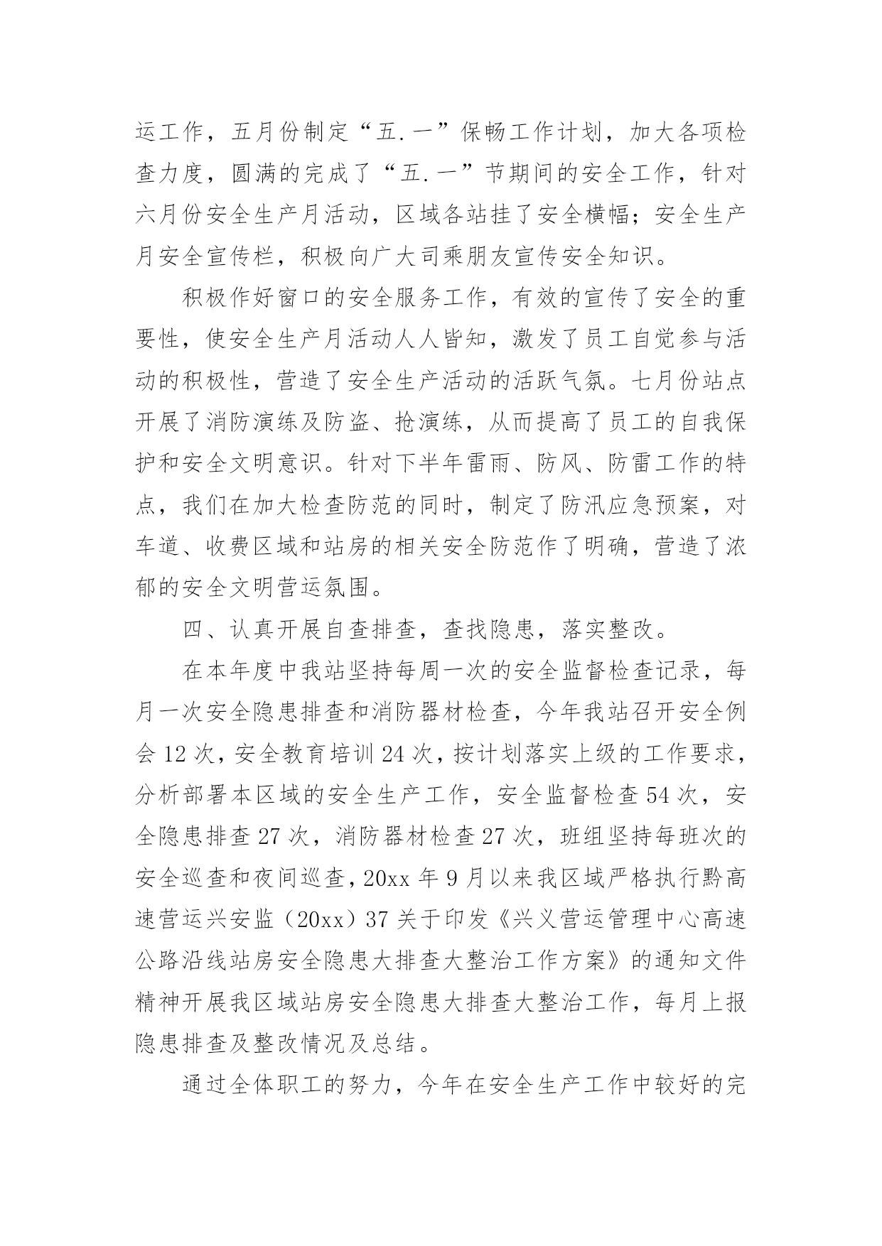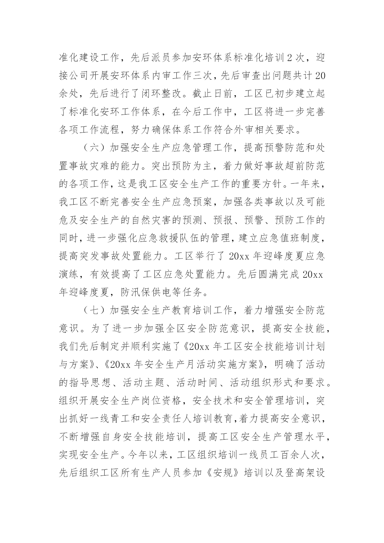 生产工作总结总结是指社会团体、企业单位和个人在自身的某一时期、某一项目或某些工作告一段落或者全部完成后进行回顾检查、分析评价,从而肯定成绩,得到经验,找出差距,得出教训和一些规律性认识的一种书面材料,它可以有效锻炼我们的语言组织能力,不妨让我们认真地完成总结吧。总结你想好怎么写了吗?以下是小编收集整理的生产工作总结,欢迎大家借鉴与参考,希望对大家有所帮助。生产工作总结120xx年,自公司推行清洁生产工作以来,克浅处理站秉着“节能”“降耗”“减污”“增效”的核心理念,积极开展一系列清洁生产相关工作,努力把克浅处理站的生产管理提高到一个新的水平。一、加强清洁生产宣传培训克浅处理站利用书报、例会的形式宣贯清洁生产的相关规定,学习清洁生产的相关知识,使全站员工正确认识实施清洁生产的重要意义。并营造清洁生产氛围和掌握清洁生产知识的不可缺少的重要形式。二、提高生产效率,优化生产系统。1、克浅处理站对沉砂池进行改造,将两作沉砂池贯通,形成回收油三段处理,将原有的两台卸油稠油泵更换为曲杆泵,并完善卸油泵房工艺流程,这样使克浅处理站两座沉砂池得到有效利用,并解决了处理站清砂期间污油不能充分回收的问题。2、新建污水系统16#污水罐,解决因污水罐设计不合理对生产系统调节造成的影响,从而提高污水处理效率。充分体现了“减污、增效”的清洁生产理念三、抓好基础工作,加强过程控制。1.狠抓各班卫生区管理,将卫生区管理工作以责任承包形式落实到各班组职责范围内。2.开展每月自检自查工作,并对查出的隐患进行专人、专项整改,坚决杜绝跑冒滴漏现象发生,建立有效的激励措施,对发现隐患及时处理、上报、解决的员工进行奖励。3.根据生产实际及时调节生产系统温度、压力、流量、加药浓度等生产参数。根据气温及时调节净化油外输油温、保温蒸汽压力等值。4.加强破乳剂用量的监测及调整,根据原油含水率、污水外排率等值。时时调整正、反相破乳剂用量。四、做好废弃物回收处理工作1.建立废旧电池回收箱,杜约废旧电池对环境造成破坏。2.化验废溶剂油、清洗油做到定点回收,及时处理。3.将废旧物资回收到废料堆,并进行分类、妥善保管。五、改造生产设备,优化工作环境六、发挥党员模范带头作用五、下步工作计划1.继续强化学习培训,提高员工清洁生产意识,使清洁生产理念在员工心里扎根,增强员工参与清洁生产的积极性、主动性。使员工意识到清洁生产无时不在,不处不在,随时随地可以进行清洁生产。2.完善持续清洁生产计划,不断提高清洁生产水平。3.进一步将清洁生产与现有的各种管理制度相结合,提升处理站基础工作管理水平。4.不断健全和完善处理站清洁生产的规章制度,使清洁生产管理日常化,规范化,制度化。一年来,通过清洁生产的持续推行使我站充分认识到,清洁生产工作是一个持续发展的过程,我们清洁生产的目标是只有起点,没有终点,只有清洁生产工作持续开展下去,才能持续获得经济、环境、社会等各方面效益,形成促进克浅处理站不断技术进步、管理规范有序的循环。生产工作总结220xx年,我工区安全生产工作始终坚持安全第一,预防为主,综合治理的方针,以落实安全生产责任制为核心,积极开展安全生产大检查、事故隐患整改、安全生产宣传教育以及安全生产专项整治等活动,一年来,在工区全员的共同努力下,工区安全生产局面良好,总体安全生产形势持续稳定并更加牢固可靠。一、主要工作开展情况(一)顺利完成保电专项工作。本年度工区共进行专项保电工作10次,累计保电天数达到90余天,通过工区全员的共同努力,顺利完成春节保电、国庆保电、七一保电、特高压投送电保电、500kV沁博线保电等一批重要节假日的保电工作。(二)认真开展安全生产大检查,加大安全整治力度。在今年的安全生产检查活动中,工区始终认真开展月度安全检查和日常性安全巡视检查记录,同时顺利完成公司组织的20xx年春、秋季安全生产大检查和国家电网公司组织的专项隐患排查工作。截止日前,工区先后共开展各类安全检查71次,查出事故隐患点22处,均进行了闭环处理。通过检查活动,进一步夯实了工区的安全生产基础。(三)工作票统计及其他工作情况。截止11月15日,我工区连续实现安全生产1780天;全年共办理工作票50张,其中第一种工作票24张,含基建单位8张;第二种工作票26张。工作票合格率100%,执行情况较好。全年工区所辖线路跳闸次数共计0次,线路跳闸率为0次/(百公里年)。(四)强化安全生产责任制的落实。工区高度重视安全生产工作,根据年初制定的安全工作目标,按照公司统一要求,工区各级人员均签订安全生产责任书,强化各级人员安全责任意识,一级一级,层层抓落实。建立和完善安全生产责任体系,严格执行安全生产规程、规范和技术标准,加大安全投入,加强基础管理,加大安全培训教育力度。努力实现工区安全工作规范化管理。(五)安环体系标准化建设