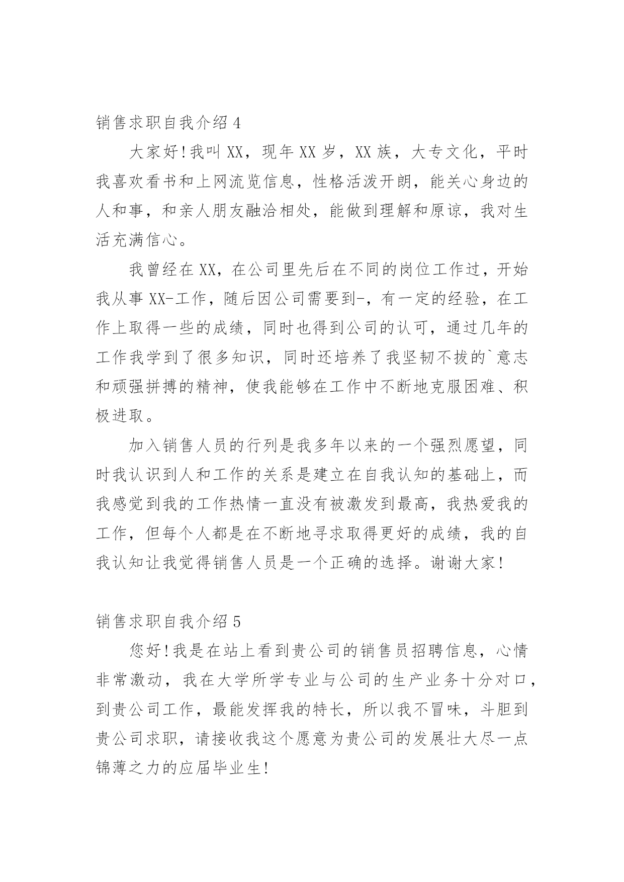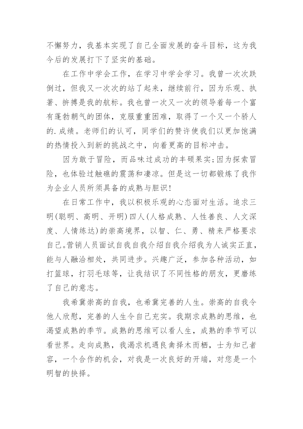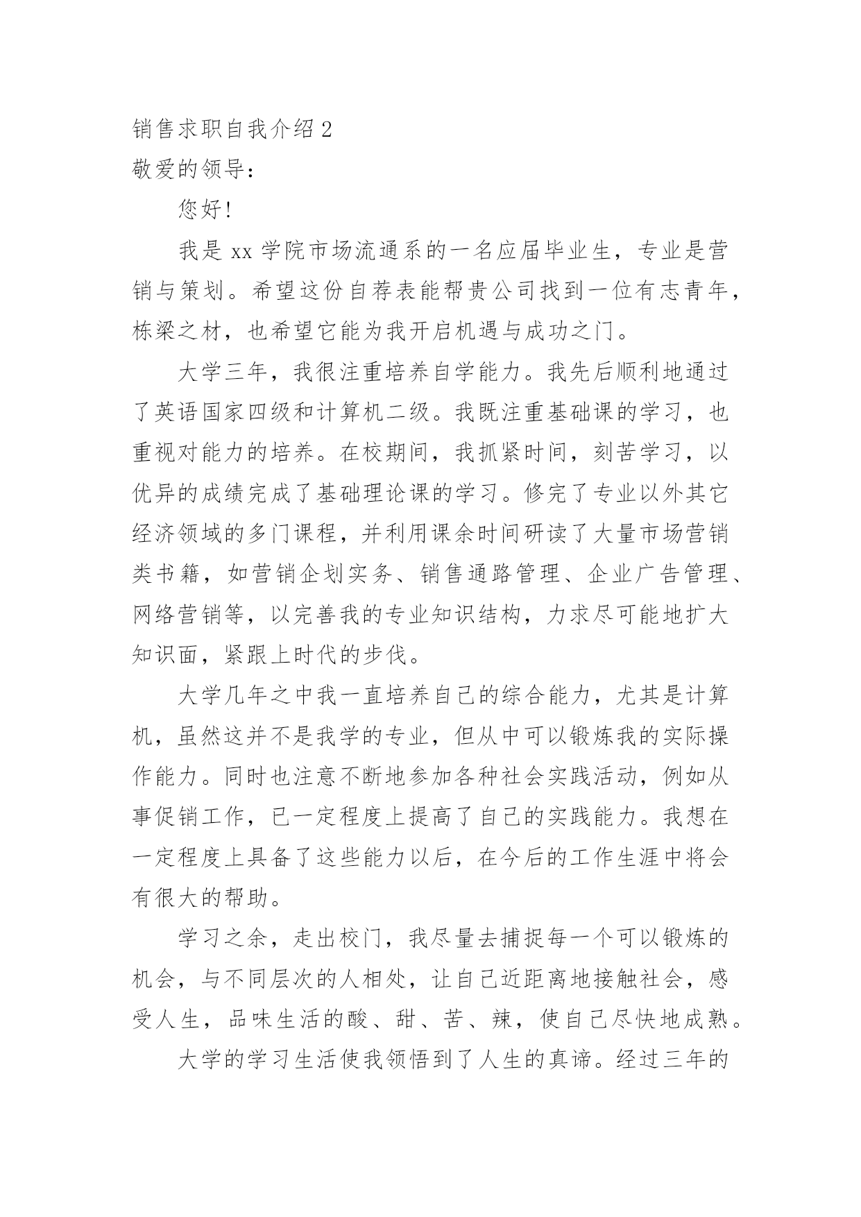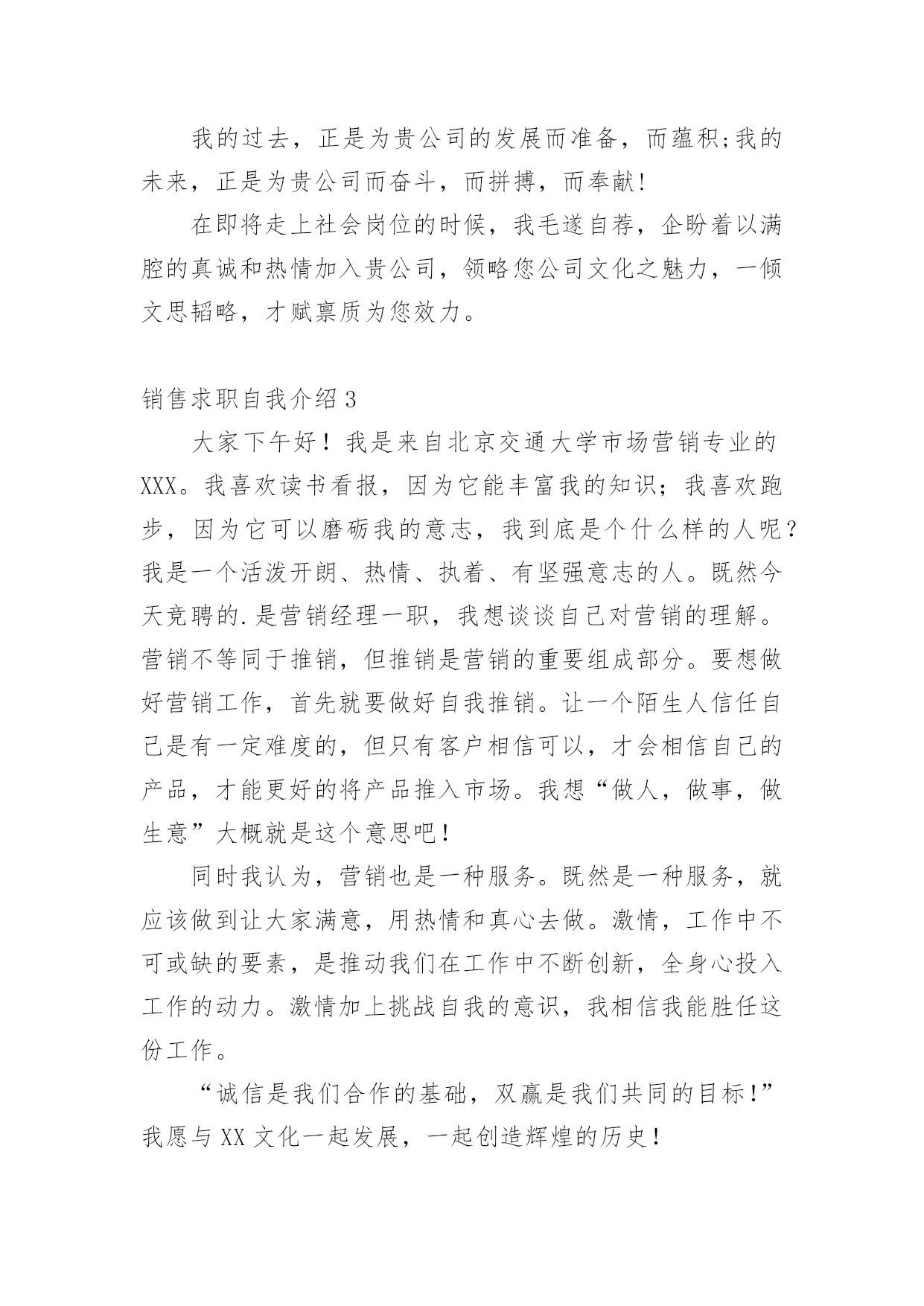 销售求职自我介绍当进入一个新环境,我们难以避免地要作出自我介绍,用自我介绍往往可以让他人有一定的了解。现在你是否对自我介绍一筹莫展呢?以下是小编帮大家整理的销售求职自我介绍,仅供参考,欢迎大家阅读。销售求职自我介绍1您好,作为汽车销售专业的一名应届毕业生。在学校期间,我始终以提高自身的综合素质为目标,以自我的全面发展为努力方向,树立正确的人生观、价值观和世界观。通过四年的学习和生活,并参加了多次社会实践,我有健全的人生观,个人简历wdjl。net,正确的政治方向,有一定的分析问题、解决问题的能力,有较强的.动手能力。本人了解中国汽车产业发展动态方向,特别是汽车后市场服务领域。知道汽车维修行业发展现状及趋势。善于学习新的知识方法工艺,分析和解决问题的能力强,能够熟练的利用互联网查询汽车维修资料,收集本行业最新信息。脚踏实地是一个立足社会的根本,也是我时刻铭记的一句话。拥有良好的职业素质和职业操守,能够忠于自己的企业,将个人的职业生涯规划与企业的发展紧密的结合。勇于创新,善于开创,能承受较高的工作压力;吃苦耐劳,注重合作,具有年轻人火一样的工作热情和活力。销售求职自我介绍2敬爱的领导:您好!我是xx学院市场流通系的一名应届毕业生,专业是营销与策划。希望这份自荐表能帮贵公司找到一位有志青年,栋梁之材,也希望它能为我开启机遇与成功之门。大学三年,我很注重培养自学能力。我先后顺利地通过了英语国家四级和计算机二级。我既注重基础课的学习,也重视对能力的培养。在校期间,我抓紧时间,刻苦学习,以优异的成绩完成了基础理论课的学习。修完了专业以外其它经济领域的多门课程,并利用课余时间研读了大量市场营销类书籍,如营销企划实务、销售通路管理、企业广告管理、网络营销等,以完善我的专业知识结构,力求尽可能地扩大知识面,紧跟上时代的步伐。大学几年之中我一直培养自己的综合能力,尤其是计算机,虽然这并不是我学的专业,但从中可以锻炼我的实际操作能力。同时也注意不断地参加各种社会实践活动,例如从事促销工作,已一定程度上提高了自己的实践能力。我想在一定程度上具备了这些能力以后,在今后的工作生涯中将会有很大的帮助。学习之余,走出校门,我尽量去捕捉每一个可以锻炼的机会,与不同层次的人相处,让自己近距离地接触社会,感受人生,品味生活的酸、甜、苦、辣,使自己尽快地成熟。大学的学习生活使我领悟到了人生的真谛。经过三年的不懈努力,我基本实现了自己全面发展的奋斗目标,这为我今后的发展打下了坚实的基础。在工作中学会工作,在学习中学会学习。我曾一次次跌倒过,但我又一次次的站了起来,继续前行,因为乐观、执著、拚搏是我的航标。我也曾一次又一次的领导着每一个富有蓬勃朝气的团体,克服重重困难,取得了一个又一个骄人的.成绩。老师们的认可,同学们的赞许使我们以更加饱满的热情投入到新的挑战之中,向着更高的目标冲击。因为敢于冒险,而品味过成功的丰硕果实;因为探索冒险,也体验过触礁的震荡和凄凉。但是这一切都锻炼了我作为企业人员所须具备的成熟与胆识!在日常工作中,我以积极乐观的心态面对生活。追求三明(聪明、高明、开明)四人(人格成熟、人性善良、人文深度、人情练达)的崇高境界,以智、仁、勇、精来严格要求自己。营销人员面试自我自我介绍自我介绍我为人诚实正直,能与人融洽相处,共同进步。兴趣广泛,参加各种活动,如打篮球,打羽毛球等,让我结识了不同性格的朋友,更磨练了自己的意志。我希冀崇高的自我,也希冀完善的人生。崇高的自我令他人欣慰,完善的人生令自己充实。我期求成熟的思维,也渴望成熟的季节。成熟的思维可以看人生,成熟的季节可以看世界。走向成熟,我渴求机遇良禽择木而栖,士为知己者容,一个合作的机会,对我是一次良好的开端,对您是一个明智的抉择。我的过去,正是为贵公司的发展而准备,而蕴积;我的未来,正是为贵公司而奋斗,而拼搏,而奉献!在即将走上社会岗位的时候,我毛遂自荐,企盼着以满腔的真诚和热情加入贵公司,领略您公司文化之魅力,一倾文思韬略,才赋禀质为您效力。销售求职自我介绍3大家下午好!我是来自北京交通大学市场营销专业的XXX。我喜欢读书看报,因为它能丰富我的知识;我喜欢跑步,因为它可以磨砺我的意志,我到底是个什么样的人呢?我是一个活泼开朗、热情、执着、有坚强意志的人。既然今天竞聘的.是营销经理一职,我想谈谈自己对营销的理解。营销不等同于推销,但推销是营销的重要组成部分。要想做好营销工作,首先就要做好自我推销。让一个陌生人信任自己是有一定难度的,但只有客户相信可以,才会相信自己的产品,才能更好的将产品推入市场。我想“做人,做事,做生意”大概就是这个意思吧!同时我认为,营销也是一种服务。既然是一种服务,就应该做到让大家满意,用热情和真心去做。激情,工作中不可或缺的要素,是推动我们在工作中不断创新,全身心投入工作的动