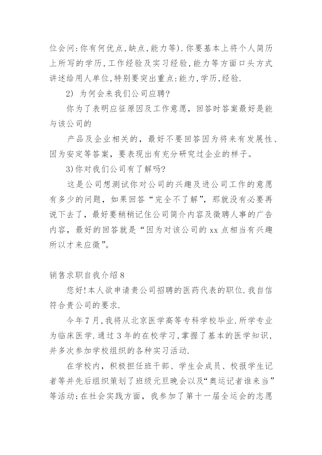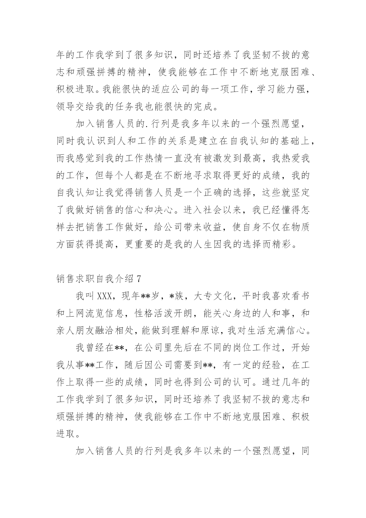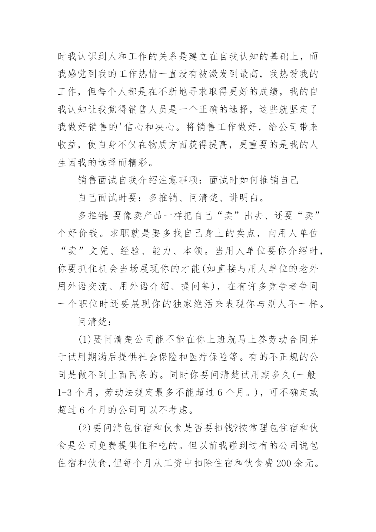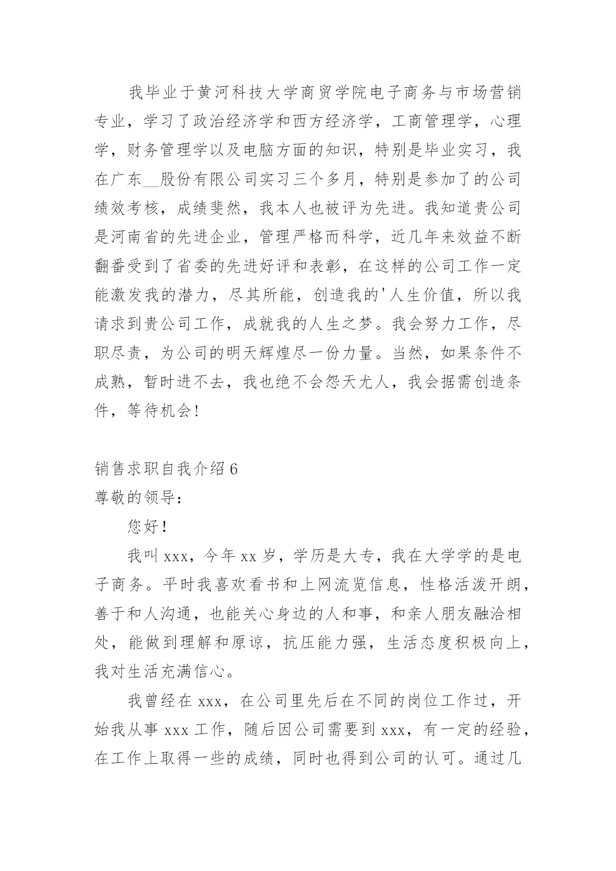 销售求职自我介绍当进入一个新环境,我们难以避免地要作出自我介绍,用自我介绍往往可以让他人有一定的了解。现在你是否对自我介绍一筹莫展呢?以下是小编帮大家整理的销售求职自我介绍,仅供参考,欢迎大家阅读。销售求职自我介绍1您好,作为汽车销售专业的一名应届毕业生。在学校期间,我始终以提高自身的综合素质为目标,以自我的全面发展为努力方向,树立正确的人生观、价值观和世界观。通过四年的学习和生活,并参加了多次社会实践,我有健全的人生观,个人简历wdjl。net,正确的政治方向,有一定的分析问题、解决问题的能力,有较强的.动手能力。本人了解中国汽车产业发展动态方向,特别是汽车后市场服务领域。知道汽车维修行业发展现状及趋势。善于学习新的知识方法工艺,分析和解决问题的能力强,能够熟练的利用互联网查询汽车维修资料,收集本行业最新信息。脚踏实地是一个立足社会的根本,也是我时刻铭记的一句话。拥有良好的职业素质和职业操守,能够忠于自己的企业,将个人的职业生涯规划与企业的发展紧密的结合。勇于创新,善于开创,能承受较高的工作压力;吃苦耐劳,注重合作,具有年轻人火一样的工作热情和活力。销售求职自我介绍2敬爱的领导:您好!我是xx学院市场流通系的一名应届毕业生,专业是营销与策划。希望这份自荐表能帮贵公司找到一位有志青年,栋梁之材,也希望它能为我开启机遇与成功之门。大学三年,我很注重培养自学能力。我先后顺利地通过了英语国家四级和计算机二级。我既注重基础课的学习,也重视对能力的培养。在校期间,我抓紧时间,刻苦学习,以优异的成绩完成了基础理论课的学习。修完了专业以外其它经济领域的多门课程,并利用课余时间研读了大量市场营销类书籍,如营销企划实务、销售通路管理、企业广告管理、网络营销等,以完善我的专业知识结构,力求尽可能地扩大知识面,紧跟上时代的步伐。大学几年之中我一直培养自己的综合能力,尤其是计算机,虽然这并不是我学的专业,但从中可以锻炼我的实际操作能力。同时也注意不断地参加各种社会实践活动,例如从事促销工作,已一定程度上提高了自己的实践能力。我想在一定程度上具备了这些能力以后,在今后的工作生涯中将会有很大的帮助。学习之余,走出校门,我尽量去捕捉每一个可以锻炼的机会,与不同层次的人相处,让自己近距离地接触社会,感受人生,品味生活的酸、甜、苦、辣,使自己尽快地成熟。大学的学习生活使我领悟到了人生的真谛。经过三年的不懈努力,我基本实现了自己全面发展的奋斗目标,这为我今后的发展打下了坚实的基础。在工作中学会工作,在学习中学会学习。我曾一次次跌倒过,但我又一次次的站了起来,继续前行,因为乐观、执著、拚搏是我的航标。我也曾一次又一次的领导着每一个富有蓬勃朝气的团体,克服重重困难,取得了一个又一个骄人的.成绩。老师们的认可,同学们的赞许使我们以更加饱满的热情投入到新的挑战之中,向着更高的目标冲击。因为敢于冒险,而品味过成功的丰硕果实;因为探索冒险,也体验过触礁的震荡和凄凉。但是这一切都锻炼了我作为企业人员所须具备的成熟与胆识!在日常工作中,我以积极乐观的心态面对生活。追求三明(聪明、高明、开明)四人(人格成熟、人性善良、人文深度、人情练达)的崇高境界,以智、仁、勇、精来严格要求自己。营销人员面试自我自我介绍自我介绍我为人诚实正直,能与人融洽相处,共同进步。兴趣广泛,参加各种活动,如打篮球,打羽毛球等,让我结识了不同性格的朋友,更磨练了自己的意志。我希冀崇高的自我,也希冀完善的人生。崇高的自我令他人欣慰,完善的人生令自己充实。我期求成熟的思维,也渴望成熟的季节。成熟的思维可以看人生,成熟的季节可以看世界。走向成熟,我渴求机遇良禽择木而栖,士为知己者容,一个合作的机会,对我是一次良好的开端,对您是一个明智的抉择。我的过去,正是为贵公司的发展而准备,而蕴积;我的未来,正是为贵公司而奋斗,而拼搏,而奉献!在即将走上社会岗位的时候,我毛遂自荐,企盼着以满腔的真诚和热情加入贵公司,领略您公司文化之魅力,一倾文思韬略,才赋禀质为您效力。销售求职自我介绍3大家下午好!我是来自北京交通大学市场营销专业的XXX。我喜欢读书看报,因为它能丰富我的知识;我喜欢跑步,因为它可以磨砺我的意志,我到底是个什么样的人呢?我是一个活泼开朗、热情、执着、有坚强意志的人。既然今天竞聘的.是营销经理一职,我想谈谈自己对营销的理解。营销不等同于推销,但推销是营销的重要组成部分。要想做好营销工作,首先就要做好自我推销。让一个陌生人信任自己是有一定难度的,但只有客户相信可以,才会相信自己的产品,才能更好的将产品推入市场。我想“做人,做事,做生意”大概就是这个意思吧!同时我认为,营销也是一种服务。既然是一种服务,就应该做到让大家满意,用热情和真心去做。激情,工作中不可或缺的要素,是推动我们在工作中不断创新,全身心投入工作的动