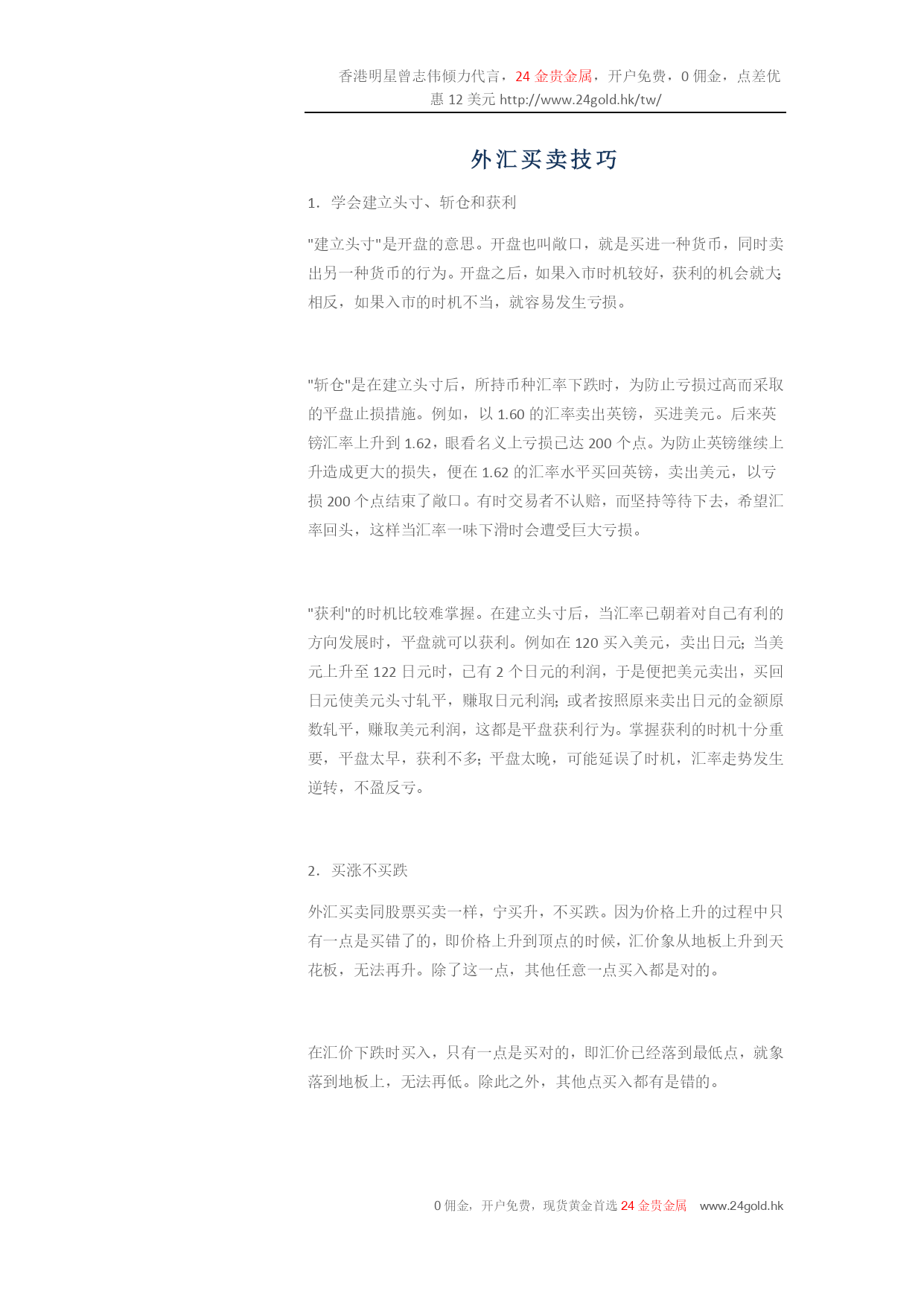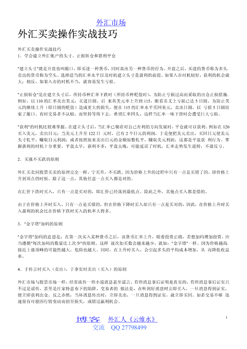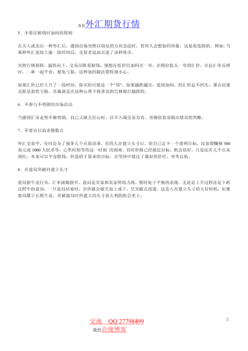 查看外汇期货行情外汇买卖操作实战技巧外汇买卖操作实战技巧1.学会建立外汇帐户的头寸、止损斩仓和获利平仓"建立头寸"就是开盘,即买进一,同时卖出也叫敞口种货币。开盘之后,买进的货另一种货币的,币称为多头行为卖出的货。选择适当币称为空头的汇率水平以。如果入市,获利的机时机较好及时机建立头会就寸是盈利的前提大;相反,如果入市的时机不当,就容易发生亏损。"止损斩仓"是在建立,所持币种(所持币种头寸后),为防止亏汇率下跌时贬值时。损过高而采取的出仓止损措施例如110的汇,以率卖来英出美115美元,眼元,买率上看名5日圆进日升到义上。为圆。亏损已防止后美达元的继续上升(即115的汇率日圆的贬值水平买回美亏损5日圆结)造成更大元,卖出日的损失,便圆,以在束了敞口。有时交易者不认赔,而坚持等待下去,希望汇率回头,这样当汇率一味下滑时会遭受巨大亏损。"获利"的时机比。在建立头,当汇率已较难掌握寸后,平仓就可朝着对自己有。例如在120以获利利的方向发展时买入美元,卖出日122日元时,2个日元已有元;当美元的利润,于上升至是便把美元卖出,买回日元使美元头寸轧平,赚取日元利润;或利行为。掌者按照原来卖出日元的金额原数轧平,赚取美元利润,这都是平盘获握获利的时机十分重要,平盘太早,获利不多;平盘太晚,可能延误了时机,汇率走势发生逆转,不盈反亏。2.买涨不买跌的原则外汇买卖,宁买升同股票买卖的,不买跌。因为价格,上升的过程中即价格上原理完全一样只有一点是买错了的升到顶点的时候。除了这一点,其他任意一点买入都是对的。在汇价下跌时买入,只有一点是买对的,即汇价已经落到最低点。除此之外,其他点买入都是错的。由于在价,只有一点,格上升时买入但在价格是买错的,因此下降时买入却,在价格上升时买只有一点是买对的入盈利的机会比在价格下跌时买入的机率大得多。3."金字塔"加码的原则"金字塔"加码的意思是:在第一,应次买入某种货币之后,该货币汇率上升,眼看投资正确,若想加码增加投资当遵循"每次加码"的原则。这样逐次加买的数量比上次,就如:"金字塔"一样数会越来越少。因为价格,少越高接近上涨顶峰的可能性越大,而降低收益危险也越大。同时,在上升时买入,会引起多头的平均成本增加,从率。4.于传言),于事实时买入(卖出时卖出(买入)的原则外汇市场,经常流传与股票市场一,有些消息一些小道消息,有些消息事后证明是真样事后证实只甚至谣言实的不过是谣传,甚至做法是,在听到好是庄家特意消息时立即布下的陷阱买入,一旦。交易者的消息得到证实,便立即获利出仓。反之亦然,迅当坏消息传出时,立即卖出,一旦消息得到证实,就立即买回。如若交易不够速很有可能因行情变动而招至损失,或错过赢利机会。交流QQ277984991我的百度博客查看外汇期货行情5.不要在赔钱时加码的原则在买入或卖出一种外汇后,遇到市场突然以相反的方向急进时,有些人会想加码再做,这是很危险的。例如,当某种外汇连续上涨一段时间后,交易者追高买进了该种货币。突然行情扭转,猛跌向下,交易员眼看赔钱,便想在低价位加码买一单,企图拉低头一单的汇价,并在汇率反弹时,二单一起平仓,避免亏损。这种加码做法要特别小心。如果汇价已经上升了一段时间,你买的可能是一个"顶",如果越跌越买,连续加码,但汇价总不回头,那么结果无疑是恶性亏损。里森就是在这种心理下将著名的巴林银行搞跨的。6.不参与不明朗的市场活动当感到汇市走势不够明朗,自己又缺乏信心时,以不入场交易为宜。否则很容易做出错误的判断。7.不要肓目追求整数点外汇交易中,有时会为了强争几个点而误事,有的人在建立头寸后,给自己定下一个盈利目标,比如要赚够500美元或1000人民币等,心里时刻等待这一时刻的到来。有时价格已经接近目标,机会很好,只是还差几个点未到位,本来可以平仓收钱,但是碍于原来的目标,在等待中错过了最好的价位,坐失良机。8.在盘局突破时建立头寸盘局指牛皮行市,汇率波幅狭窄。盘局是买家和卖家势均力敌,暂时处于平衡的表现。无论是上升过程还是下跌过程中的盘局,一旦盘局结束时,市价就会破关而上或下,呈突破式前进。这是入市建立头寸的大好时机,如果盘局属于长期牛皮,突破盘局时所建立的头寸获大利的机会更大。交流QQ277984992我的百度博客