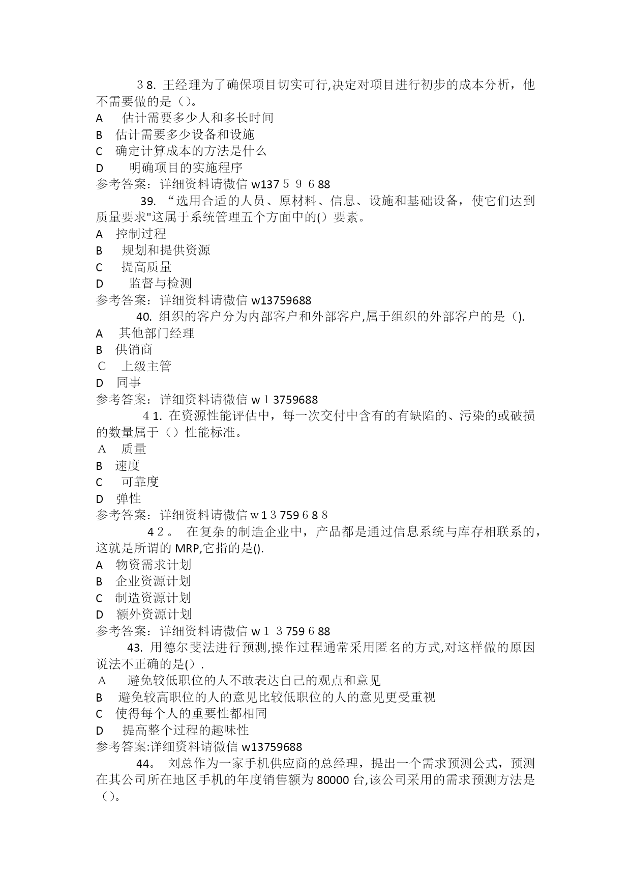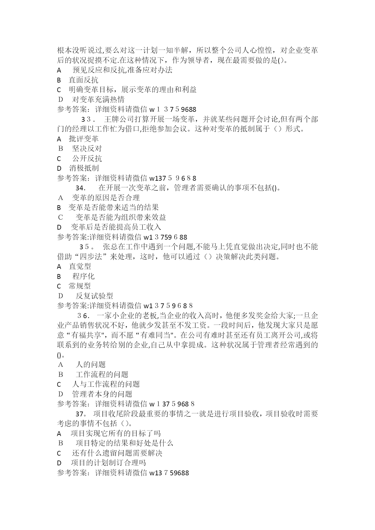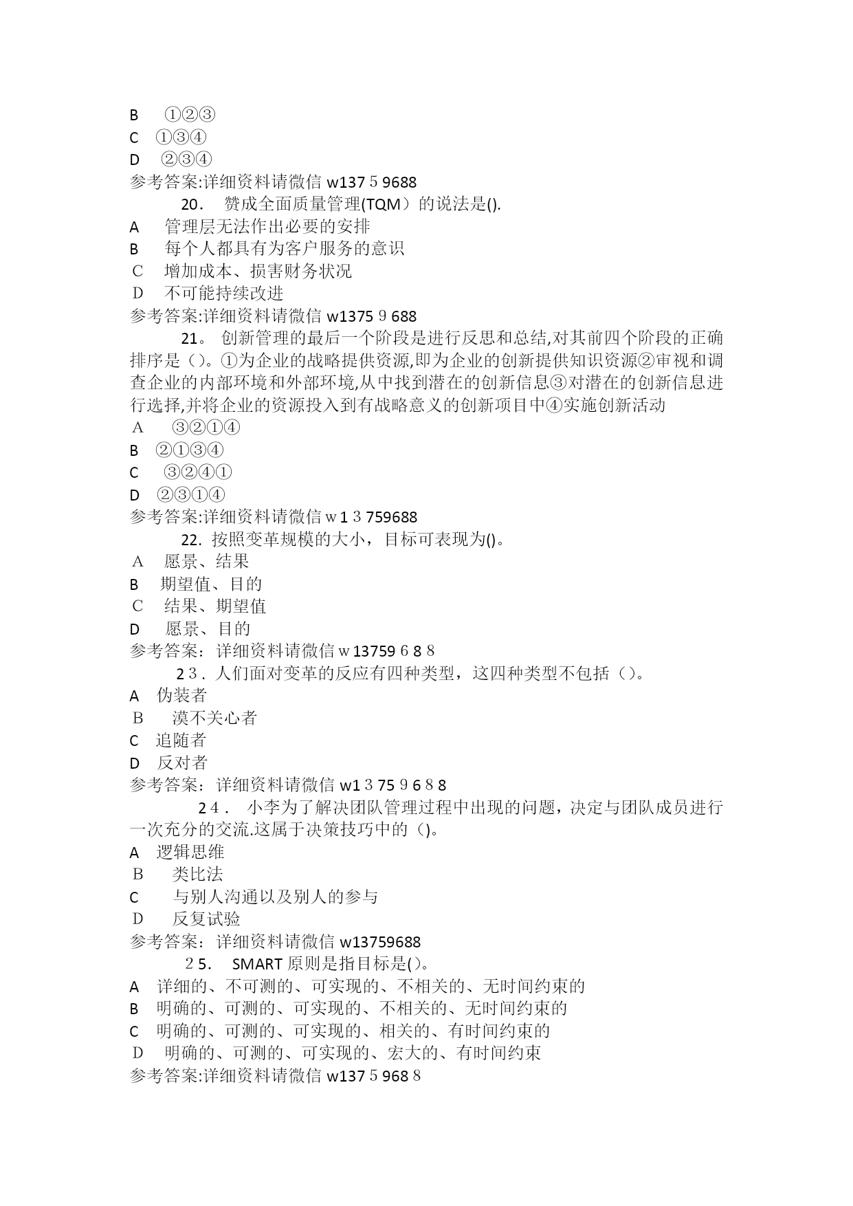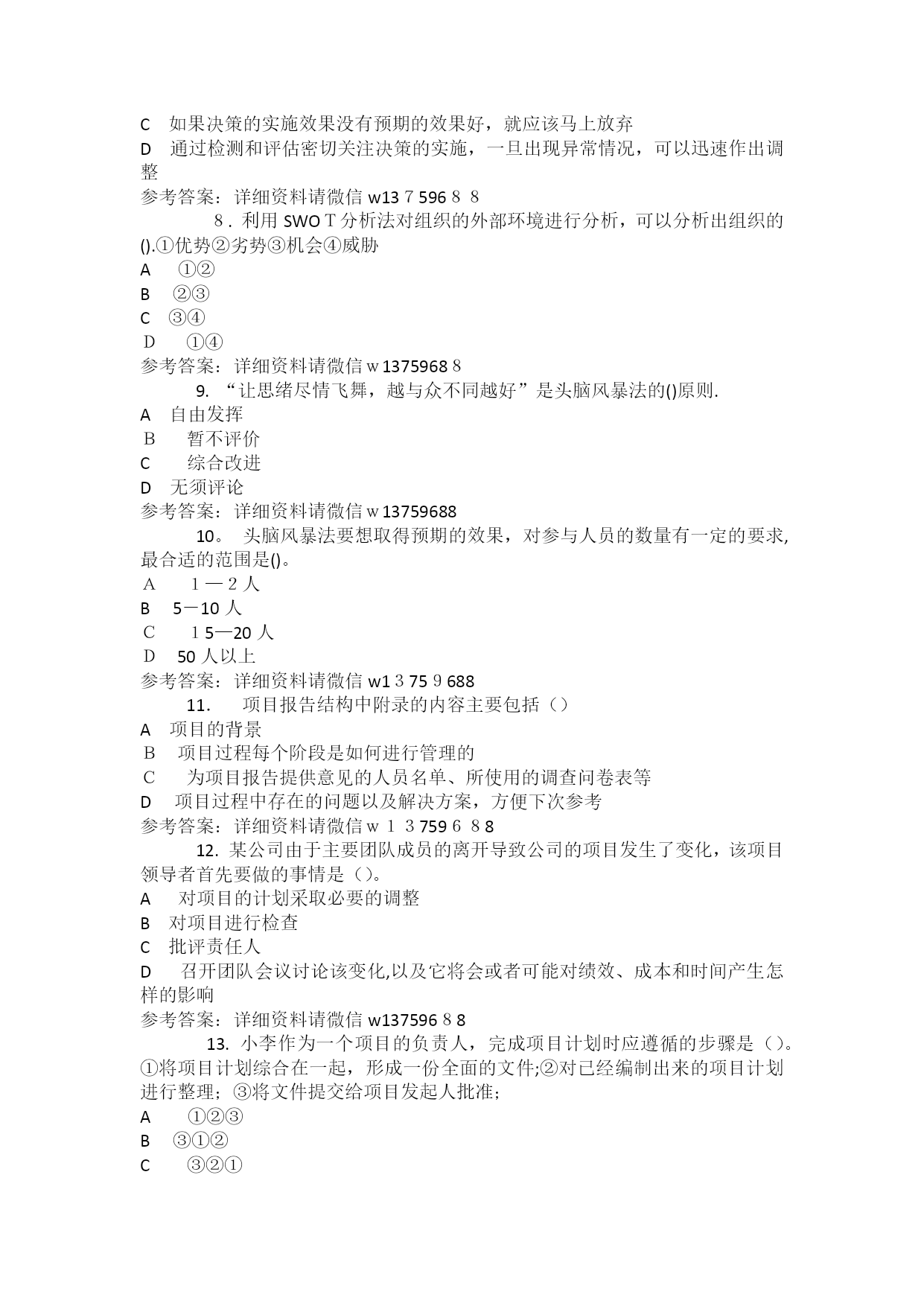 国开机考《资源与运营管理》第四套复习资料【实用文档】doc文档可直接使用可编辑,欢迎下载1.“组织是否有创新战略”是创新管理审核的指标之一。这个指标需要审核的关键问题不包括()。A创新战略与组织的整体战略是否有联系,有何联系B在组织的具体实践中,是否强调技术开发C新技术的出现会带来什么样的潜在机遇和挑战D组织是否有明确的标准确定和选择合作伙伴参考答案:详细资料请微信w137596882.“635法”就是我们说的创新管理方法中的()。A默写式头脑风暴法B头脑风暴法C信息交合法D焦点法参考答案:详细资料请微信w137596883.对于企业来说,不同的人员对变革会有不同的影响、起到不同的作用,一般来说,()不会影响到企业的变革。A政府官员B部门领导C消费者D员工参考答案:详细资料请微信w137596884。“人们对组织的变革开始探究和实施变革.”这个时候人们应对变革的心理处于()时期。A拒绝B愤怒和责备C接受D探究和融合参考答案:详细资料请微信w137596885。可能会导致公司发生变革的因素称为PESTLE因素。PESTLE因素中2个E分别代表()。A政治的、经济的B经济的、环境的C社会的、科技的D法律的、环境的参考答案:详细资料请微信w137596886.引发组织变革的内部因素不包括()。A工作流程的变化B消费者C团队成员方面D团队之间的冲突参考答案:详细资料请微信w137596887。作出决策以后,还需要执行决策,然后评估其效果,关于决策的执行和评估,说法不正确的是().A决策的实施要涉及多种计划和组织B决策要果断,执行要有灵活性C如果决策的实施效果没有预期的效果好,就应该马上放弃D通过检测和评估密切关注决策的实施,一旦出现异常情况,可以迅速作出调整参考答案:详细资料请微信w137596888.利用SWOT分析法对组织的外部环境进行分析,可以分析出组织的().①优势②劣势③机会④威胁A①②B②③C③④D①④参考答案:详细资料请微信w137596889.“让思绪尽情飞舞,越与众不同越好”是头脑风暴法的()原则.A自由发挥B暂不评价C综合改进D无须评论参考答案:详细资料请微信w1375968810。头脑风暴法要想取得预期的效果,对参与人员的数量有一定的要求,最合适的范围是()。A1—2人B5-10人C15—20人D50人以上参考答案:详细资料请微信w1375968811.项目报告结构中附录的内容主要包括()A项目的背景B项目过程每个阶段是如何进行管理的C为项目报告提供意见的人员名单、所使用的调查问卷表等D项目过程中存在的问题以及解决方案,方便下次参考参考答案:详细资料请微信w1375968812.某公司由于主要团队成员的离开导致公司的项目发生了变化,该项目领导者首先要做的事情是()。A对项目的计划采取必要的调整B对项目进行检查C批评责任人D召开团队会议讨论该变化,以及它将会或者可能对绩效、成本和时间产生怎样的影响参考答案:详细资料请微信w1375968813.小李作为一个项目的负责人,完成项目计划时应遵循的步骤是()。①将项目计划综合在一起,形成一份全面的文件;②对已经编制出来的项目计划进行整理;③将文件提交给项目发起人批准;A①②③B③①②C③②①D②①③参考答案:详细资料请微信w1375968814.工作分解结构法的关键在于对项目的里程碑和任务进行适当的层层分解,最终的分解结果可以用()来表示.A树形结构图B甘特图C任务时间表D工作任务书参考答案:详细资料请微信w1375968815.成本-效益分析是验证项目可行性的一种方法,关于这种方法的叙述,不正确的是()。A成本-效益分析就是对项目的成本以及能够带来的好处进行比较B成本-效益分析要求创建一个两栏的表格,标题分别为“成本”和“效益”C成本—效益分析只考虑可以量化的部分,不能量化或不容易量化的部分就不用考虑D在多个项目方案的筛选中,应选择效益超过成本最大的方案参考答案:详细资料请微信w1375968816。5W2H改进法简单、方便,易于理解。关于5W2H法及其应用程序,说法不正确的是().A这一方法的第一步是审视目前形势和问题B“2H"表示如何做和成本如何C5W2H法是确认顾客需求的一种方法D如果现行的策略或做法经过这七个问题的审核已经无懈可击,我们便可认为这一做法或策略可取参考答案:详细资料请微信w1375968817.PDCA循环中的D代表()。A执行B规划C检查D操作参考答案:详细资料请微信w1375968818。为了达到优质产品和服务的目标,在订立产品和服务的质量