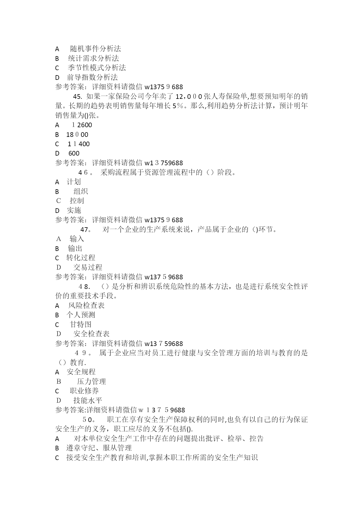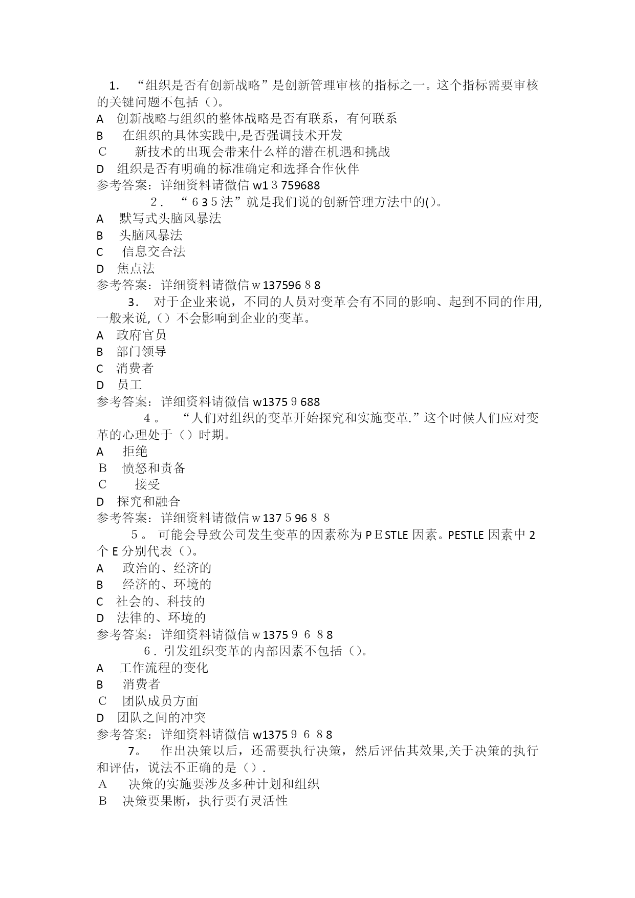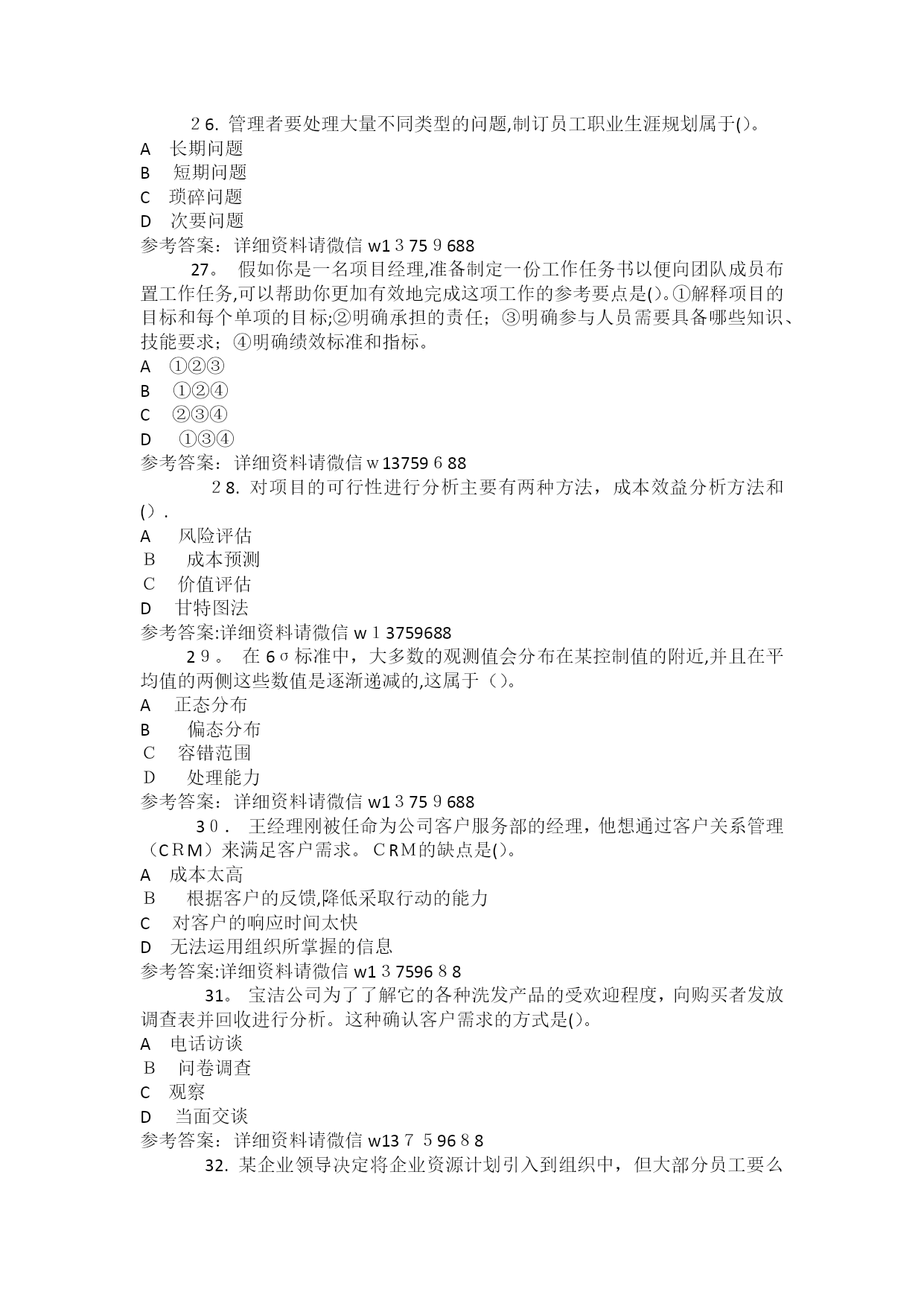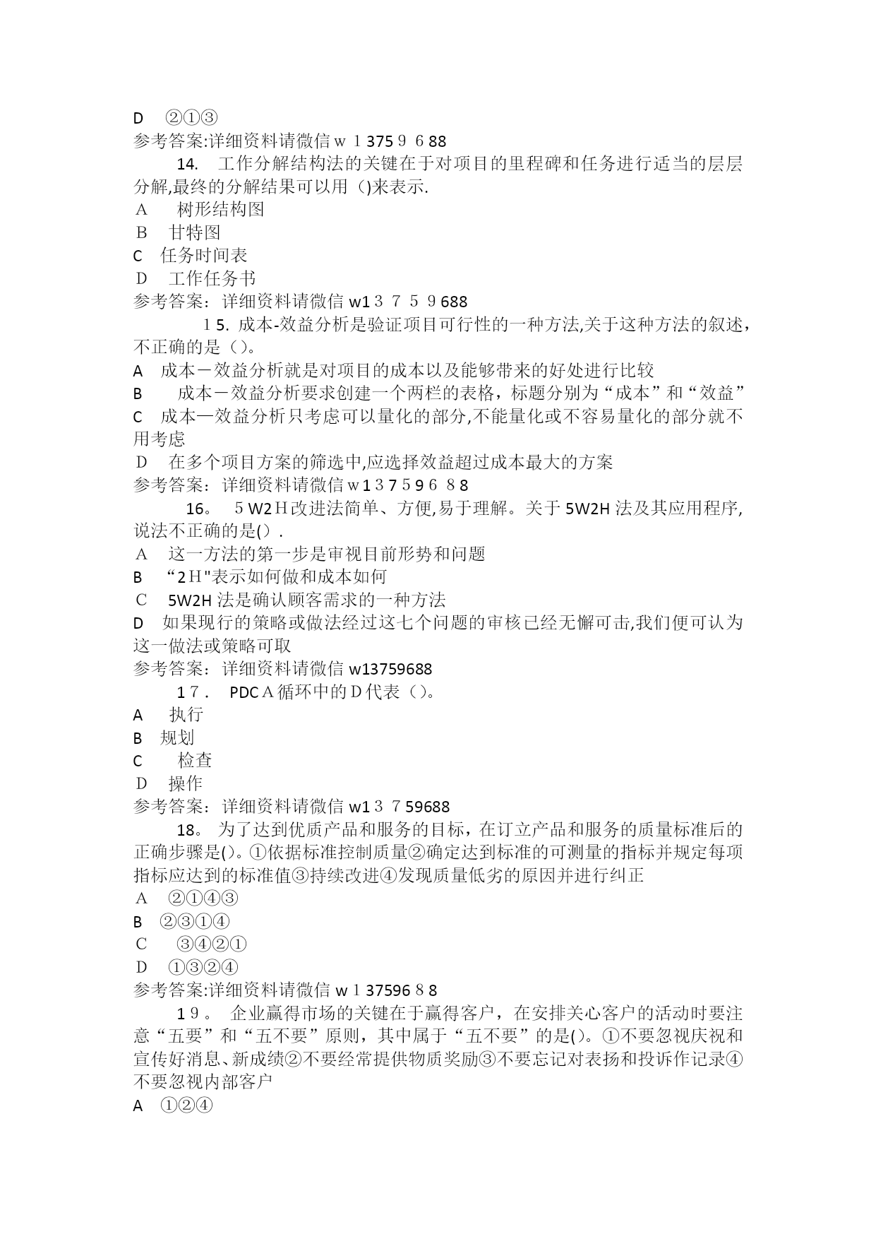 国开机考《资源与运营管理》第四套复习资料【实用文档】doc文档可直接使用可编辑,欢迎下载1.“组织是否有创新战略”是创新管理审核的指标之一。这个指标需要审核的关键问题不包括()。A创新战略与组织的整体战略是否有联系,有何联系B在组织的具体实践中,是否强调技术开发C新技术的出现会带来什么样的潜在机遇和挑战D组织是否有明确的标准确定和选择合作伙伴参考答案:详细资料请微信w137596882.“635法”就是我们说的创新管理方法中的()。A默写式头脑风暴法B头脑风暴法C信息交合法D焦点法参考答案:详细资料请微信w137596883.对于企业来说,不同的人员对变革会有不同的影响、起到不同的作用,一般来说,()不会影响到企业的变革。A政府官员B部门领导C消费者D员工参考答案:详细资料请微信w137596884。“人们对组织的变革开始探究和实施变革.”这个时候人们应对变革的心理处于()时期。A拒绝B愤怒和责备C接受D探究和融合参考答案:详细资料请微信w137596885。可能会导致公司发生变革的因素称为PESTLE因素。PESTLE因素中2个E分别代表()。A政治的、经济的B经济的、环境的C社会的、科技的D法律的、环境的参考答案:详细资料请微信w137596886.引发组织变革的内部因素不包括()。A工作流程的变化B消费者C团队成员方面D团队之间的冲突参考答案:详细资料请微信w137596887。作出决策以后,还需要执行决策,然后评估其效果,关于决策的执行和评估,说法不正确的是().A决策的实施要涉及多种计划和组织B决策要果断,执行要有灵活性C如果决策的实施效果没有预期的效果好,就应该马上放弃D通过检测和评估密切关注决策的实施,一旦出现异常情况,可以迅速作出调整参考答案:详细资料请微信w137596888.利用SWOT分析法对组织的外部环境进行分析,可以分析出组织的().①优势②劣势③机会④威胁A①②B②③C③④D①④参考答案:详细资料请微信w137596889.“让思绪尽情飞舞,越与众不同越好”是头脑风暴法的()原则.A自由发挥B暂不评价C综合改进D无须评论参考答案:详细资料请微信w1375968810。头脑风暴法要想取得预期的效果,对参与人员的数量有一定的要求,最合适的范围是()。A1—2人B5-10人C15—20人D50人以上参考答案:详细资料请微信w1375968811.项目报告结构中附录的内容主要包括()A项目的背景B项目过程每个阶段是如何进行管理的C为项目报告提供意见的人员名单、所使用的调查问卷表等D项目过程中存在的问题以及解决方案,方便下次参考参考答案:详细资料请微信w1375968812.某公司由于主要团队成员的离开导致公司的项目发生了变化,该项目领导者首先要做的事情是()。A对项目的计划采取必要的调整B对项目进行检查C批评责任人D召开团队会议讨论该变化,以及它将会或者可能对绩效、成本和时间产生怎样的影响参考答案:详细资料请微信w1375968813.小李作为一个项目的负责人,完成项目计划时应遵循的步骤是()。①将项目计划综合在一起,形成一份全面的文件;②对已经编制出来的项目计划进行整理;③将文件提交给项目发起人批准;A①②③B③①②C③②①D②①③参考答案:详细资料请微信w1375968814.工作分解结构法的关键在于对项目的里程碑和任务进行适当的层层分解,最终的分解结果可以用()来表示.A树形结构图B甘特图C任务时间表D工作任务书参考答案:详细资料请微信w1375968815.成本-效益分析是验证项目可行性的一种方法,关于这种方法的叙述,不正确的是()。A成本-效益分析就是对项目的成本以及能够带来的好处进行比较B成本-效益分析要求创建一个两栏的表格,标题分别为“成本”和“效益”C成本—效益分析只考虑可以量化的部分,不能量化或不容易量化的部分就不用考虑D在多个项目方案的筛选中,应选择效益超过成本最大的方案参考答案:详细资料请微信w1375968816。5W2H改进法简单、方便,易于理解。关于5W2H法及其应用程序,说法不正确的是().A这一方法的第一步是审视目前形势和问题B“2H"表示如何做和成本如何C5W2H法是确认顾客需求的一种方法D如果现行的策略或做法经过这七个问题的审核已经无懈可击,我们便可认为这一做法或策略可取参考答案:详细资料请微信w1375968817.PDCA循环中的D代表()。A执行B规划C检查D操作参考答案:详细资料请微信w1375968818。为了达到优质产品和服务的目标,在订立产品和服务的质量