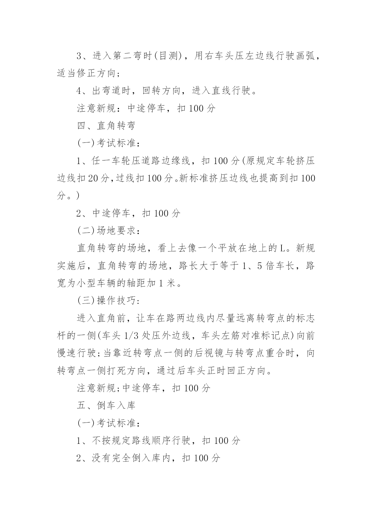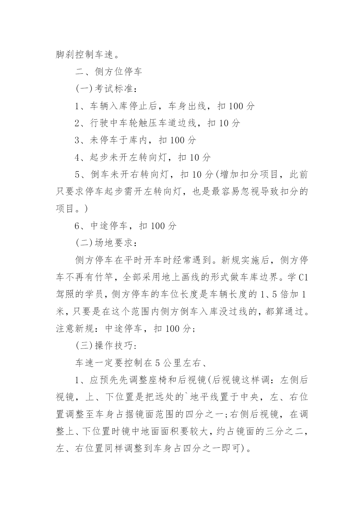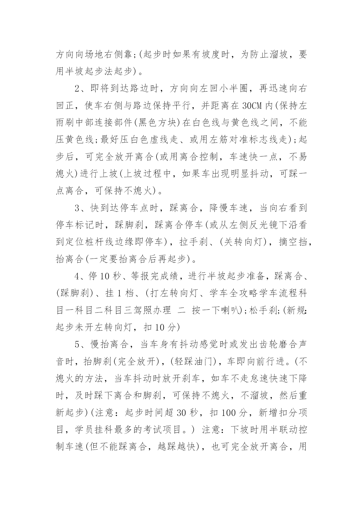 科目二考试标准及技巧科目二考试标准及技巧一、定点停车与坡道起步(一)考试标准:1、没有定点停车,扣100分;2、车辆停止后,汽车前保险杠未到控制线,扣100分3、停车后后溜大于30厘米,扣100分;4、停车后后溜小于30厘米,扣10分(原规定扣20分)5、起步未开左转向灯,扣10分6、车辆行驶中压道路边缘实线,扣100分7、车辆停止后,前保险杠未到停车线,扣10分(原规定是扣20分);8、停车时右前轮距边缘线30厘米以上,扣10分(原规定是扣20分)9、起步时间超30秒,扣100分(新增扣分项目,学员挂科最多的考试项目。)(二)场地要求:陡坡的坡度必须大于等于10度,考C1驾照的陡坡长度要大于等于20米。在考试过程中,学员在陡坡停车后,必须在30秒内起步,否则就算失败。(三)操作技巧:1、到“上坡定点停车”指令后,(立刻打右转向灯),方向向场地右侧靠;(起步时如果有坡度时,为防止溜坡,要用半坡起步法起步)。2、即将到达路边时,方向向左回小半圈,再迅速向右回正,使车右侧与路边保持平行,并距离在30CM内(保持左雨刷中部连接部件(黑色方块)在白色线与黄色线之间,不能压黄色线;最好压白色虚线走、或用左筋对准标志线走);起步后,可完全放开离合(或用离合控制,车速快一点,不易熄火)进行上坡(上坡过程中,如果车出现明显抖动,可踩一点离合,可保持不熄火)。3、快到达停车点时,踩离合,降慢车速,当向右看到停车标记时,踩脚刹,踩离合停车(或从左侧反光镜下沿看到定位桩杆线边缘即停车),拉手刹、(关转向灯),摘空挡,抬离合(一定要抬离合后再起步)。4、停10秒、等报完成绩,进行半坡起步准备,踩离合、(踩脚刹)、挂1档、(打左转向灯、学车全攻略学车流程科目一科目二科目三驾照办理二按一下喇叭);松手刹;(新规:起步未开左转向灯,扣10分)5、慢抬离合,当车身有抖动感觉时或发出齿轮磨合声音时,抬脚刹(完全放开),(轻踩油门),车即向前行进。(不熄火的方法,当车抖动时放开刹车,如车不走怠速快速下降时,及时踩下离合和脚刹,可保持不熄火,不溜坡,然后重新起步)(注意:起步时间超30秒,扣100分,新增扣分项目,学员挂科最多的考试项目。)注意:下坡时用半联动控制车速(但不能踩离合,越踩越快),也可完全放开离合,用脚刹控制车速。二、侧方位停车(一)考试标准:1、车辆入库停止后,车身出线,扣100分2、行驶中车轮触压车道边线,扣10分3、未停车于库内,扣100分4、起步未开左转向灯,扣10分5、倒车未开右转向灯,扣10分(增加扣分项目,此前只要求停车起步需开左转向灯,也是最容易忽视导致扣分的项目。)6、中途停车,扣100分(二)场地要求:侧方停车在平时开车时经常遇到。新规实施后,侧方停车不再有竹竿,全部采用地上画线的形式做车库边界。学C1驾照的学员,侧方停车的车位长度是车辆长度的1、5倍加1米,只要是在这个范围内侧方倒车入库没过线的,都算通过。注意新规:中途停车,扣100分;(三)操作技巧:车速一定要控制在5公里左右、1、应预先先调整座椅和后视镜(后视镜这样调:左侧后视镜,上、下位置是把远处的`地平线置于中央,左、右位置调整至车身占据镜面范围的四分之一;右侧后视镜,在调整上、下位置时镜中地面面积要较大,约占镜面的三分之二,左、右位置同样调整到车身占四分之一即可)。2、听到侧方停车指令后,半联动驾车沿停车位慢速平行前进(车头右侧先1/2,再逐渐1/3处压库边线行驶,即保持车右侧距库边线30cm),当右后视镜中看到库前边线时,踩脚刹、踩离合停车;3、踩离合,挂倒档,(新规:打右转向灯3秒以上),抬脚刹,慢抬离合倒车;(这时,车头如果是斜的,倒车时可将方向向车头偏的一方打死,待车身回正时立即将方向盘回正);4、当右后视镜中刚看不到库前边线,方向向右打死继续倒车;5、观察车身与库左边线成40-45度夹角时,方向向左侧回正(1圈半)(或在左后视镜内车尾部刚出现库的右后角时,向左1圈半方向即回正);6、回轮后继续缓慢倒车,看左后视镜,当左后轮到库左边线前10cm时,速再继续向左打死方向;注意:1、开始车与库边线大于40cm时,步骤5或步骤6应晚打方向。2、开始车与库边线小于20cm时,步骤5或步骤6应早打方向。7、观察右后视镜,待车回正时,方向盘回正,观察车没有到位时,继续后倒(使后轮进入感应区但不出后感应区),踩脚刹,踩离合停车,拉手刹,摘空挡,再抬离合,抬脚刹,停10秒左右,待通知考试合格后再准备重新起步出库;8、踩离合,挂1档,打左转向灯3秒以上,按一下喇叭,松手刹、慢抬离合用半联动缓慢起步;方向向左打死;9、车沿左侧前进,当车头中间压道路左边线时尽快向右打1圈半(回正),随后根据路况再向右打1圈,并适当调整;10、出库后车身与库边线平行后立即将方向盘回正(即向左回1