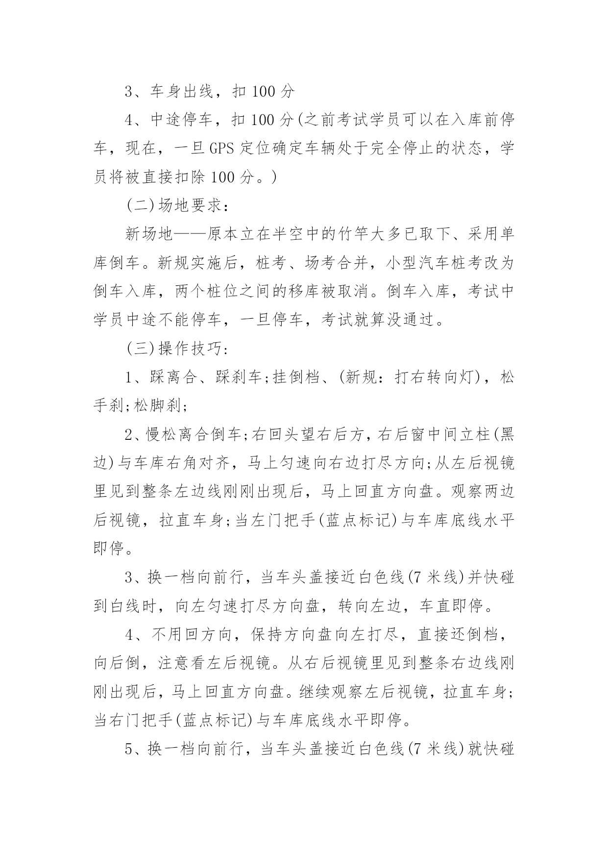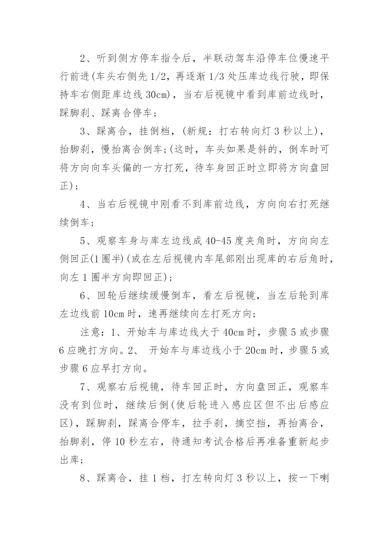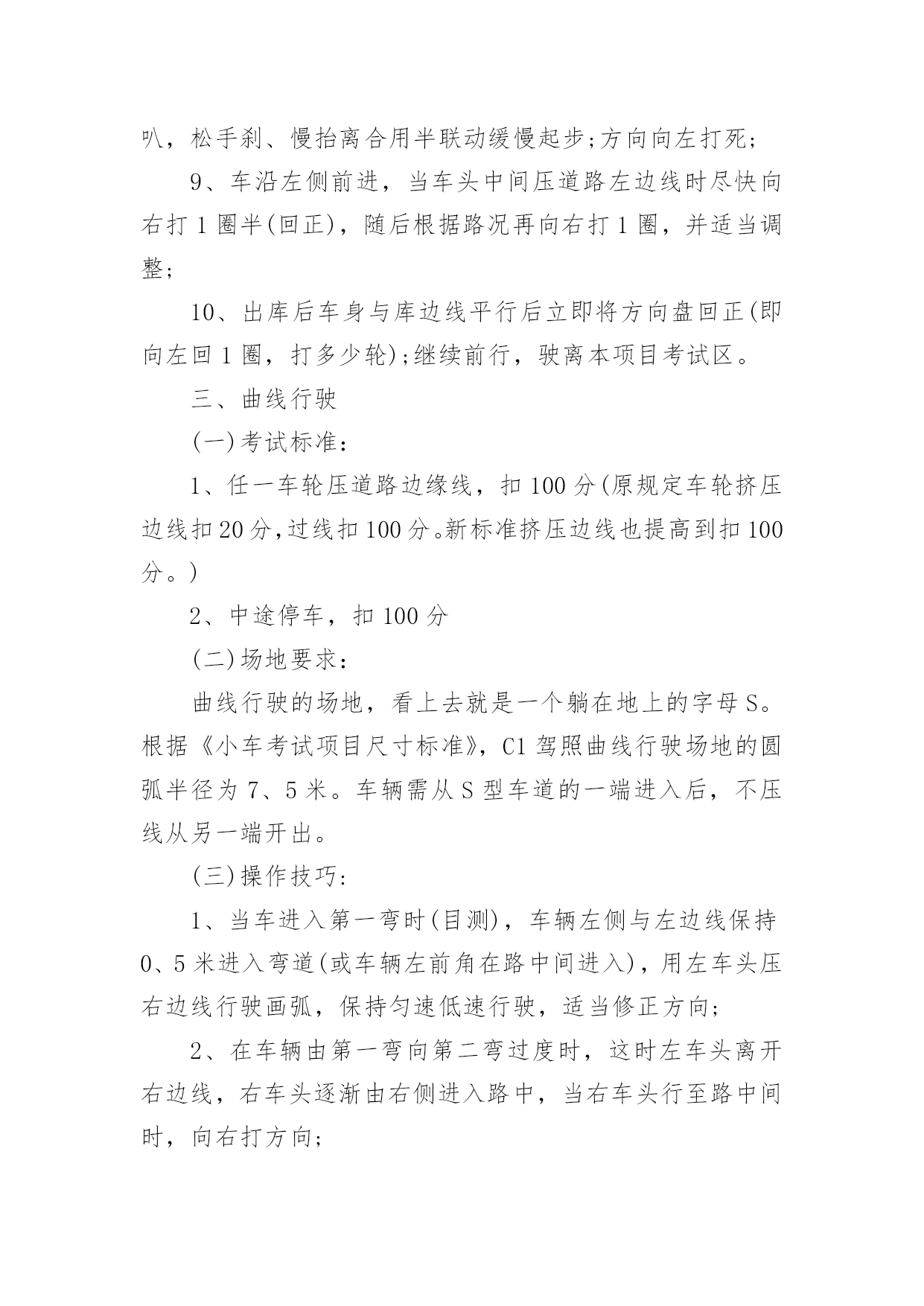 科目二考试标准及技巧科目二考试标准及技巧一、定点停车与坡道起步(一)考试标准:1、没有定点停车,扣100分;2、车辆停止后,汽车前保险杠未到控制线,扣100分3、停车后后溜大于30厘米,扣100分;4、停车后后溜小于30厘米,扣10分(原规定扣20分)5、起步未开左转向灯,扣10分6、车辆行驶中压道路边缘实线,扣100分7、车辆停止后,前保险杠未到停车线,扣10分(原规定是扣20分);8、停车时右前轮距边缘线30厘米以上,扣10分(原规定是扣20分)9、起步时间超30秒,扣100分(新增扣分项目,学员挂科最多的考试项目。)(二)场地要求:陡坡的坡度必须大于等于10度,考C1驾照的陡坡长度要大于等于20米。在考试过程中,学员在陡坡停车后,必须在30秒内起步,否则就算失败。(三)操作技巧:1、到“上坡定点停车”指令后,(立刻打右转向灯),方向向场地右侧靠;(起步时如果有坡度时,为防止溜坡,要用半坡起步法起步)。2、即将到达路边时,方向向左回小半圈,再迅速向右回正,使车右侧与路边保持平行,并距离在30CM内(保持左雨刷中部连接部件(黑色方块)在白色线与黄色线之间,不能压黄色线;最好压白色虚线走、或用左筋对准标志线走);起步后,可完全放开离合(或用离合控制,车速快一点,不易熄火)进行上坡(上坡过程中,如果车出现明显抖动,可踩一点离合,可保持不熄火)。3、快到达停车点时,踩离合,降慢车速,当向右看到停车标记时,踩脚刹,踩离合停车(或从左侧反光镜下沿看到定位桩杆线边缘即停车),拉手刹、(关转向灯),摘空挡,抬离合(一定要抬离合后再起步)。4、停10秒、等报完成绩,进行半坡起步准备,踩离合、(踩脚刹)、挂1档、(打左转向灯、学车全攻略学车流程科目一科目二科目三驾照办理二按一下喇叭);松手刹;(新规:起步未开左转向灯,扣10分)5、慢抬离合,当车身有抖动感觉时或发出齿轮磨合声音时,抬脚刹(完全放开),(轻踩油门),车即向前行进。(不熄火的方法,当车抖动时放开刹车,如车不走怠速快速下降时,及时踩下离合和脚刹,可保持不熄火,不溜坡,然后重新起步)(注意:起步时间超30秒,扣100分,新增扣分项目,学员挂科最多的考试项目。)注意:下坡时用半联动控制车速(但不能踩离合,越踩越快),也可完全放开离合,用脚刹控制车速。二、侧方位停车(一)考试标准:1、车辆入库停止后,车身出线,扣100分2、行驶中车轮触压车道边线,扣10分3、未停车于库内,扣100分4、起步未开左转向灯,扣10分5、倒车未开右转向灯,扣10分(增加扣分项目,此前只要求停车起步需开左转向灯,也是最容易忽视导致扣分的项目。)6、中途停车,扣100分(二)场地要求:侧方停车在平时开车时经常遇到。新规实施后,侧方停车不再有竹竿,全部采用地上画线的形式做车库边界。学C1驾照的学员,侧方停车的车位长度是车辆长度的1、5倍加1米,只要是在这个范围内侧方倒车入库没过线的,都算通过。注意新规:中途停车,扣100分;(三)操作技巧:车速一定要控制在5公里左右、1、应预先先调整座椅和后视镜(后视镜这样调:左侧后视镜,上、下位置是把远处的`地平线置于中央,左、右位置调整至车身占据镜面范围的四分之一;右侧后视镜,在调整上、下位置时镜中地面面积要较大,约占镜面的三分之二,左、右位置同样调整到车身占四分之一即可)。2、听到侧方停车指令后,半联动驾车沿停车位慢速平行前进(车头右侧先1/2,再逐渐1/3处压库边线行驶,即保持车右侧距库边线30cm),当右后视镜中看到库前边线时,踩脚刹、踩离合停车;3、踩离合,挂倒档,(新规:打右转向灯3秒以上),抬脚刹,慢抬离合倒车;(这时,车头如果是斜的,倒车时可将方向向车头偏的一方打死,待车身回正时立即将方向盘回正);4、当右后视镜中刚看不到库前边线,方向向右打死继续倒车;5、观察车身与库左边线成40-45度夹角时,方向向左侧回正(1圈半)(或在左后视镜内车尾部刚出现库的右后角时,向左1圈半方向即回正);6、回轮后继续缓慢倒车,看左后视镜,当左后轮到库左边线前10cm时,速再继续向左打死方向;注意:1、开始车与库边线大于40cm时,步骤5或步骤6应晚打方向。2、开始车与库边线小于20cm时,步骤5或步骤6应早打方向。7、观察右后视镜,待车回正时,方向盘回正,观察车没有到位时,继续后倒(使后轮进入感应区但不出后感应区),踩脚刹,踩离合停车,拉手刹,摘空挡,再抬离合,抬脚刹,停10秒左右,待通知考试合格后再准备重新起步出库;8、踩离合,挂1档,打左转向灯3秒以上,按一下喇叭,松手刹、慢抬离合用半联动缓慢起步;方向向左打死;9、车沿左侧前进,当车头中间压道路左边线时尽快向右打1圈半(回正),随后根据路况再向右打1圈,并适当调整;10、出库后车身与库边线平行后立即将方向盘回正(即向左回1