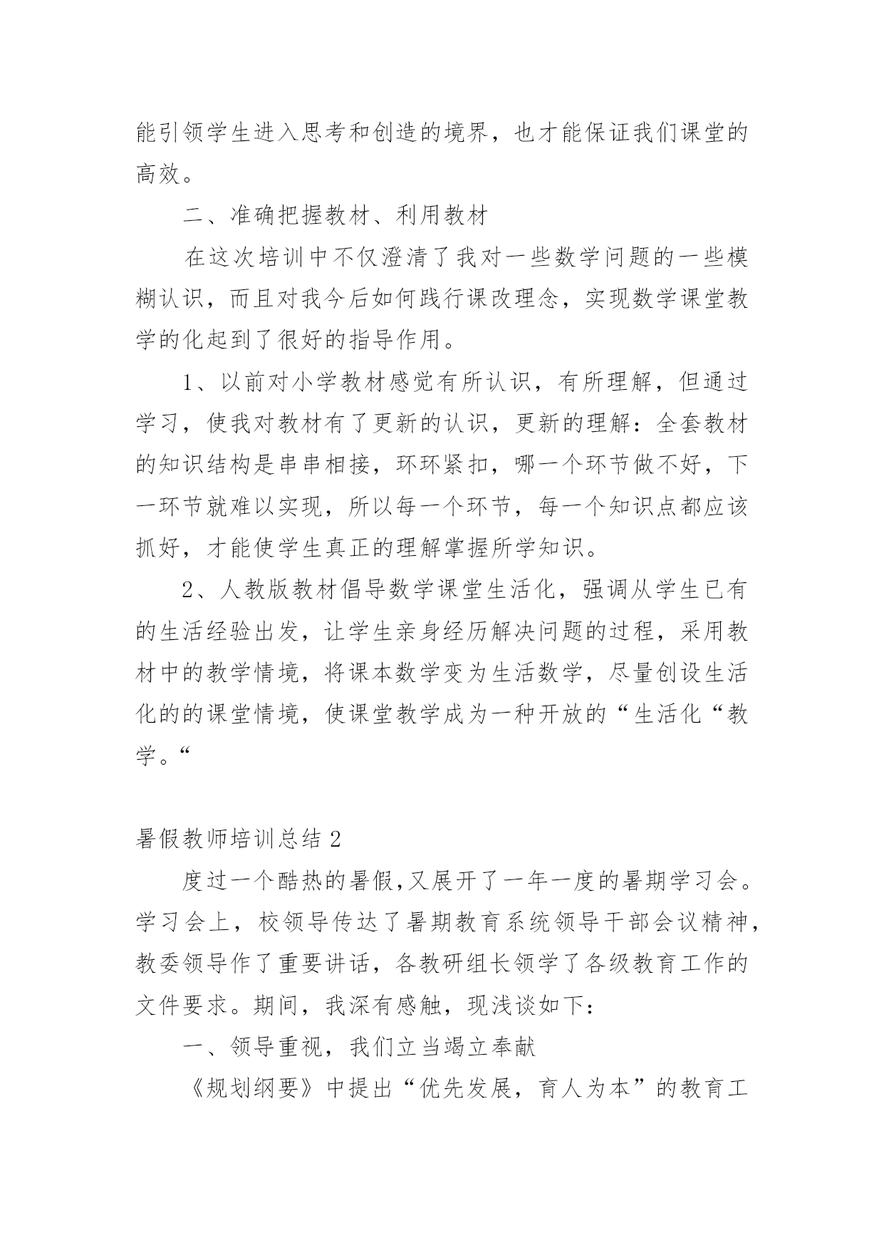 暑假教师培训总结总结是在某一特定时间段对学习和工作生活或其完成情况,包括取得的成绩、存在的问题及得到的经验和教训加以回顾和分析的书面材料,它可以帮助我们有寻找学习和工作中的规律,让我们好好写一份总结吧。那么如何把总结写出新花样呢?下面是小编整理的暑假教师培训总结,欢迎大家借鉴与参考,希望对大家有所帮助。暑假教师培训总结120xx年7月26日至8月1日,我有幸参加了小学数学教师培训学习。这次培训的内容丰富,形式多样。为期七天的培训学习让我收获颇丰,以下是我结合自己的理解总结的几点学习体会:一、如何构建高效课堂在几位专家的报告中提到了高效课堂的灵魂是相信学生、解放学生、利用学生、发展学生,因此必须注重课堂教学的实效。专家在报告中提到了现实中课堂教学存在几种值得我们思考的问题。我不由得反思自己的教学,在认真的思考之后我认为要想构建既高效的数学课堂教师必须做好全面的工作:1、课前认真准备,充分的预设没有预设的课堂是放任的、杂乱无章的,必然也是低效的。要使课堂教学高效,充分的课前准备就显得非常重要了。教师要明确每节课教学的重点与难点,做到有重点的点拨,不要胡子眉毛一把抓;体会学生学习过程中的困难之处,重点加以突破;合理地讲练,每节课都要有比较深入的信息反馈与调整,确保每节课中目标的达成度。2、营造现实和富有吸引力的学习情境适当教学情境的创设在小学数学教学中是必要的。恰当的创设教学情境能有效地吸引学生的注意力,保证学生全身心的投入到学习活动中,丰富学生的体验,有效地提高学生感悟能力和实践能力。3、懂得欣赏学生懂得欣赏每一位学生,美国教育心理学家吉诺特博士的一段话能带给我们一点点启示:“在经历了若干年的教师工作之后,我得到了一个令人惶恐的结论:教育的成功和失败,‘我’是决定性因素。我个人采用的方法和每天的情绪是造成学习气氛和情境的主因。身为老师,我具有极大的力量,能够让孩子们活得愉快或悲惨,我可以是制造痛苦的工具也可以是启发灵感的媒介,我能让人丢脸也能叫人开心,能伤人也能救人。”是的,我们教师的“权利”有多大,我们直接关系着一个孩子成长过程中的`悲哀与快乐,直接左右着孩子的精神生活,想想都觉得可怕。当我们一脸阳光的走进教室时孩子们的心情也是舒展与放松的,当我们给孩子们一句诚信的赞美,他会是多么的幸福与喜悦;而我们的可能是不经意的表情、不经意的一句话都会给孩子遮盖上一片沉重的乌云。所以欣赏我们的孩子吧,只有真心的去欣赏他们才能引领学生进入思考和创造的境界,也才能保证我们课堂的高效。二、准确把握教材、利用教材在这次培训中不仅澄清了我对一些数学问题的一些模糊认识,而且对我今后如何践行课改理念,实现数学课堂教学的化起到了很好的指导作用。1、以前对小学教材感觉有所认识,有所理解,但通过学习,使我对教材有了更新的认识,更新的理解:全套教材的知识结构是串串相接,环环紧扣,哪一个环节做不好,下一环节就难以实现,所以每一个环节,每一个知识点都应该抓好,才能使学生真正的理解掌握所学知识。2、人教版教材倡导数学课堂生活化,强调从学生已有的生活经验出发,让学生亲身经历解决问题的过程,采用教材中的教学情境,将课本数学变为生活数学,尽量创设生活化的的课堂情境,使课堂教学成为一种开放的“生活化“教学。“暑假教师培训总结2度过一个酷热的暑假,又展开了一年一度的暑期学习会。学习会上,校领导传达了暑期教育系统领导干部会议精神,教委领导作了重要讲话,各教研组长领学了各级教育工作的文件要求。期间,我深有感触,现浅谈如下:一、领导重视,我们立当竭立奉献《规划纲要》中提出“优先发展,育人为本”的教育工作方针,足见国家将教育工作摆在了重中之重。《规划纲要》中还提出“到20xx年,进入人才资源强国行列。”不难发现,教育工作担负的责任之重大。是呀,国家的发展要靠创新人才,离不开科学优质的教育。而我们“教师”,教育工作的具体实施者,岂能有半点疏忽?二、立足课堂,求真务实学习会上,教委领导谈到,新xx届局领导讲求务实,注重任人唯贤。作为教师,我们更应该拿出实干精神投身教育工作。更何况,我们面对的年幼无知的.儿童,他们仿佛一张张无瑕的白纸,我们的一笔一画都会在他们纯净的心灵上留下深深的烙印,将奠定他们最初的习惯,影响一生。因此,我们必须始终持严谨的治学态度,精心设计每一节课,用心引导每一位学生,细心批改每一本作业。这样,才能无愧“教师”这个神圣的称号,才能不负重望,才能给自己的良知一份踏实。三、树立质量意识,提高教育教学效率学校以质量求生存,我们以效率求发展。因此,我们至少要上合格课,争取上优质课,提高教学质量,培养更多合格人才和优秀人才。四、提升生活品味,重塑教师形象我们“为人师表”,不仅仅是知识的传承者,还要从各方面为学生作出表率。因而,我们必须处处注重自己的一言一行,着装应得体大方,处