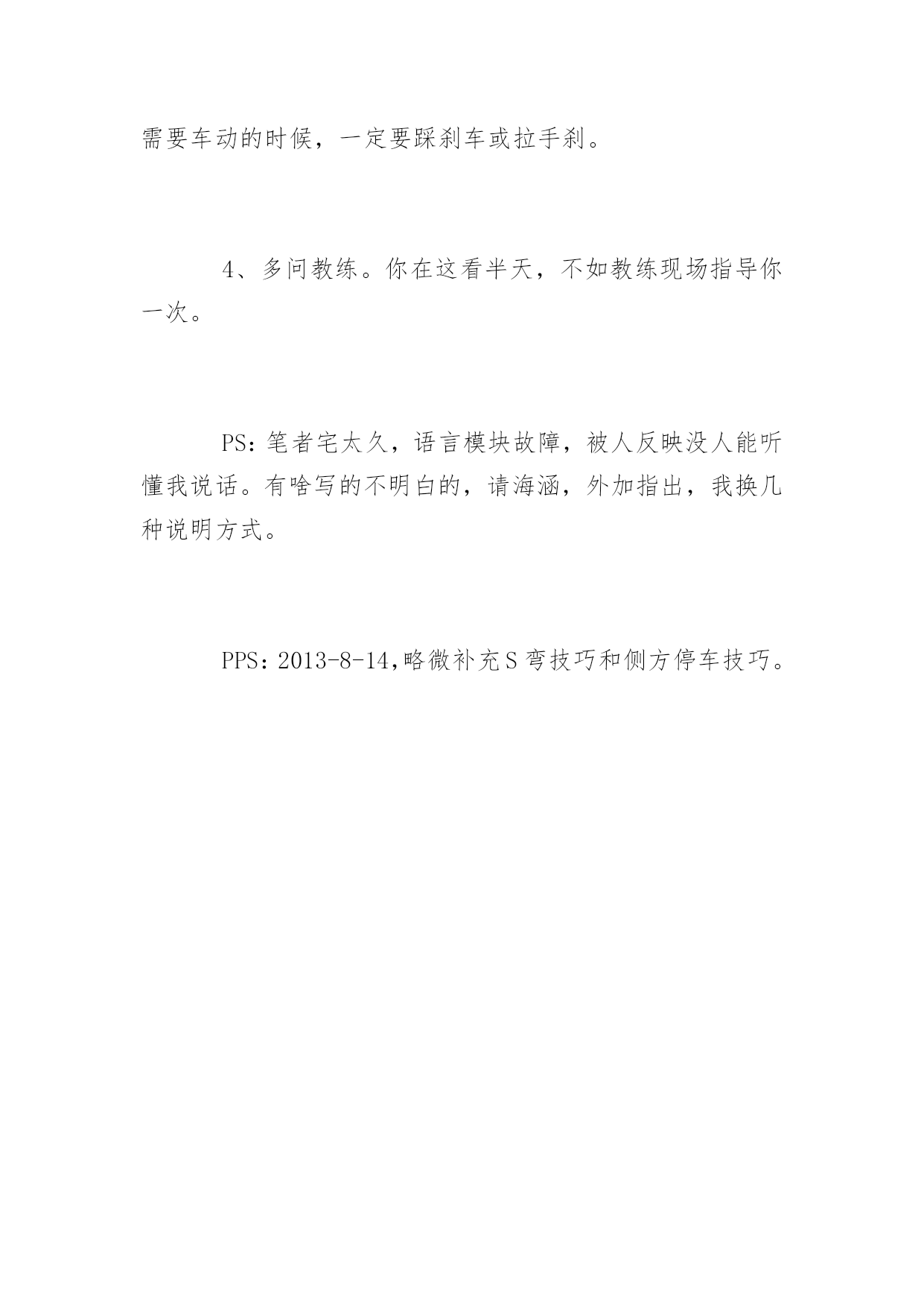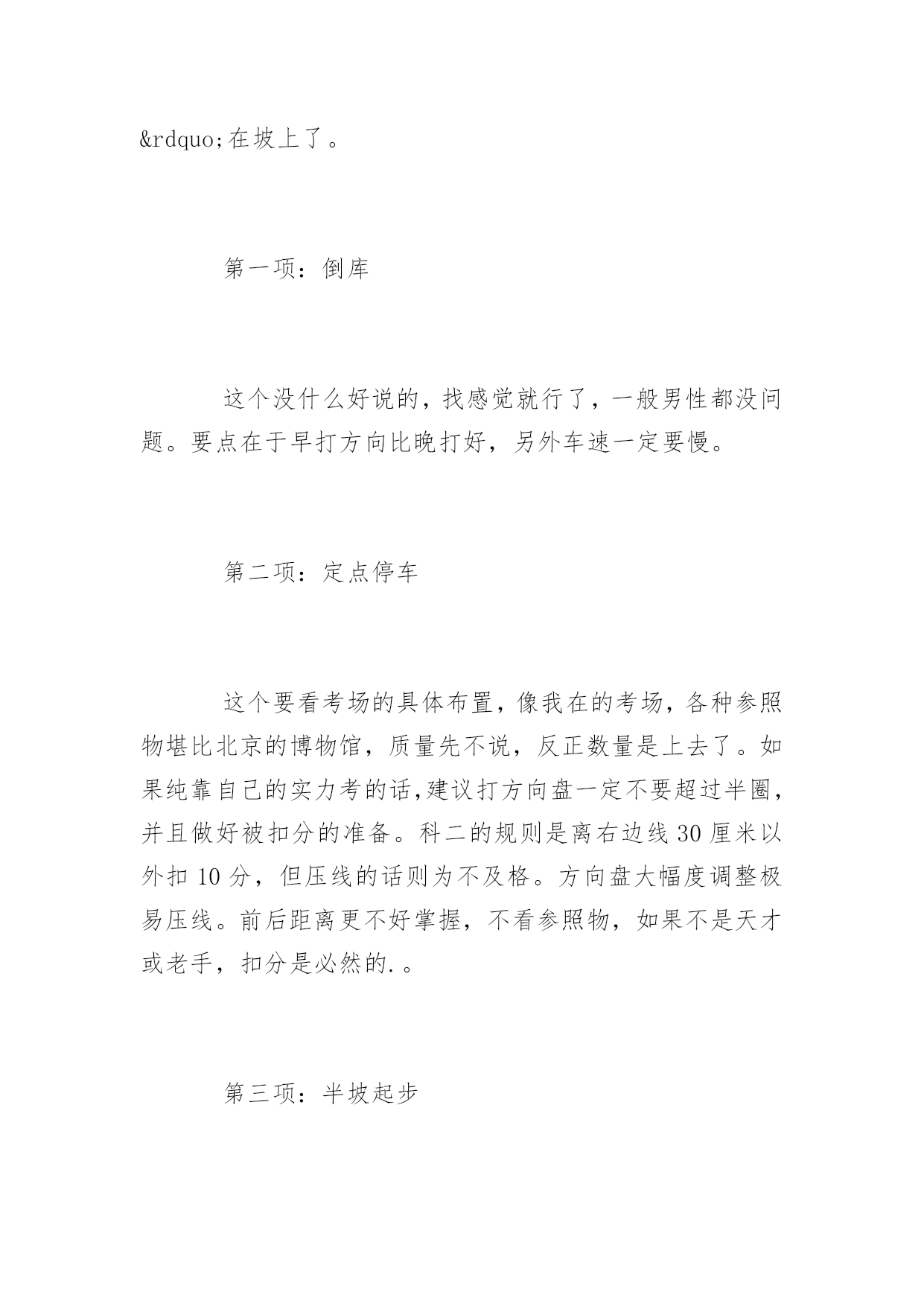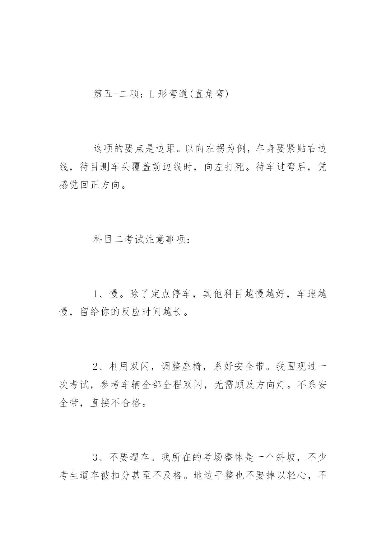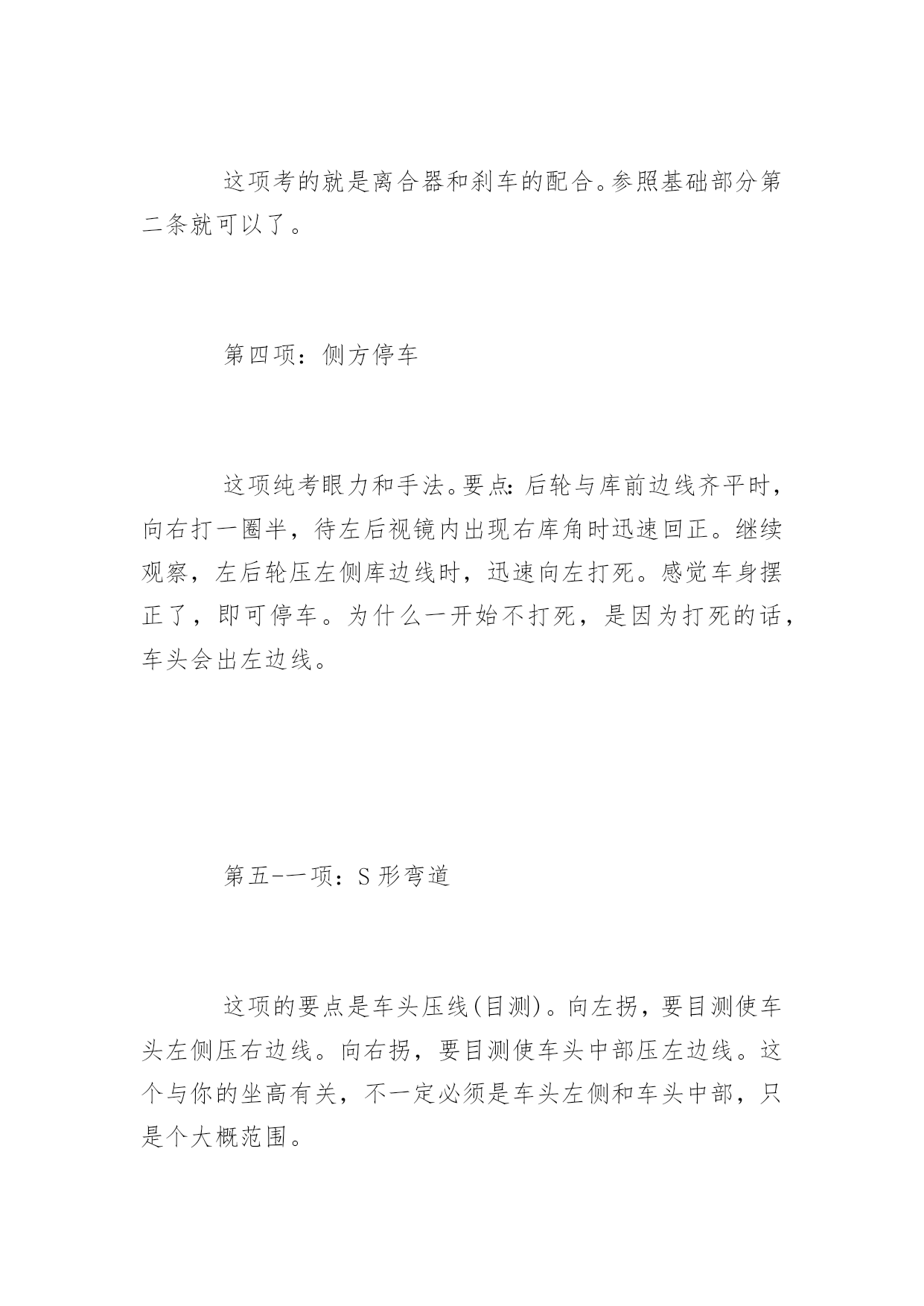 科目二考试技巧图解2015科目二考试技巧图解科目二考试基础:1、保持离合器半联动状态。半联动状态的表现就是轻踩离合,车辆即失去动力;轻松离合,车辆速度即加快。保持半联动的好处是车辆反应迅速、便于微调,可以随时停车,而且可以完全掌控车速,从0km/H到8km/H完全取决于你踩离合的力度。比如我现在就可以把车速控制在2km/H以内,基本是龟速。值得注意的是,半联动状态时,由于某种我也不知道的原因,车速可能比全联动(完全松开离合)状态还快。半联动状态时,离合的高度取决于车自身,有的车高,有的车低。考试时候可以多试几次离合来找半联动点。2、离合和刹车的配合。这点会在半坡起步时用到,平时可以用来防遛车。简单的说就是离合与刹车同时踩,离合放松至半联动状态时,松刹车,如果此时车辆仍保持静止,那么继续松离合,直至车辆开始行动。判断半联动状态,最直观的感受就是,离合器松到一定程度时,车身会抖动,如果车处在斜坡上,那么你会有一瞬间感觉到车“贴”在坡上了。第一项:倒库这个没什么好说的,找感觉就行了,一般男性都没问题。要点在于早打方向比晚打好,另外车速一定要慢。第二项:定点停车这个要看考场的具体布置,像我在的考场,各种参照物堪比北京的博物馆,质量先不说,反正数量是上去了。如果纯靠自己的实力考的话,建议打方向盘一定不要超过半圈,并且做好被扣分的准备。科二的规则是离右边线30厘米以外扣10分,但压线的话则为不及格。方向盘大幅度调整极易压线。前后距离更不好掌握,不看参照物,如果不是天才或老手,扣分是必然的.。第三项:半坡起步这项考的就是离合器和刹车的配合。参照基础部分第二条就可以了。第四项:侧方停车这项纯考眼力和手法。要点:后轮与库前边线齐平时,向右打一圈半,待左后视镜内出现右库角时迅速回正。继续观察,左后轮压左侧库边线时,迅速向左打死。感觉车身摆正了,即可停车。为什么一开始不打死,是因为打死的话,车头会出左边线。第五-一项:S形弯道这项的要点是车头压线(目测)。向左拐,要目测使车头左侧压右边线。向右拐,要目测使车头中部压左边线。这个与你的坐高有关,不一定必须是车头左侧和车头中部,只是个大概范围。第五-二项:L形弯道(直角弯)这项的要点是边距。以向左拐为例,车身要紧贴右边线,待目测车头覆盖前边线时,向左打死。待车过弯后,凭感觉回正方向。科目二考试注意事项:1、慢。除了定点停车,其他科目越慢越好,车速越慢,留给你的反应时间越长。2、利用双闪,调整座椅,系好安全带。我围观过一次考试,参考车辆全部全程双闪,无需顾及方向灯。不系安全带,直接不合格。3、不要遛车。我所在的考场整体是一个斜坡,不少考生遛车被扣分甚至不及格。地边平整也不要掉以轻心,不需要车动的时候,一定要踩刹车或拉手刹。4、多问教练。你在这看半天,不如教练现场指导你一次。PS:笔者宅太久,语言模块故障,被人反映没人能听懂我说话。有啥写的不明白的,请海涵,外加指出,我换几种说明方式。PPS:2013-8-14,略微补充S弯技巧和侧方停车技巧。
