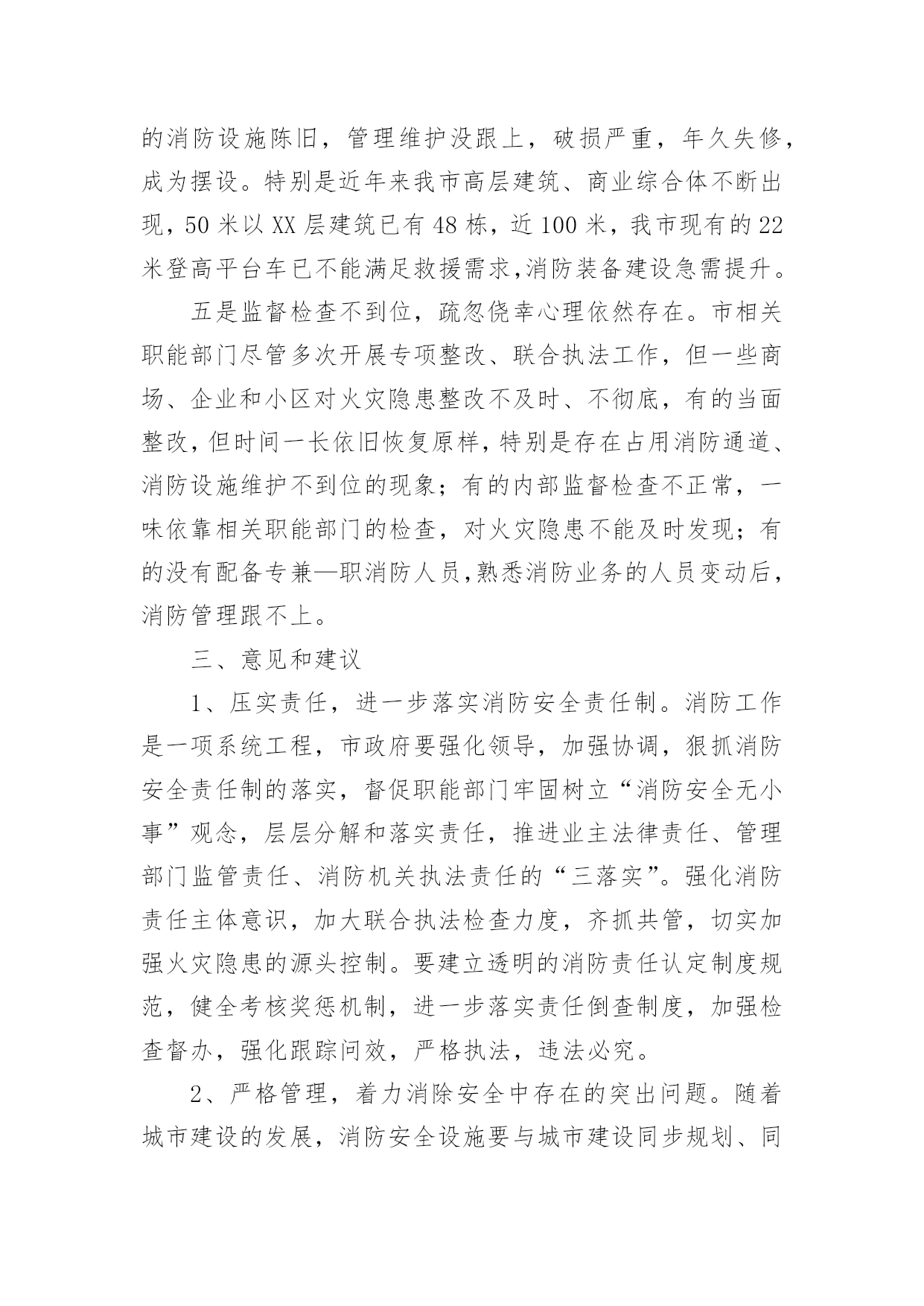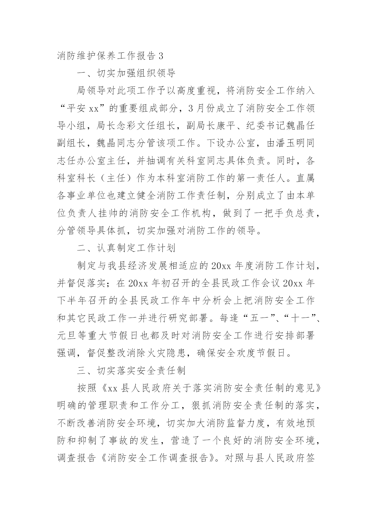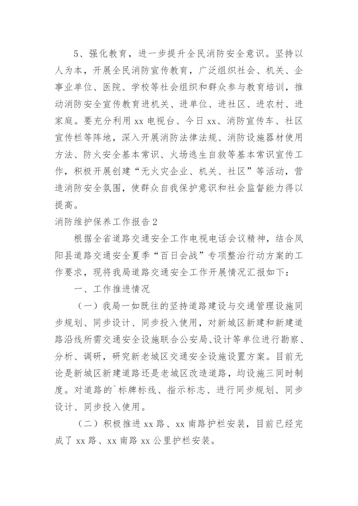 消防维护保养工作报告消防维护保养工作报告在现实生活中,报告的使用频率呈上升趋势,报告根据用途的不同也有着不同的类型。相信许多人会觉得报告很难写吧,下面是小编精心整理的消防维护保养工作报告,欢迎阅读,希望大家能够喜欢。消防维护保养工作报告15月14日,市政协社会法制委员会组织部分委员,在副主席的带领下,调研我市城区消防安全工作。委员们先后视察了天润城、中地国际小区、天勤医用器材公司、消防大队,并召开座谈会,听取了公安局、消防大队主要负责同志关于我市消防工作情况的通报。委员们在实地察看和听取通报的基础上,就如何进一步做好消防安全工作提出了意见和建议。现将有关情况报告如下:一、基本情况近年来,市委、市政府高度重视消防工作,定期召开专题会议研究解决消防工作重大难题,加强公共消防基础设施建设,加大火灾隐患检查和整治力度,全市广大人民群众生命财产安全得到有效保障。20xx年,我市消防工作在xx市考核中获“优秀”等次。一是消防安全责任体系逐步完善。市政府将消防工作纳入“十二五”全市经济社会发展总体规划,列为社会管理综合治理考评内容。市公安、民政、教育、商务、市场监管、安监、住建、文化等部门明确责任,开展消防安全检查,加大联合执法力度,营造良好消防安全环境。各镇街、开发区积极发挥属地管辖职能,扎实做好消防安全工作,确保消防安全责任落实到位。二是消防安全专项整治扎实开展。市消防大队联合教育、安监、住建、商务、文化等部门多次开展重大火灾隐患排查整治、劳动密集型企业消防安全专项治理、“守护平安—春季防火行动”以及“三合一”场所火灾隐患排查整治等活动,广泛深入开展消防安全检查和联合执法,深入推进消防监督管理“网格化”、“户籍化”工作,大力排查火灾隐患,指导隐患整改,社会火灾防控能力进一步提升。三是公共消防设施投入不断加大。市政府不断加大公共消防设施、消防装备建设、保障经费的投入力度,提高抗御火灾的整体能力。四是消防安全培训宣传常年开展。广泛开展多种形式的宣传教育,深入开展消防宣传“进学校、进企业、进社区、进敬老院、进歌舞娱乐场所”活动。去年,利用移动终端发送手机短信宣传消防知识3000多条,提升了全社会消防安全意识。二、存在问题一是源头管控不到位,消防安全隐患难以根治。我市经济发展迅速,作为xx市经济发展的领头羊,各类企业集中建设,一些企业未取得规划、建设部门手续直接开工建设、投入生产。一些企业消防基础设施建设不完善,达不到消防审核验收标准。有的企业先开工生产,后办理消防手续,“先上车、后补票”现象突出,造成不同程度的消防安全隐患,整改难度较大,给消防安全工作带来很大压力。二是责任意识不到位,消防安全合力没有形成。消防工作涉及千家万户、各行各业。有些部门、镇街和企业尚未树立责任主体意识,认为消防工作仅仅是公安、消防部门的事,没有承担起消防工作的职责,对消防工作不重视。消防工作部门联动、综合治理的工作机制还不完善,管理合力没有形成,导致违法成本低,守法成本高,法不治众。有的企业、商场老板轻安全、重效益,消防投入不足,隐患整改不及时、不彻底。三是宣传教育不到位,群众安全防范意识淡薄。公众防火意识普遍不强,许多市民和企业员工对最基本的消防安全常识知之甚少,自我保护意识缺乏、麻痹大意,大部分人上岗前未经必要的培训,缺乏消防知识,违章用火、用电、用气、用油、占用消防通道、关闭消防设施等违反操作规程的'事时有发生。四是公共建设不到位,火灾救援还有薄弱环节。近年来,我市的公共消防设施建设有所加强,但欠账仍然较多。一些老旧小区消防设施不足,消火栓缺乏,消防水源不足,影响灭火救援;有的工程在建设过程中,由于消防工程与主体工程建设不同步,导致消防配套工程脱节和滞后;有的已建成的消防设施陈旧,管理维护没跟上,破损严重,年久失修,成为摆设。特别是近年来我市高层建筑、商业综合体不断出现,50米以XX层建筑已有48栋,近100米,我市现有的22米登高平台车已不能满足救援需求,消防装备建设急需提升。五是监督检查不到位,疏忽侥幸心理依然存在。市相关职能部门尽管多次开展专项整改、联合执法工作,但一些商场、企业和小区对火灾隐患整改不及时、不彻底,有的当面整改,但时间一长依旧恢复原样,特别是存在占用消防通道、消防设施维护不到位的现象;有的内部监督检查不正常,一味依靠相关职能部门的检查,对火灾隐患不能及时发现;有的没有配备专兼—职消防人员,熟悉消防业务的人员变动后,消防管理跟不上。三、意见和建议1、压实责任,进一步落实消防安全责任制。消防工作是一项系统工程,市政府要强化领导,加强协调,狠抓消防安全责任制的落实,督促职能部门牢固树立“消防安全无小事”观念,层层分解和落实责任,推进业主法律责任、管理部门监管责任、消防机关执法责任的“三落实”。强化消防责任主体意识,加大联合执法检查力度,齐抓